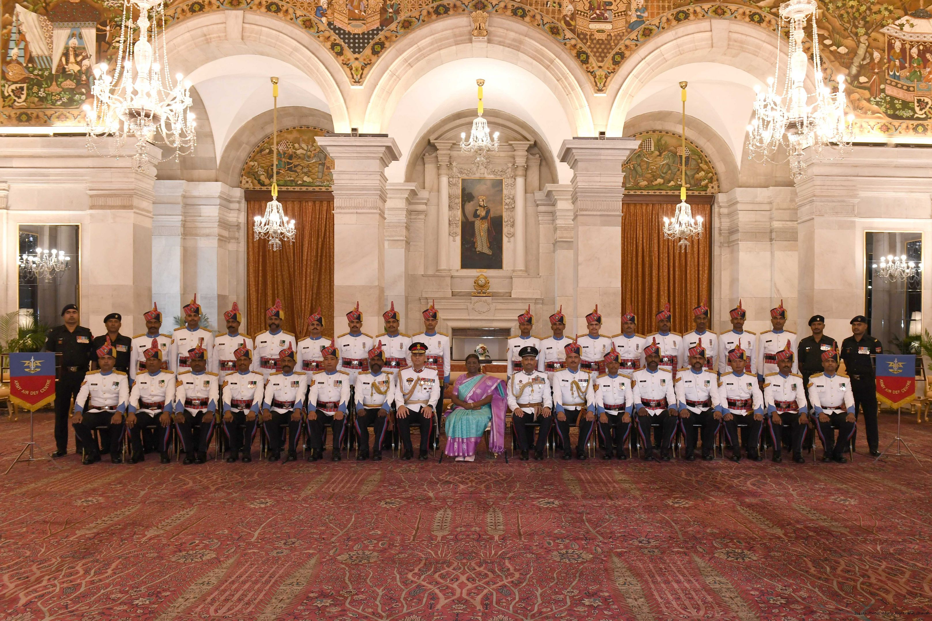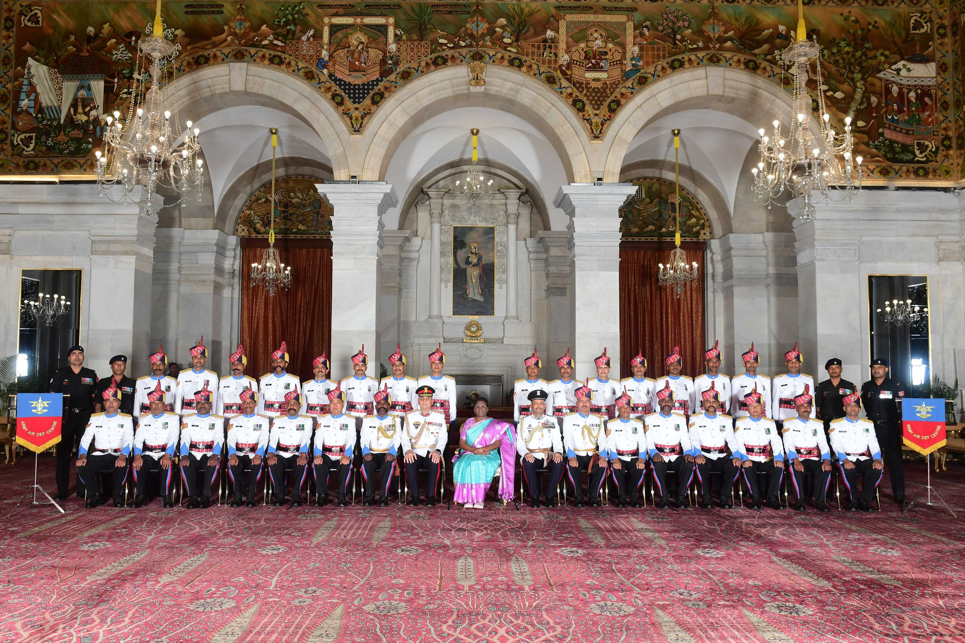 | Caption: | The President of India Smt. Droupadi Murmu posing a Group Photograph with Military Band atttached with Rashtrapati Bhawan at Rashtrapati Bhavan on September 29, 2023. |