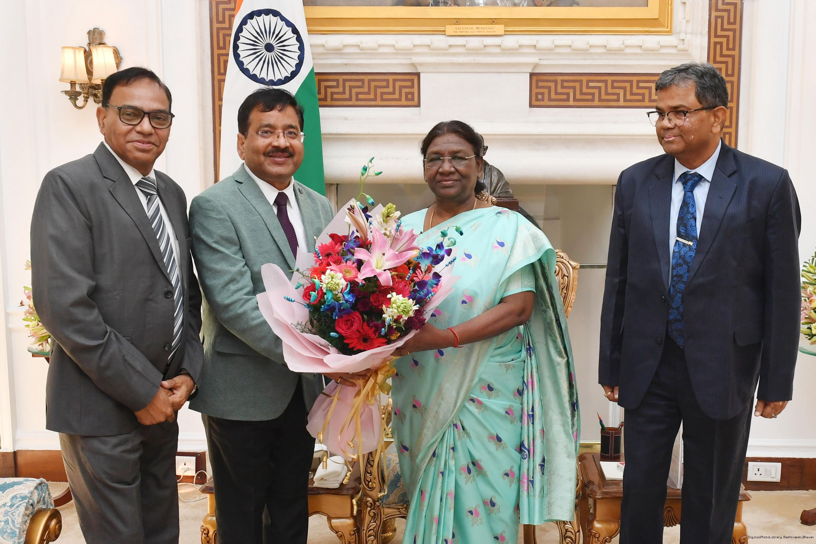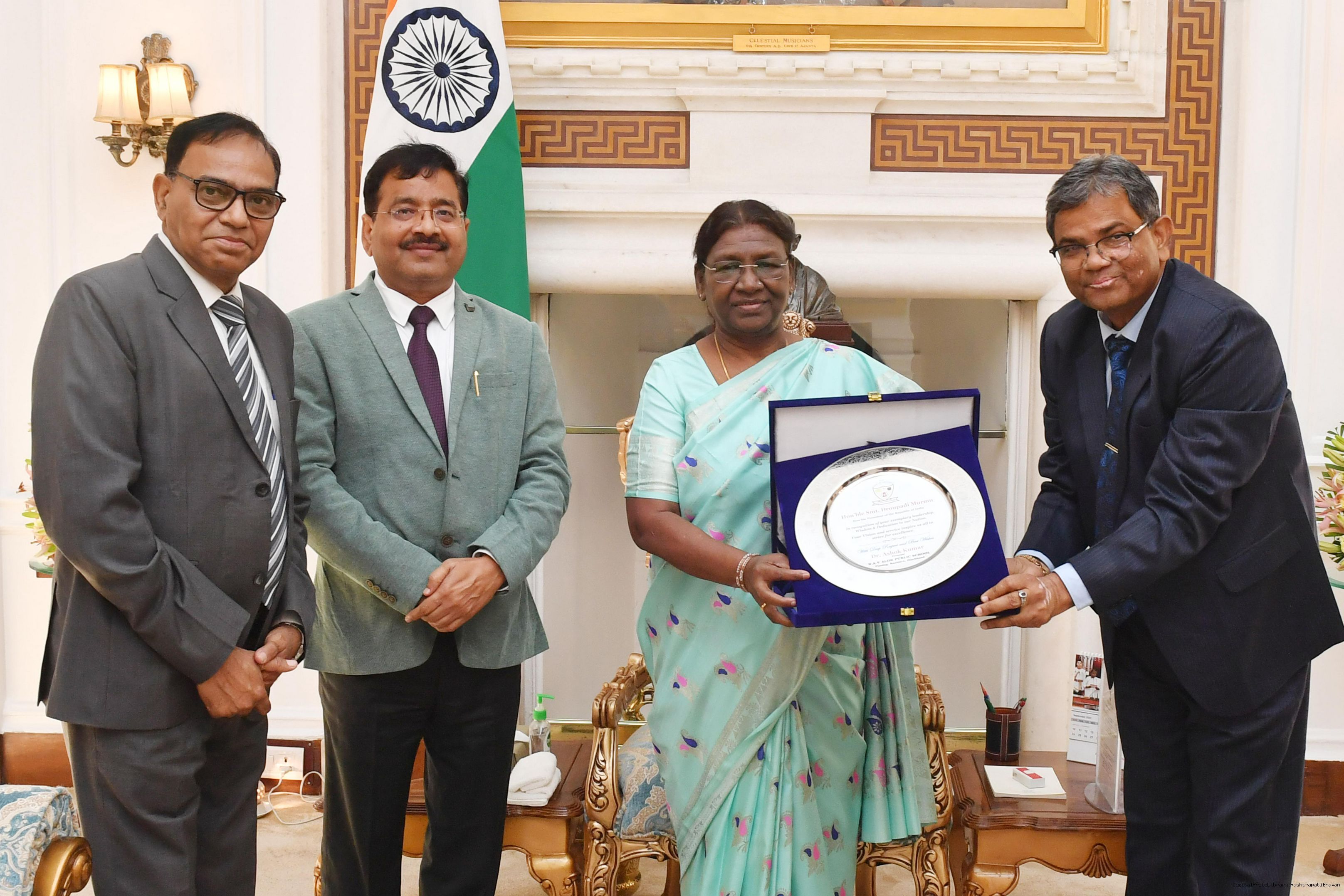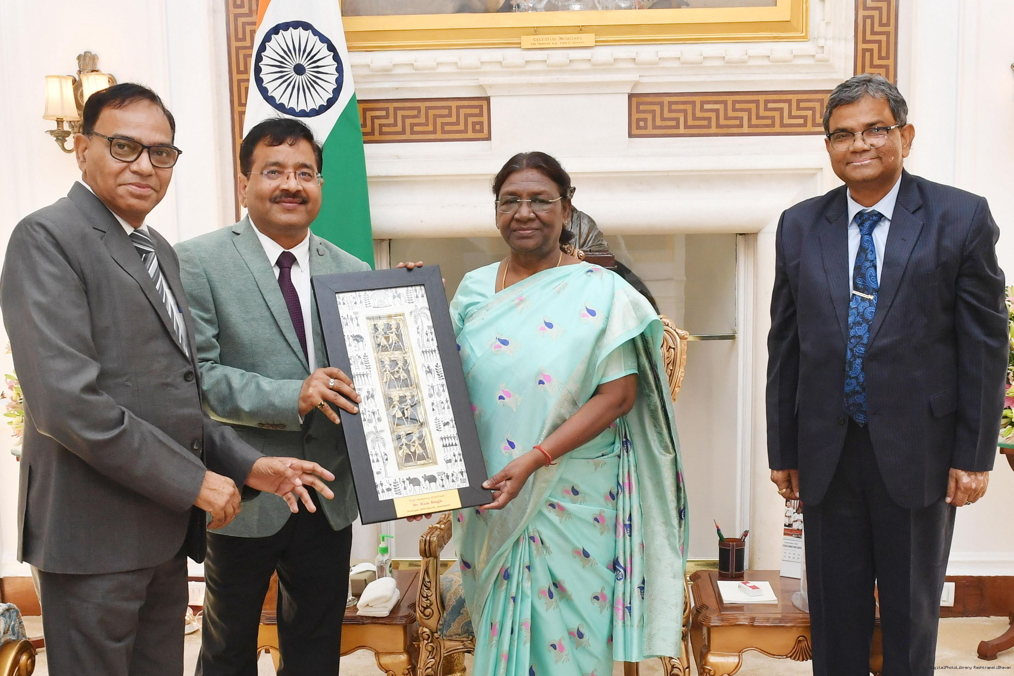 | Caption: | Dr Ram singh Principal Delhi Public School dhurwa Ranchi along with Dr Manohar Lal and Dr Ashok Kumar meeting with the President of India, Smt. Droupadi Murmu at Rashtrapati Bhavan on September 29, 2023. |