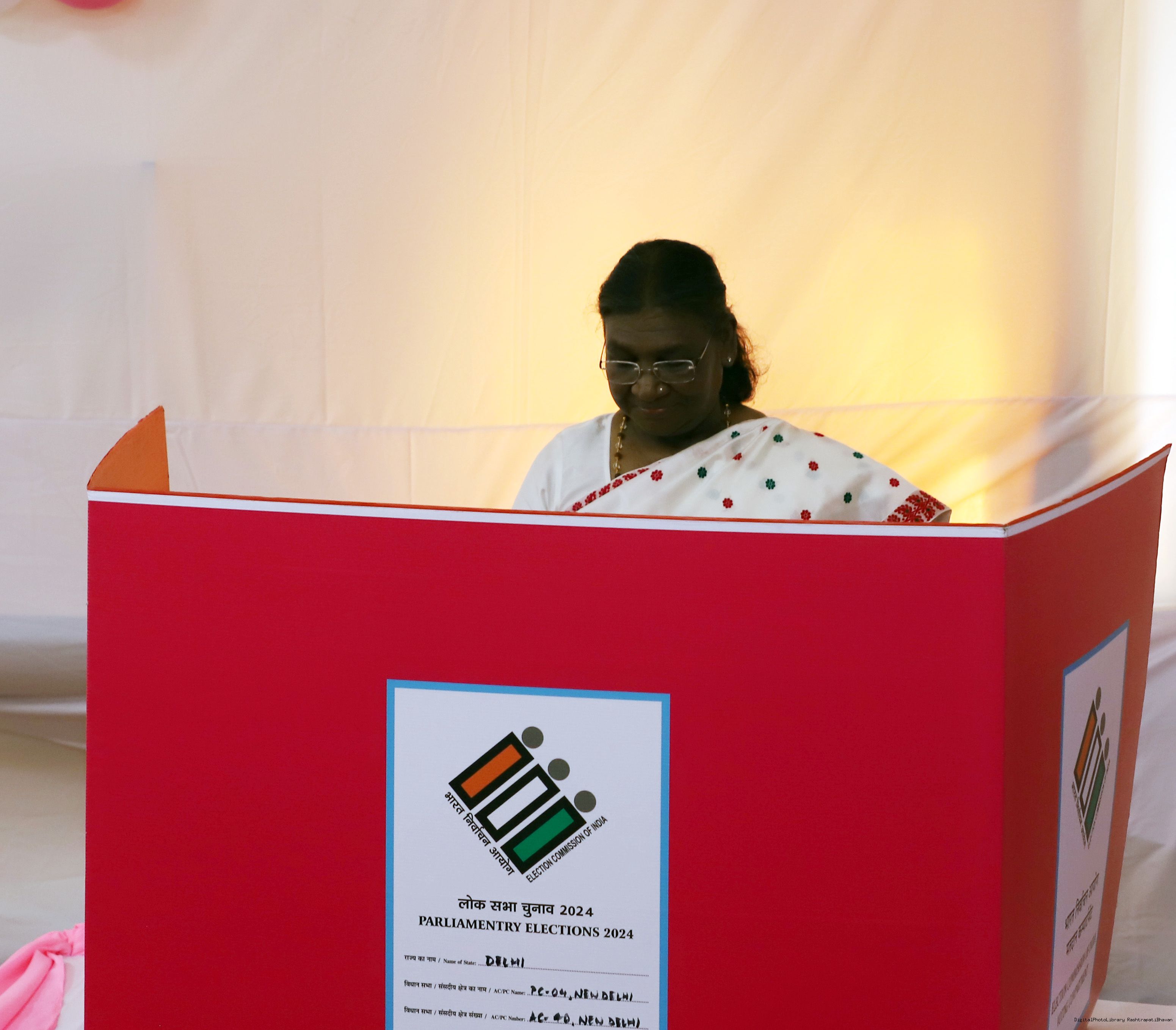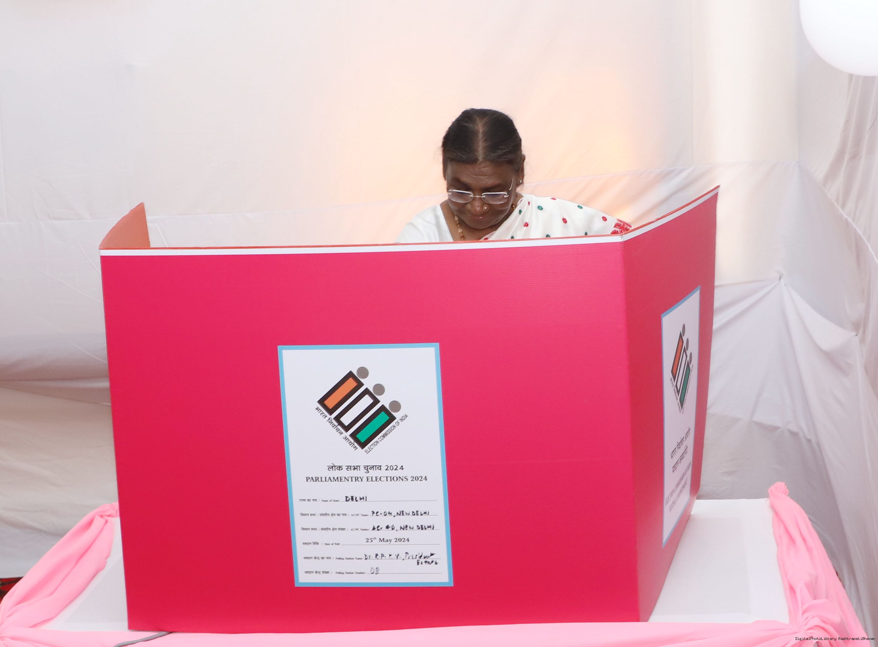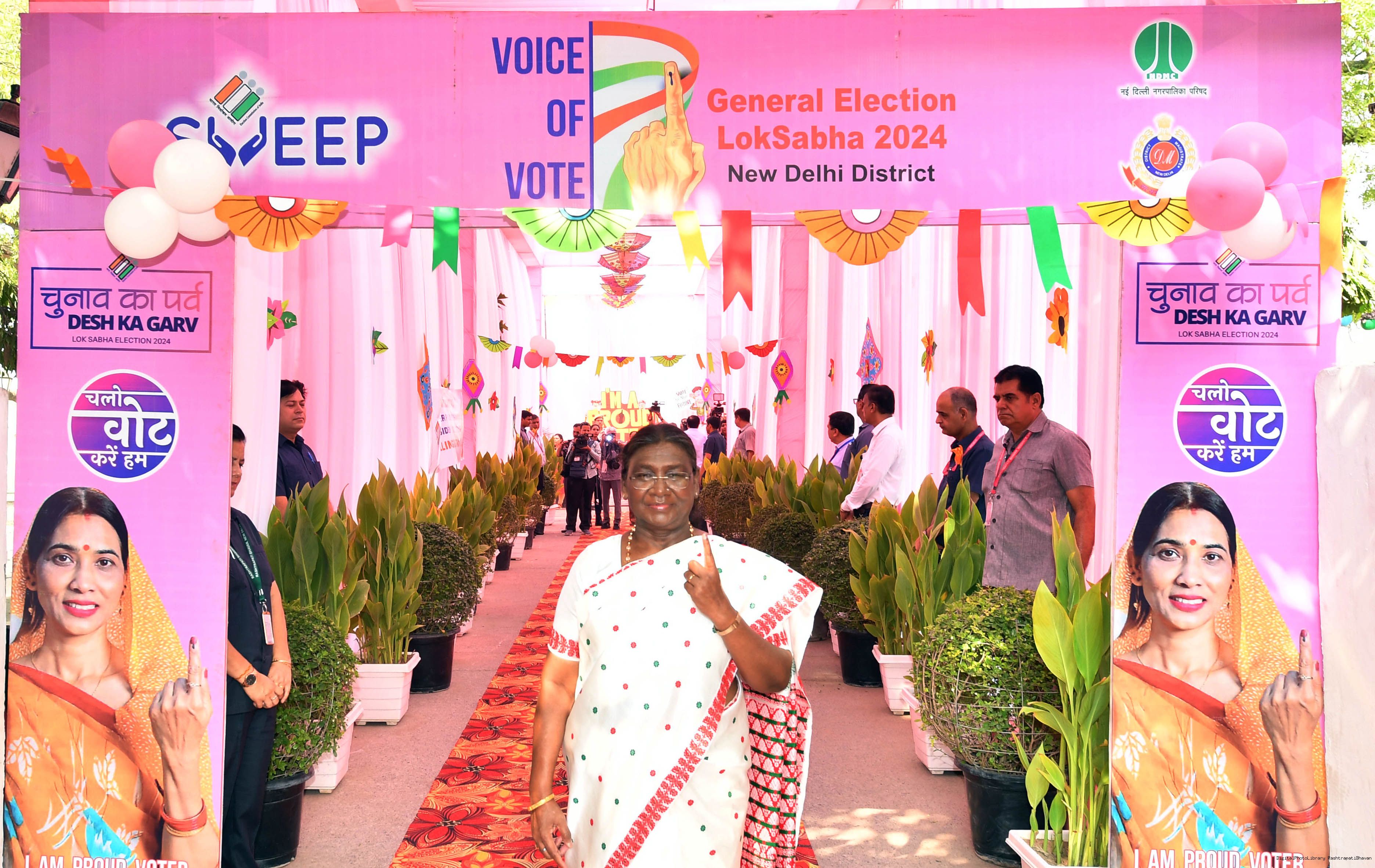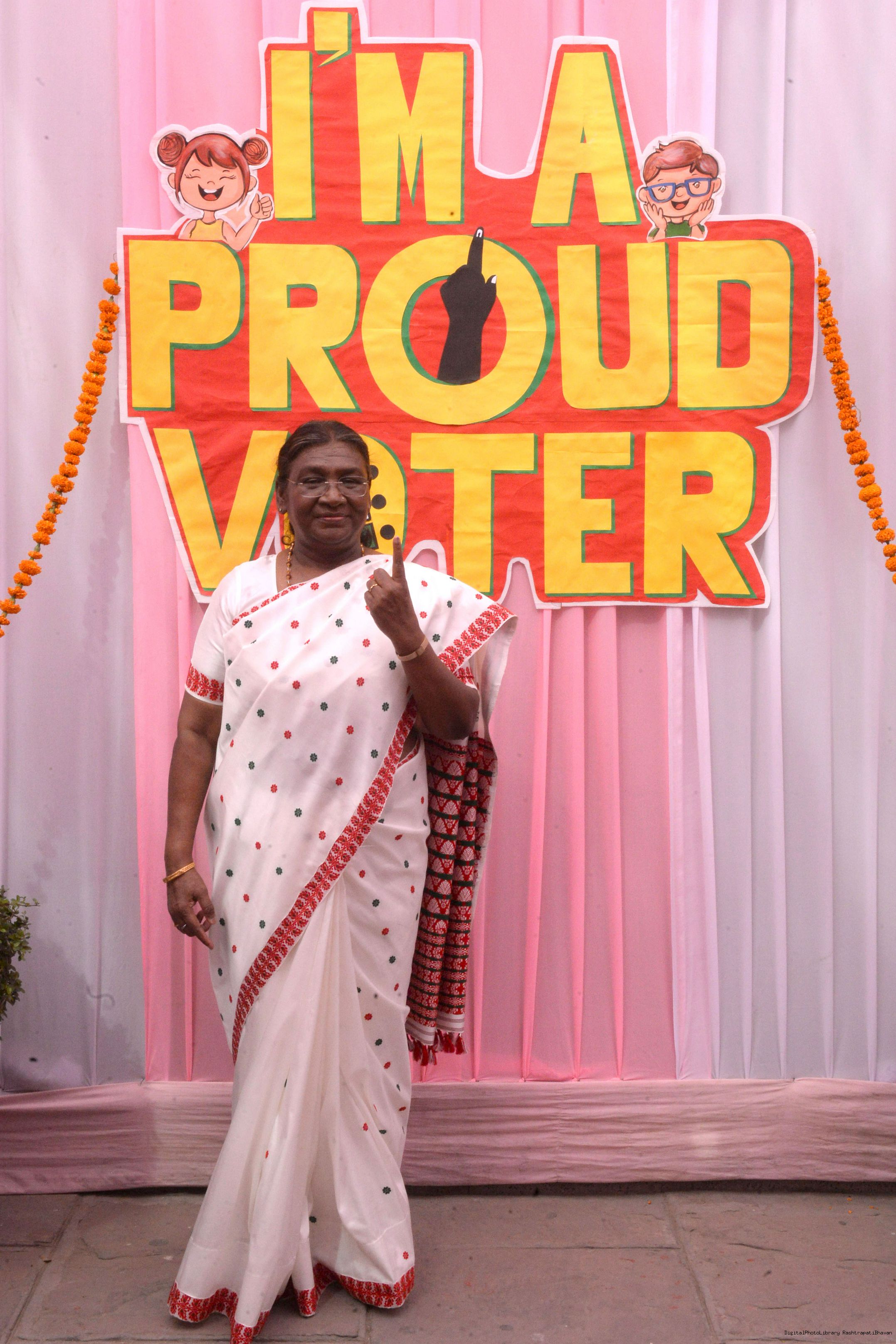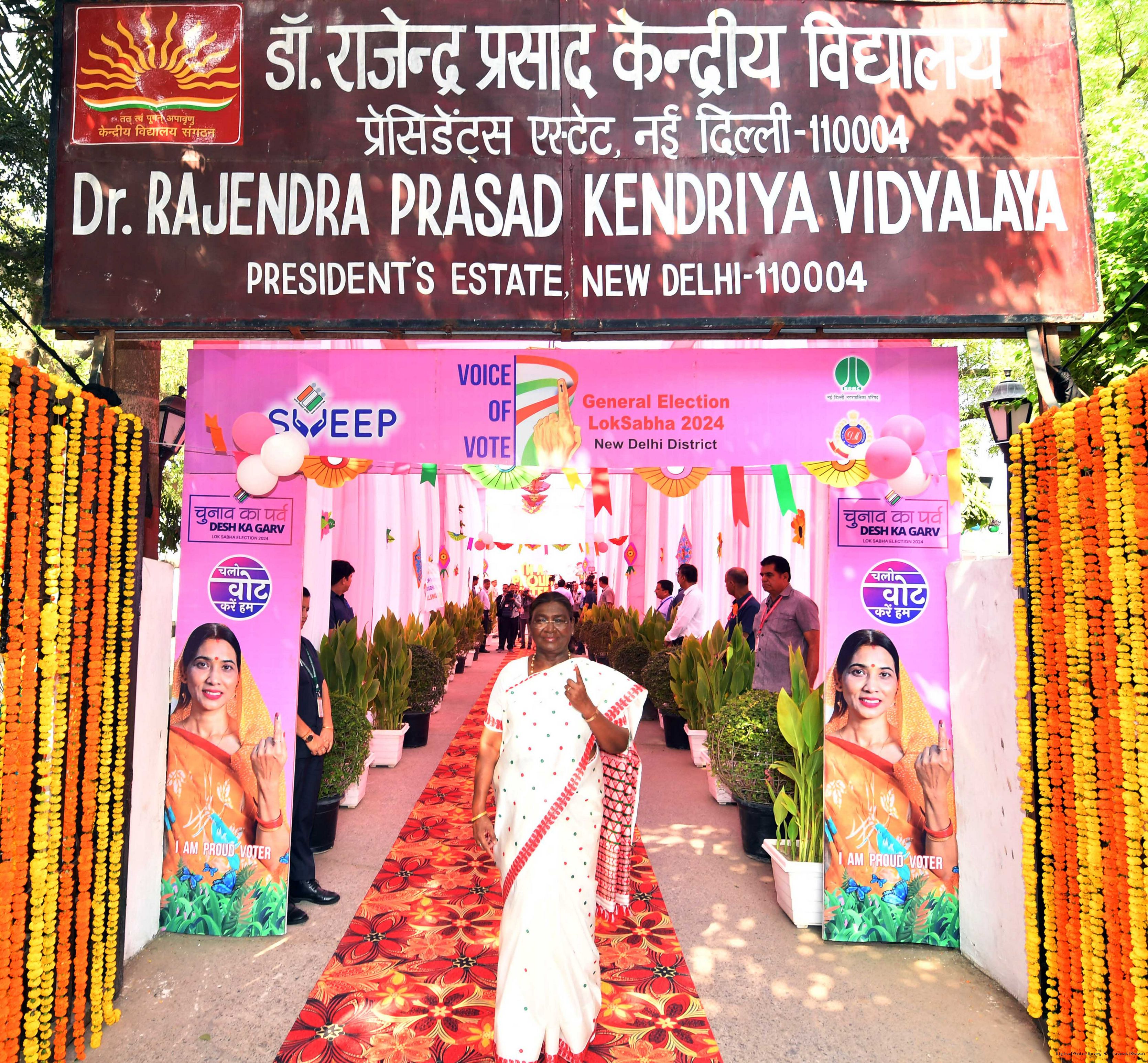 | Caption: | The President of India Smt. Droupadi Murmu visited Dr. Rajendra Prashad Kendriya Vidyalaya, President's Estate, New Delhi to cast the vote for General Election at Rashtrapati Bhavan on May 25, 2024. |