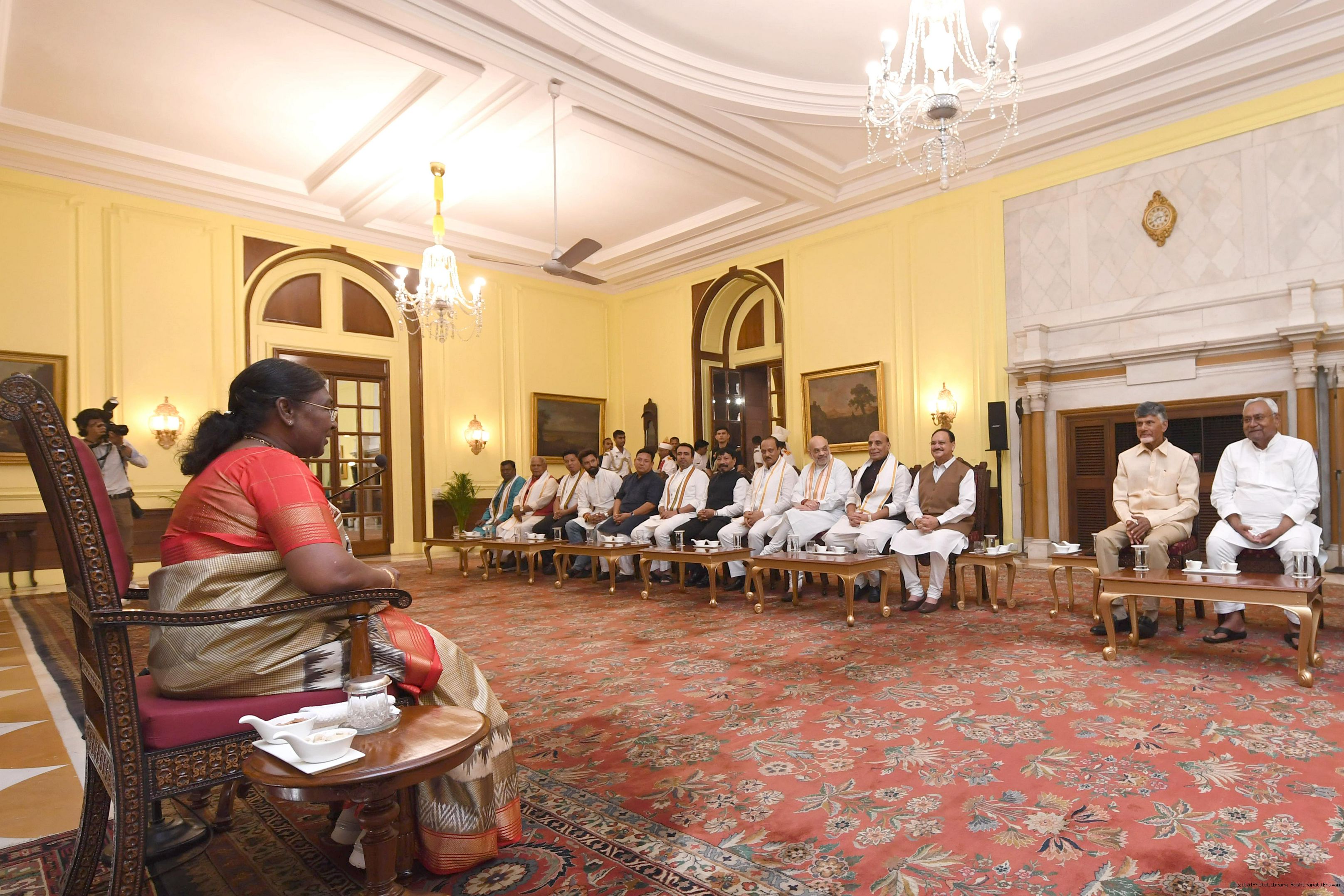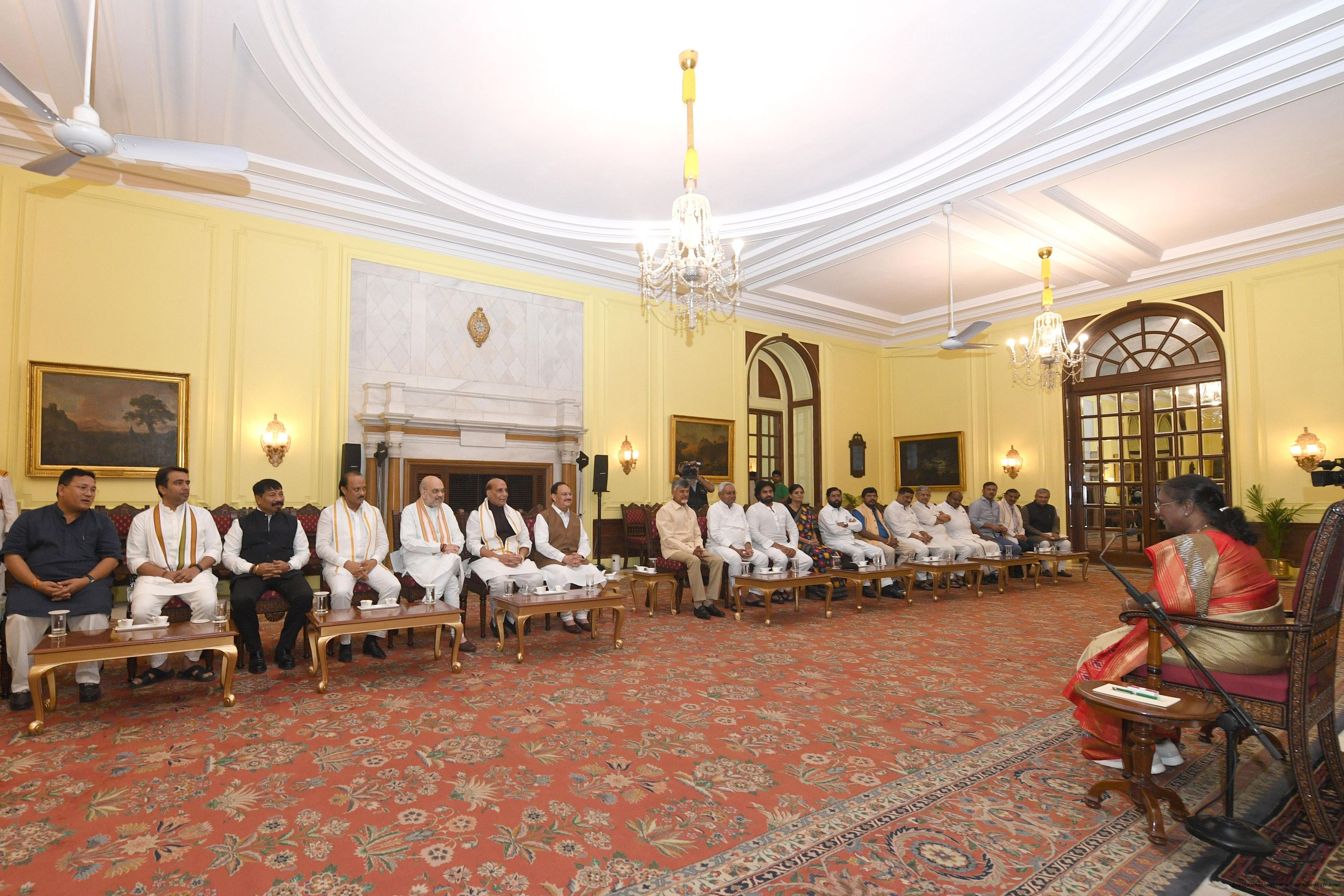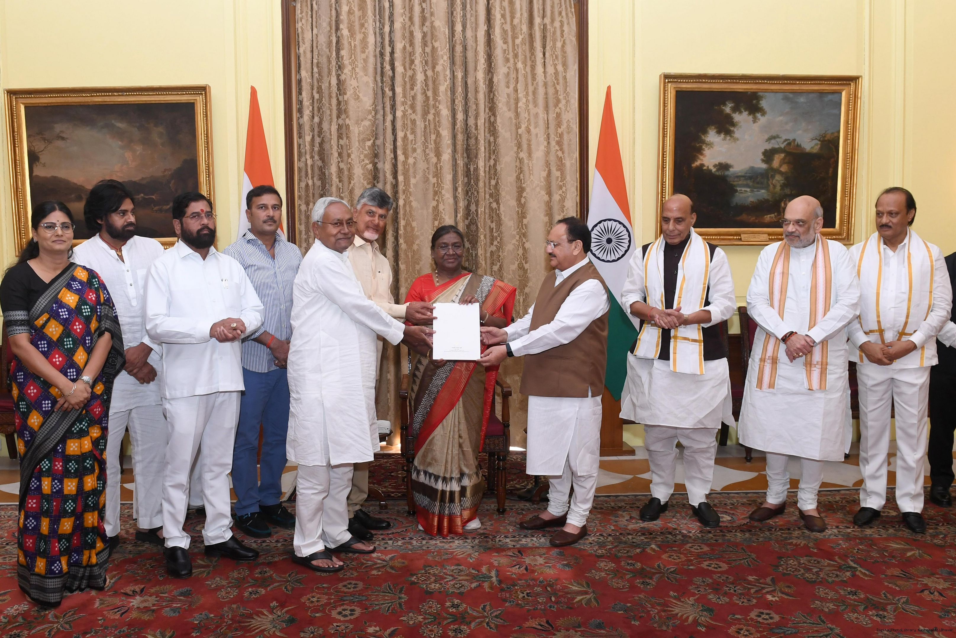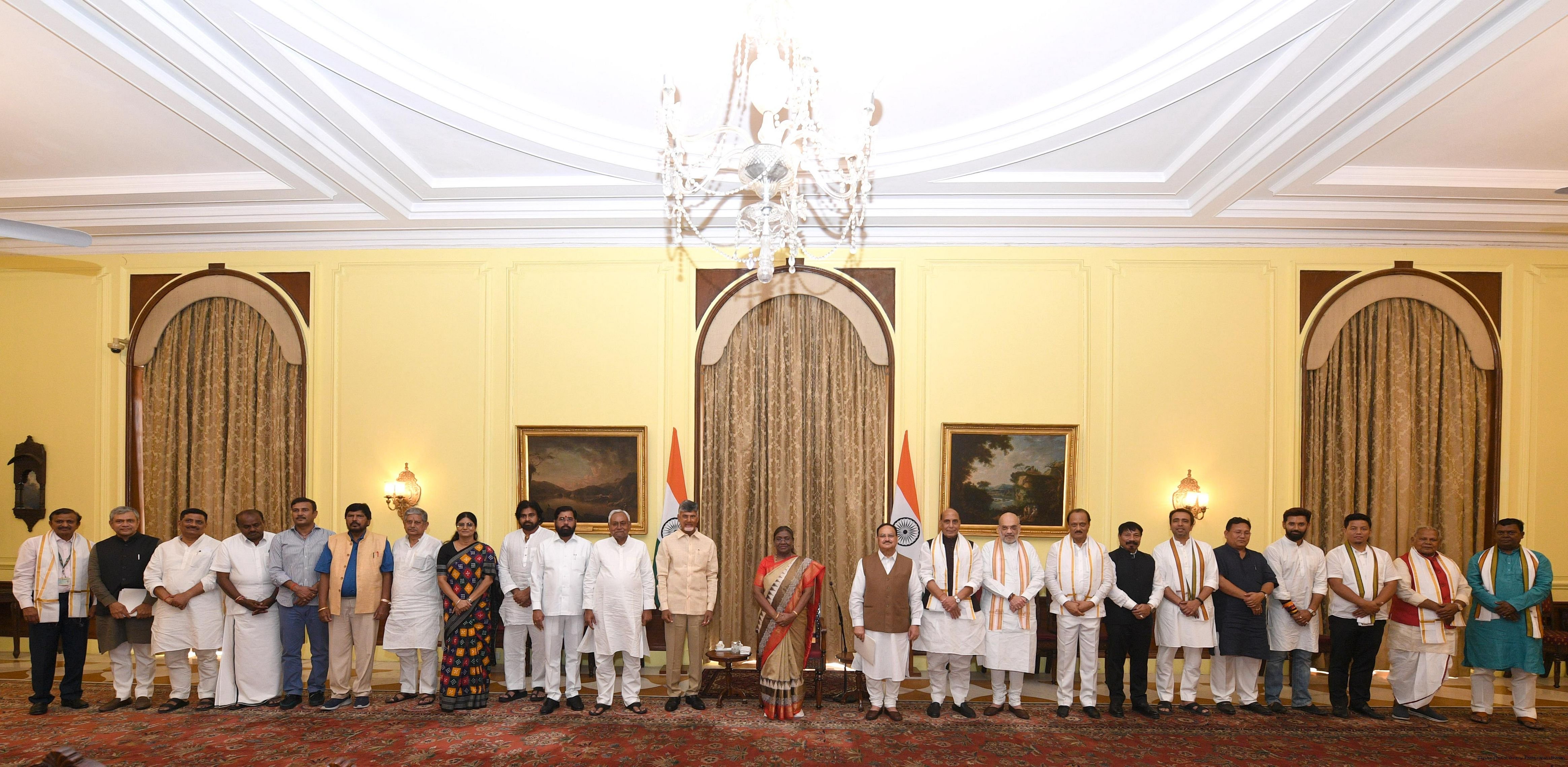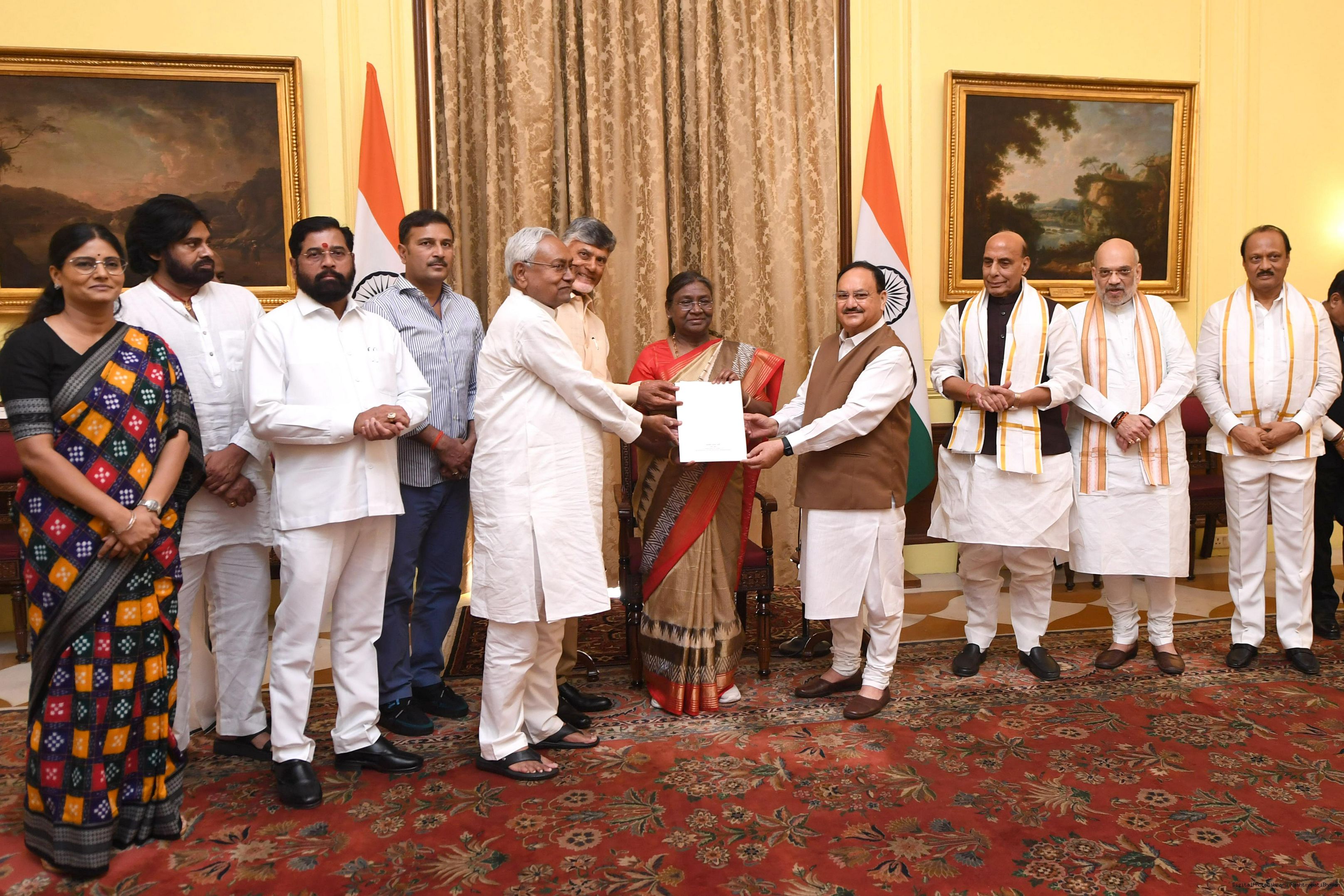 An NDA delegation, led by J.P. Nadda, President, BJP, and comprising Rajnath Singh, Amit Shah, Ashwini Vaishnaw, C.N. Manjunath, N. Chandrababu Naidu, Nitish Kumar, Rajiv Ranjan Singh (Lalan Singh), Sanjay Jha, Eknath Shinde, H.D. Kumaraswamy, Chirag Paswan, Jitan Ram Manjhi, Pawan Kalyan, Ajit Pawar, Anupriya Patel, Jayant Chaudhary, Joyanta Basumatary, Atul Bora, Indra Hang Subba, Sudesh Mahto, Chandra Prakash Choudhary, and Ramdas Athawale called on the President of India, Smt. Droupadi Murmu on June 07, 2024. |
