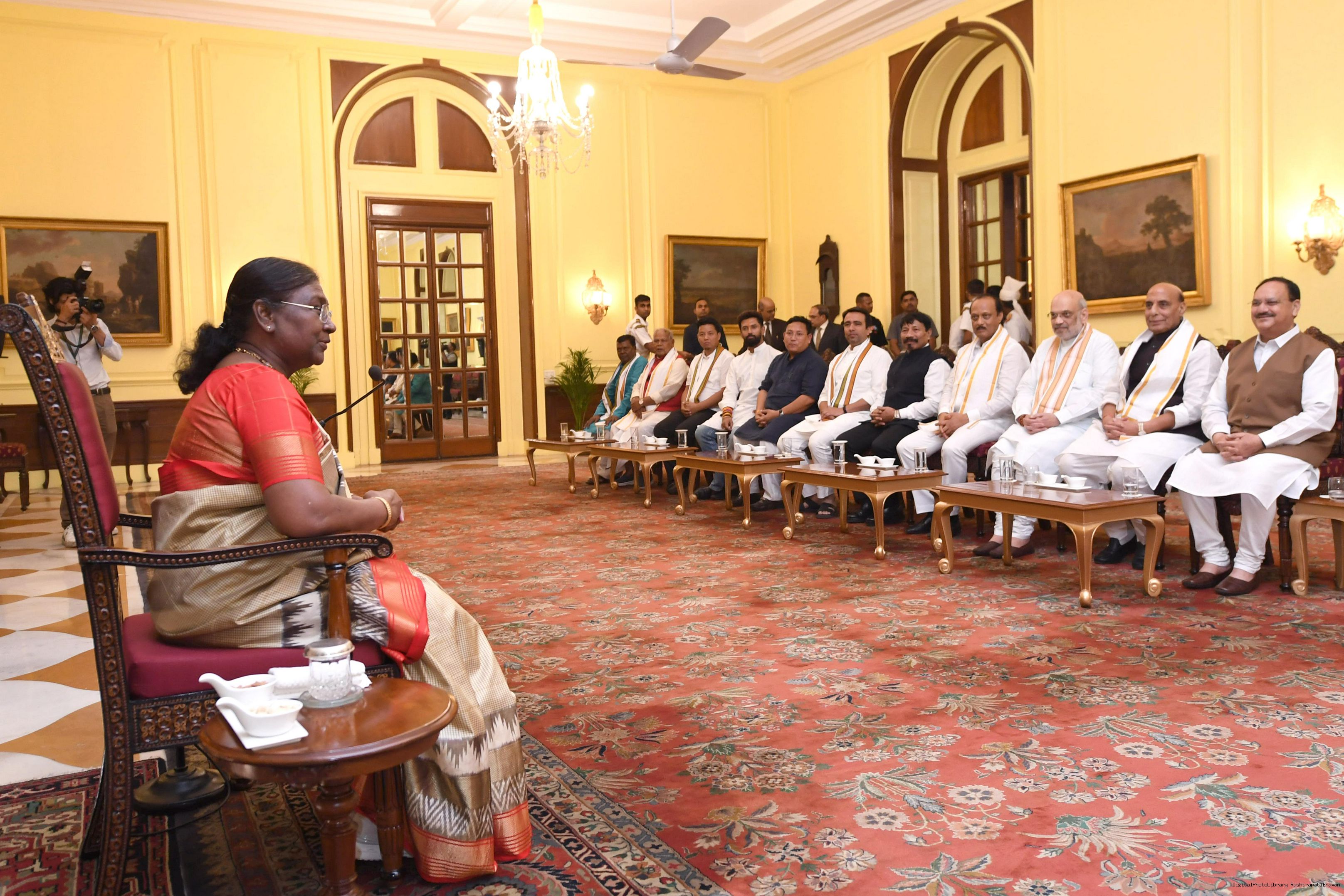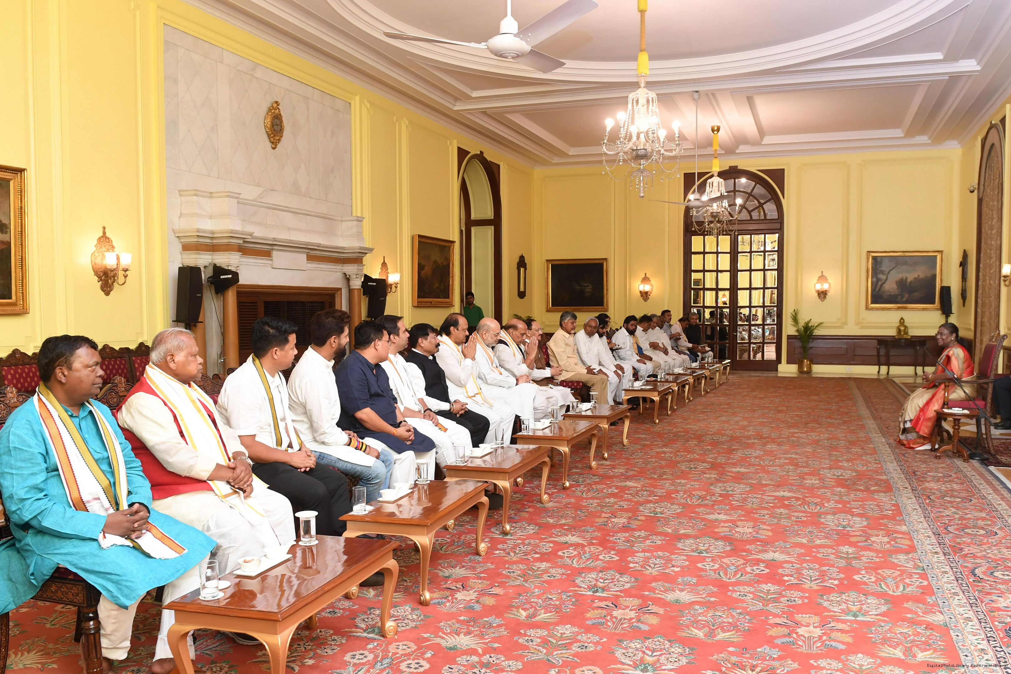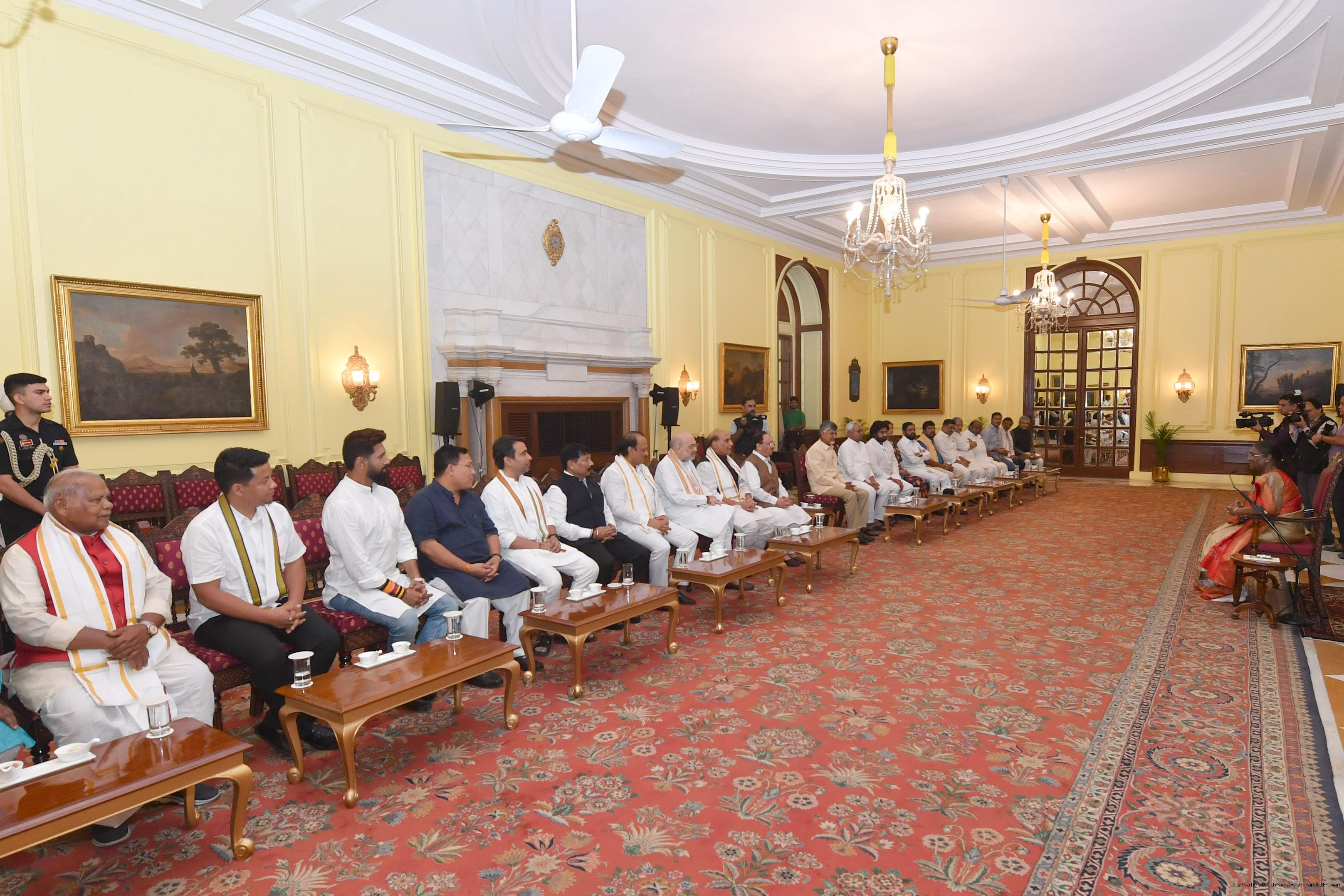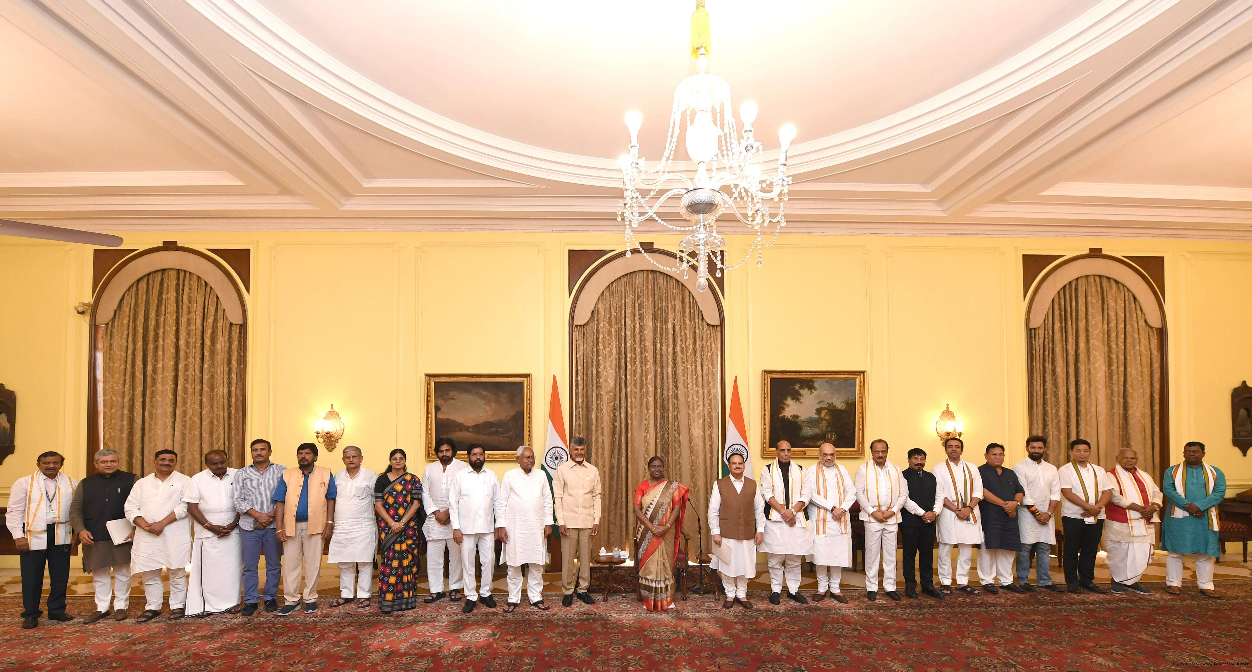 An NDA delegation, led by J.P. Nadda, President, BJP, and comprising Rajnath Singh, Amit Shah, Ashwini Vaishnaw, C.N. Manjunath, N. Chandrababu Naidu, Nitish Kumar, Rajiv Ranjan Singh (Lalan Singh), Sanjay Jha, Eknath Shinde, H.D. Kumaraswamy, Chirag Paswan, Jitan Ram Manjhi, Pawan Kalyan, Ajit Pawar, Anupriya Patel, Jayant Chaudhary, Joyanta Basumatary, Atul Bora, Indra Hang Subba, Sudesh Mahto, Chandra Prakash Choudhary, and Ramdas Athawale called on the President of India, Smt. Droupadi Murmu on June 07, 2024. |