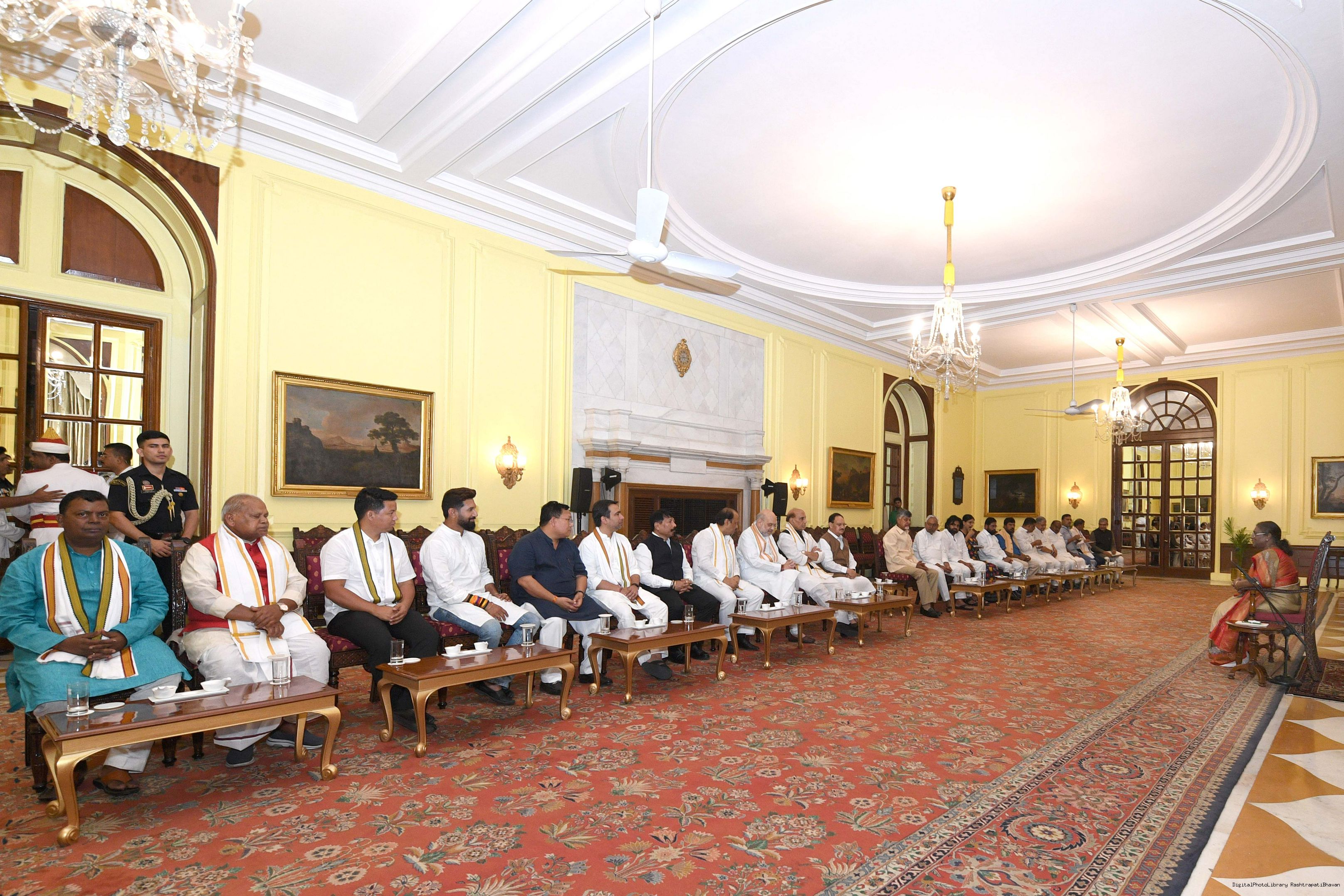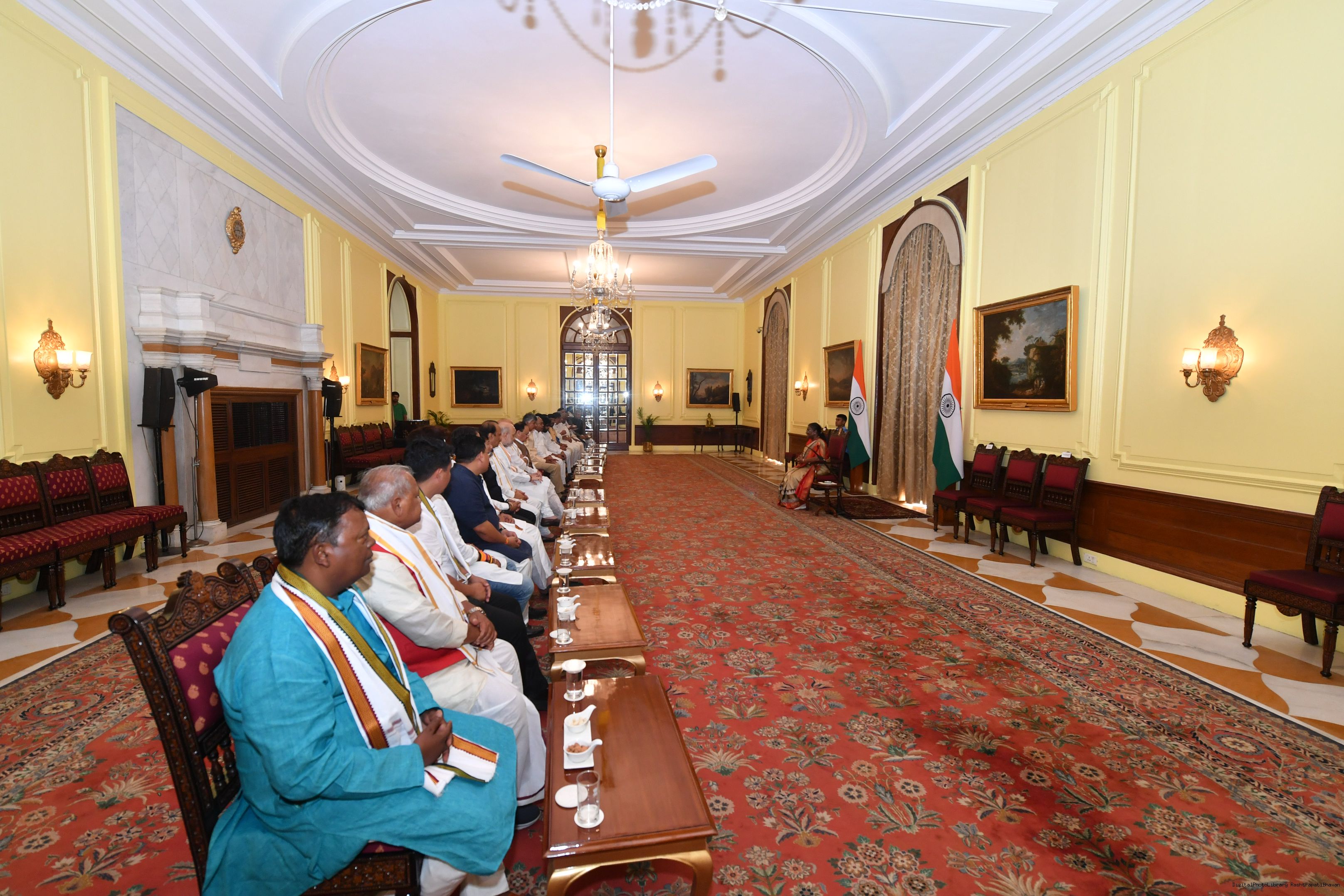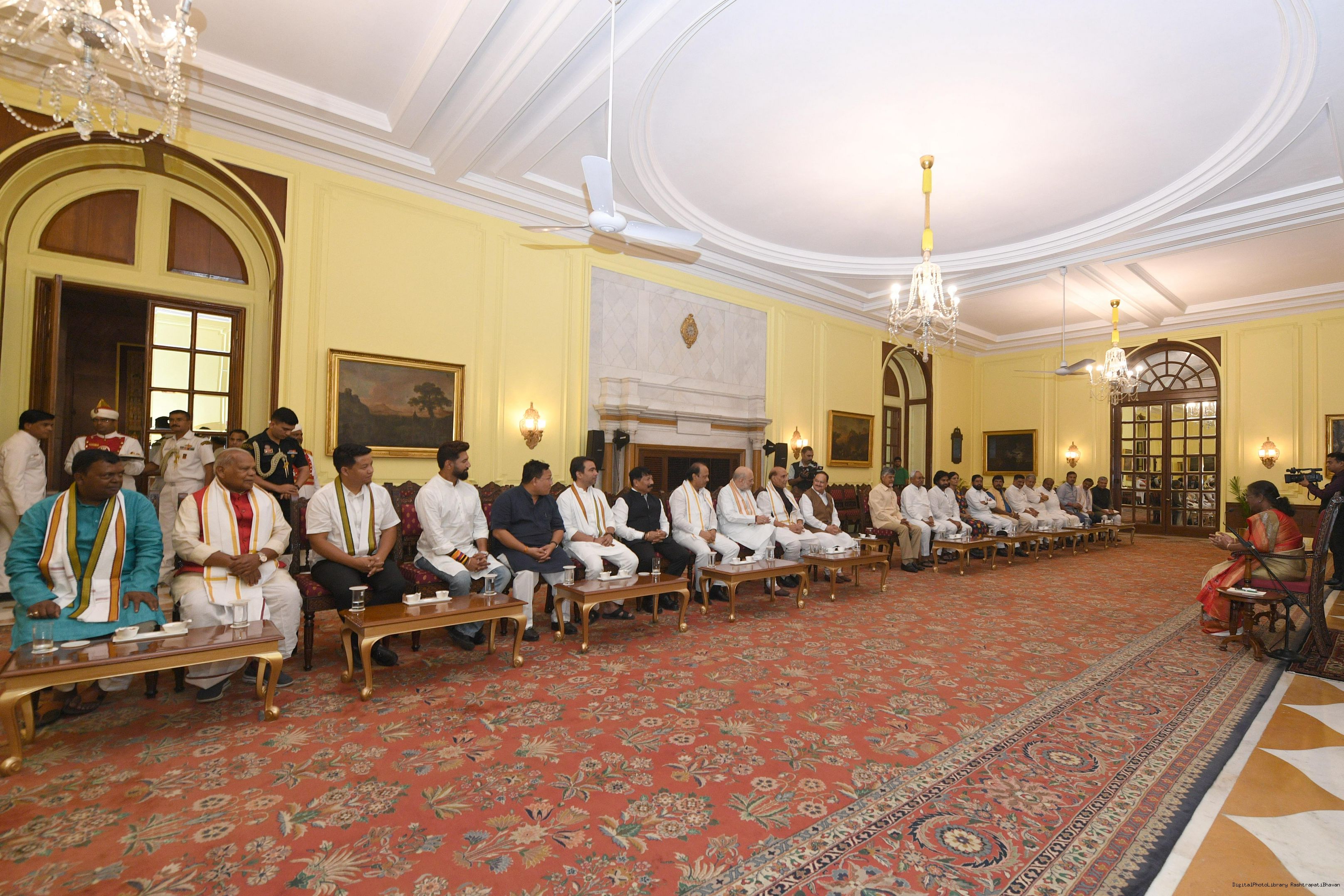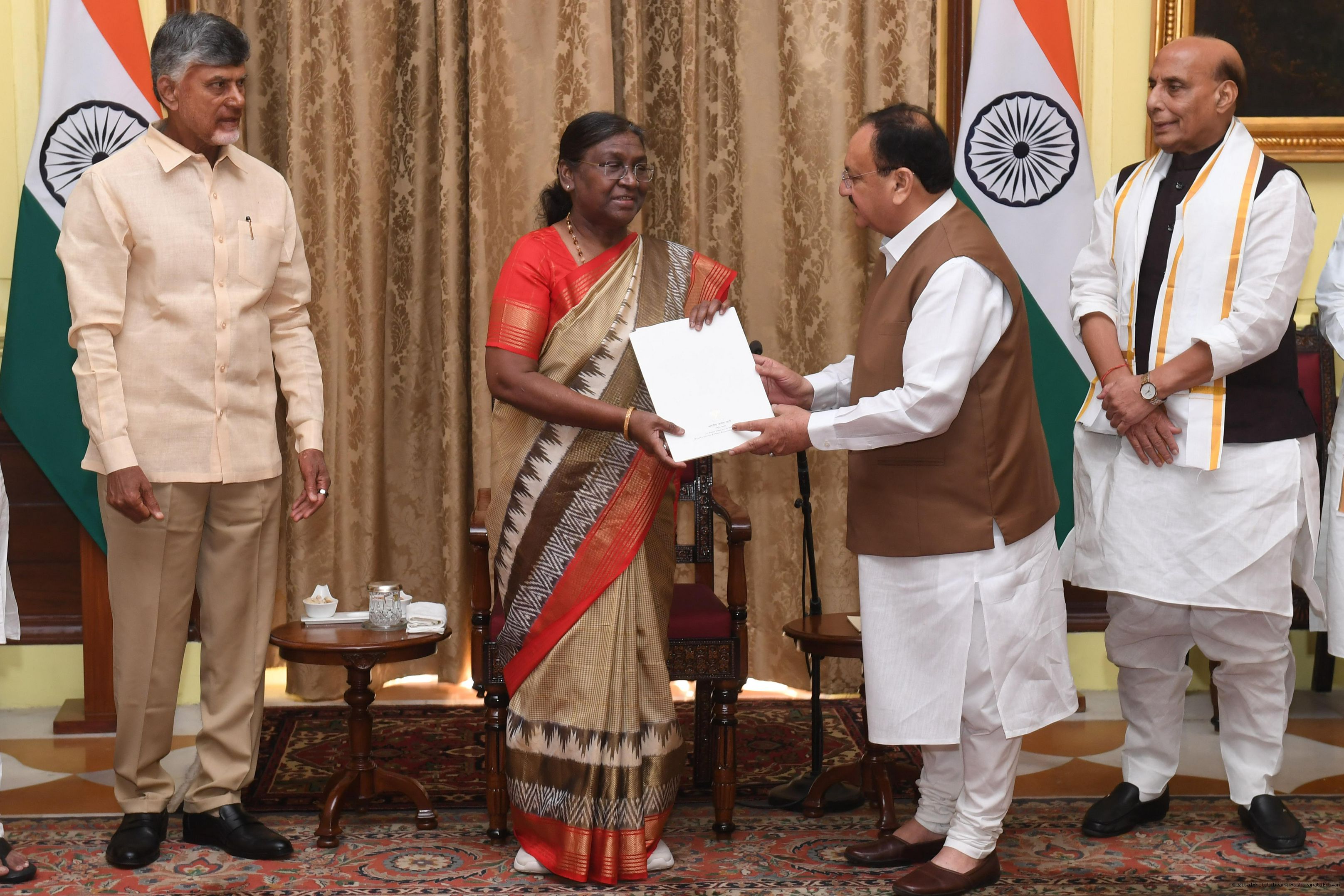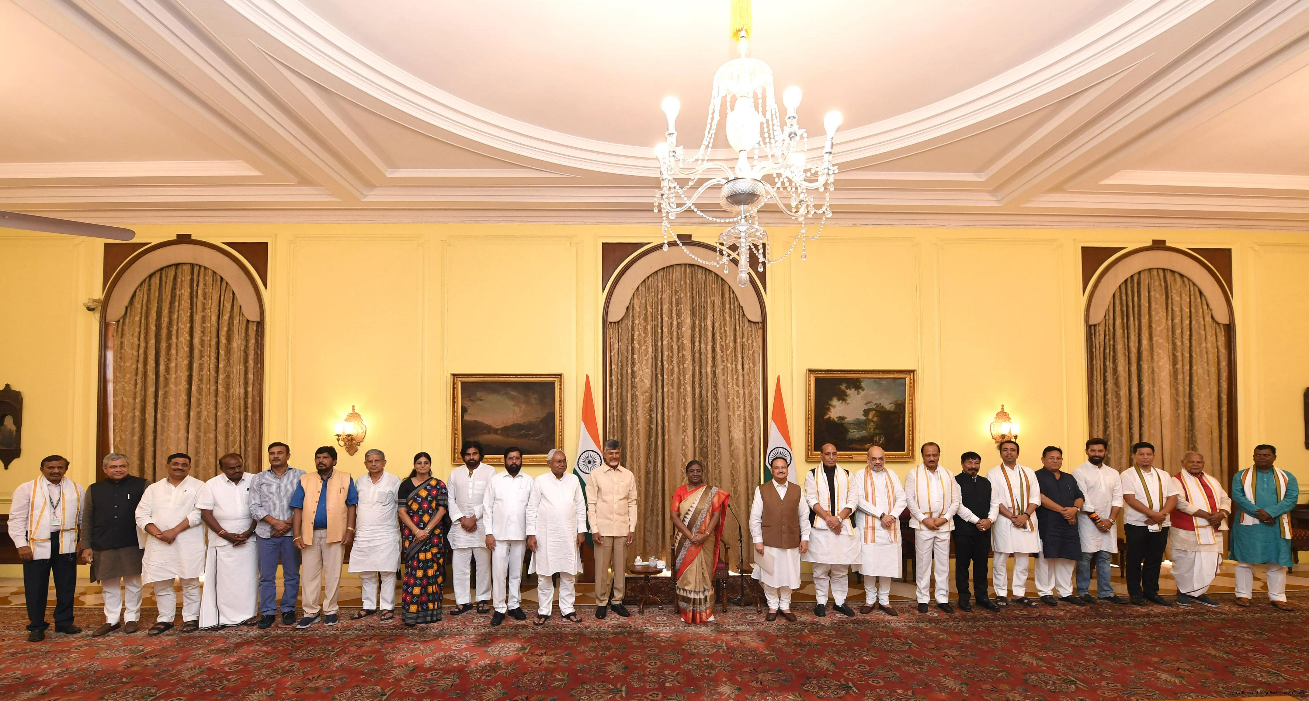 An NDA delegation, led by J.P. Nadda, President, BJP, and comprising Rajnath Singh, Amit Shah, Ashwini Vaishnaw, C.N. Manjunath, N. Chandrababu Naidu, Nitish Kumar, Rajiv Ranjan Singh (Lalan Singh), Sanjay Jha, Eknath Shinde, H.D. Kumaraswamy, Chirag Paswan, Jitan Ram Manjhi, Pawan Kalyan, Ajit Pawar, Anupriya Patel, Jayant Chaudhary, Joyanta Basumatary, Atul Bora, Indra Hang Subba, Sudesh Mahto, Chandra Prakash Choudhary, and Ramdas Athawale called on the President of India, Smt. Droupadi Murmu on June 07, 2024. |