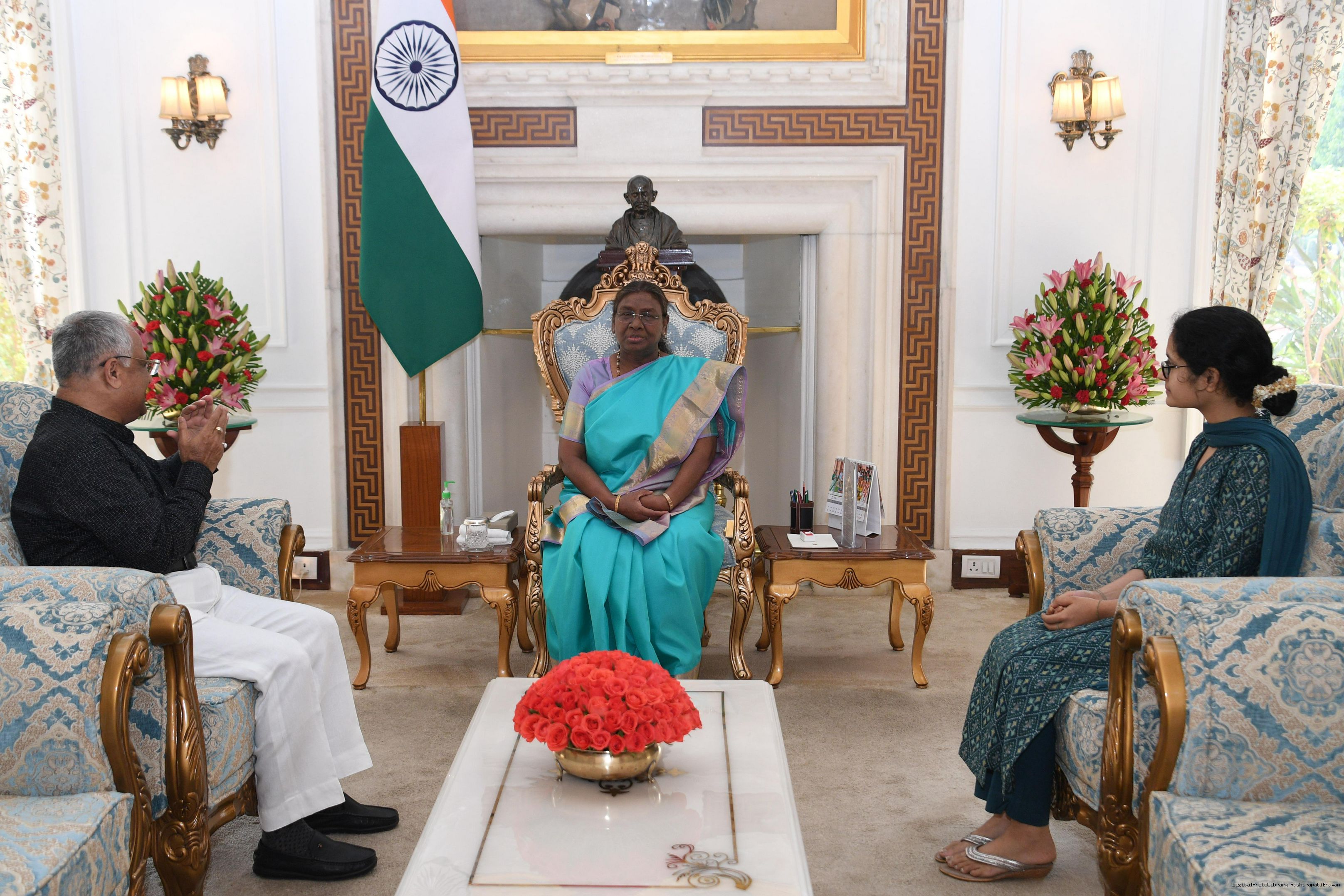 | Caption: | Shri Pitambar Acharya, Sr. Advocate Spokespersons, BJP Odisha along with his daughter meeting with the president of India Smt Droupadi Murmu at Rashatrapati Bhawan on June 20, 2024. |