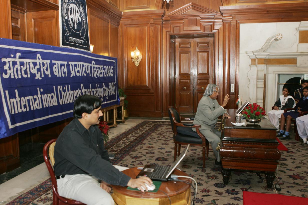 | Caption: | The President of India, Dr A P J Abdul Kalam AIR Recording on the occasion of International Children Broadcasting Day at the Committee Room of Rashtrapati Bhavan in New Delhi on Dec 05, 2005 |