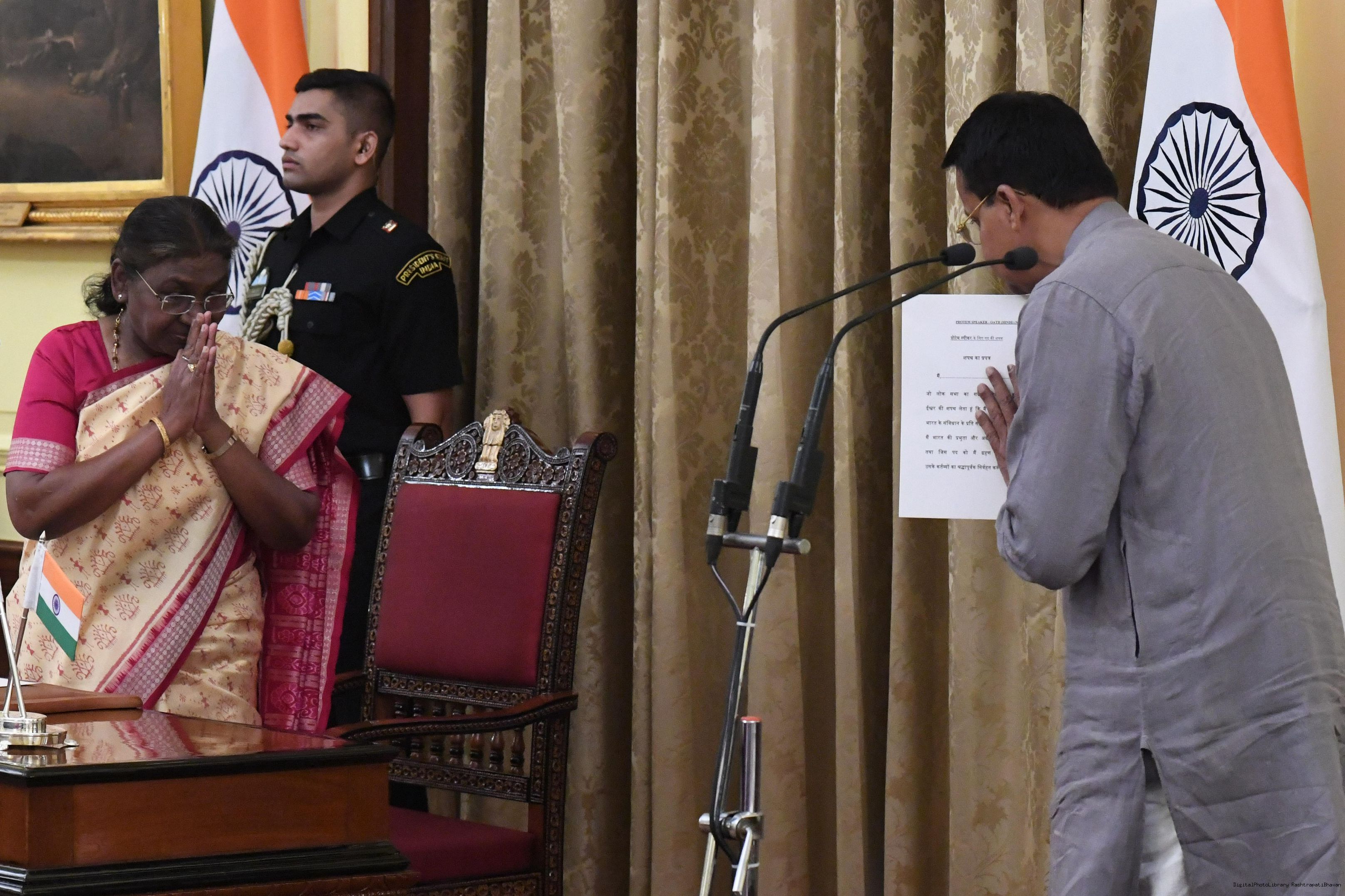 | Caption: | The President of India Smt. Droupadi Murmu administered the Oath of Office to Shri Bhartruhari Mahtab as Speaker pro tem of the 18th Lok Sabha at a ceremony held at Rashtrapati Bhavan on June 24, 2024. |