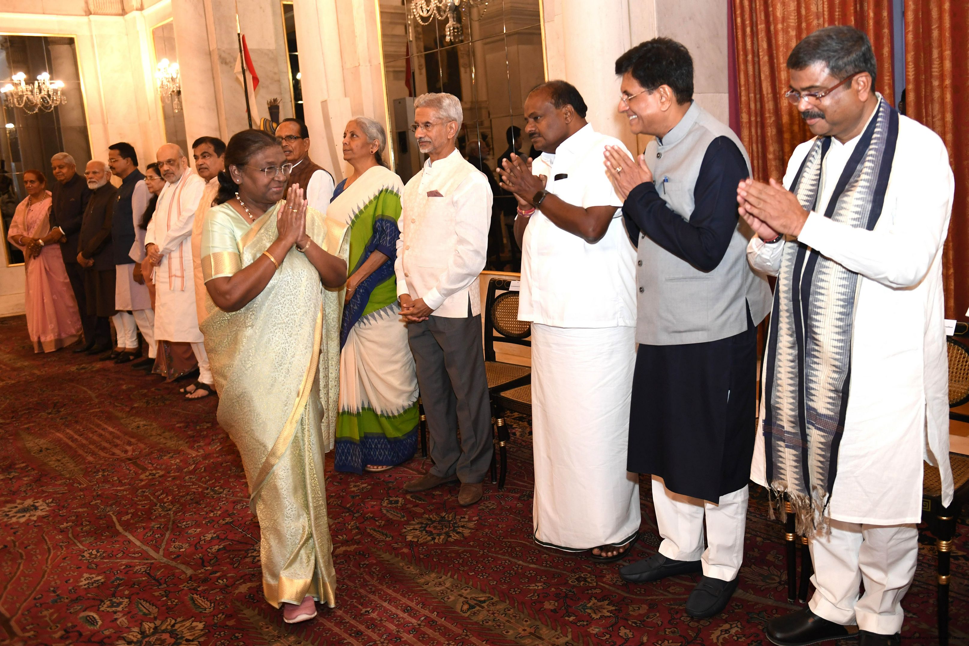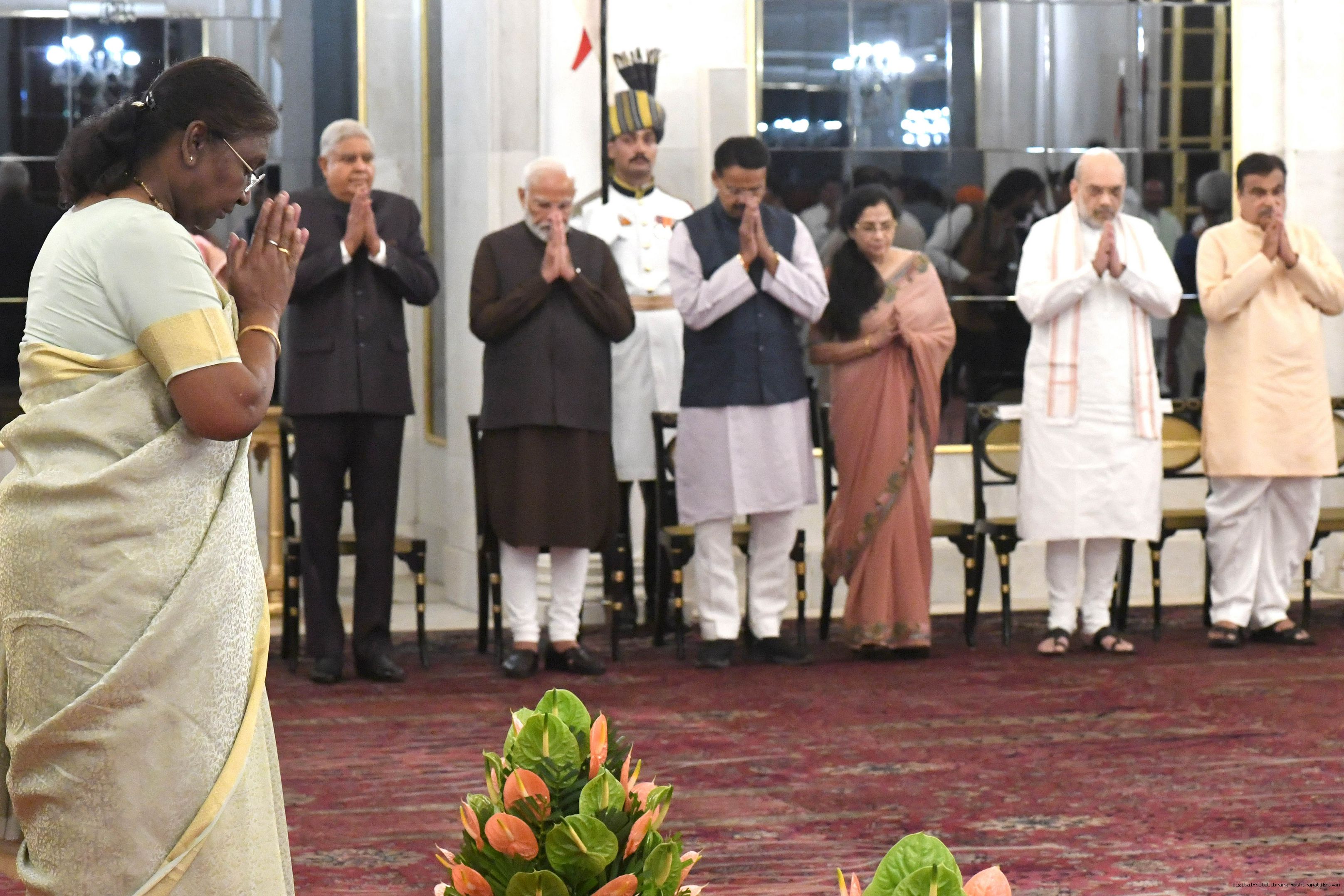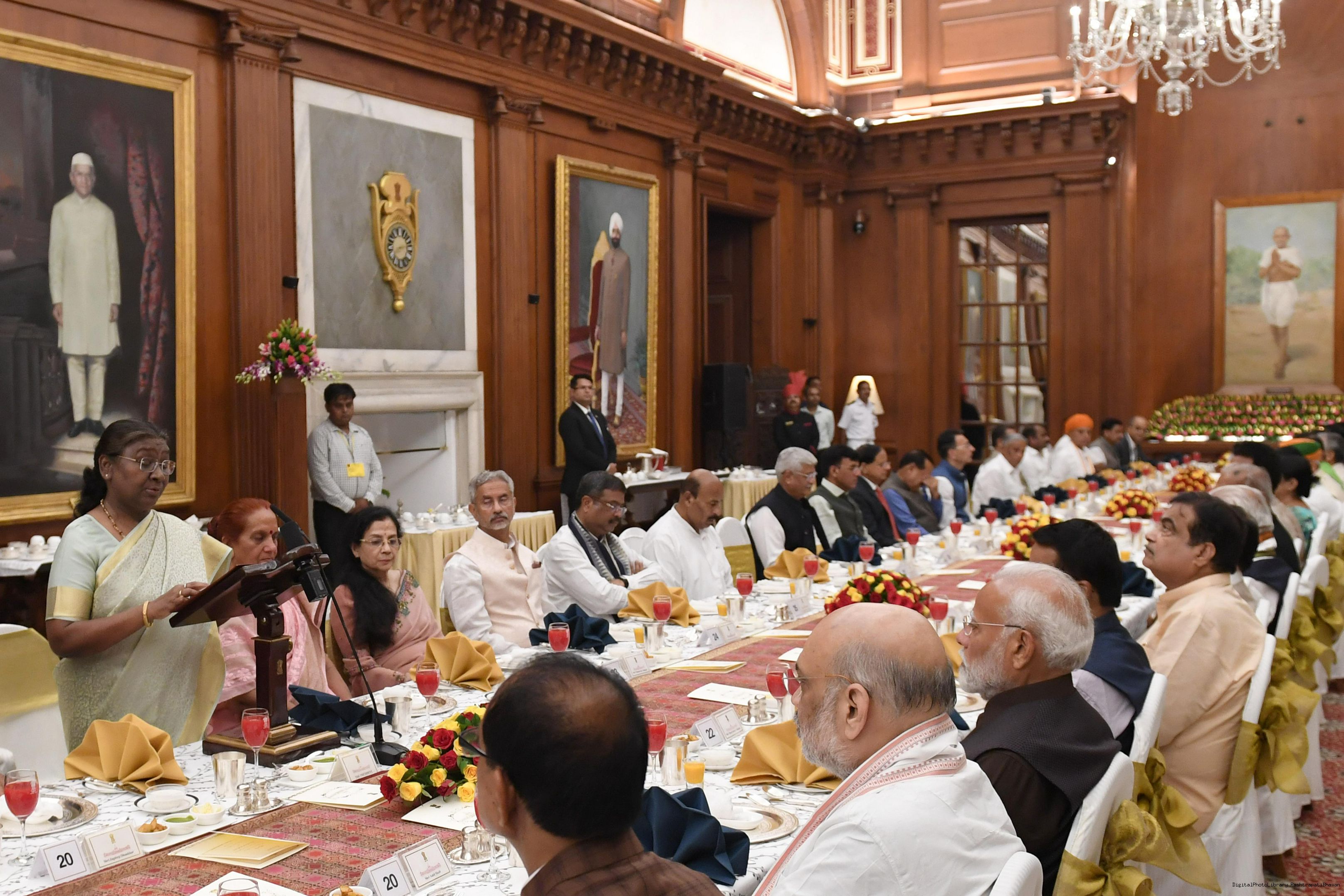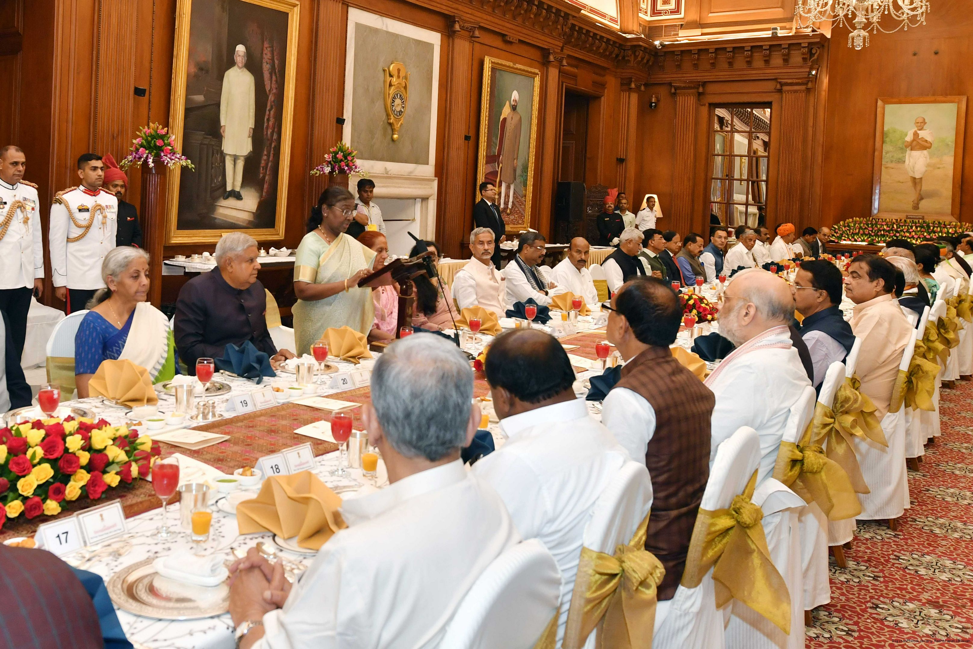 | Caption: | The President of India Smt. Droupadi Murmu hosted a dinner in honour of the Union Council of Ministers at Rashtrapati Bhavan on June 24, 2024. |
