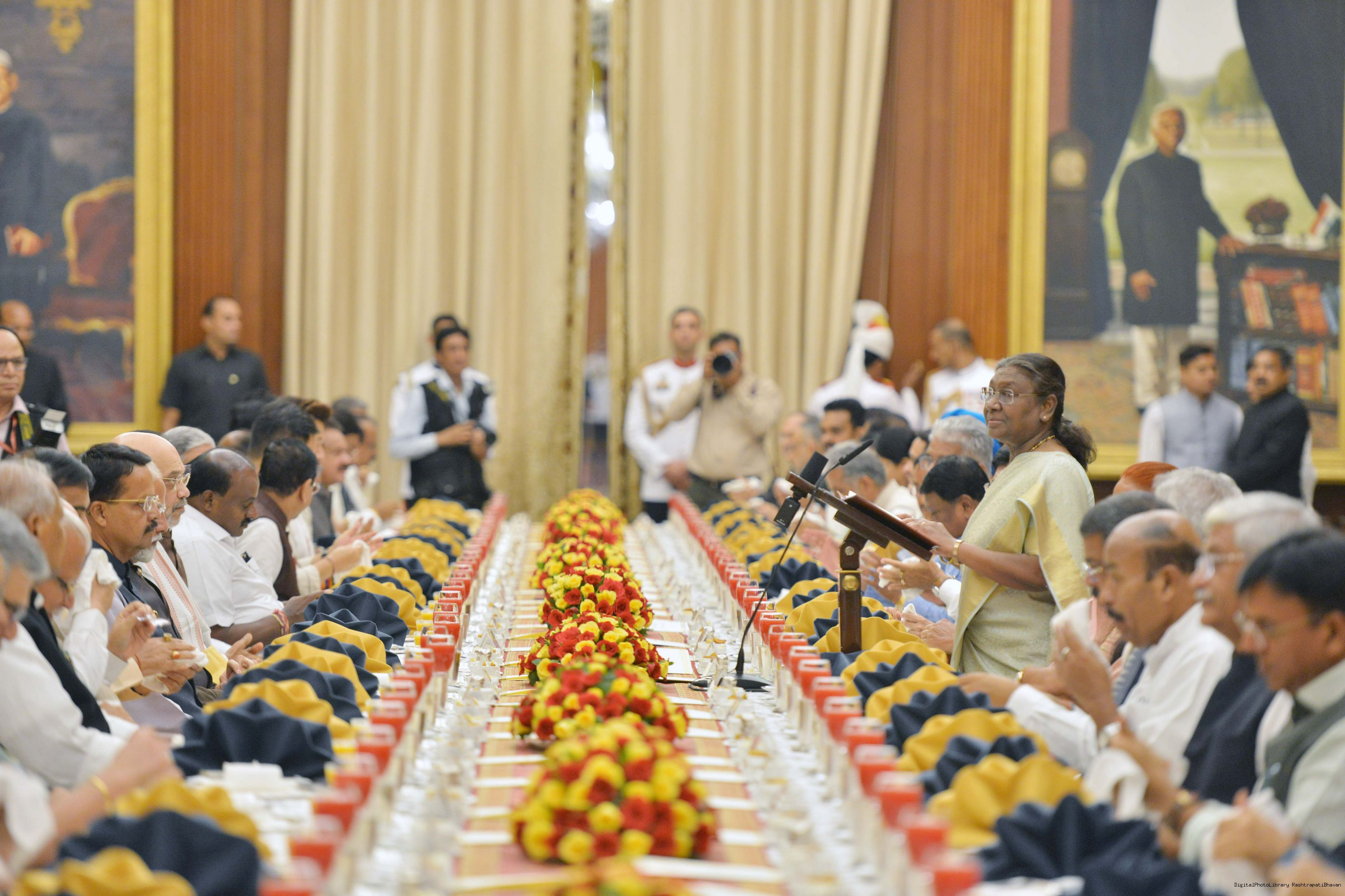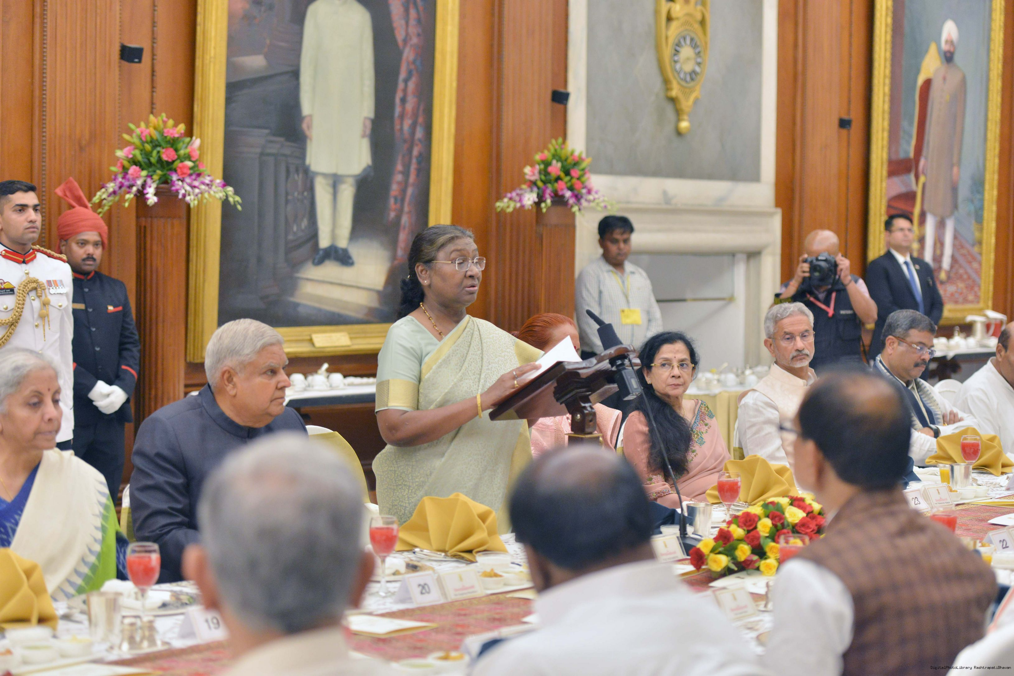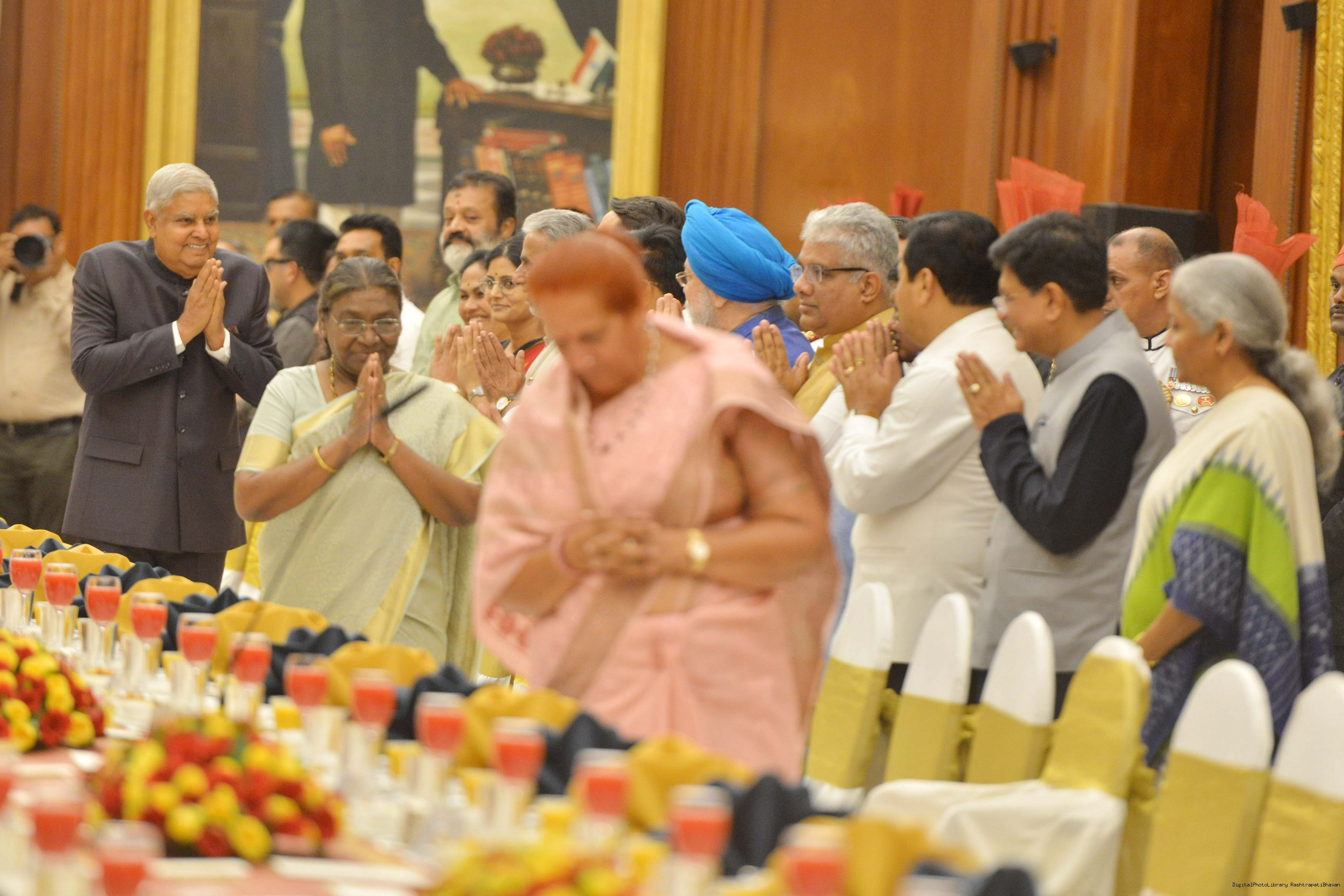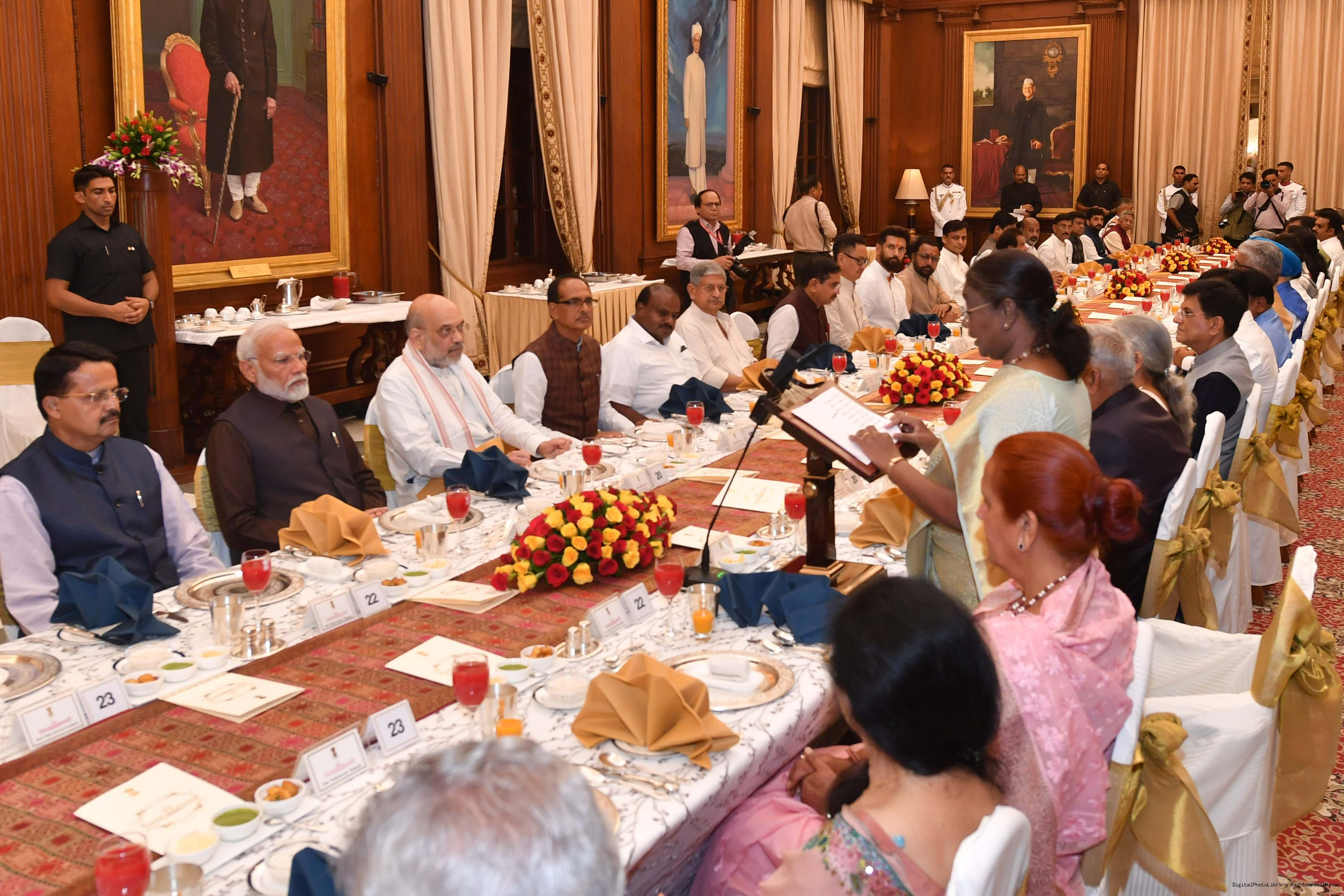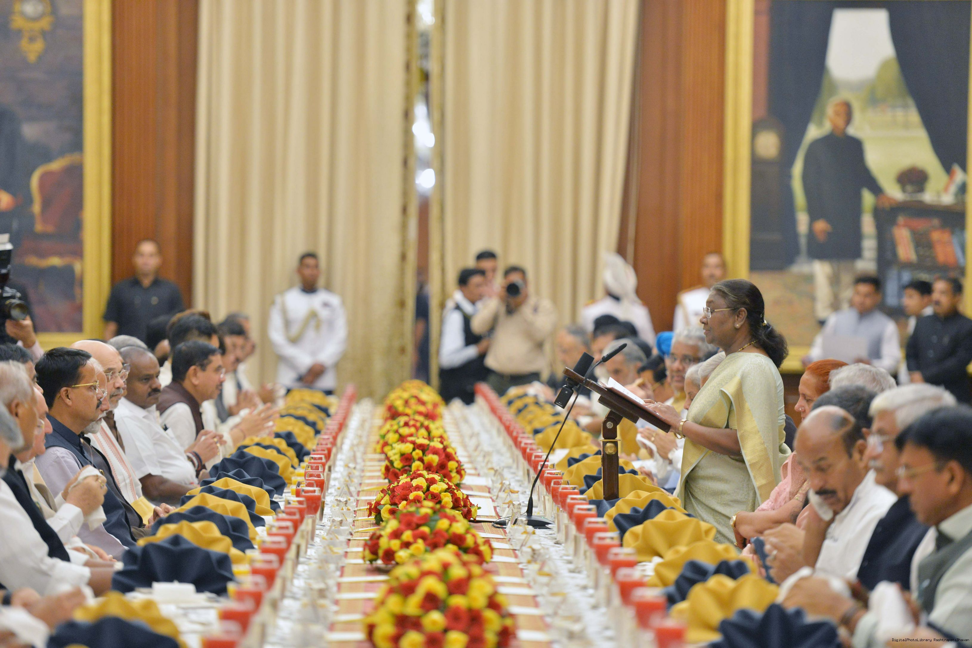 | Caption: | The President of India Smt. Droupadi Murmu hosted a dinner in honour of the Union Council of Ministers at Rashtrapati Bhavan on June 24, 2024. |
