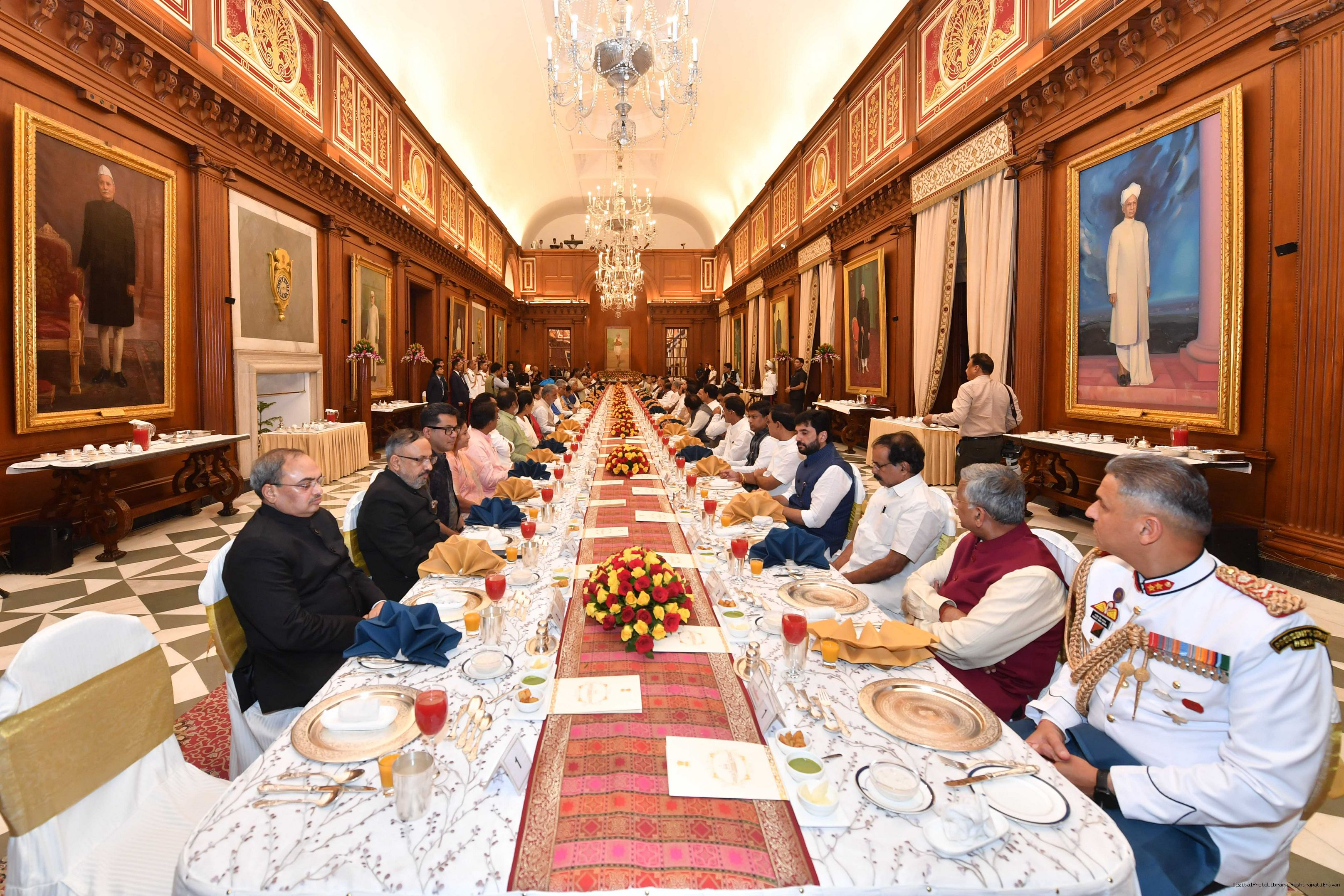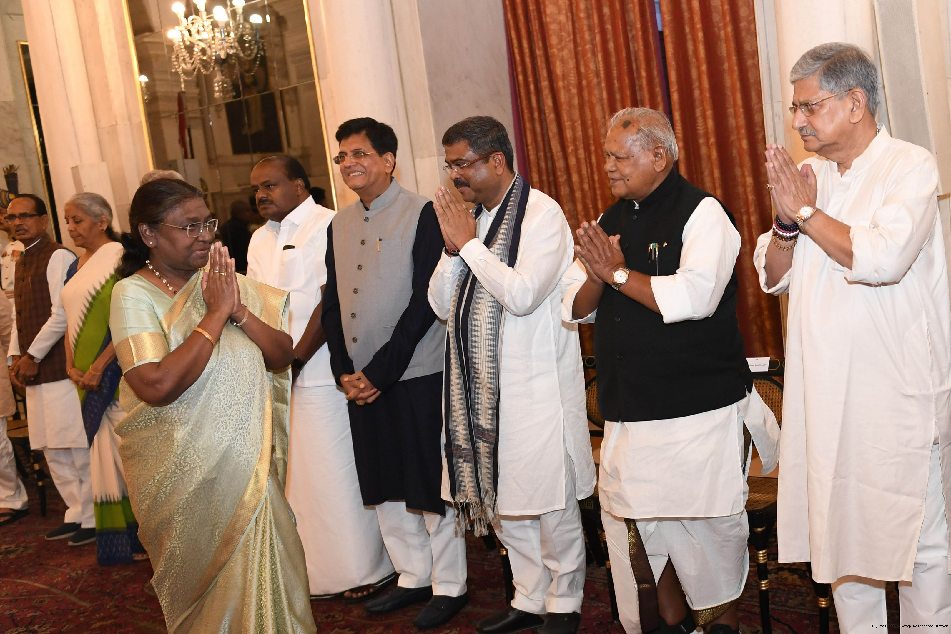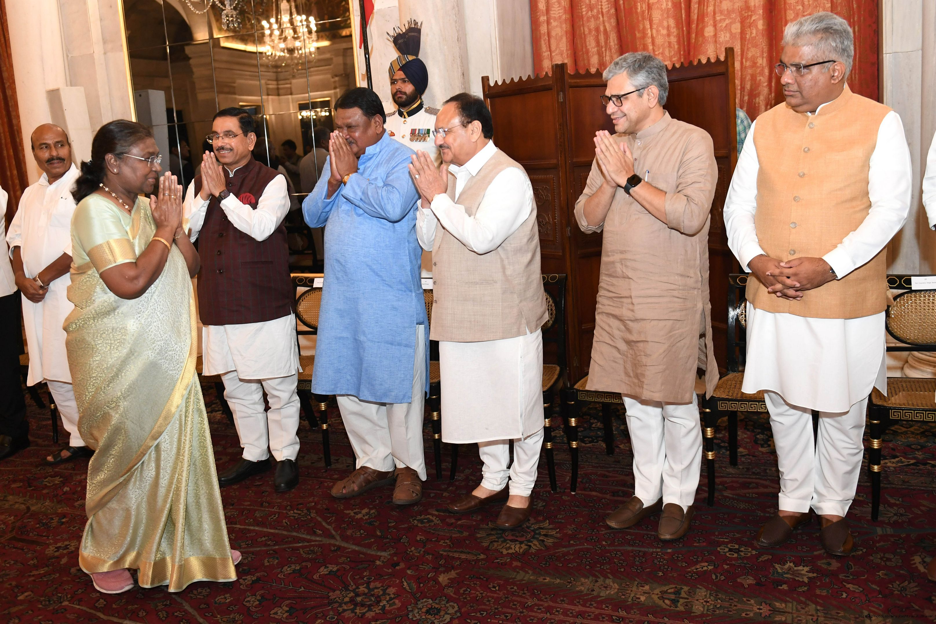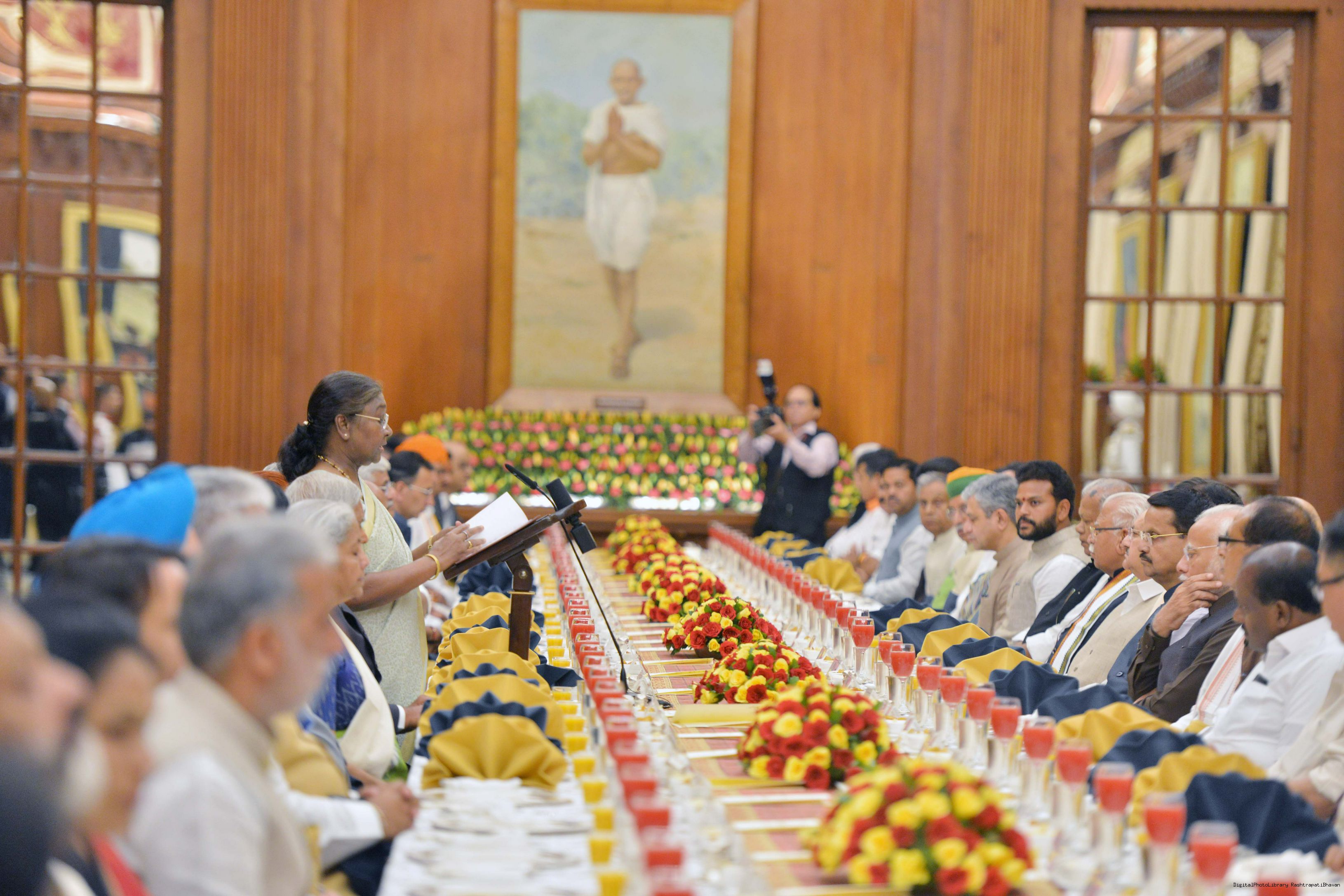 | Caption: | The President of India Smt. Droupadi Murmu hosted a dinner in honour of the Union Council of Ministers at Rashtrapati Bhavan on June 24, 2024. |