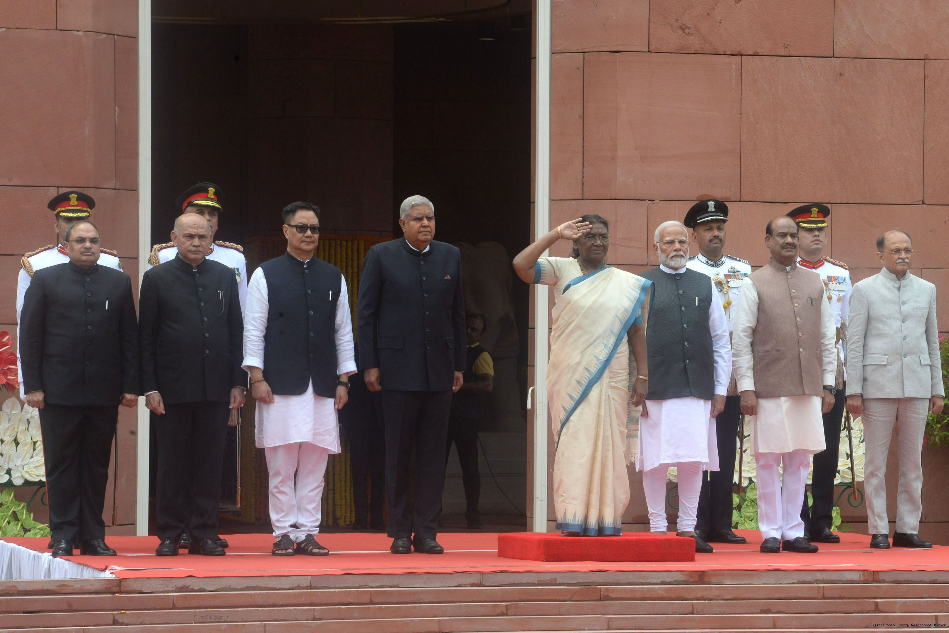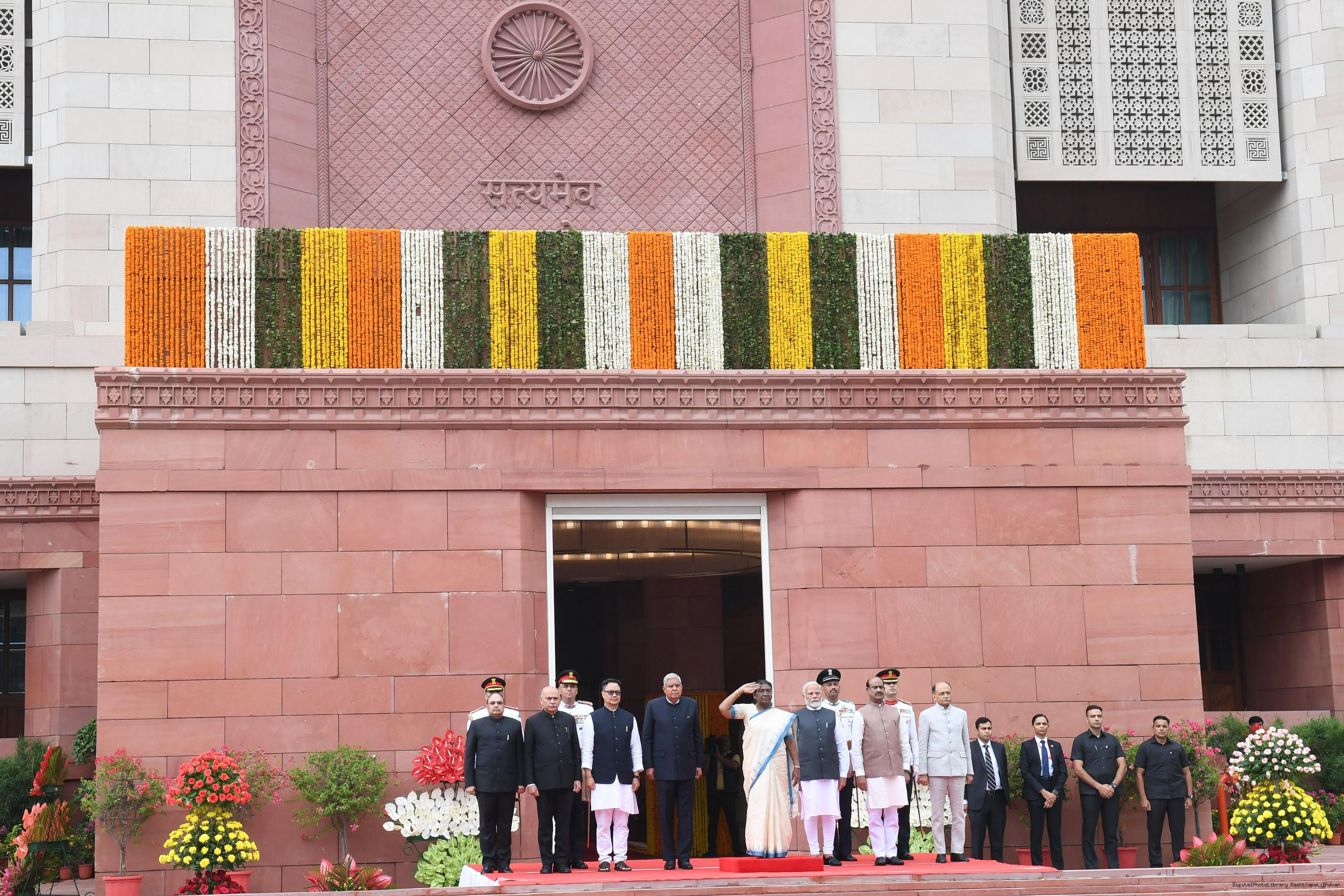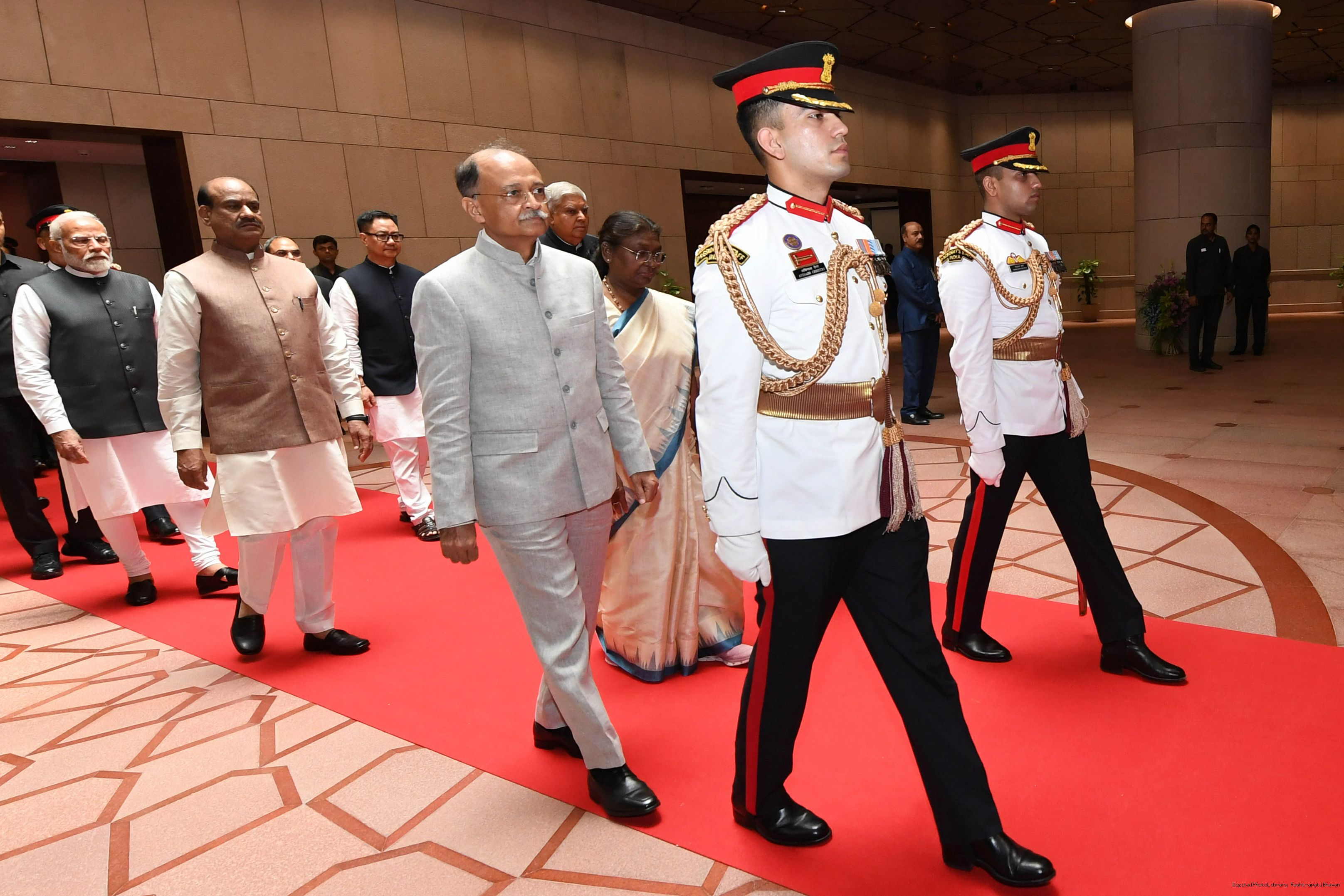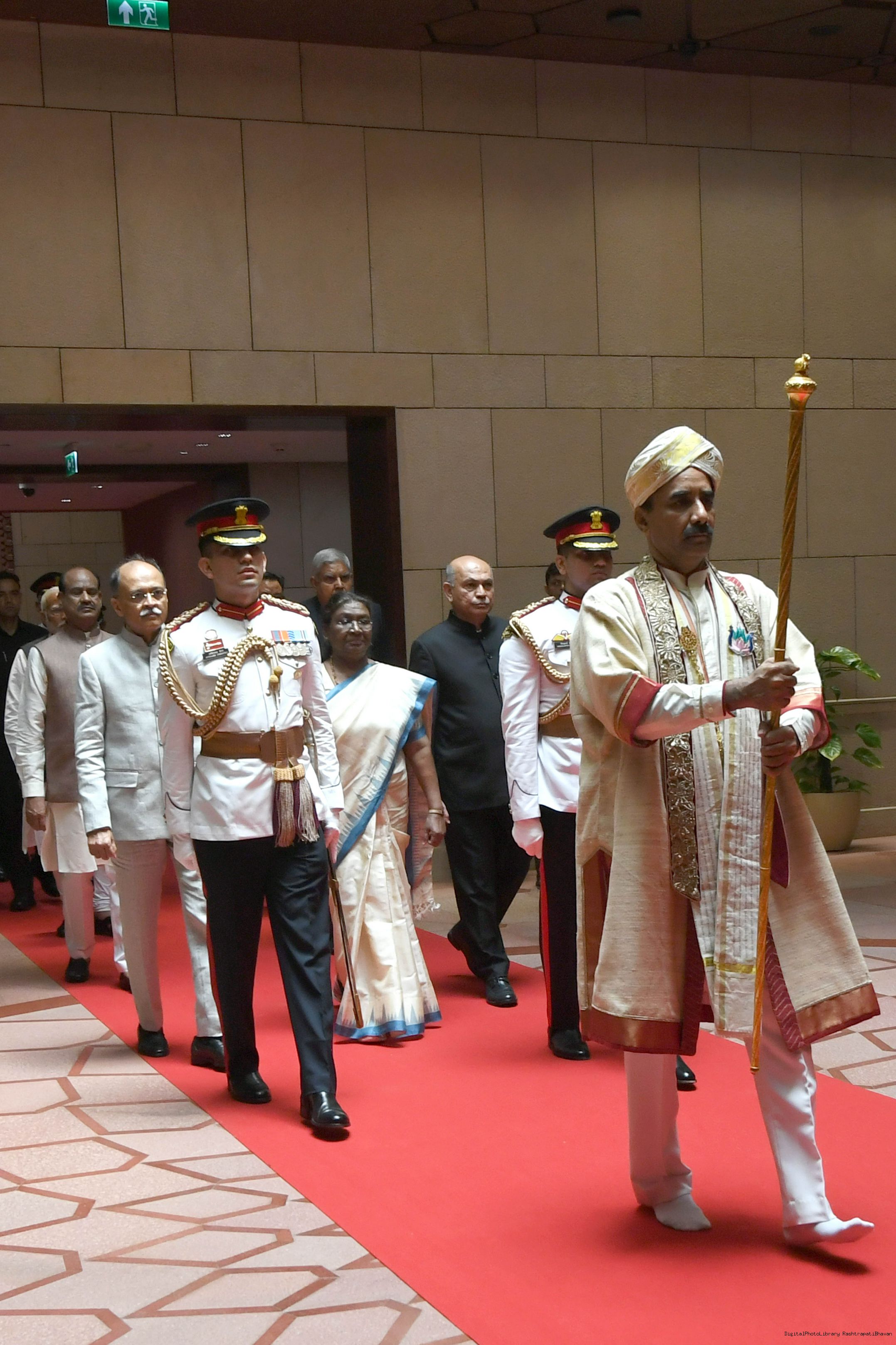 | Caption: | The President of India, Smt. Draupadi Murmu accompanied the procession and posed for a group photo in the Lok Sabha Chamber of Parliament House on June 27, 2024. |