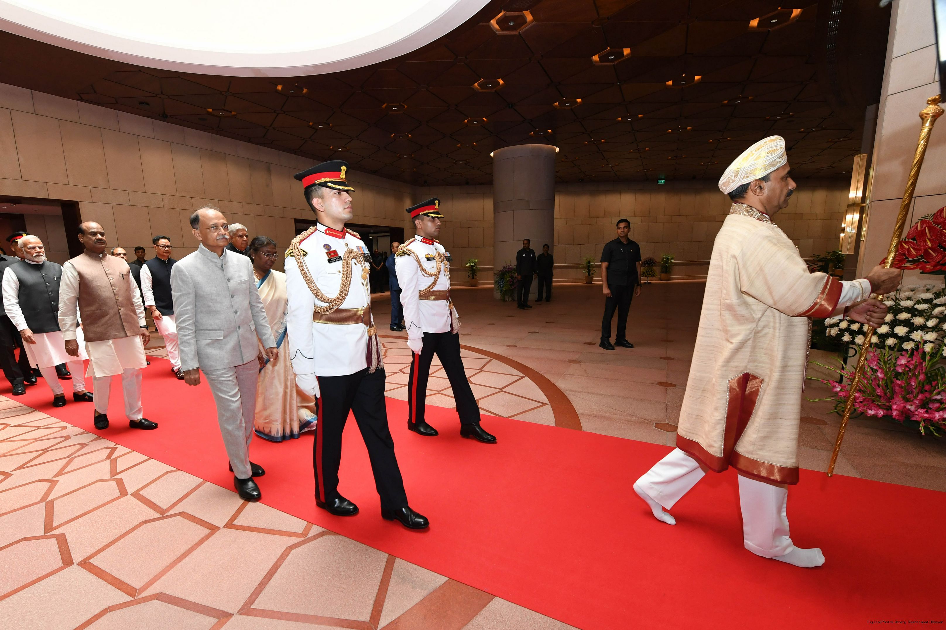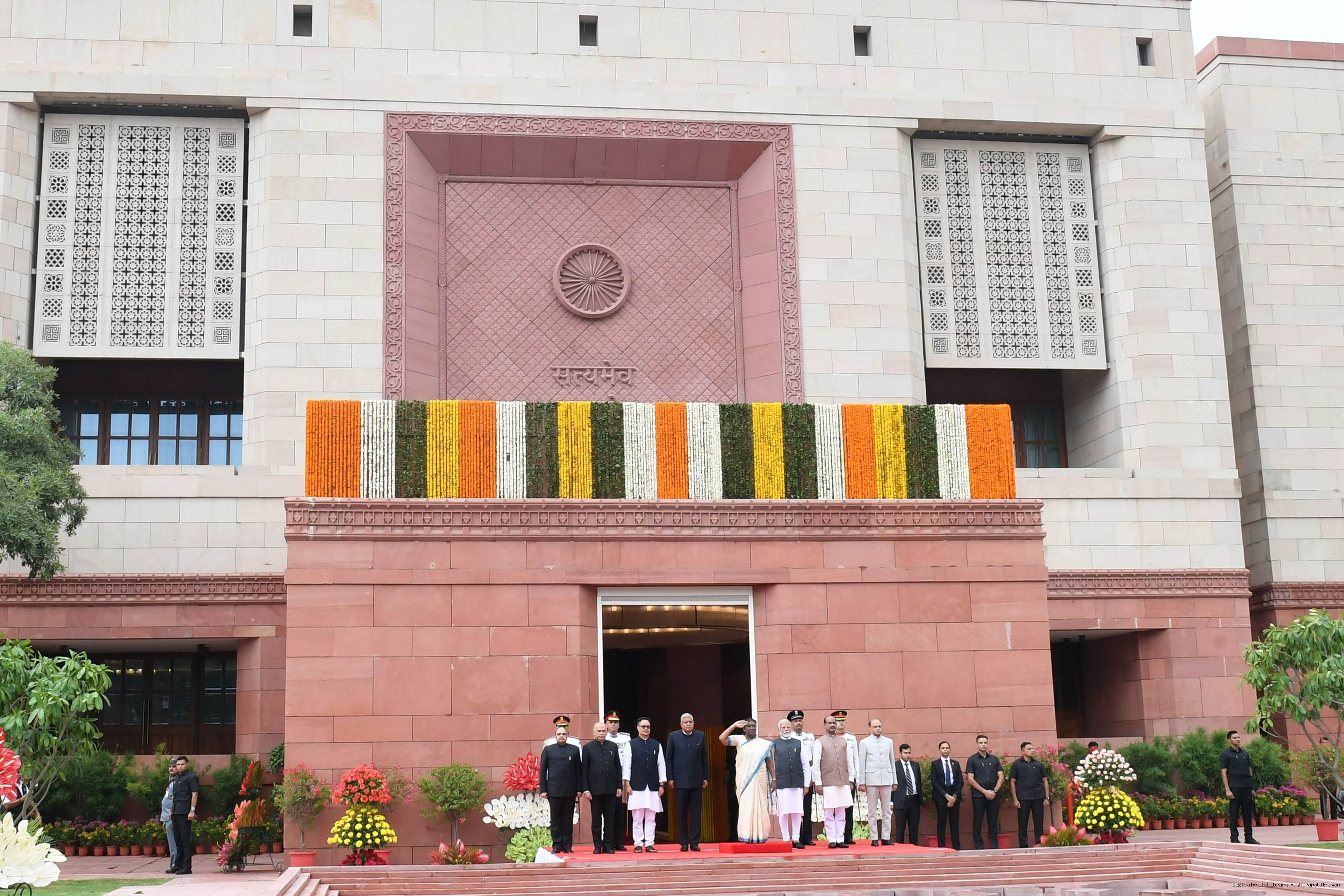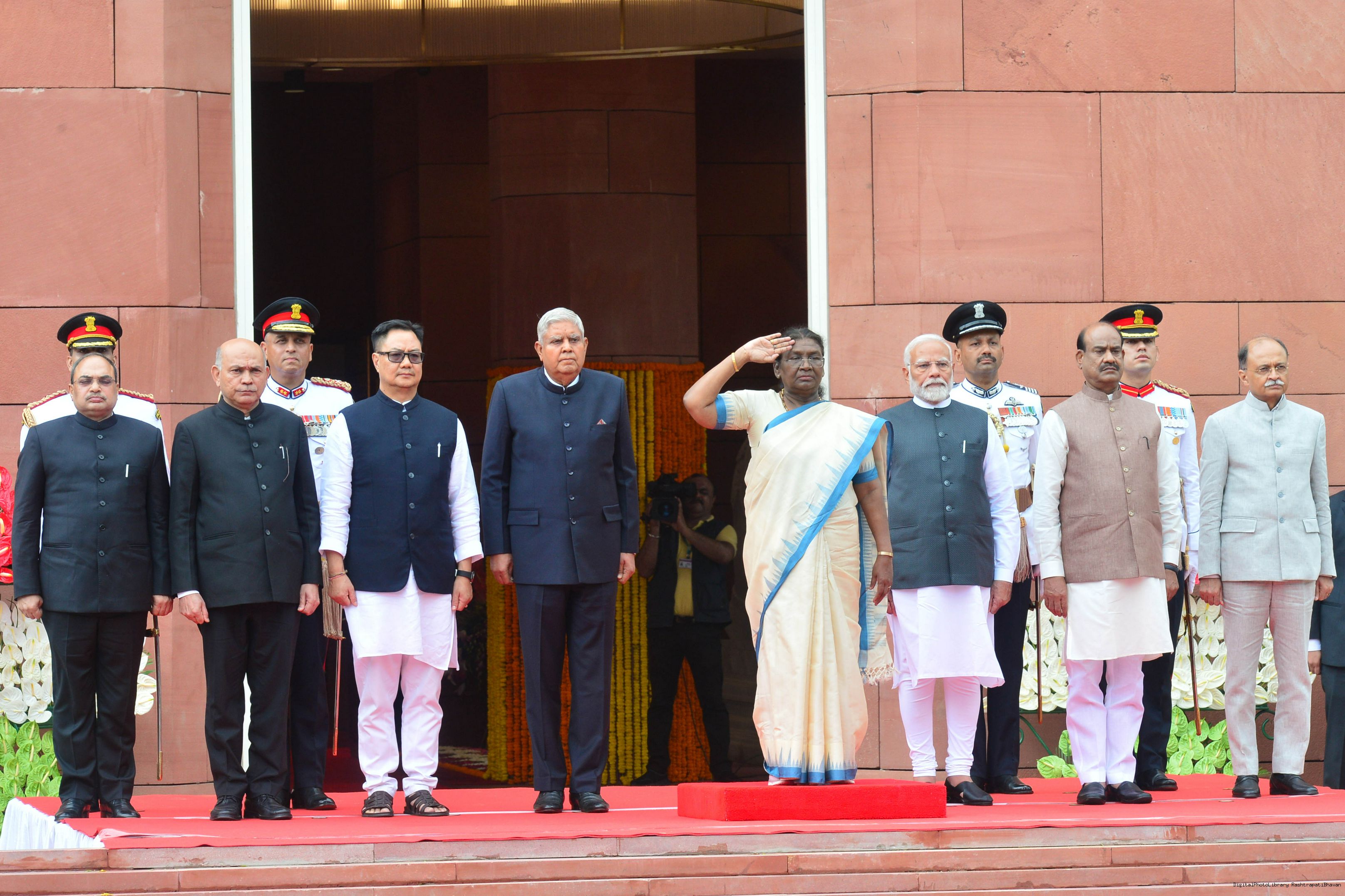 | Caption: | The President of India, Smt. Draupadi Murmu accompanied the procession and posed for a group photo in the Lok Sabha Chamber of Parliament House on June 27, 2024. |
