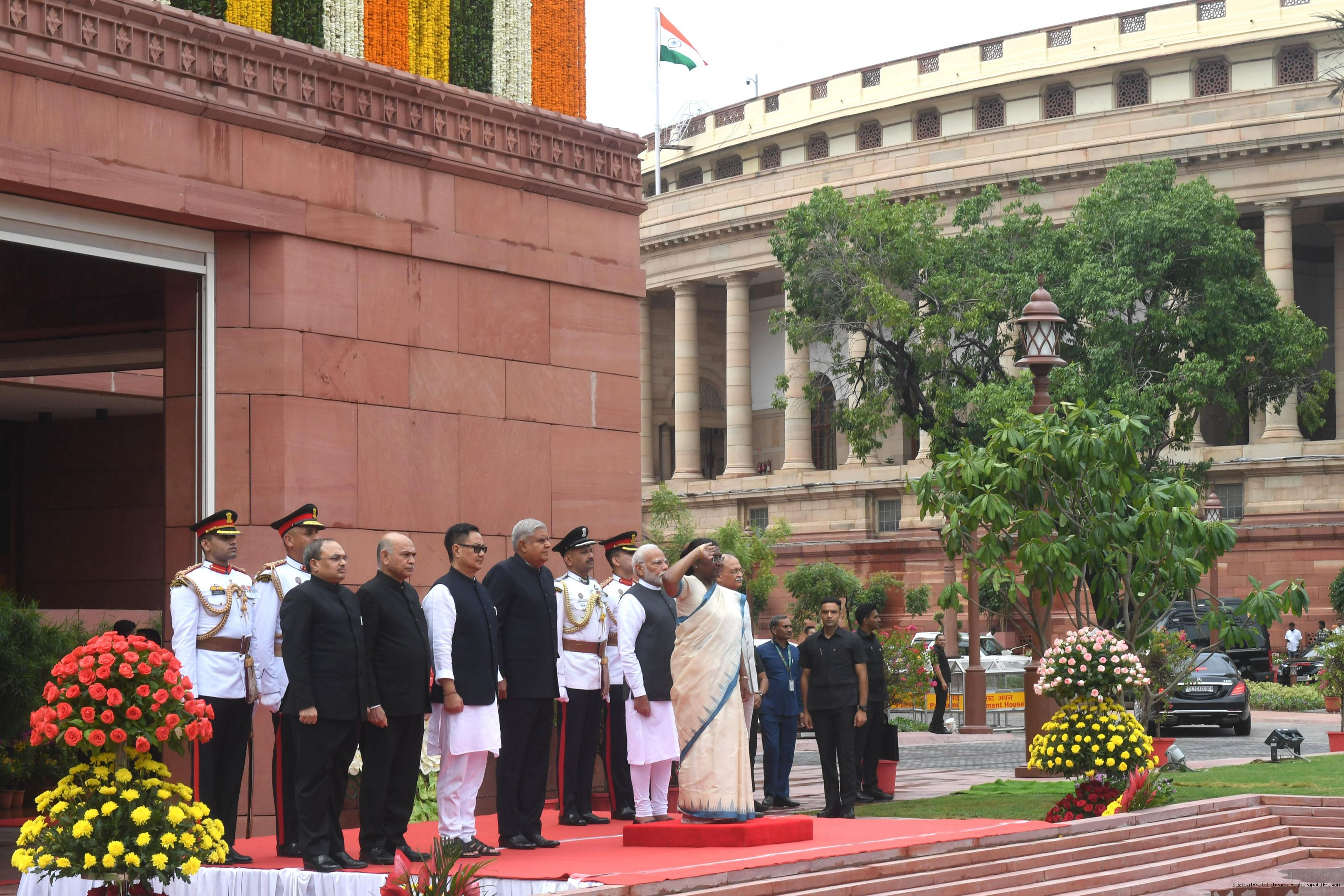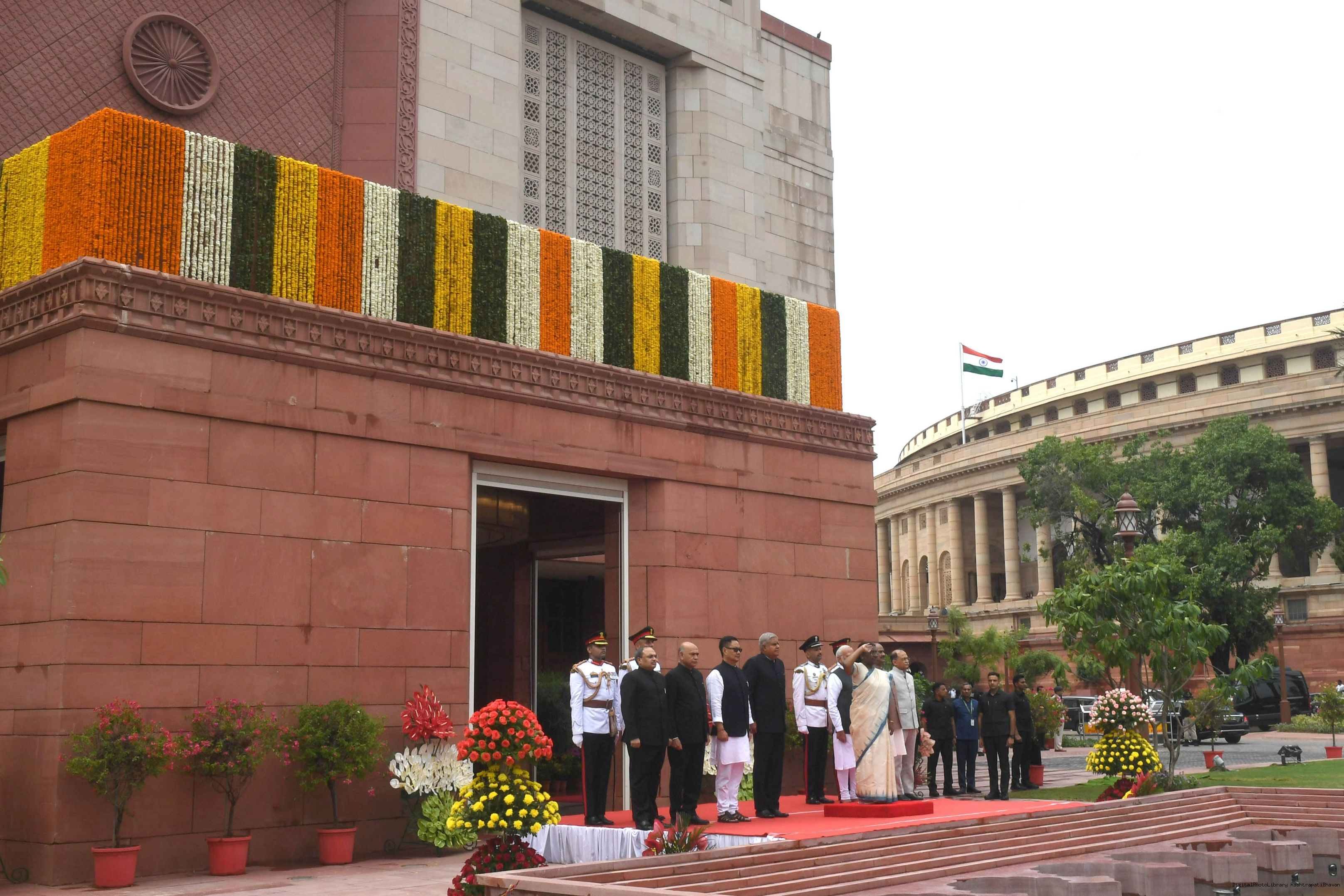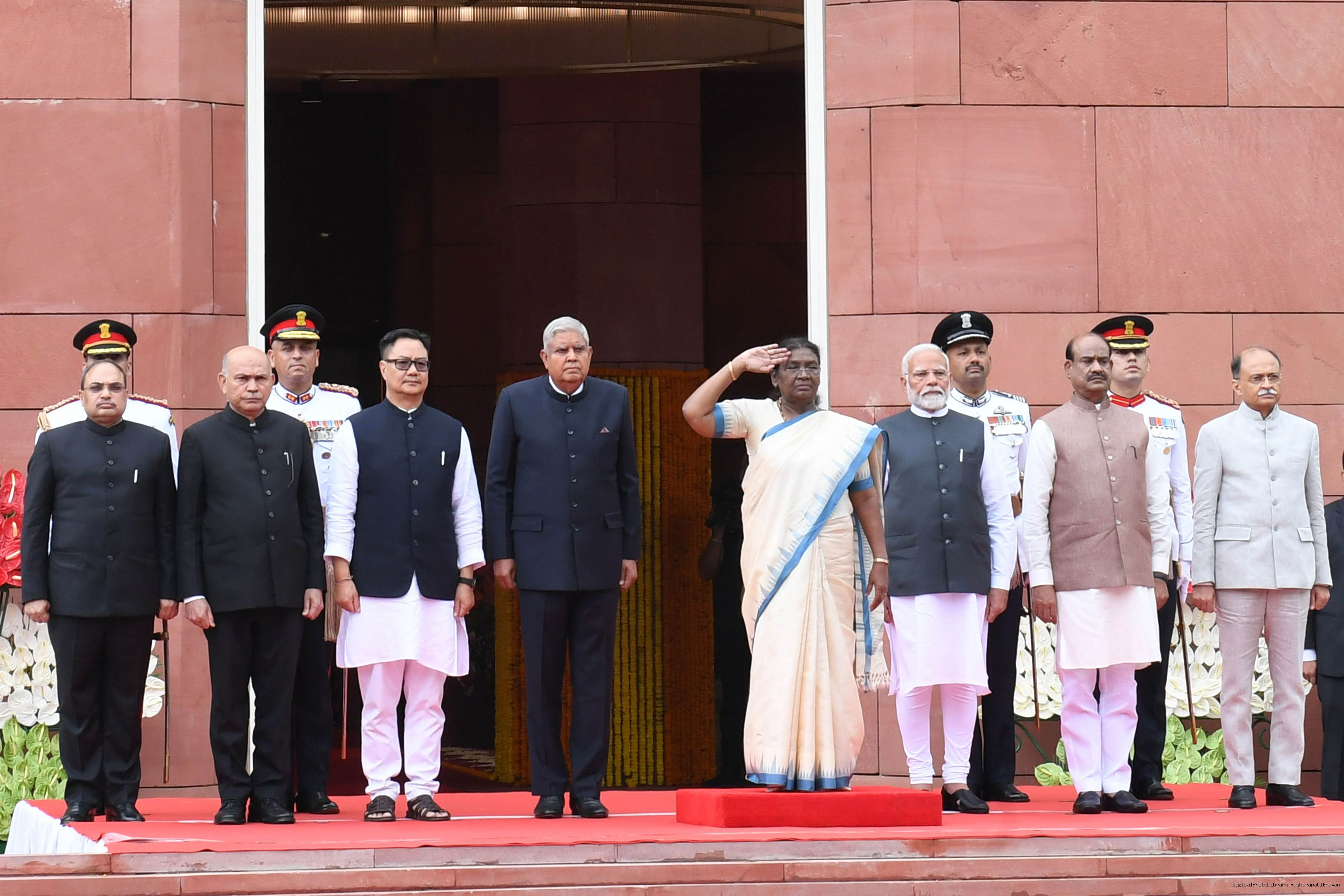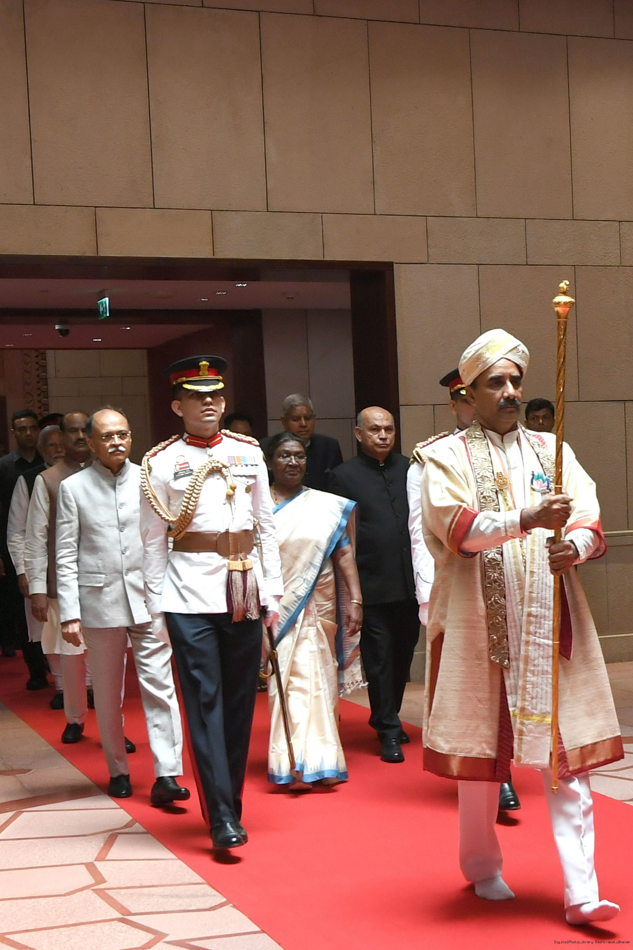 | Caption: | The President of India, Smt. Draupadi Murmu accompanied the procession and posed for a group photo in the Lok Sabha Chamber of Parliament House on June 27, 2024. |