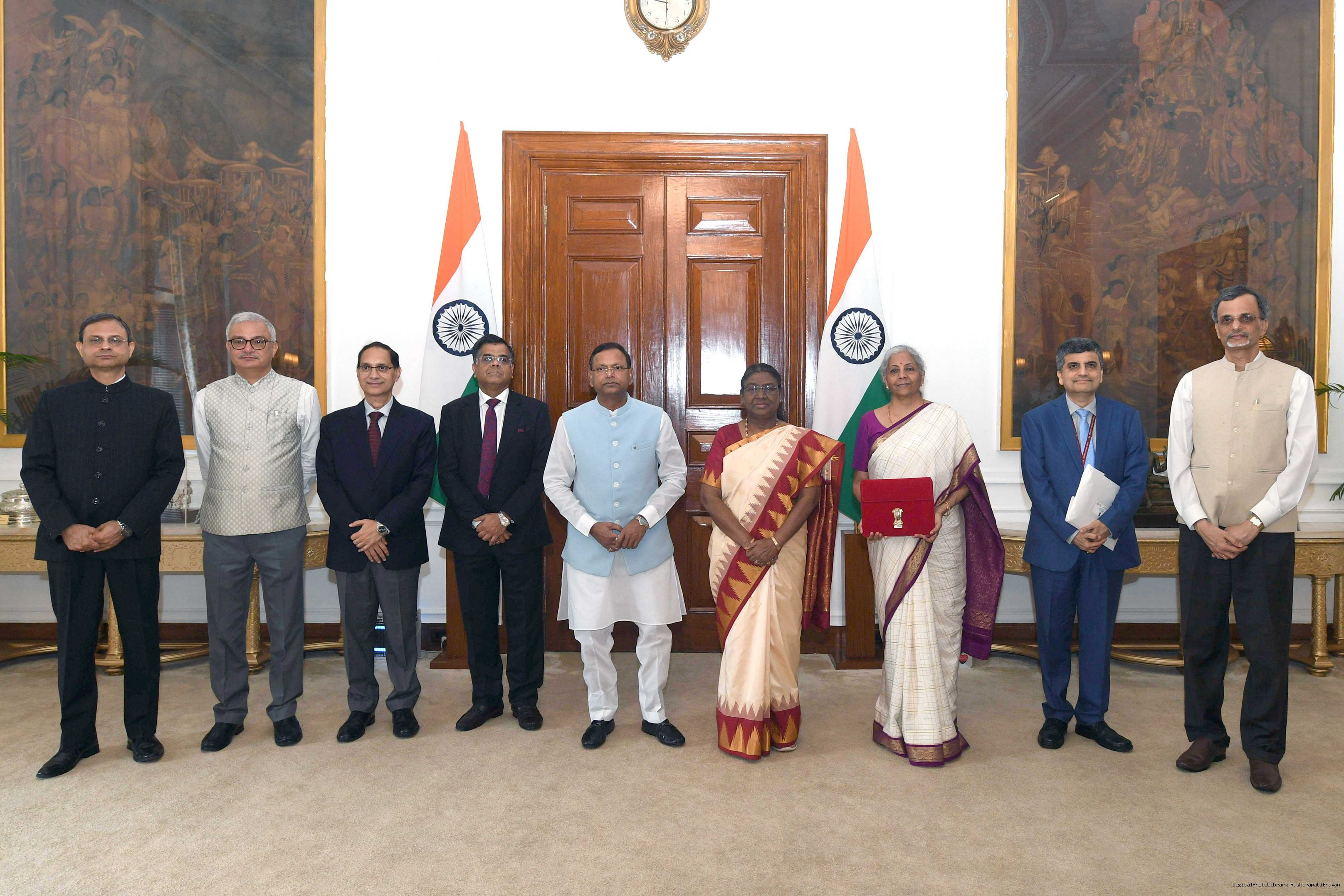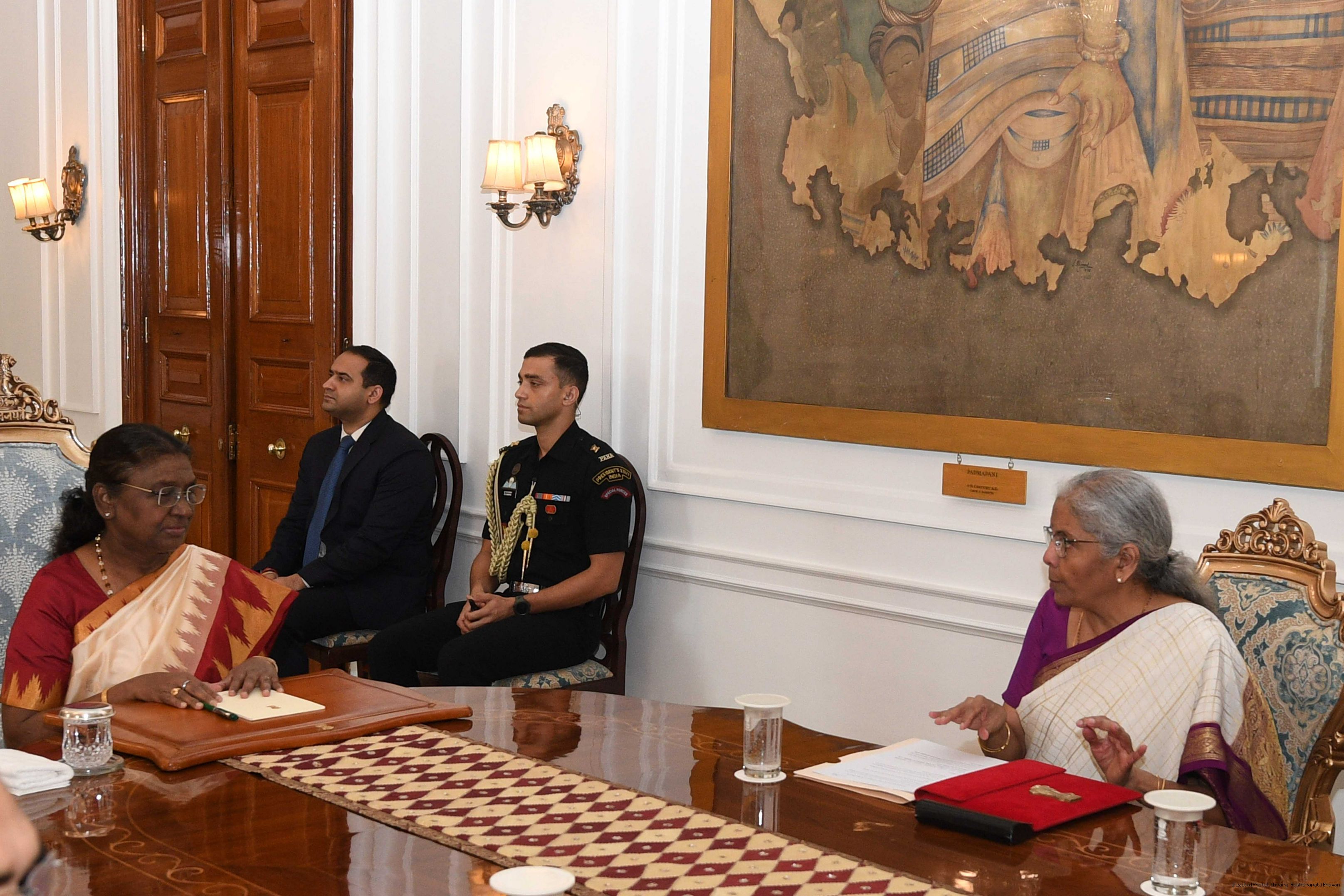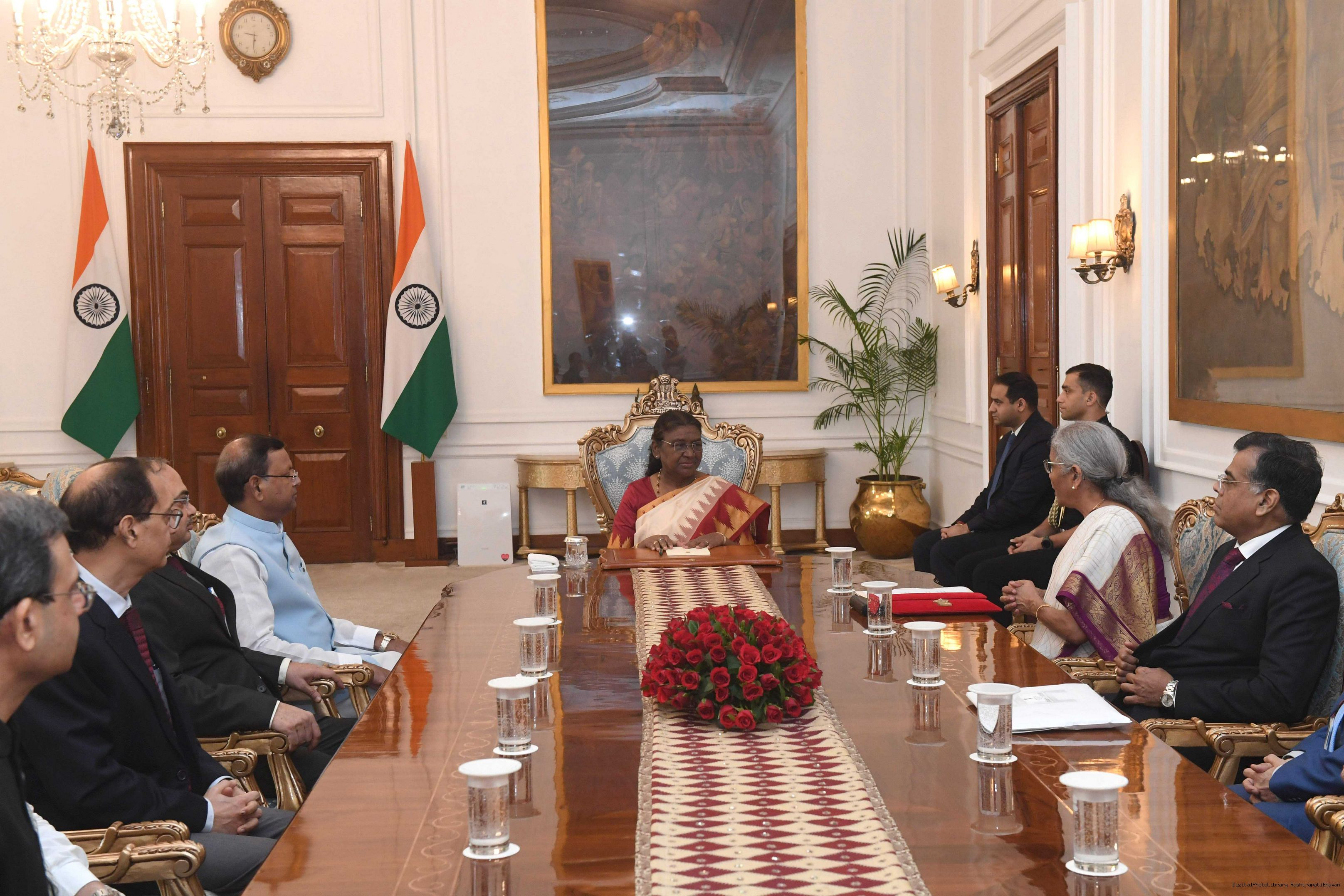 | Caption: | The Union Minister of Finance and Corporate Affairs Smt Nirmala Sitharaman along with Minister of State for Finance Shri Pankaj Chaudhary and senior officials of the Ministry of Finance called on the President of India Smt. Droupadi Murmu at Rashtrapati Bhavan on July 23, 2024. |