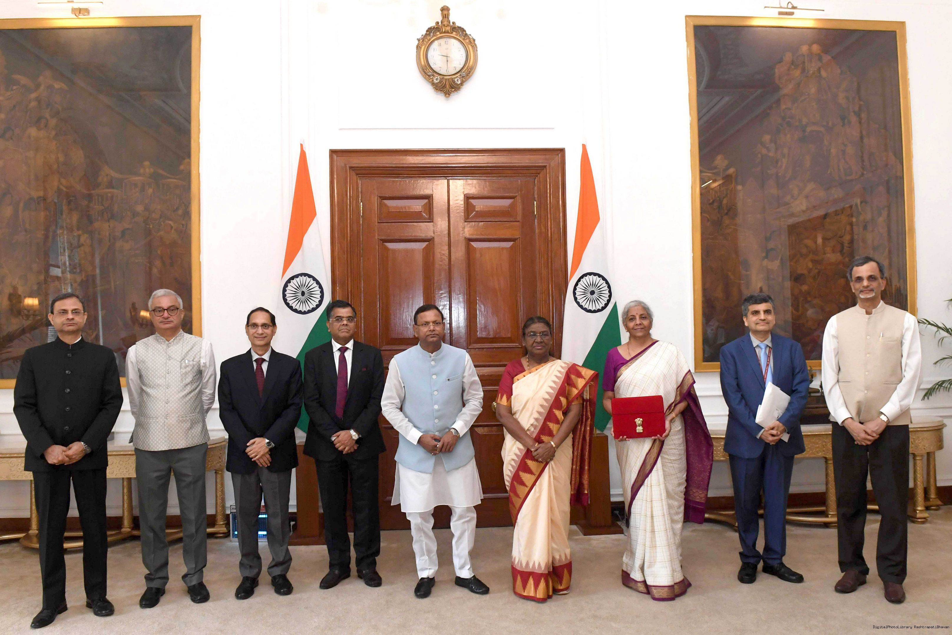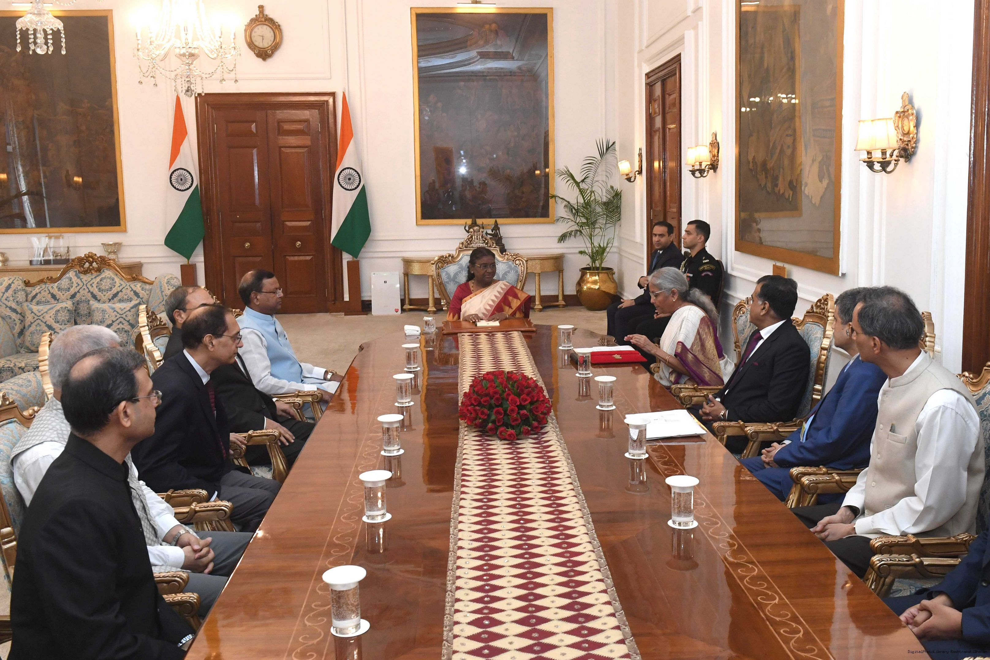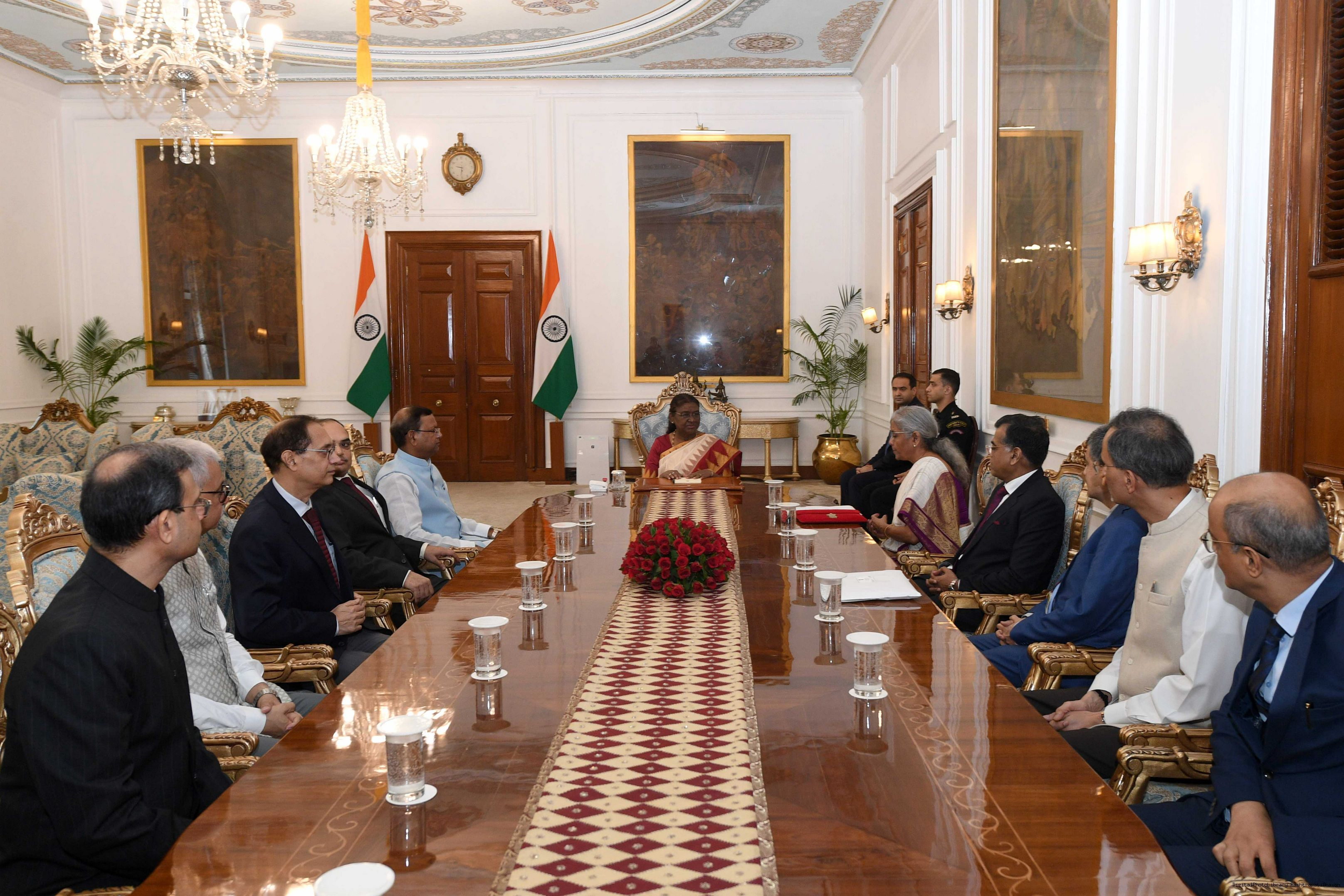 | Caption: | The Union Minister of Finance and Corporate Affairs Smt Nirmala Sitharaman along with Minister of State for Finance Shri Pankaj Chaudhary and senior officials of the Ministry of Finance called on the President of India Smt. Droupadi Murmu at Rashtrapati Bhavan on July 23, 2024. |