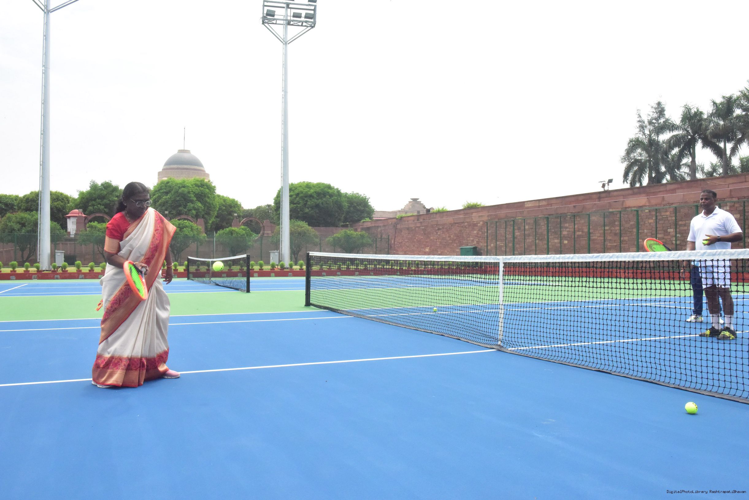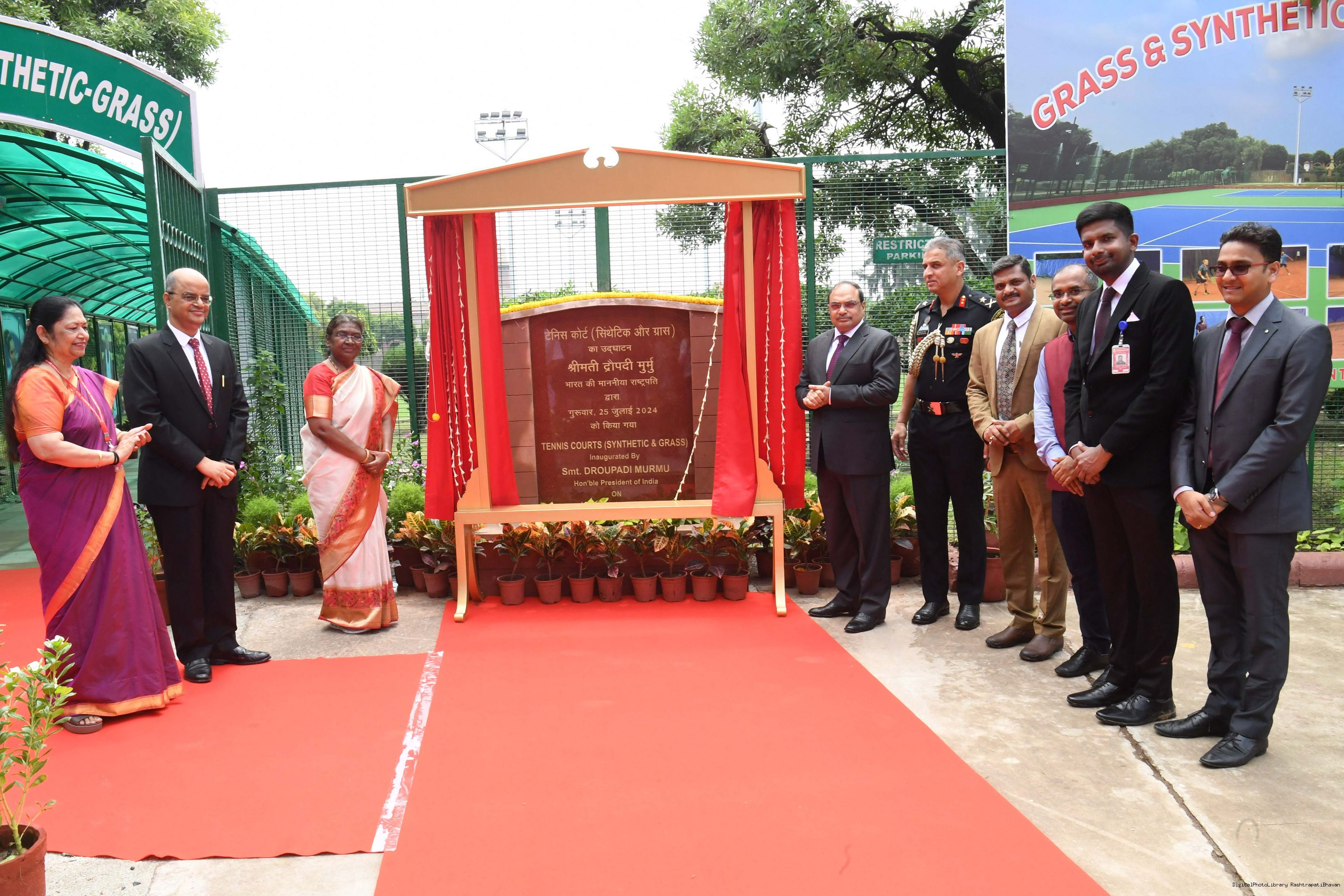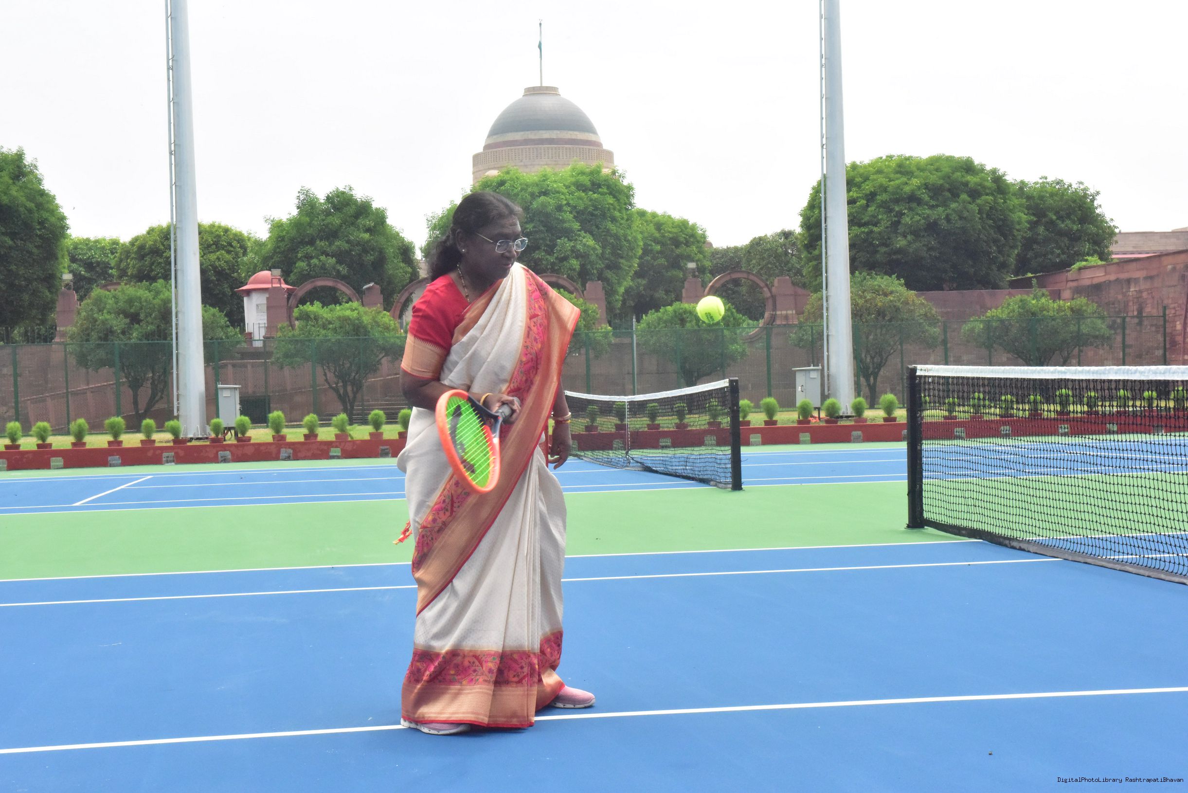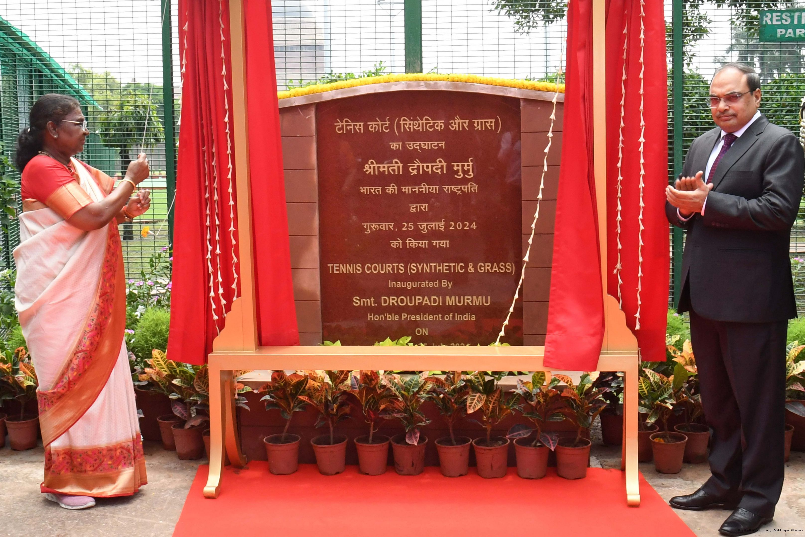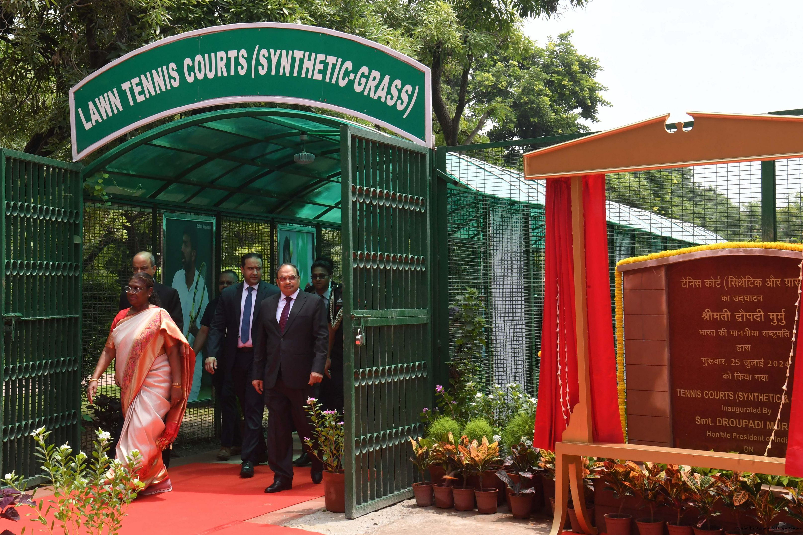 | Caption: | The President of India, Smt Droupadi Murmu Inaugurated Tennis Courts (Synthetic Grass) President Estate at Rashtrapati Bhavan on July 25, 2024. |