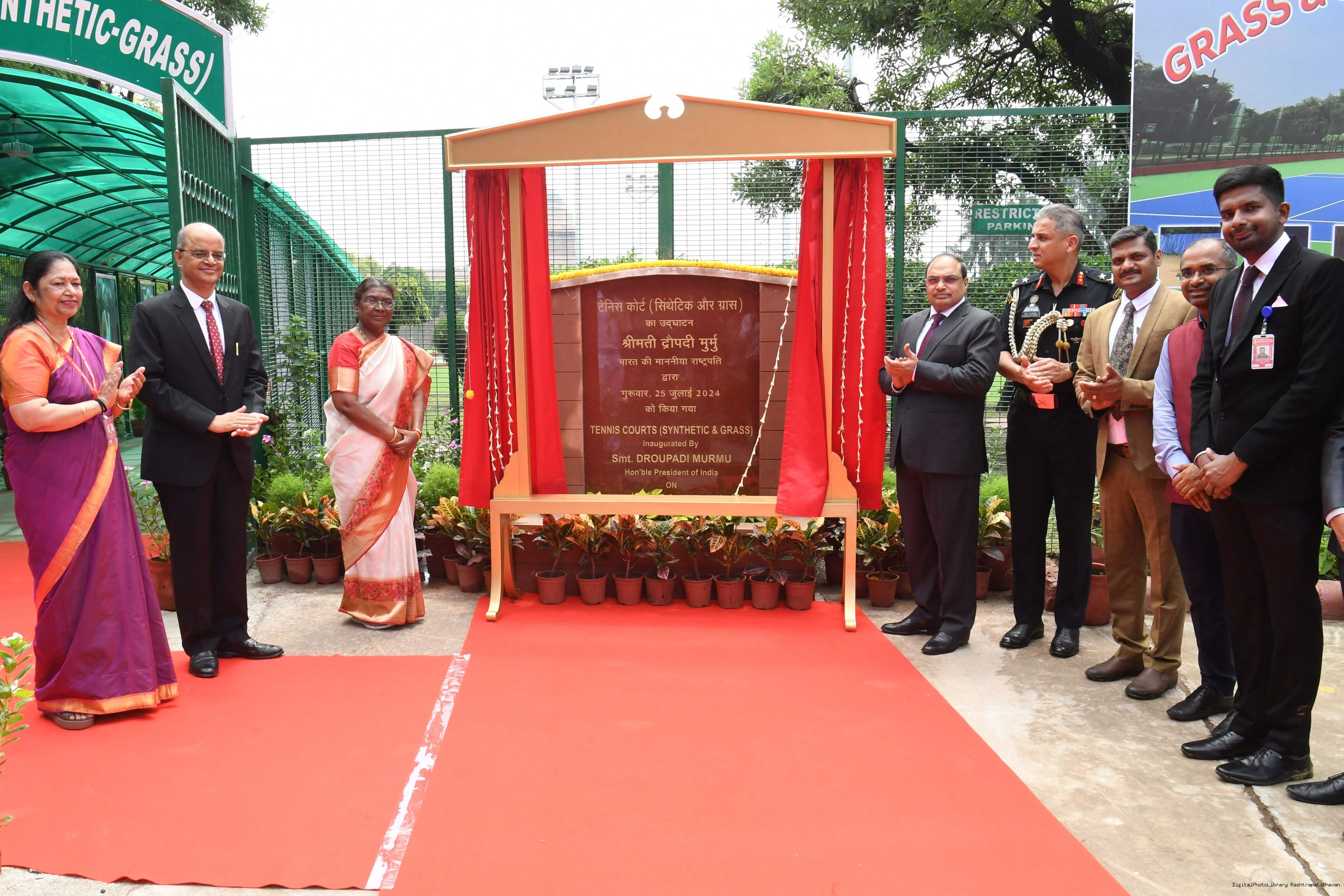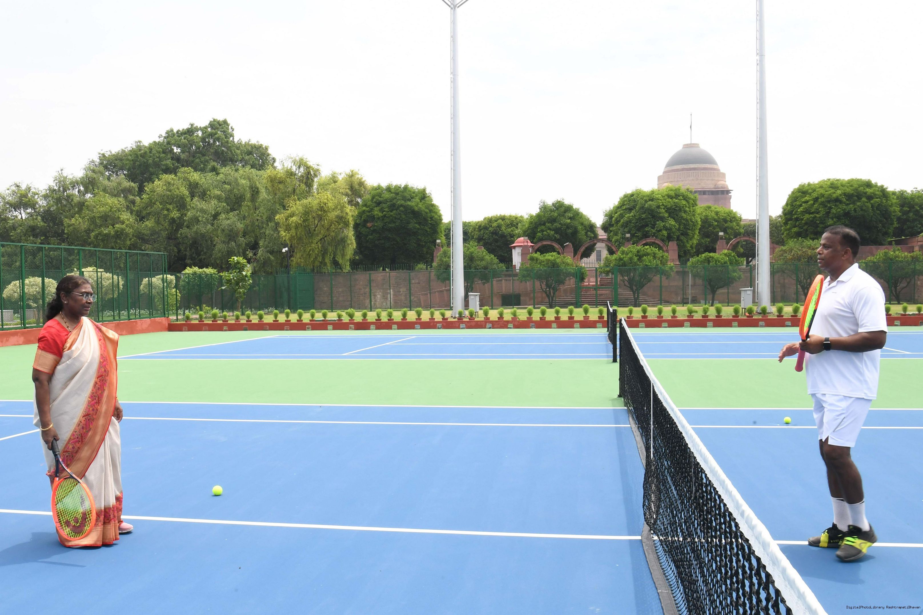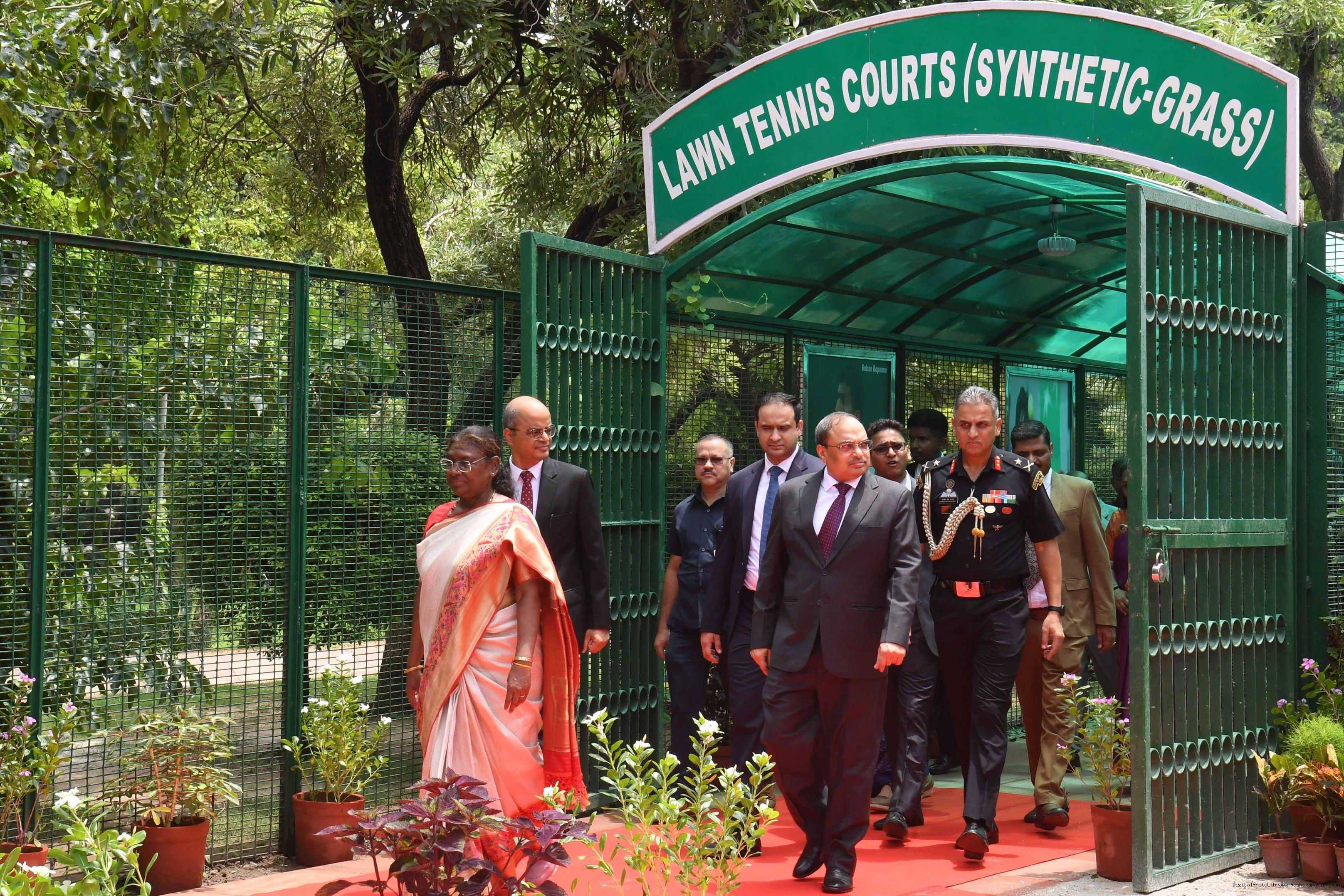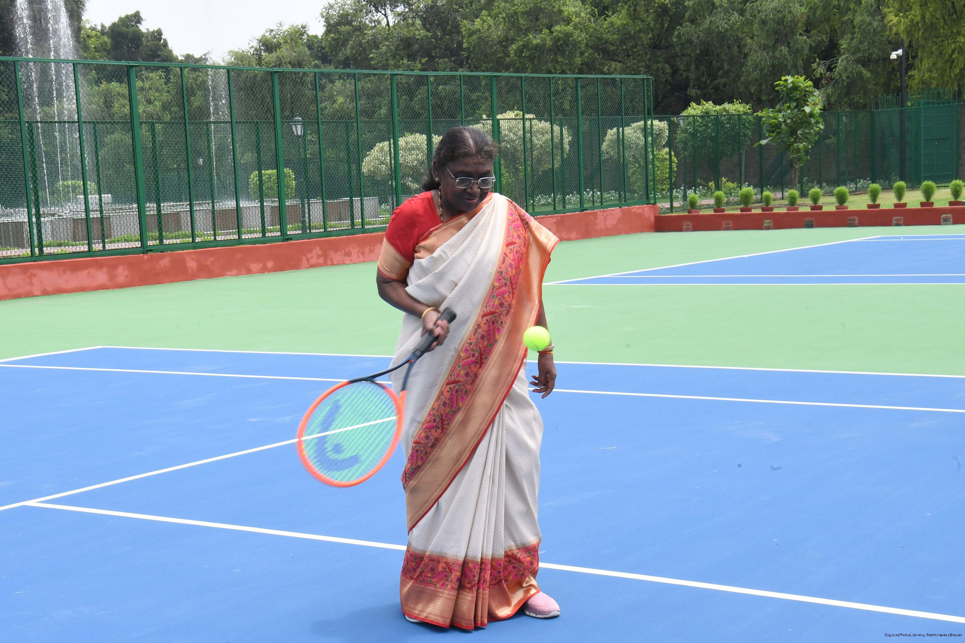 | Caption: | The President of India, Smt Droupadi Murmu Inaugurated Tennis Courts (Synthetic Grass) President Estate at Rashtrapati Bhavan on July 25, 2024. |
