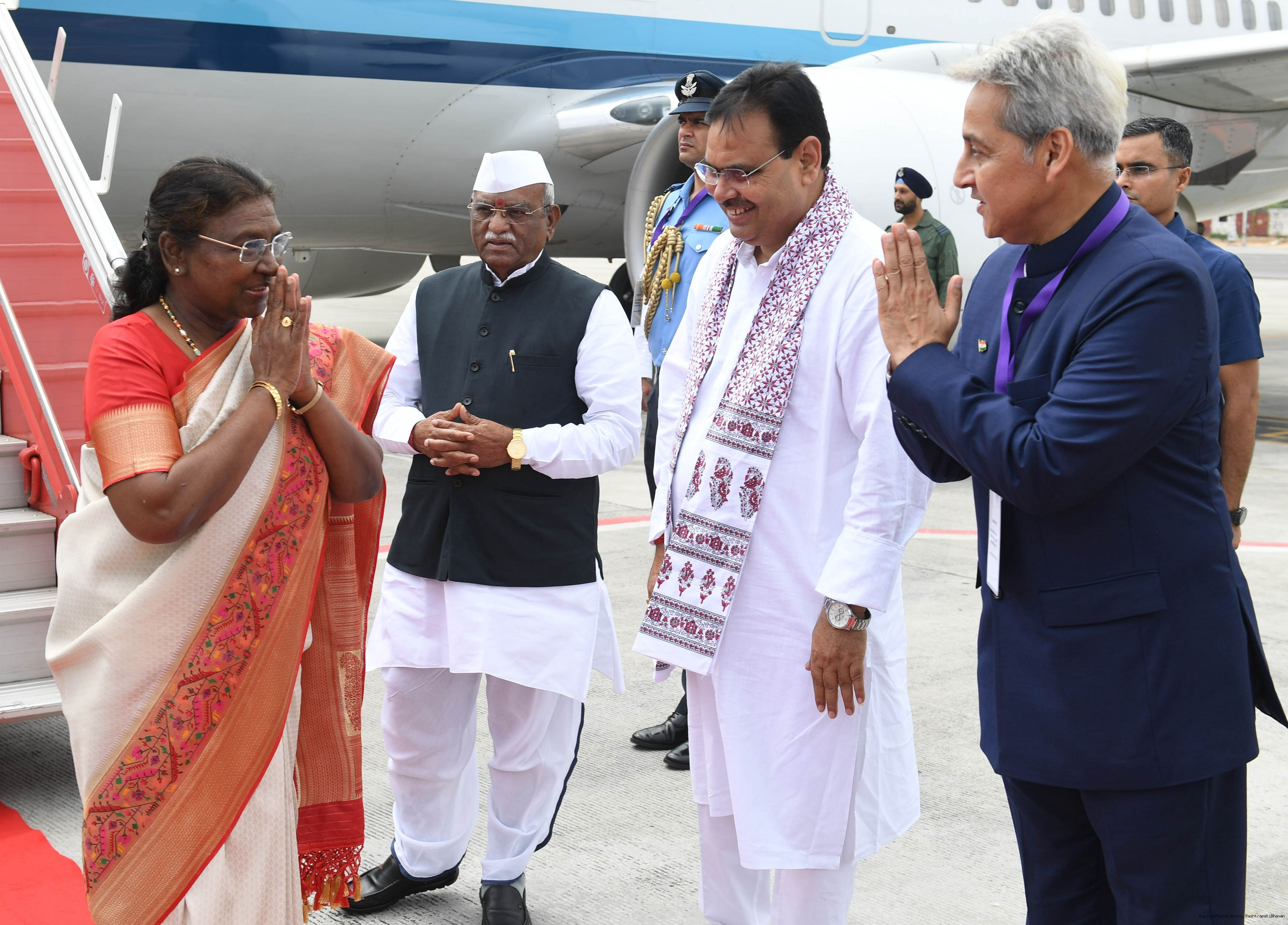 | Caption: | The Governor of Rajasthan, Shri Haribhau Kisanrao Bagde and Chief Minister, Shri Bhajanlal Sharma received the President of India Smt. Droupadi Murmu on her arrival at Jaipur, Rajasthan on September 18, 2024. |