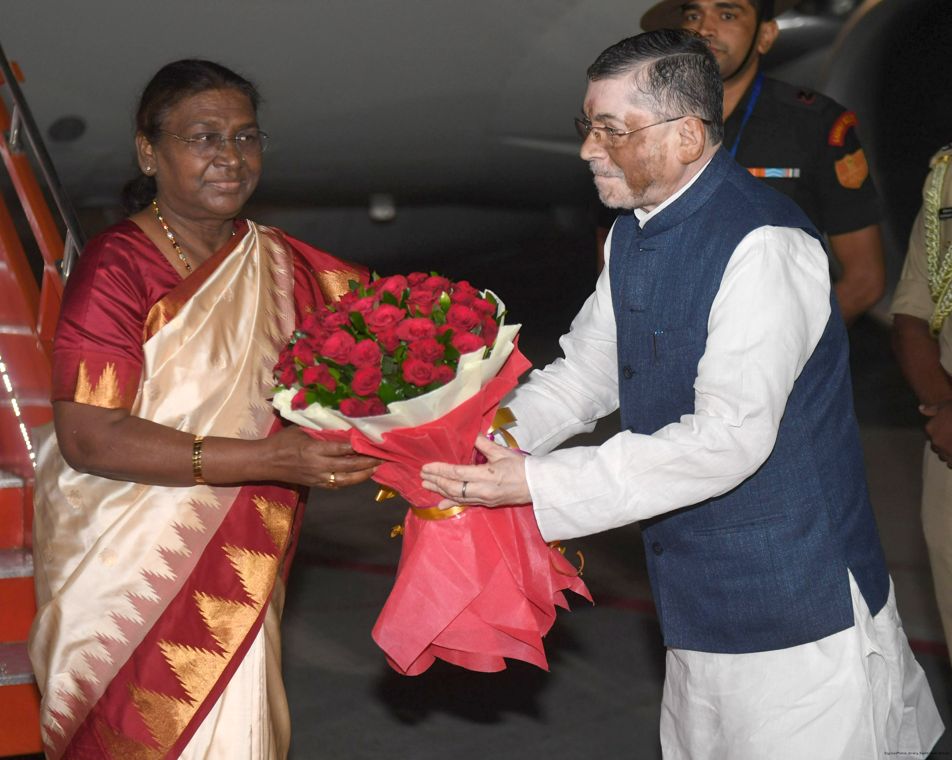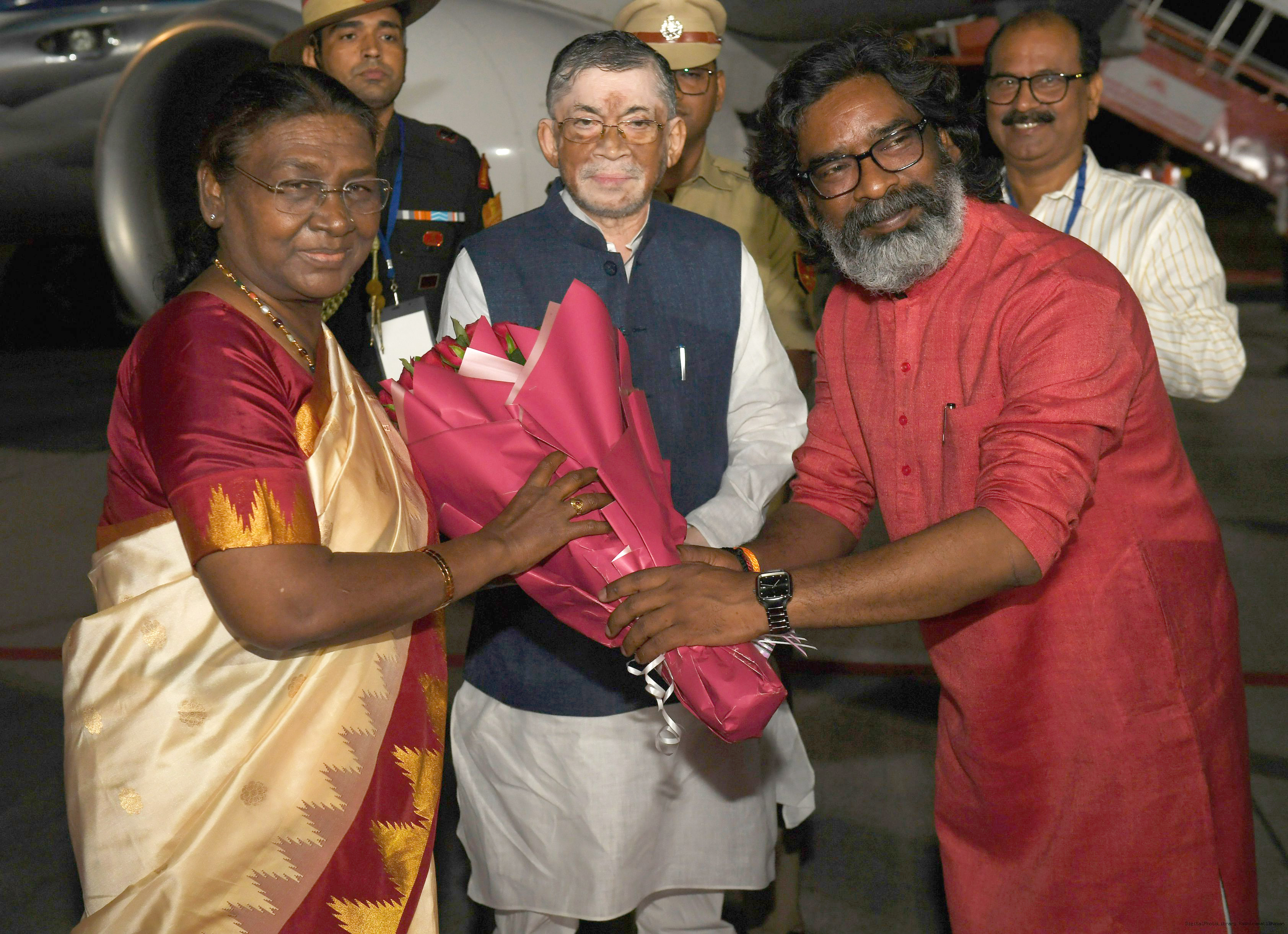 | Caption: | The Governor of Jharkhand, Shri Santosh Kumar Gangwar, Union Minister of Agriculture Farmers Welfare and Rural Development Shri Shivraj Singh Chouhan and Chief Minister Shri Hemant Soren received the President of India Smt. Droupadi Murmu on her arrival in Ranchi on September 19, 2024. |