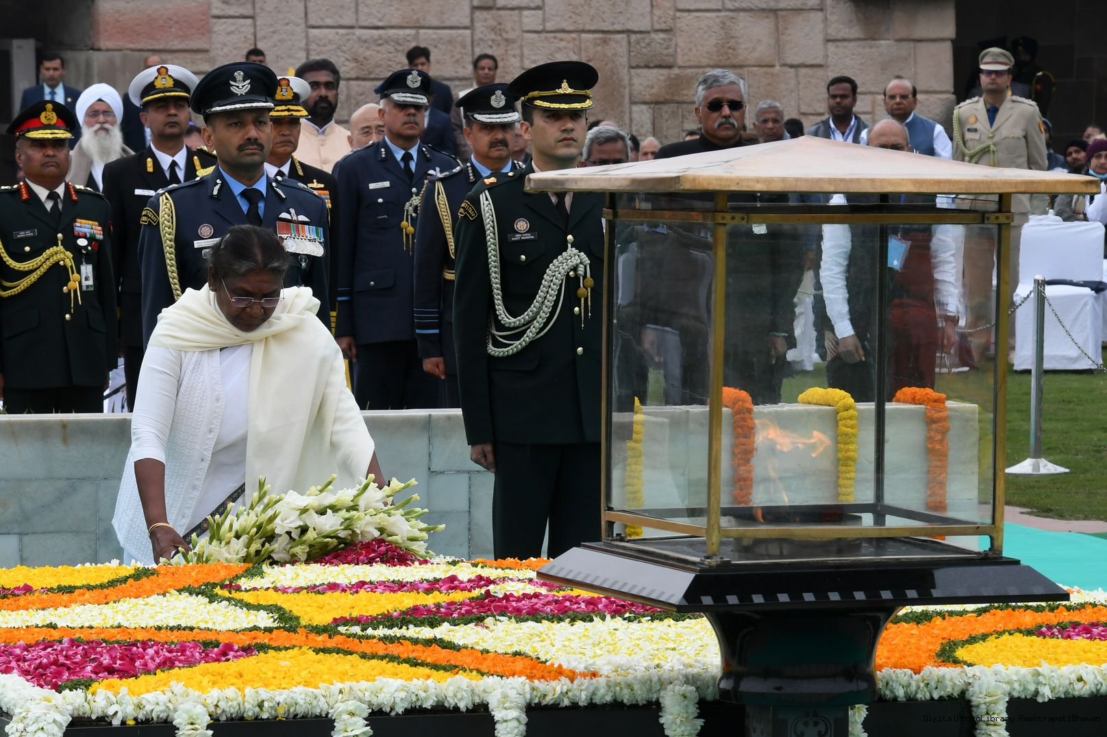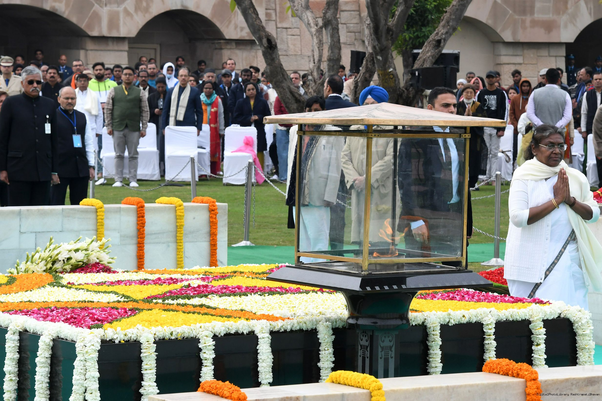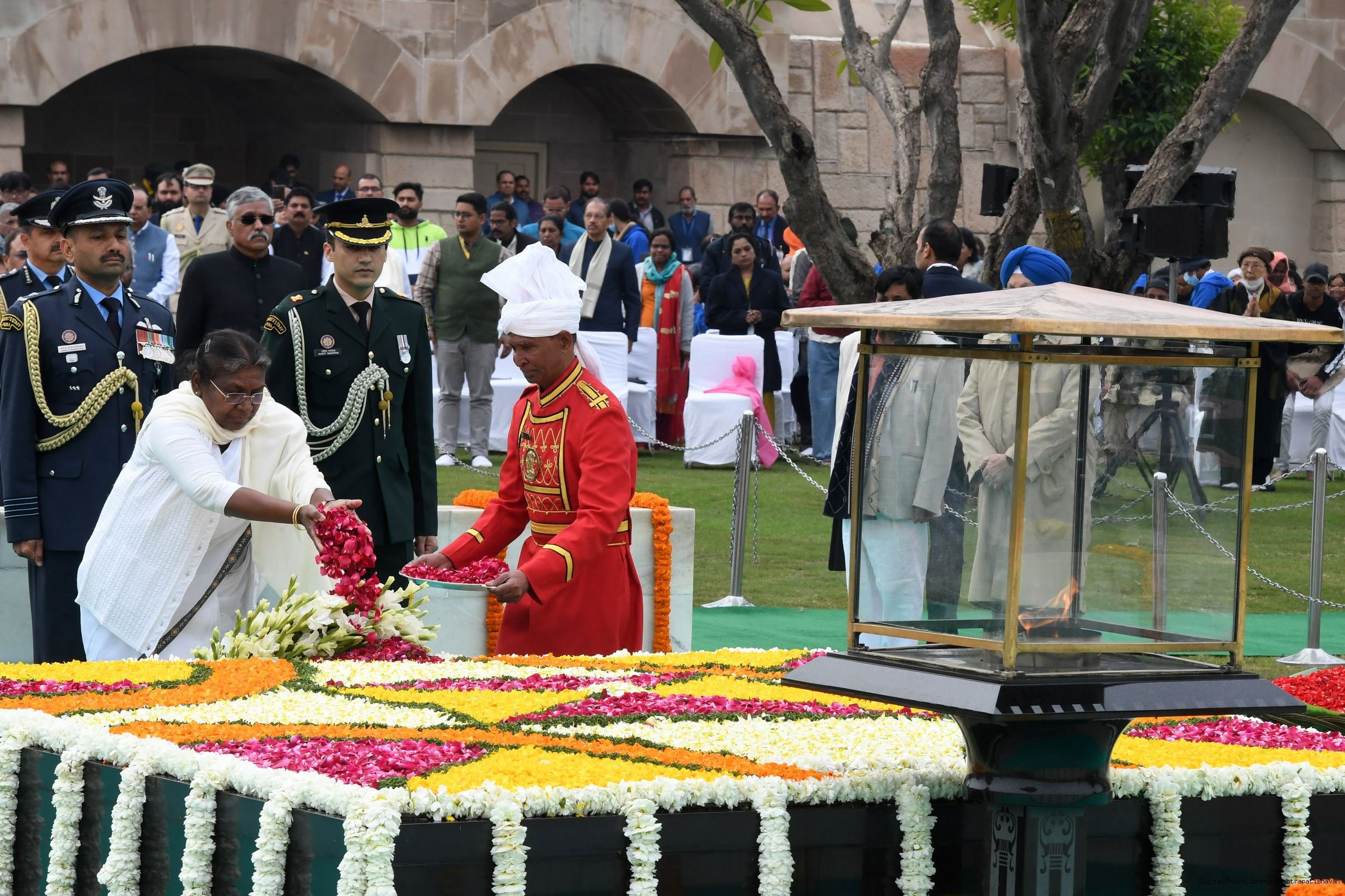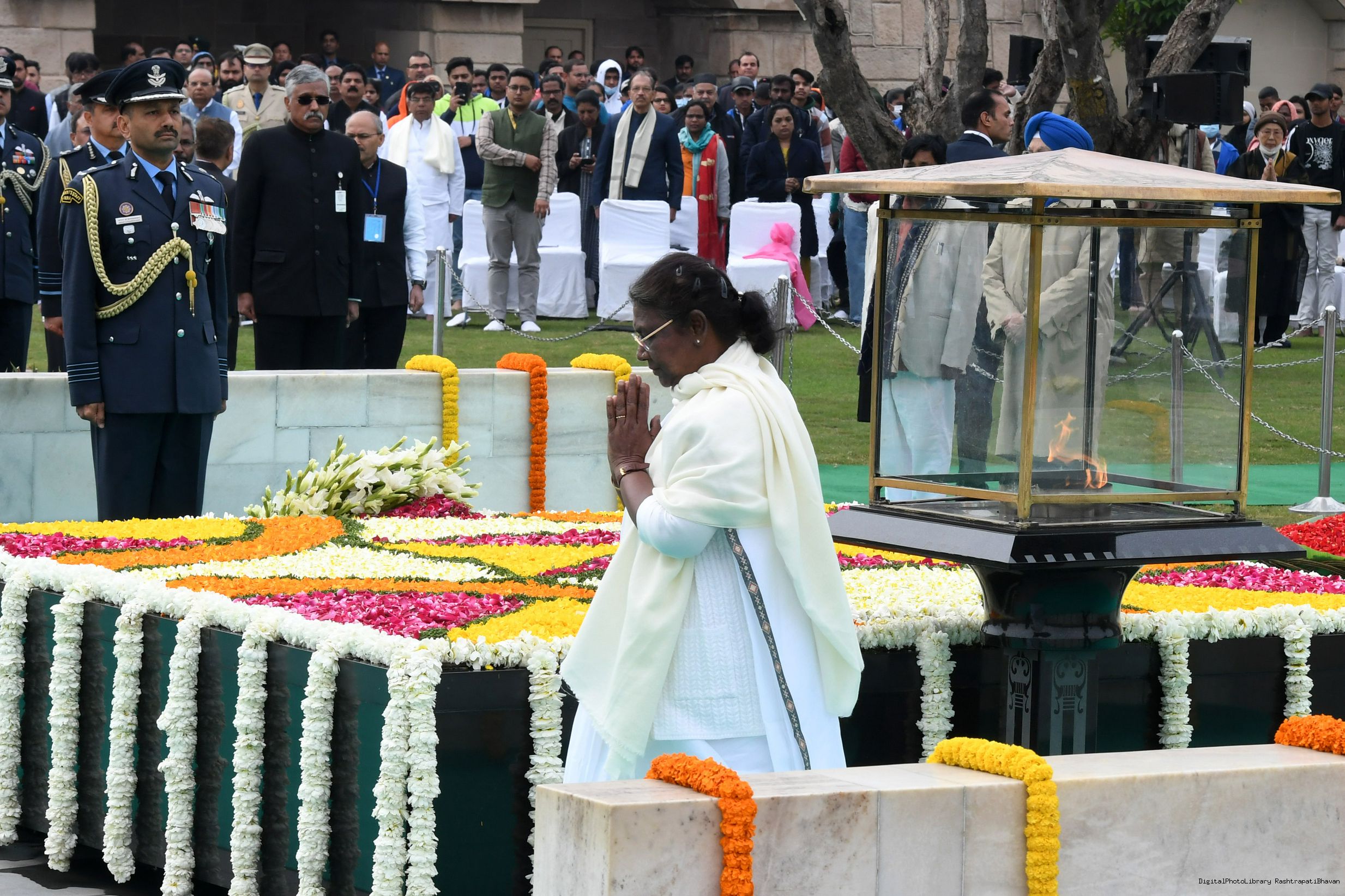 | Caption: | The President of India, Smt. Droupadi Murmu paid homage to Mahatma Gandhi on Martyrs Day and attended Sarva Dharma Prarthana at Rajghat, in New Delhi on January 30, 2023. |