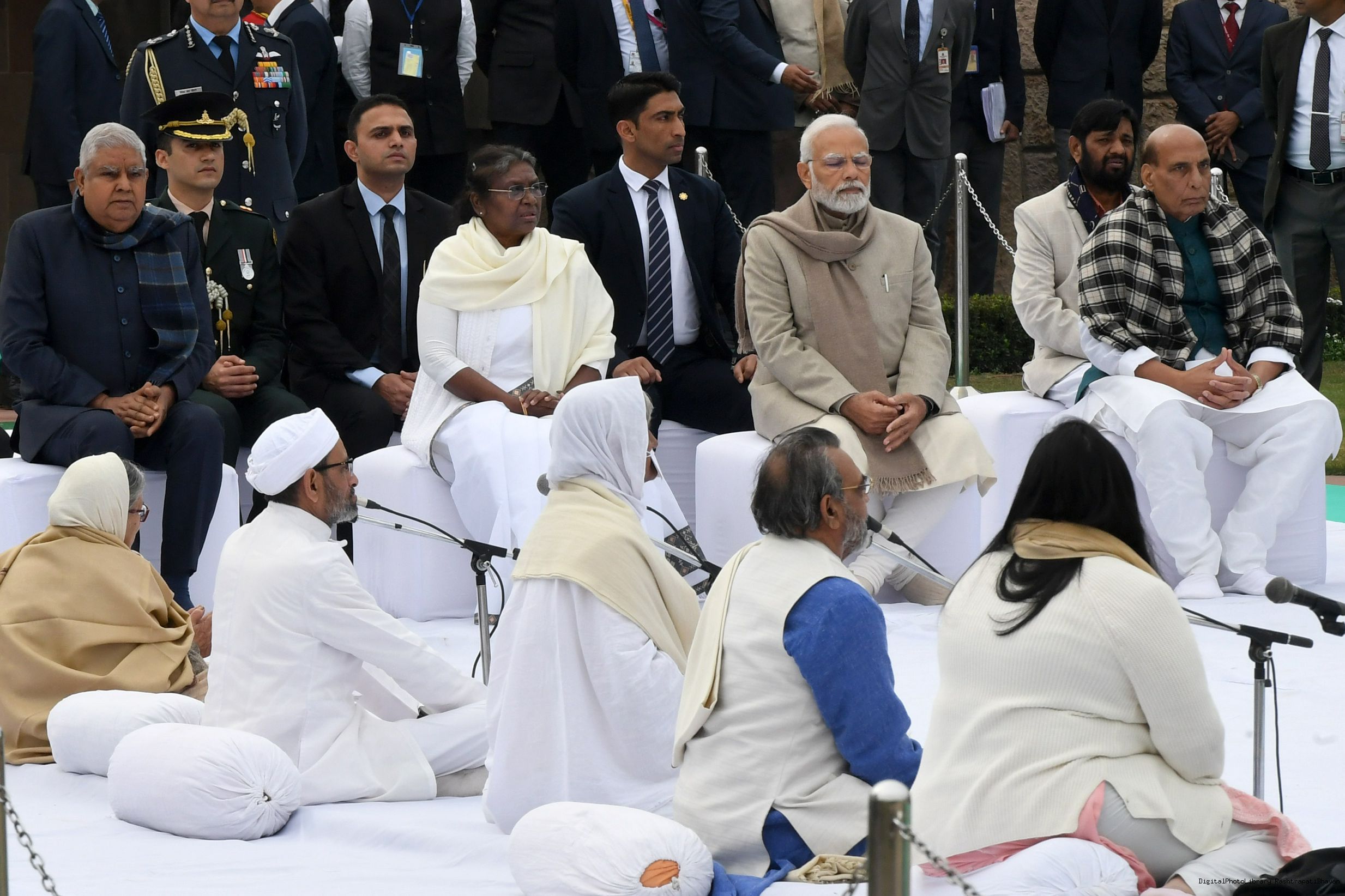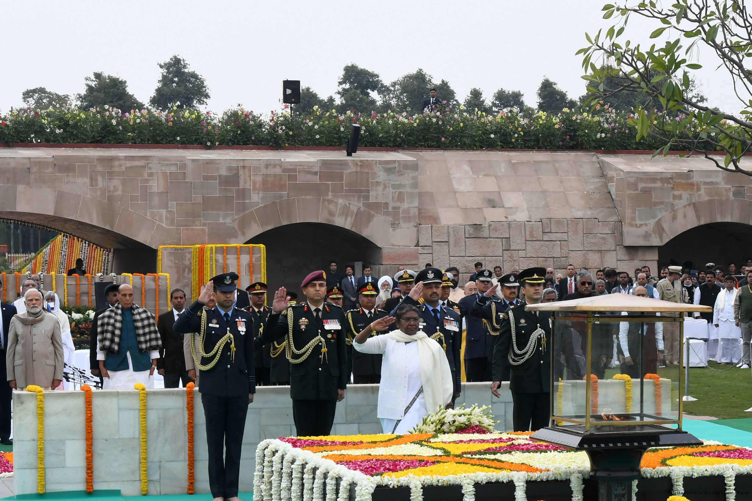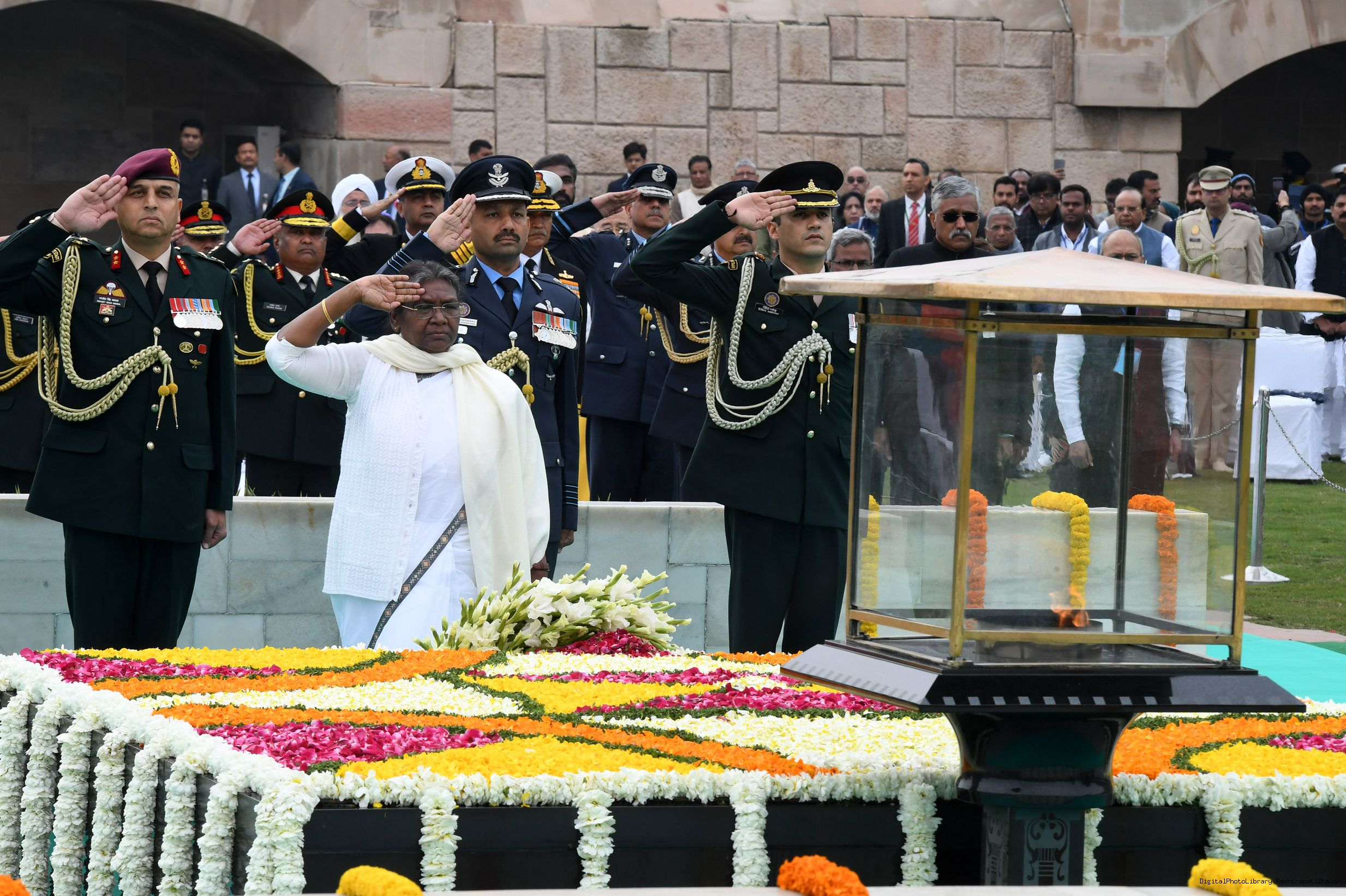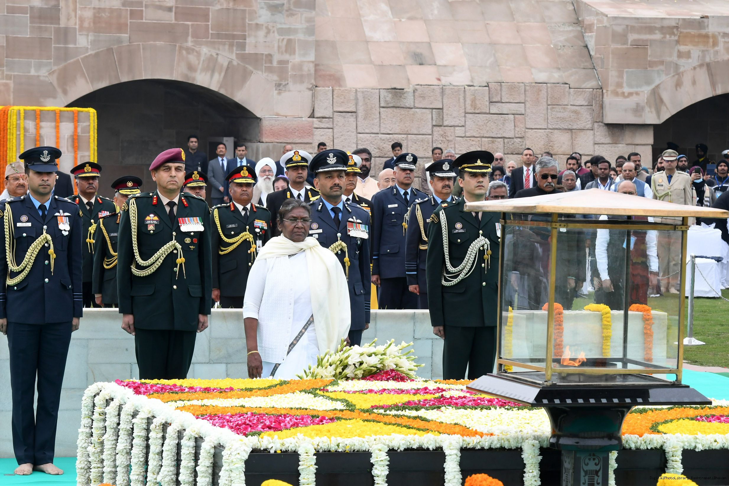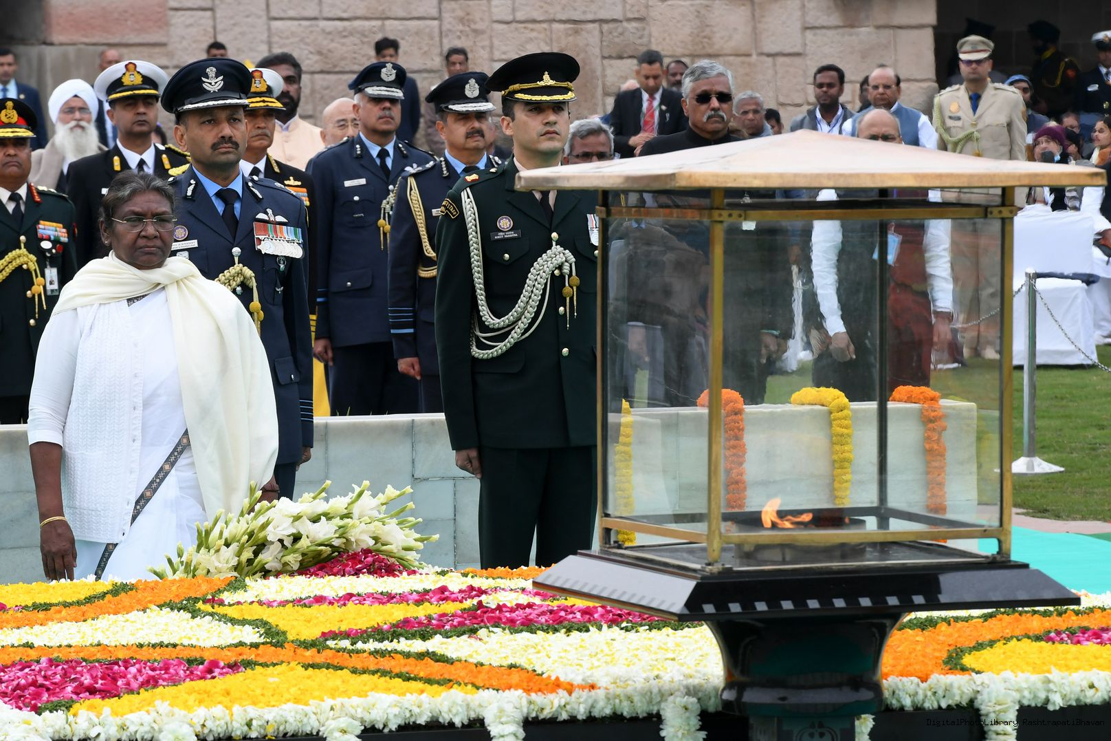 | Caption: | The President of India, Smt. Droupadi Murmu paid homage to Mahatma Gandhi on Martyrs Day and attended Sarva Dharma Prarthana at Rajghat, in New Delhi on January 30, 2023. |