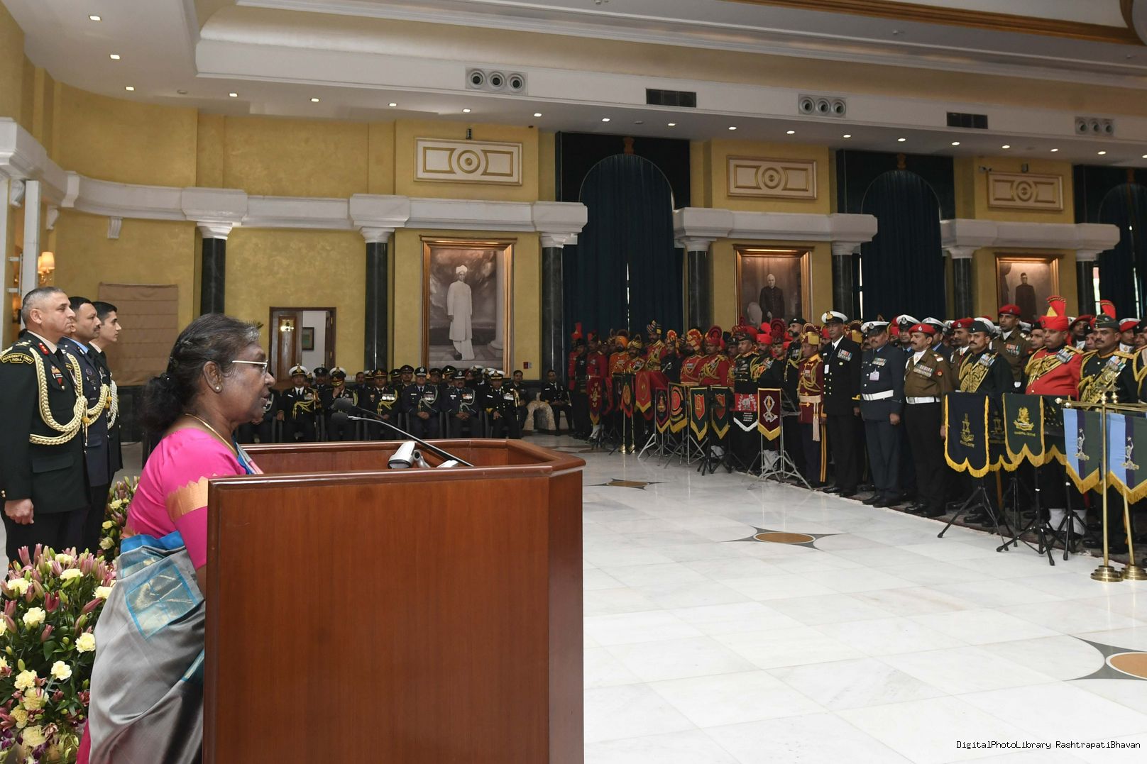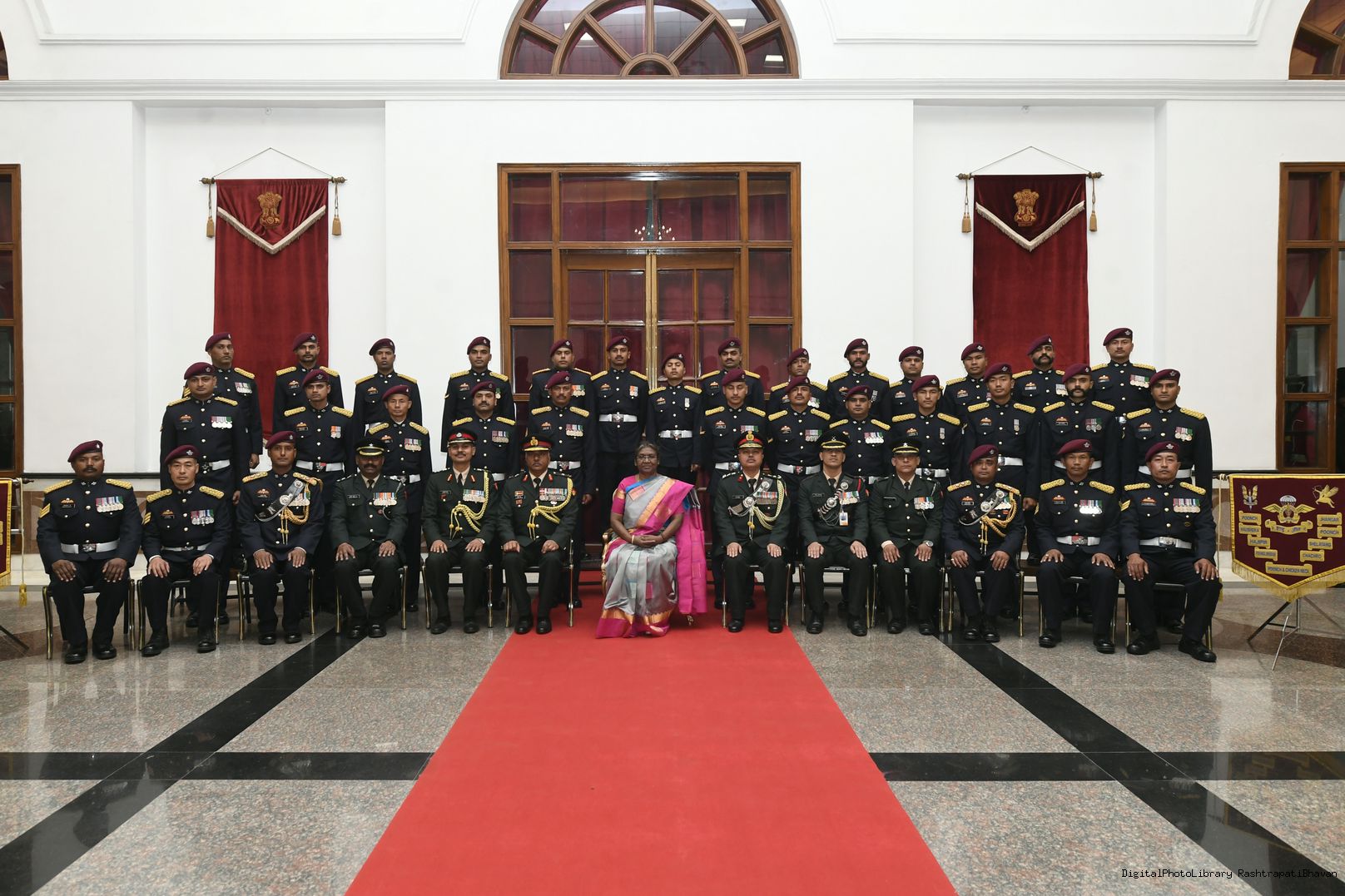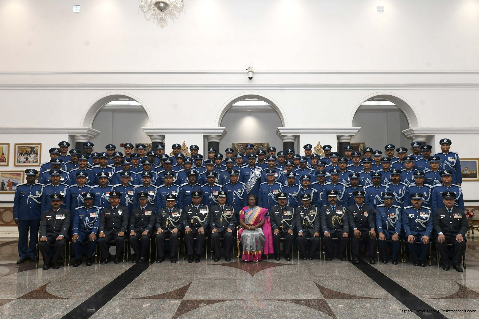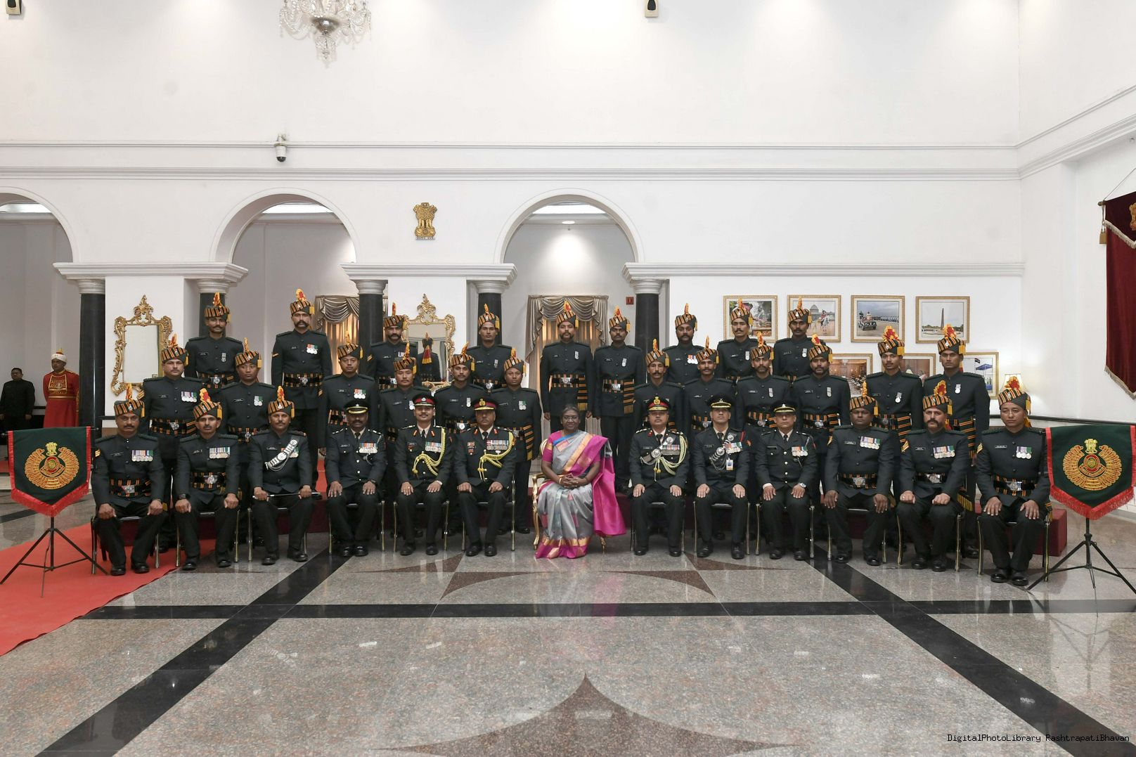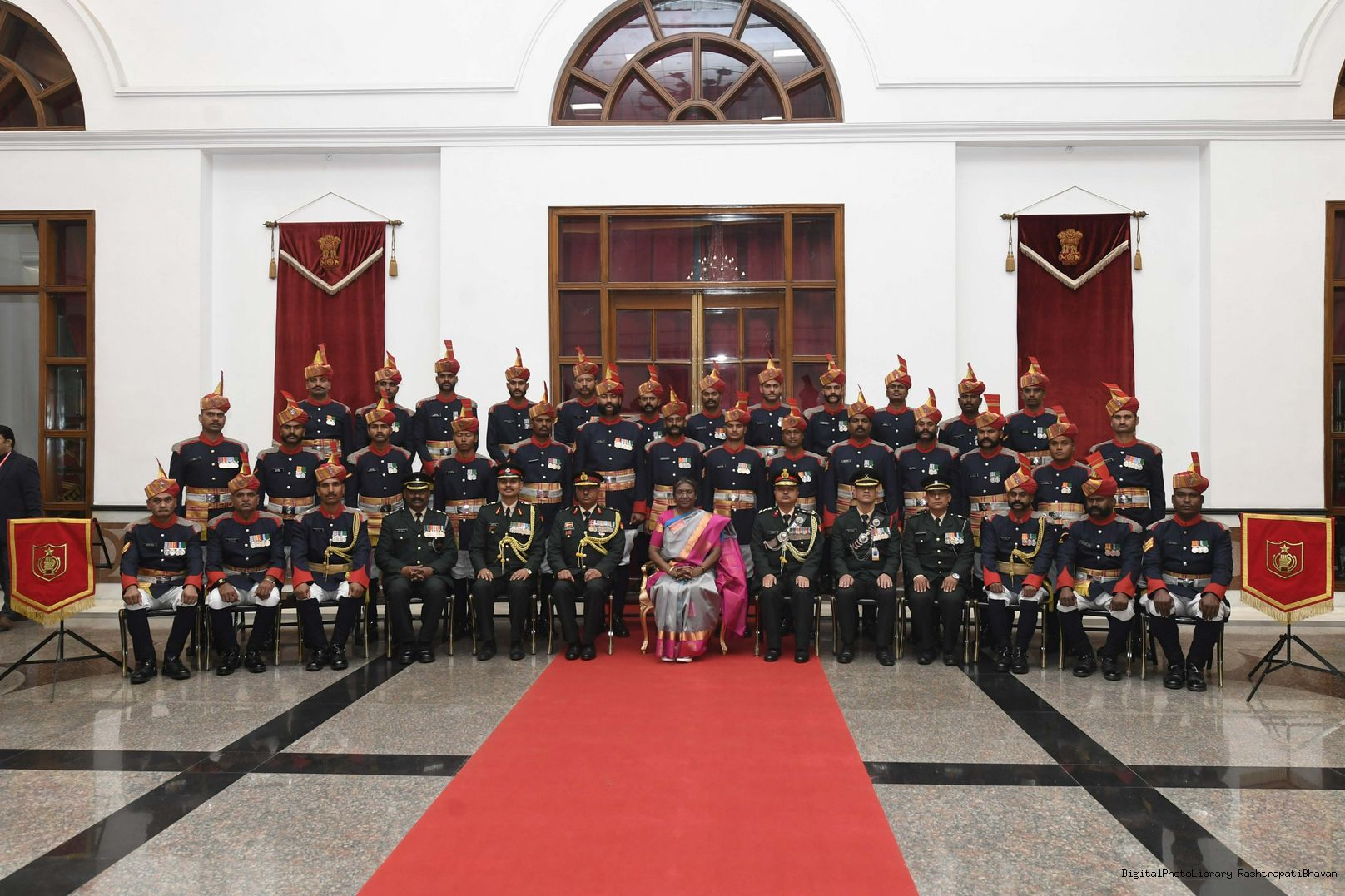 | Caption: | The President of India, Smt. Droupadi Murmu met personnel of the Tri-Service Band contingents who participated in the Republic Day Parade and Beating the Retreat ceremony, at Rashtrapati Bhavan on January 30, 2023. |