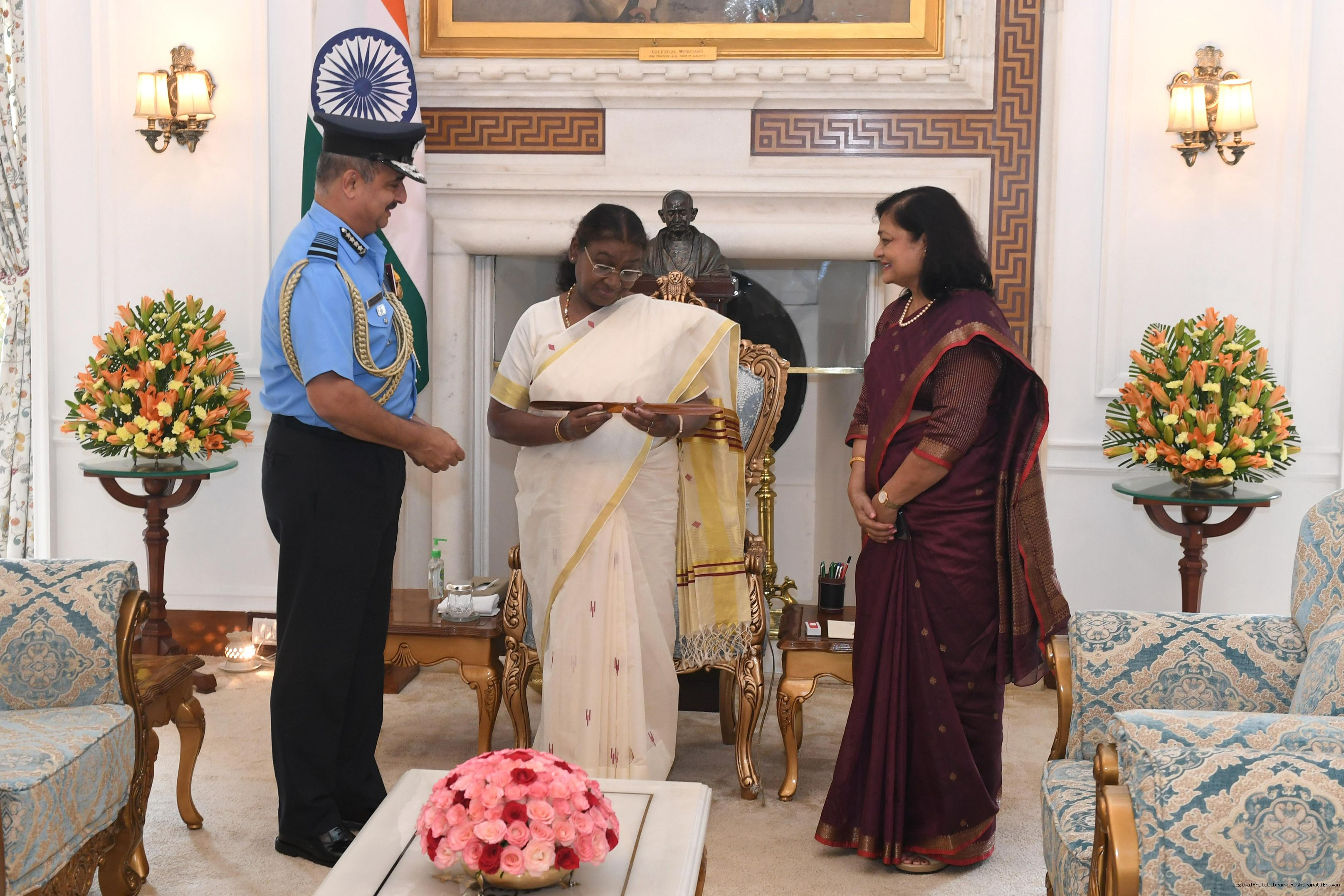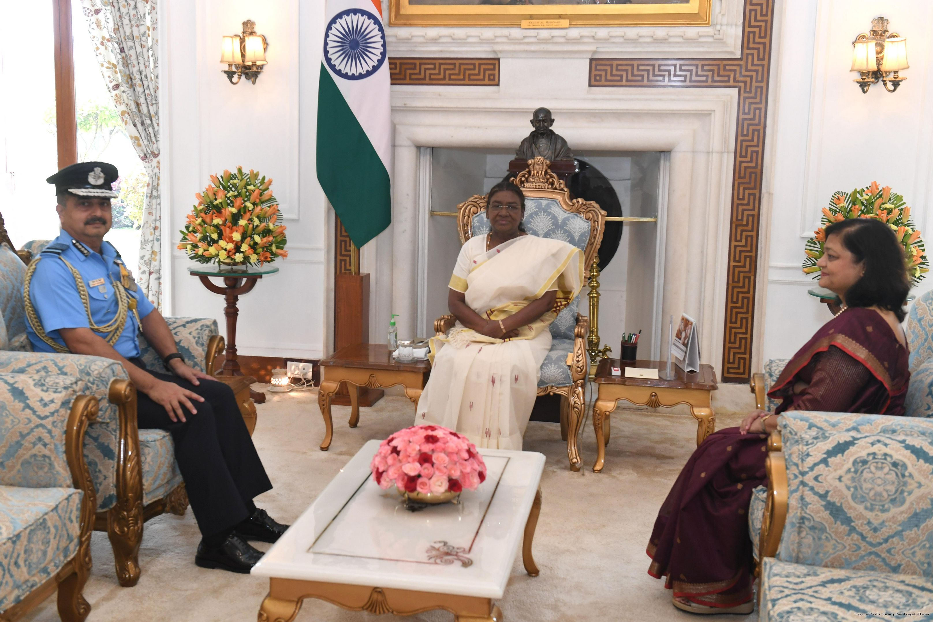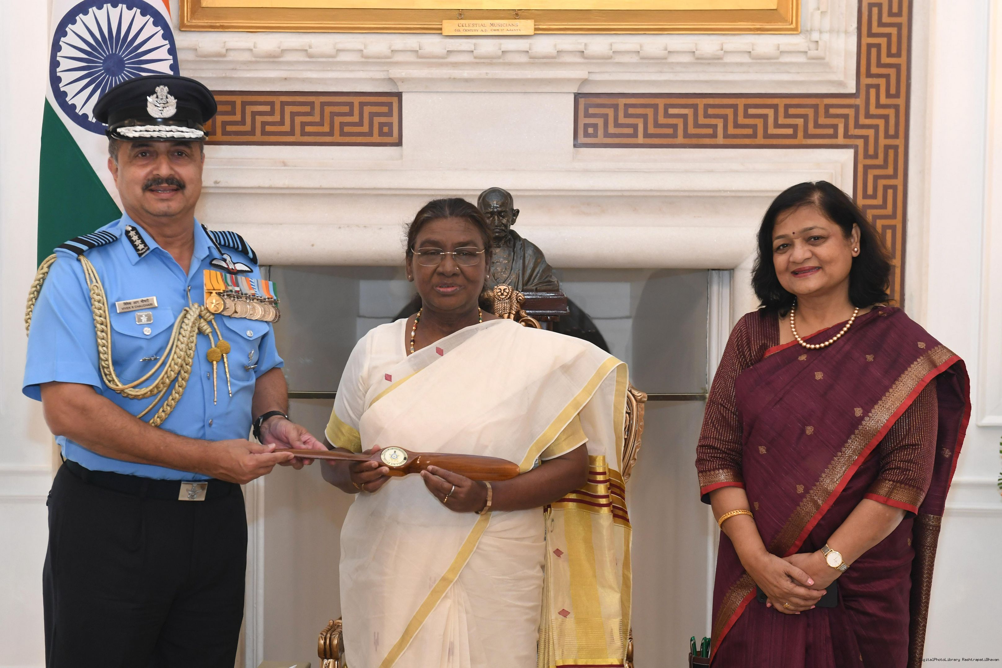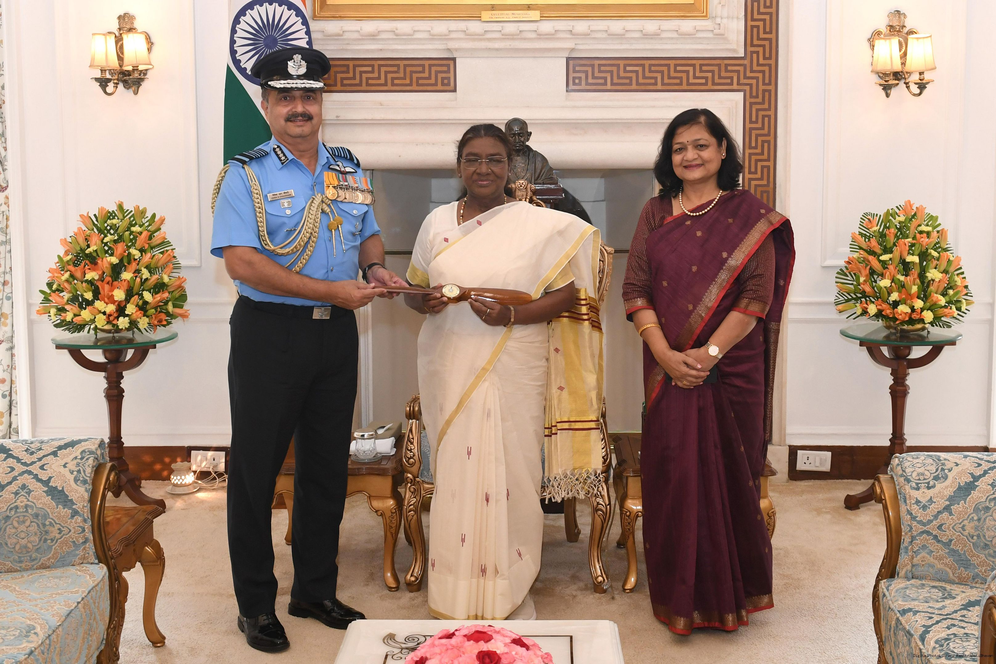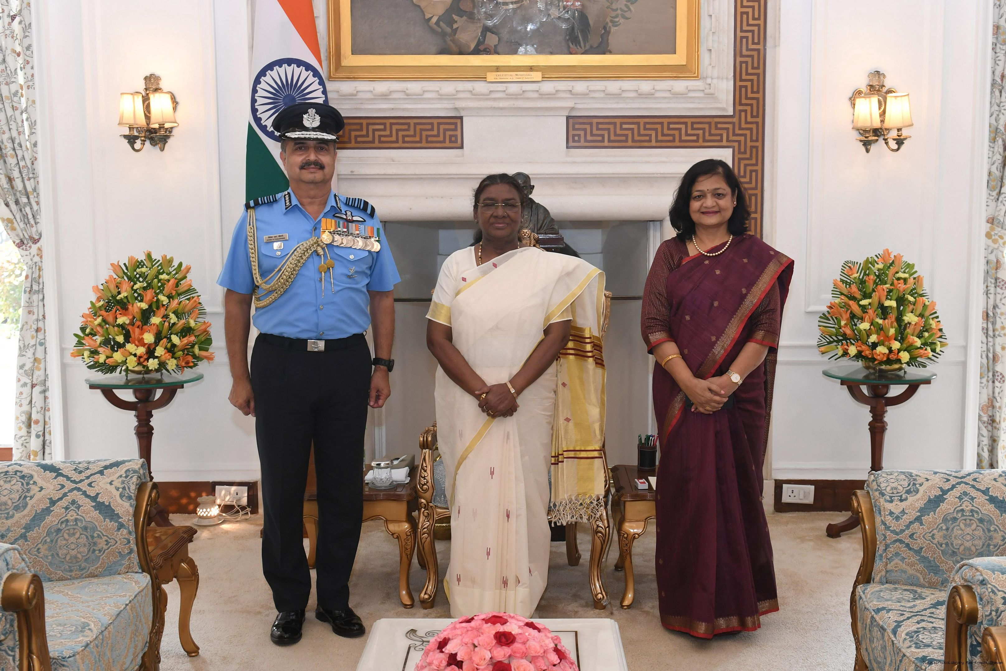 | Caption: | Air Chief Marshal VR Chaudhari, PVSM, AVSM, VM, ADC, Chief of the Air Staff along with others meeting with the President of India Smt Droupadi Murmu at Rashtrapati Bhavan on September 25, 2024. |