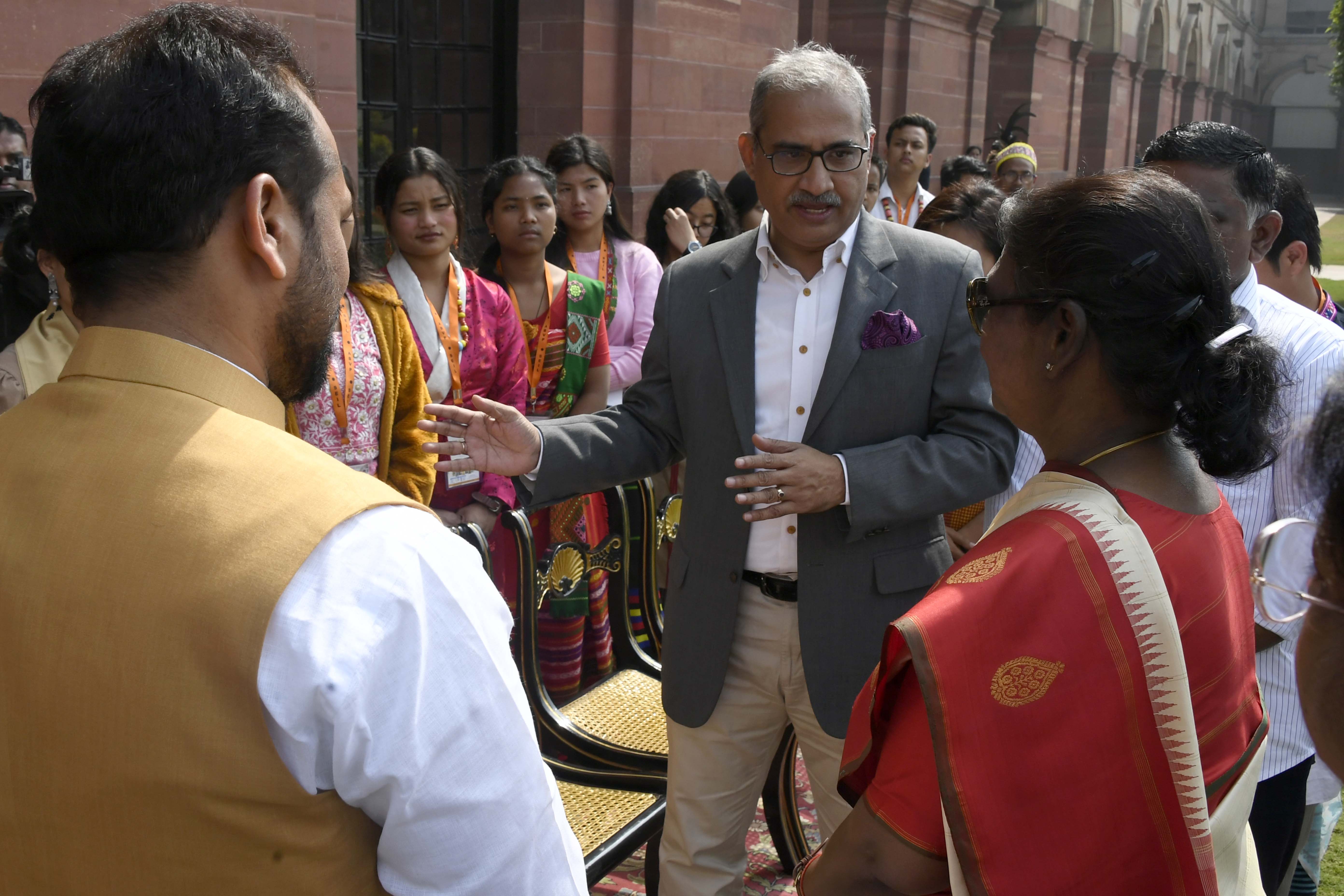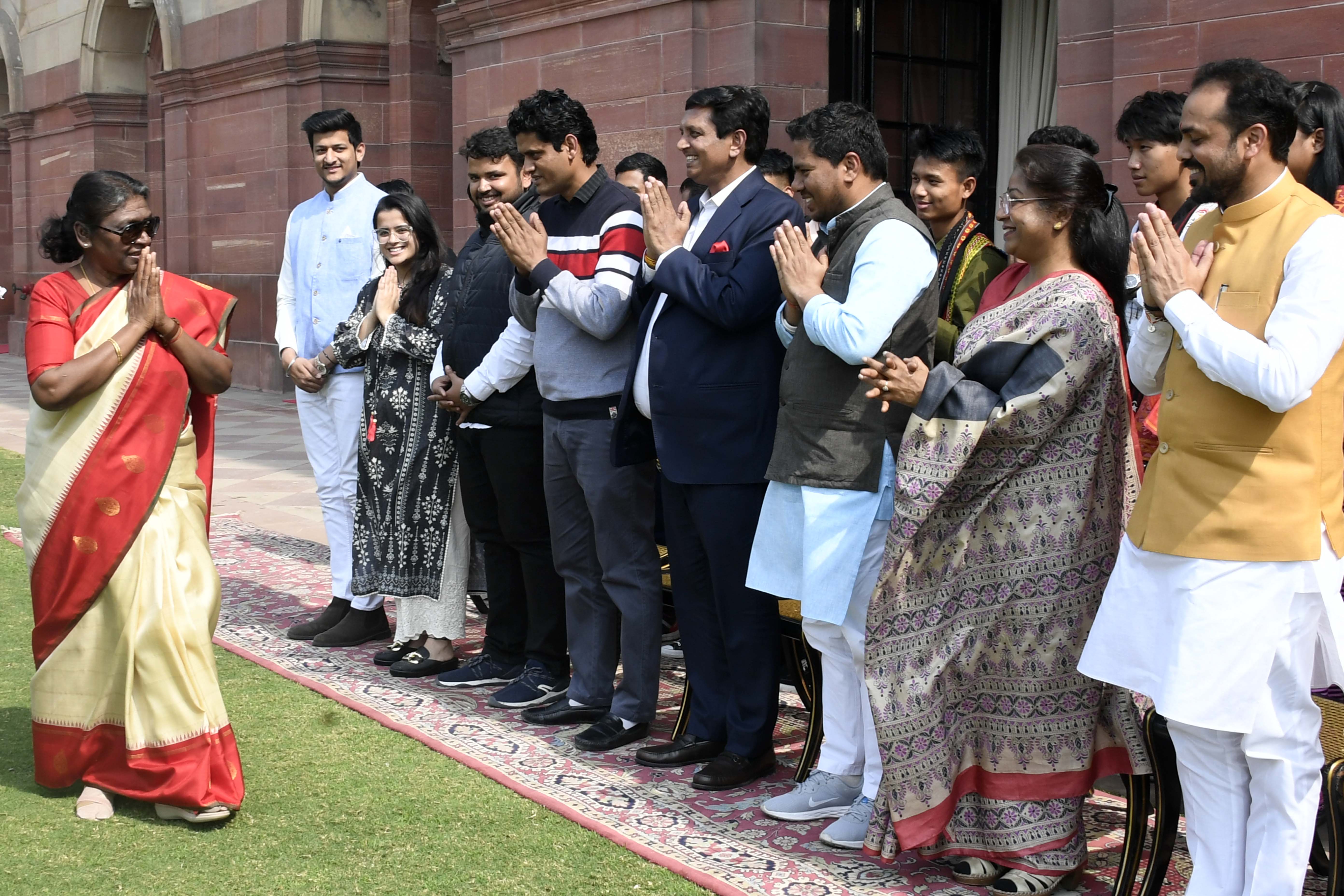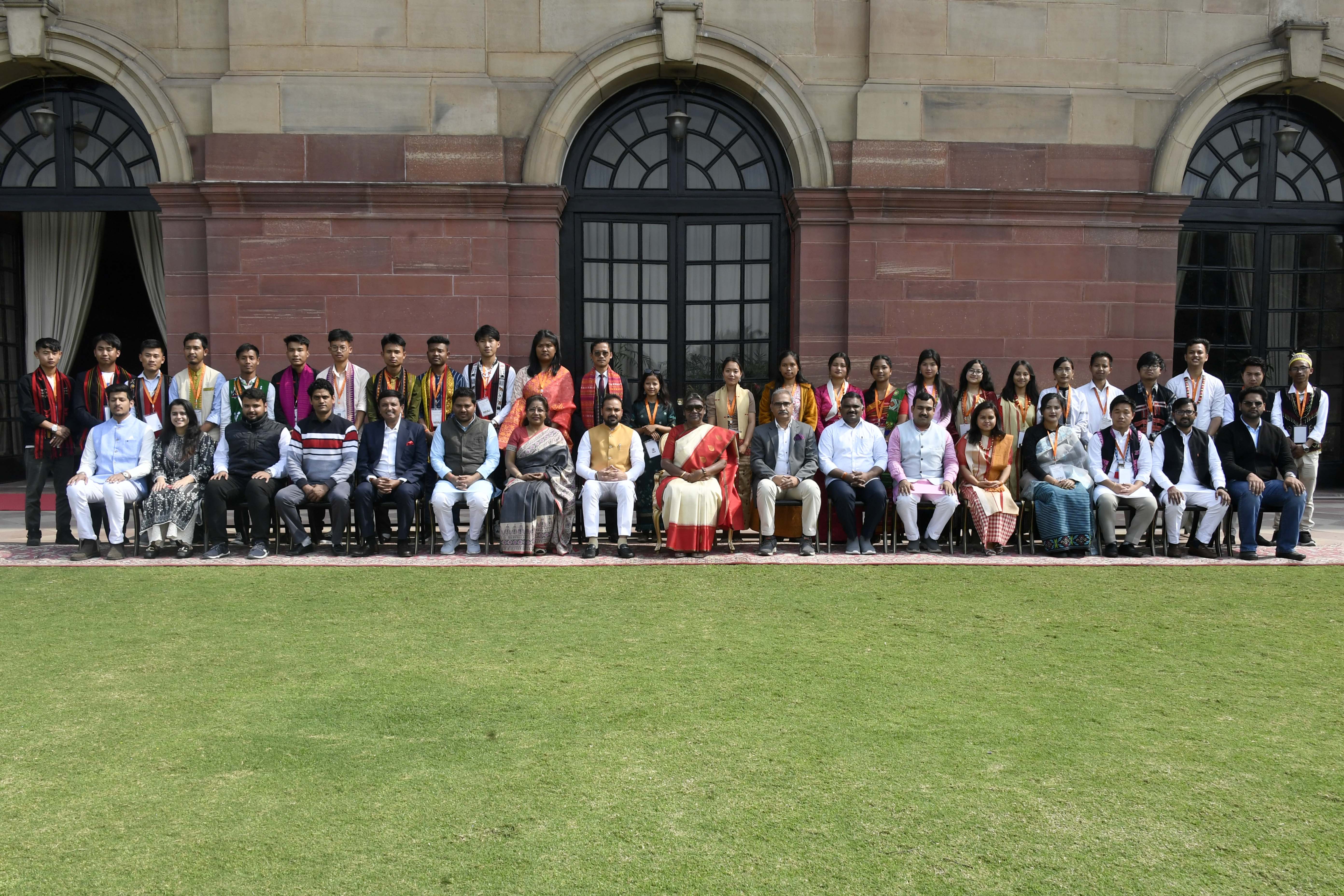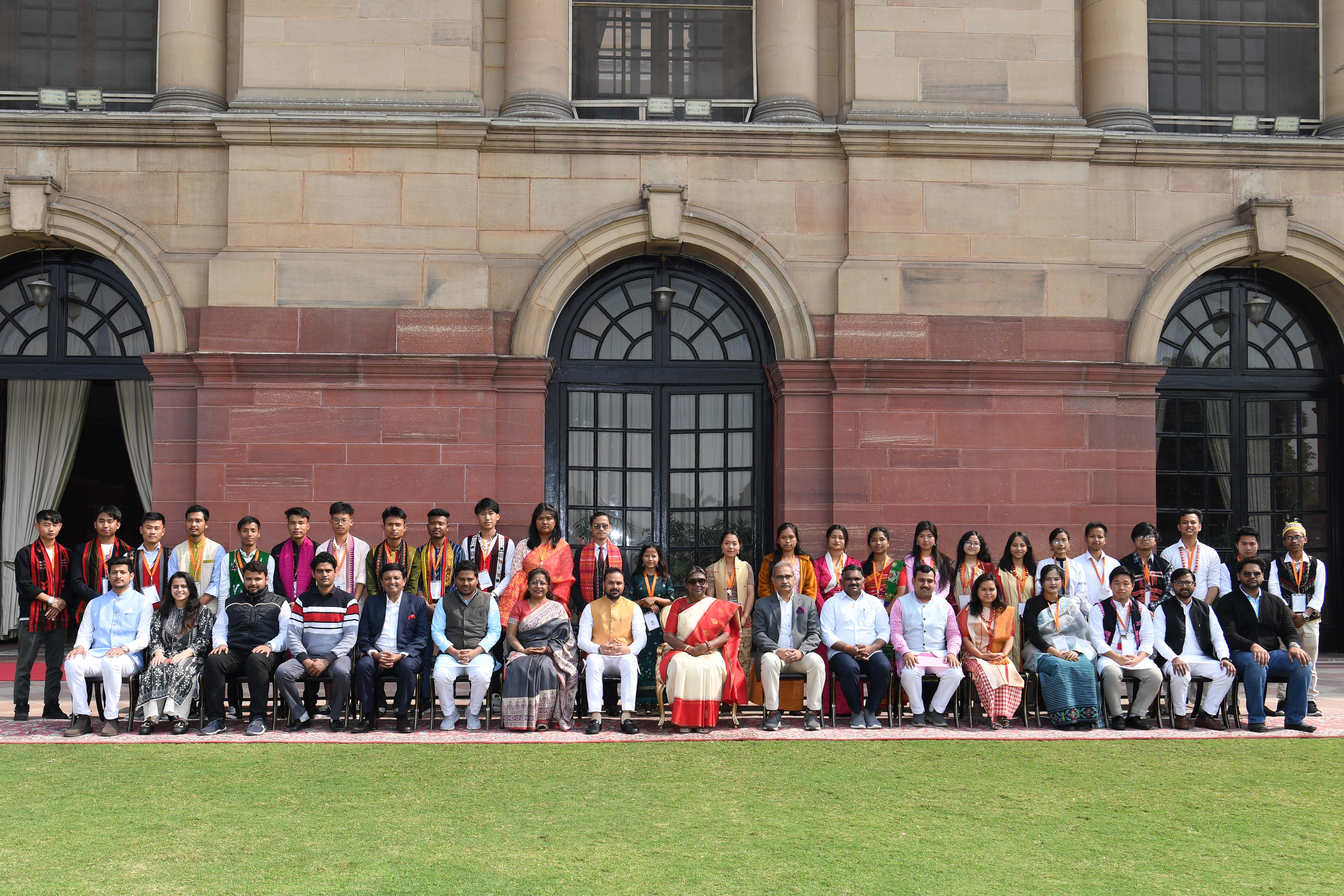 | Caption: | The President of India Smt. Droupadi Murmu posing a group photograph with the students from Northeast States attending National Integration Tour organized by the Students Experience In Inter-State Living (SEIL) Trust and Akhil Bharatiya Vidyarthi Parishad at Rashtrapati Bhavan on February 17, 2023. |