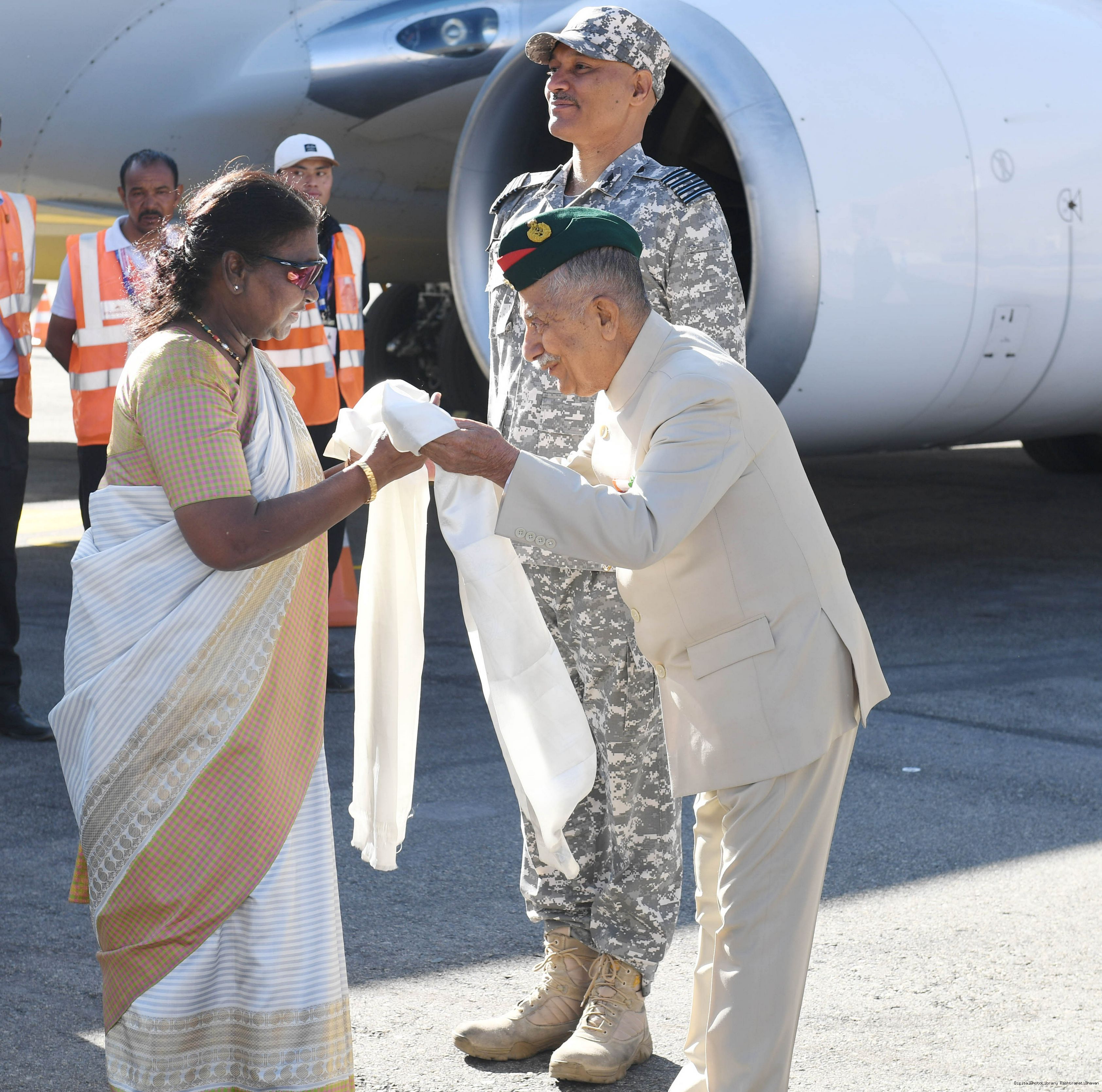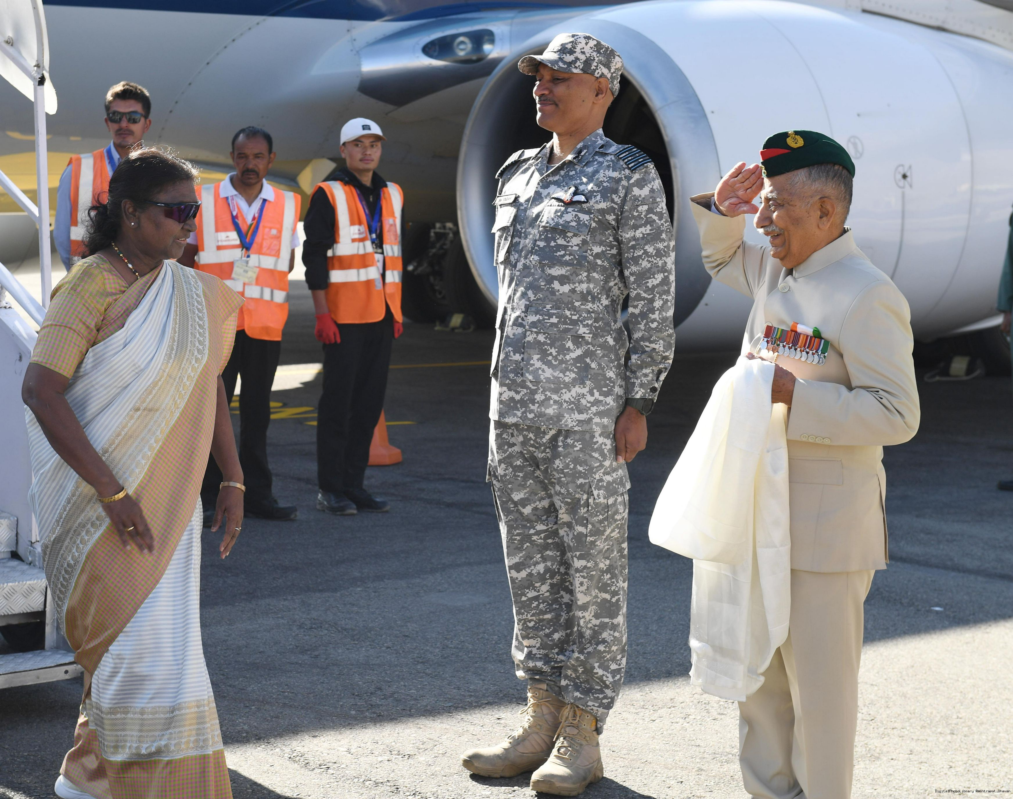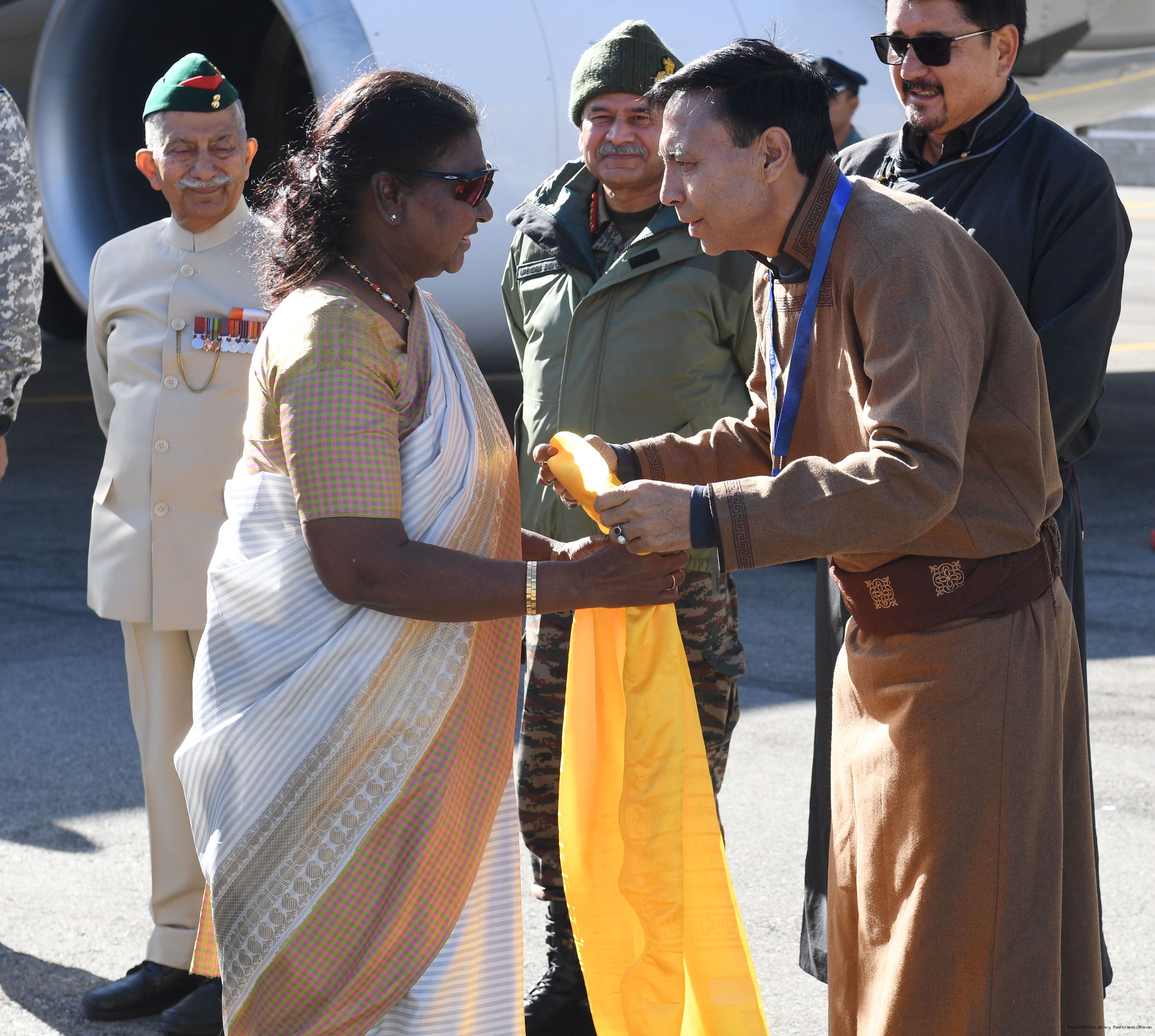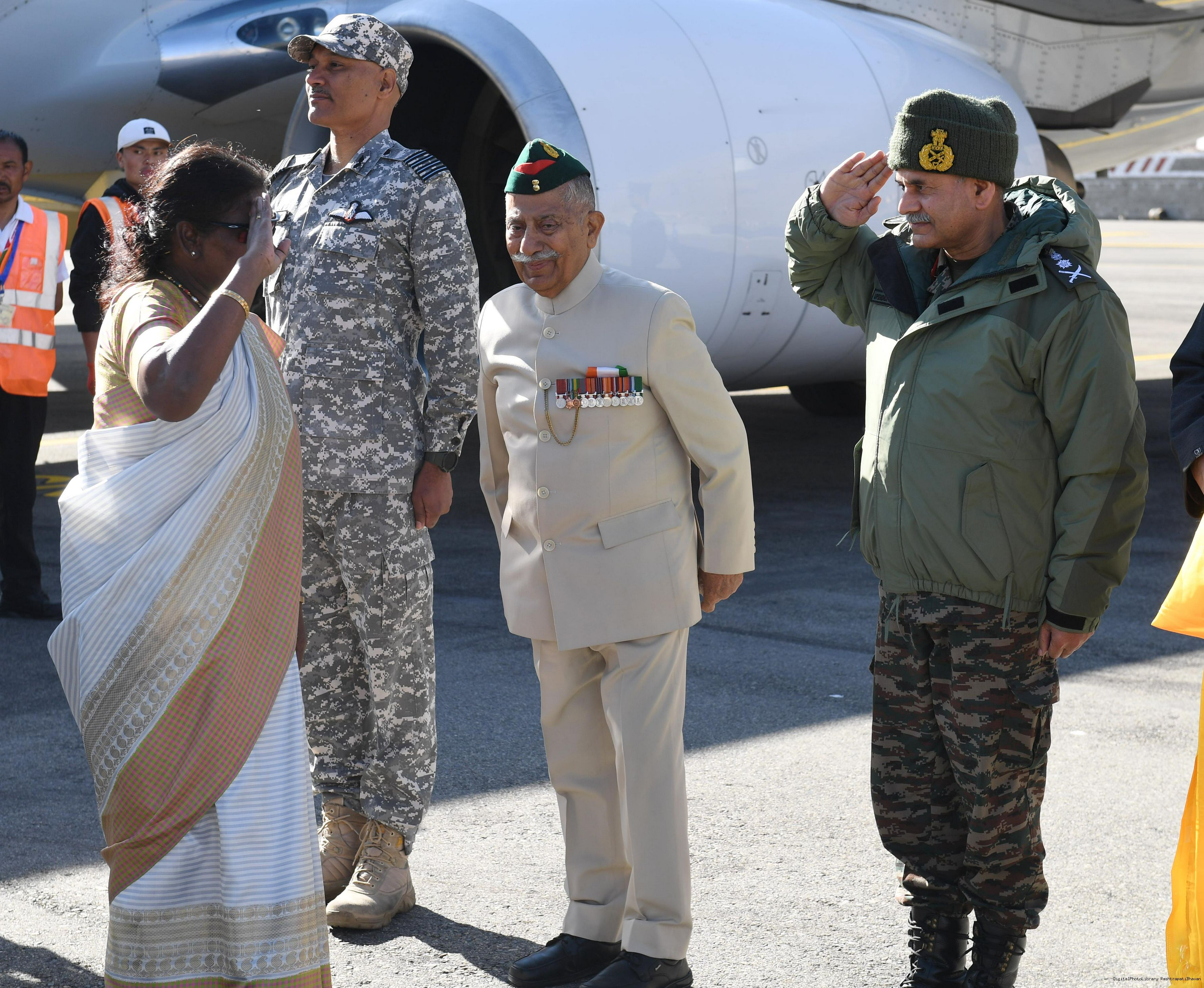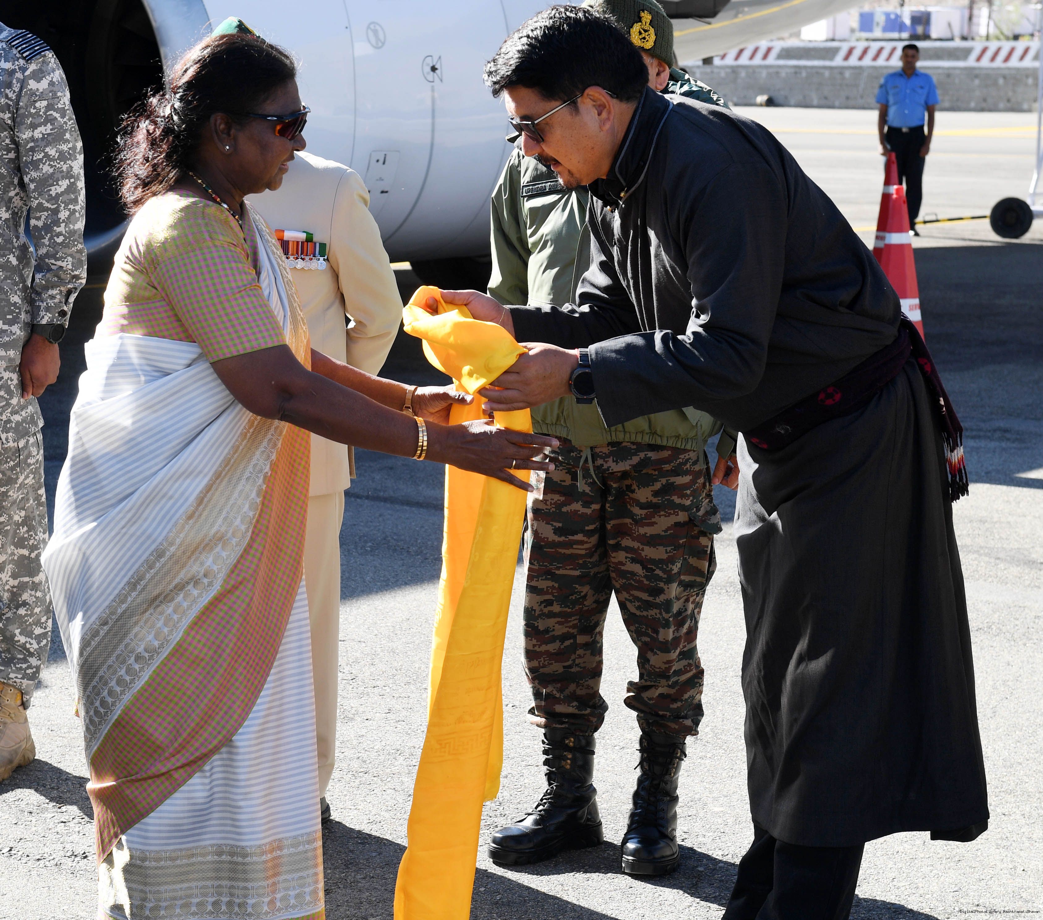 | Caption: | The Lt. Governor of Ladakh Brig. (Dr.) B D Mishra received President Droupadi Murmu on her arrival at Thoise Airfield, Ladakh on September 26, 2024. |