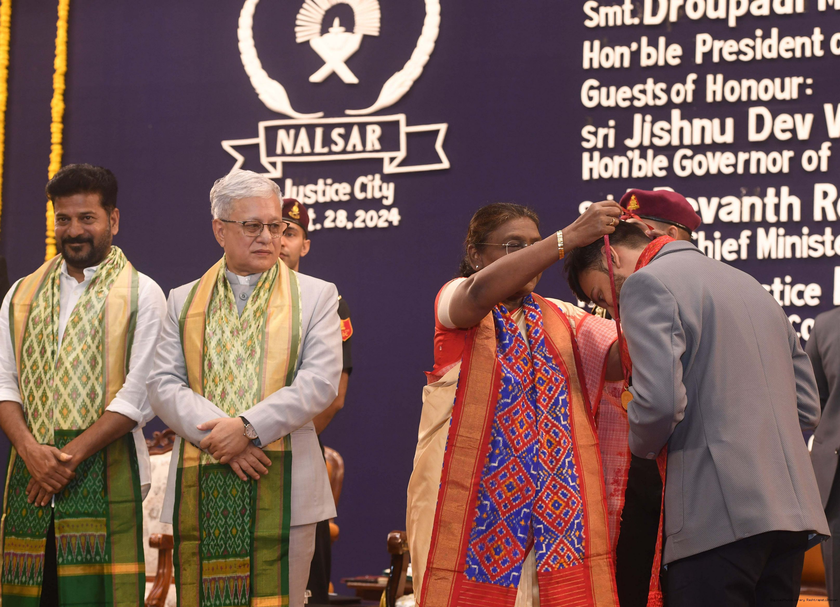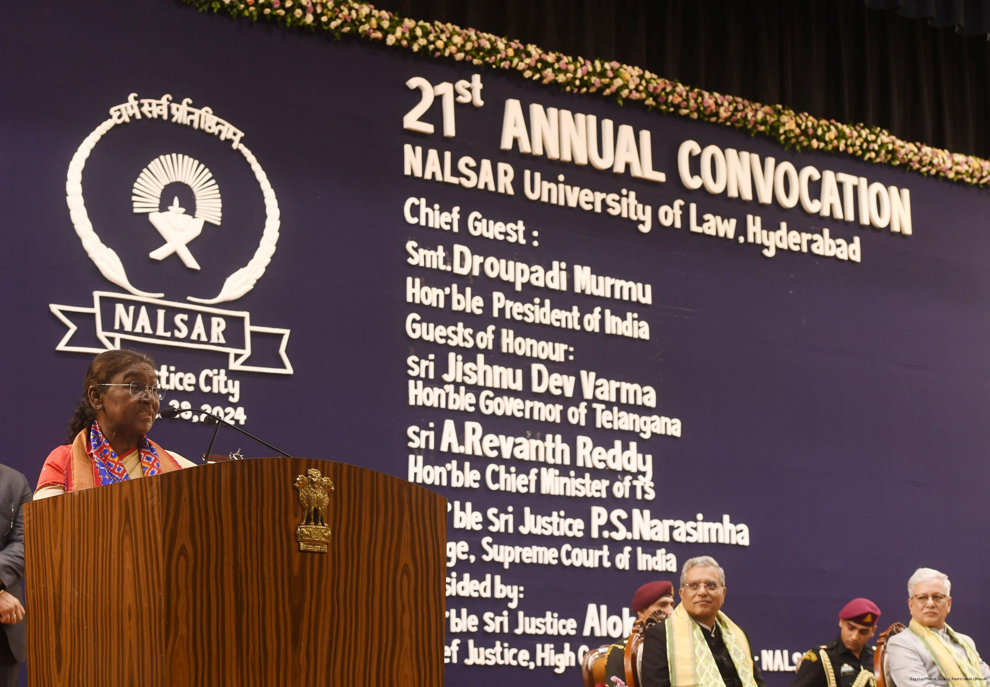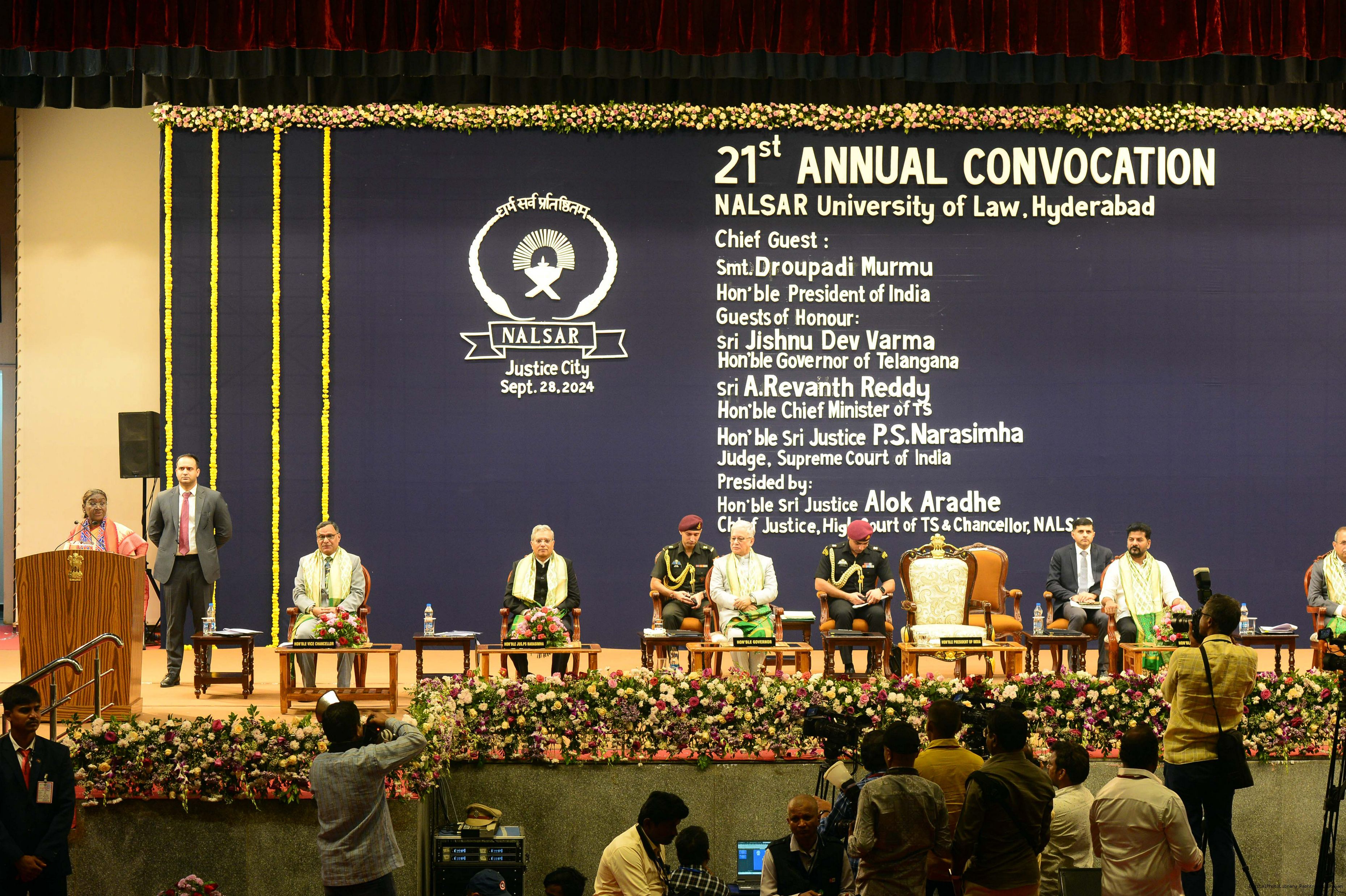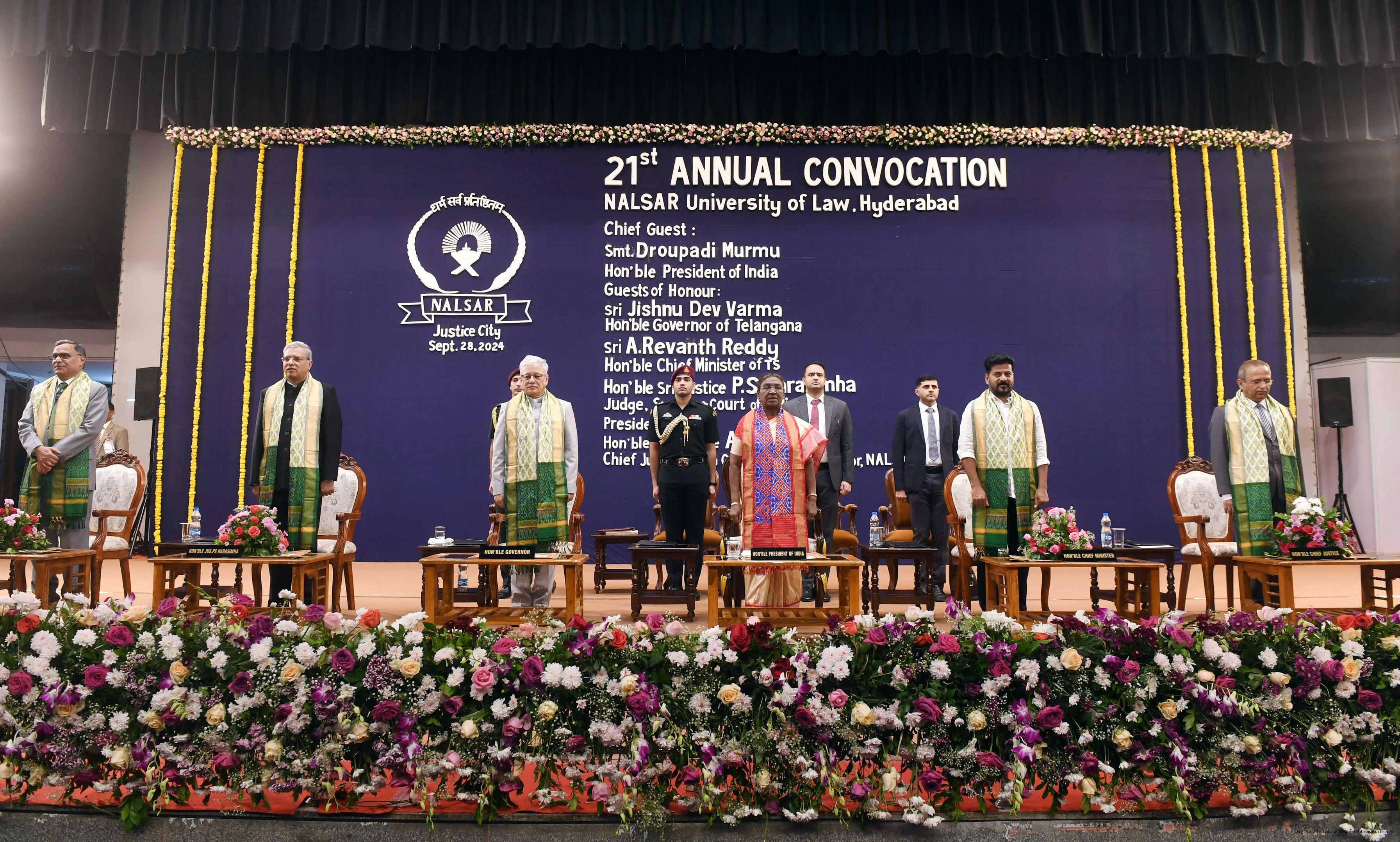 | Caption: | The President of India, Smt. Droupadi Murmu graced the 21st convocation of NALSAR University of Law at Hyderabad, Telangana on September 28, 2024. |