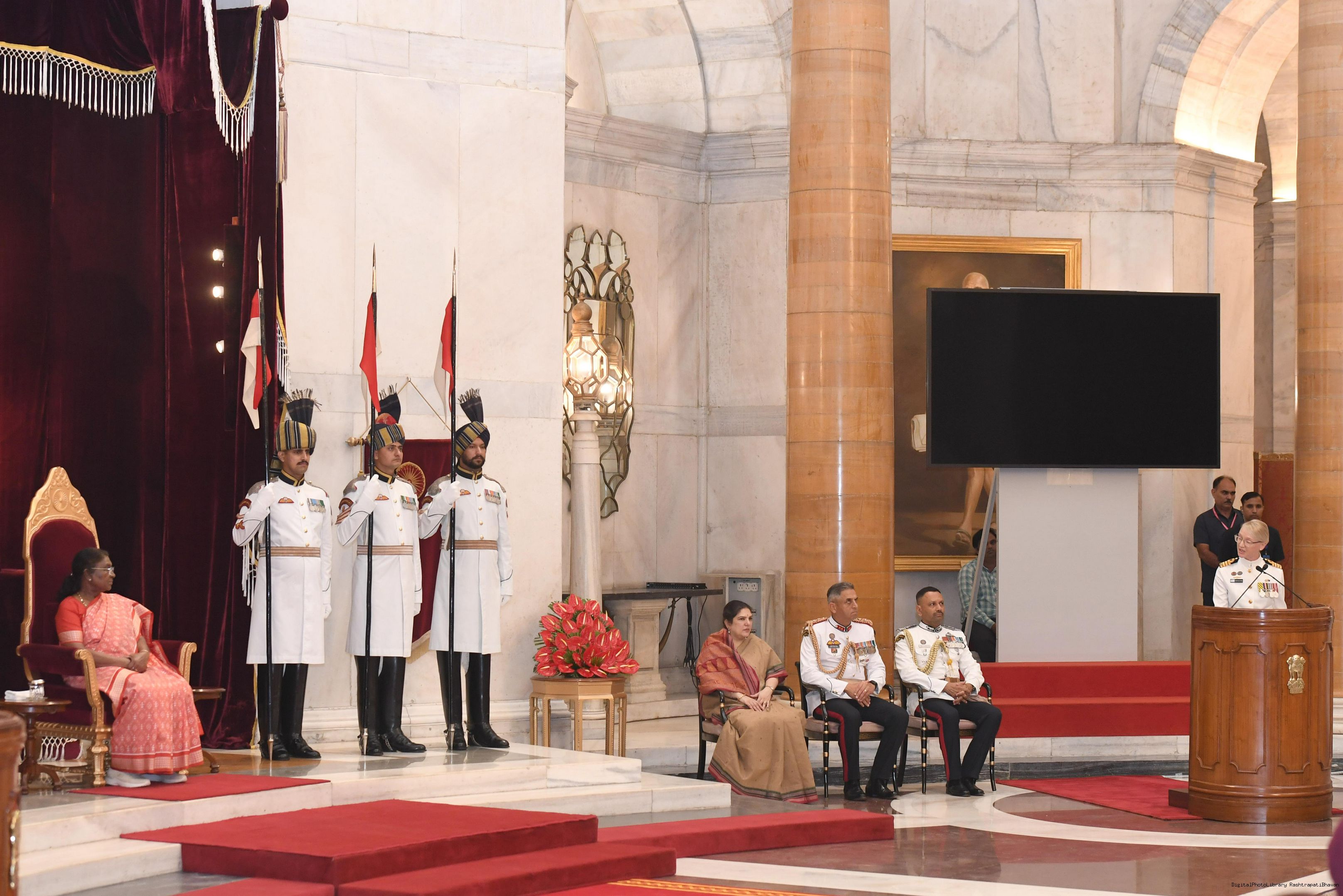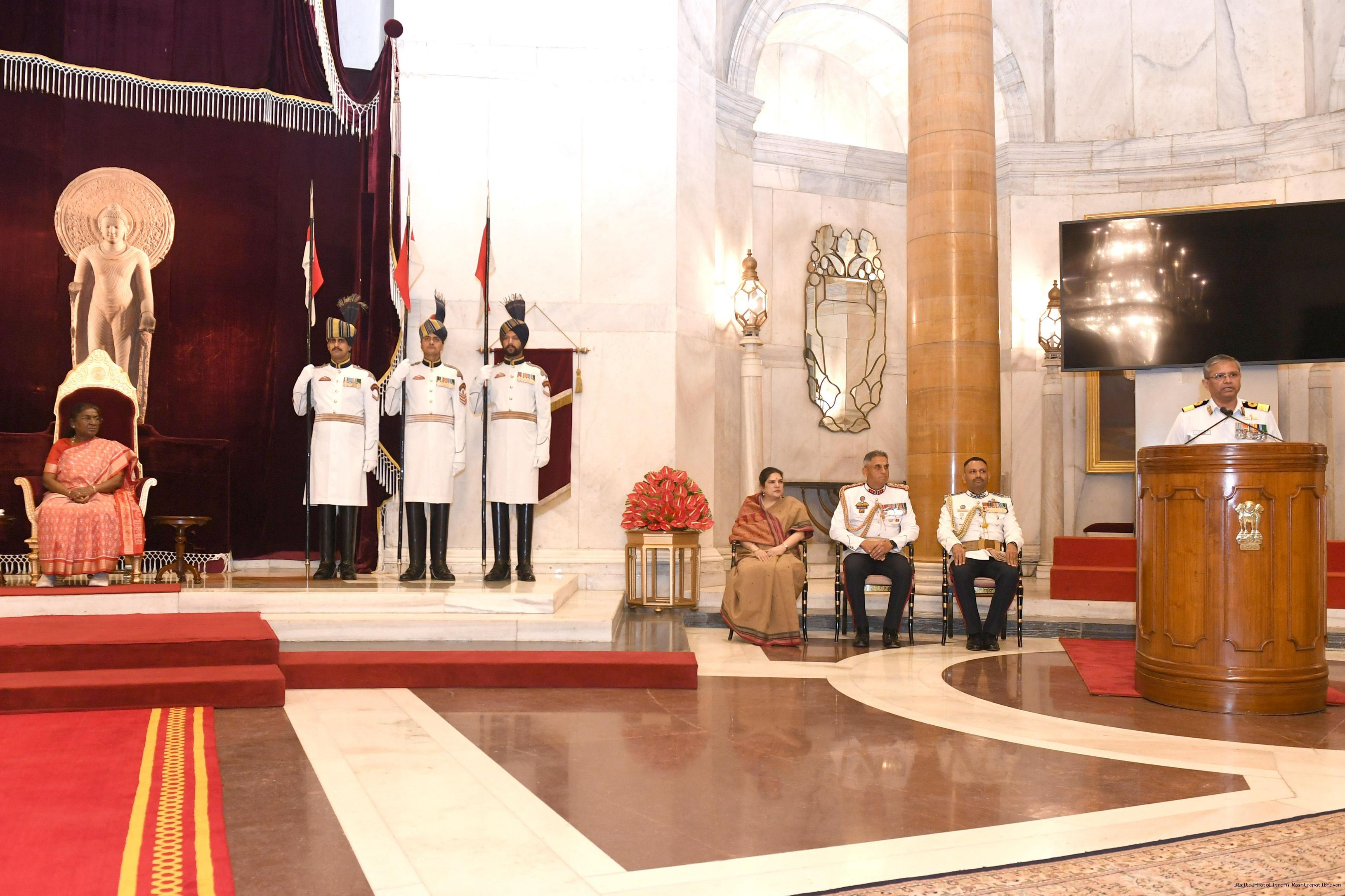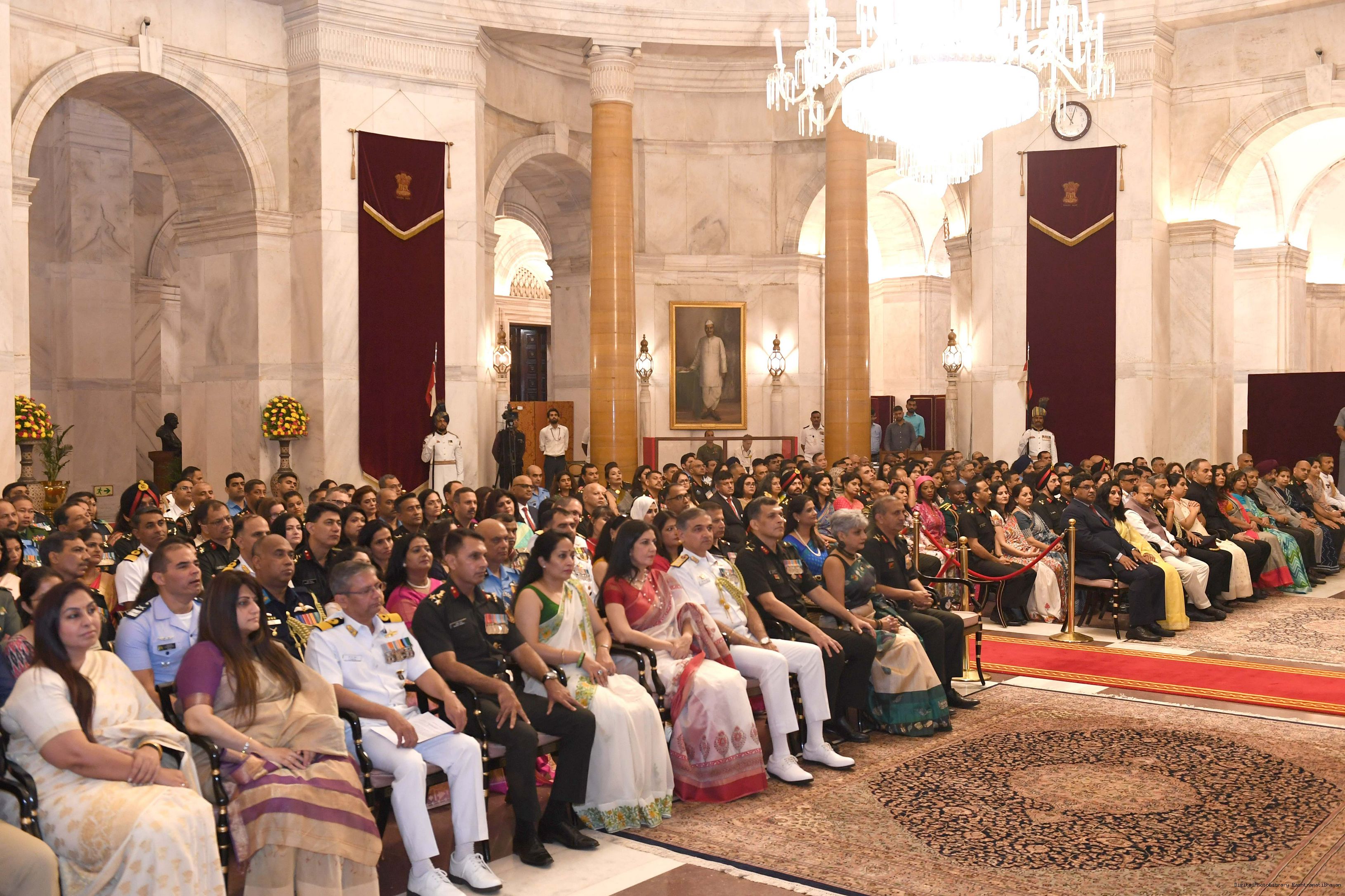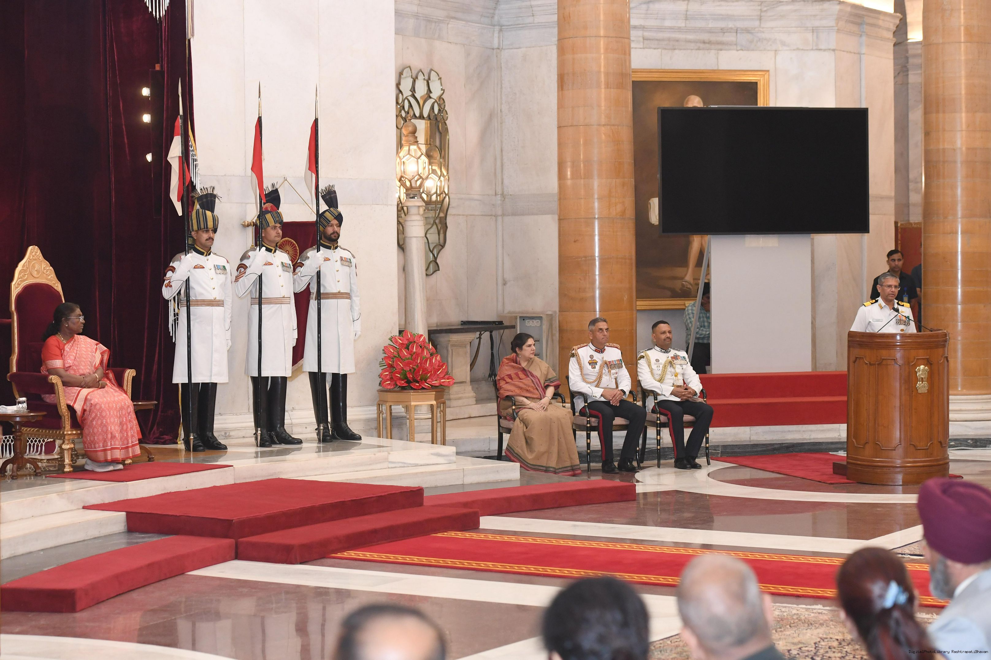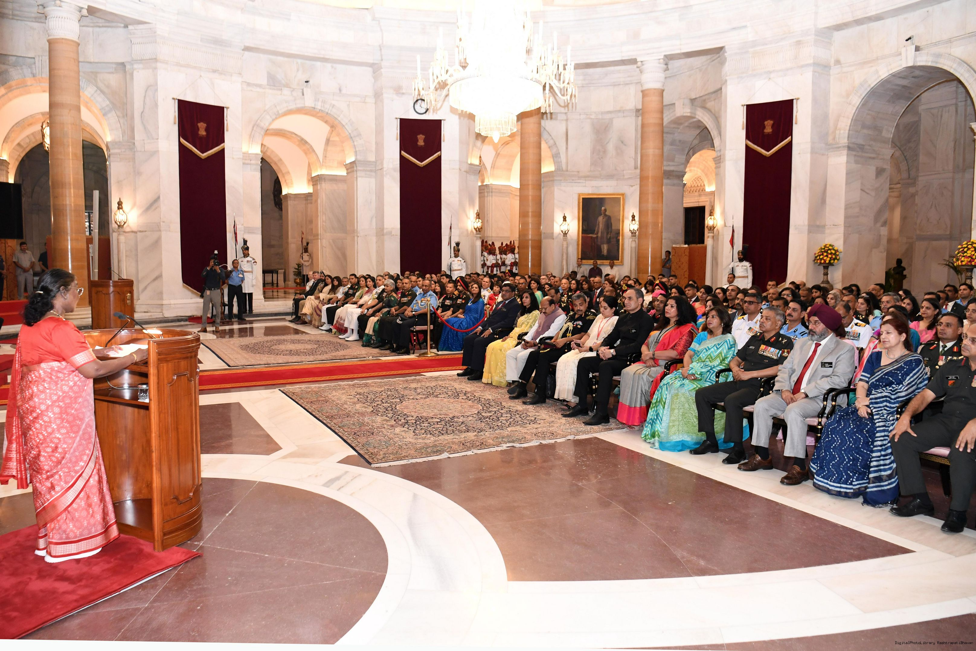 | Caption: | The President of India Smt. Droupadi Murmu met the faculty and course members of the 64th NDC Course at Rashtrapati Bhavan on October 01, 2024. |
