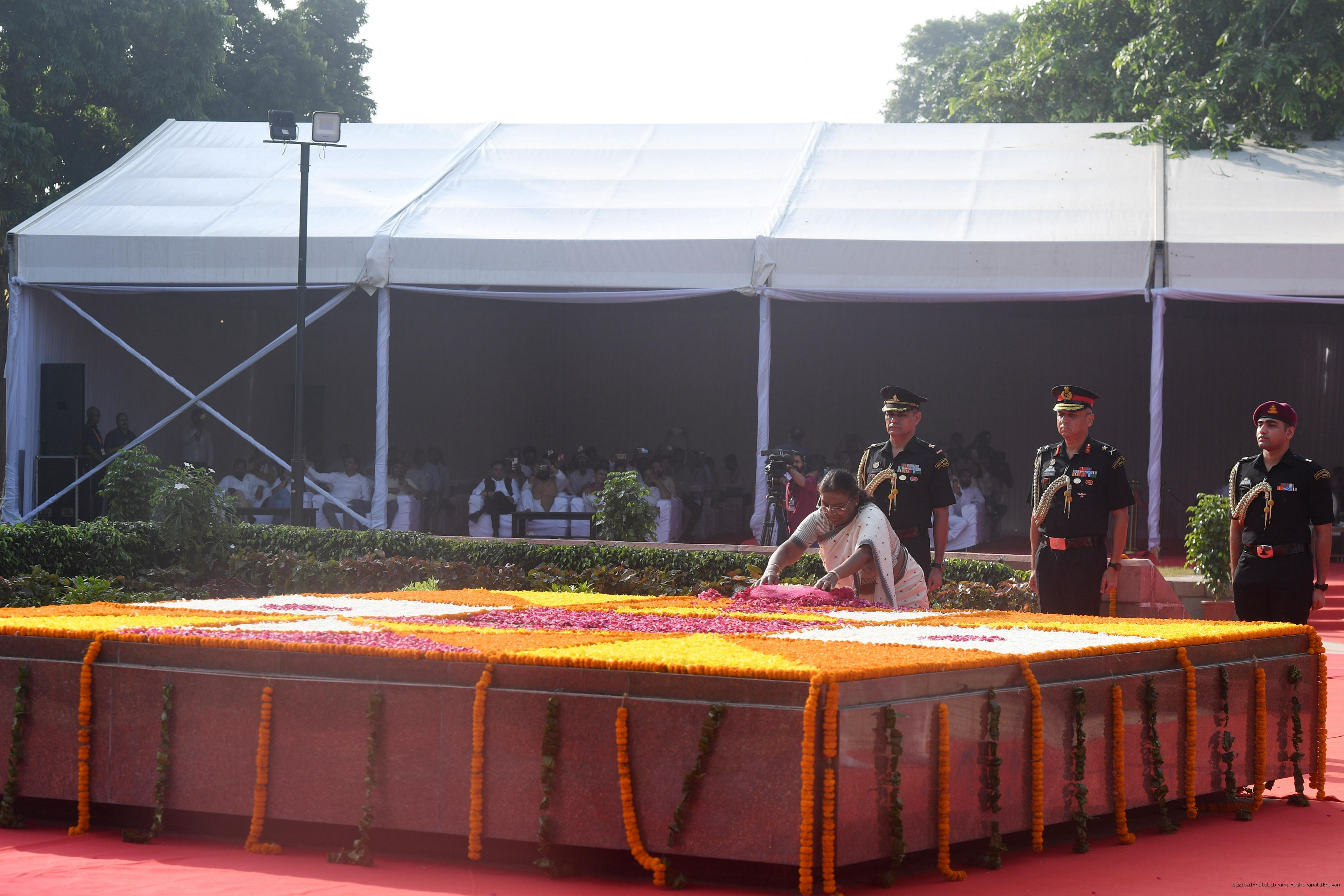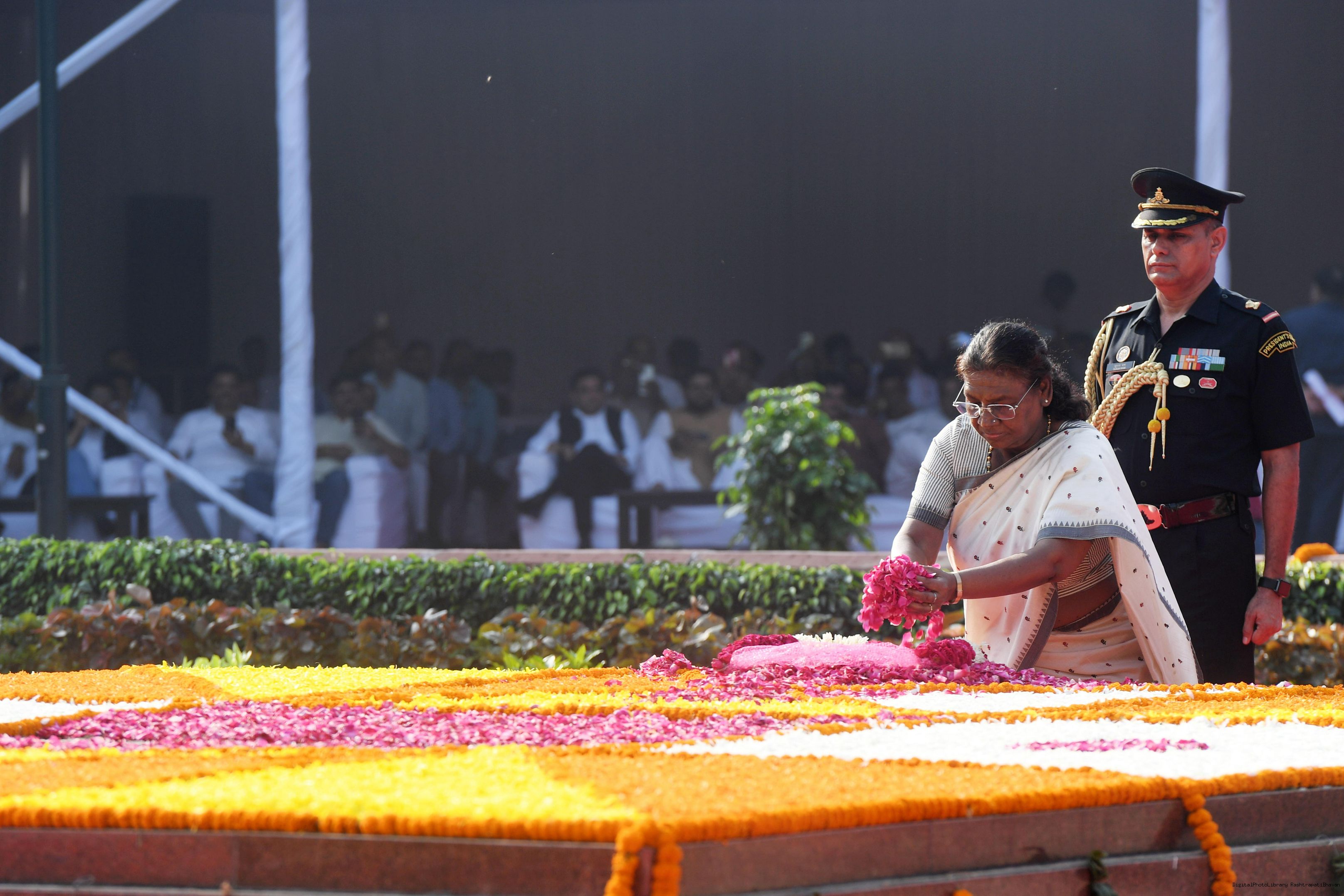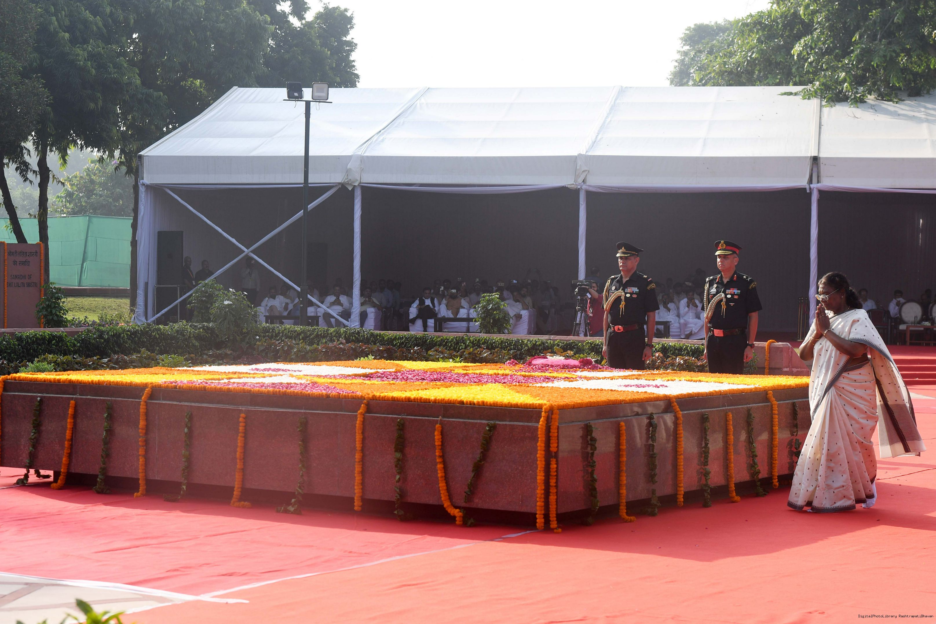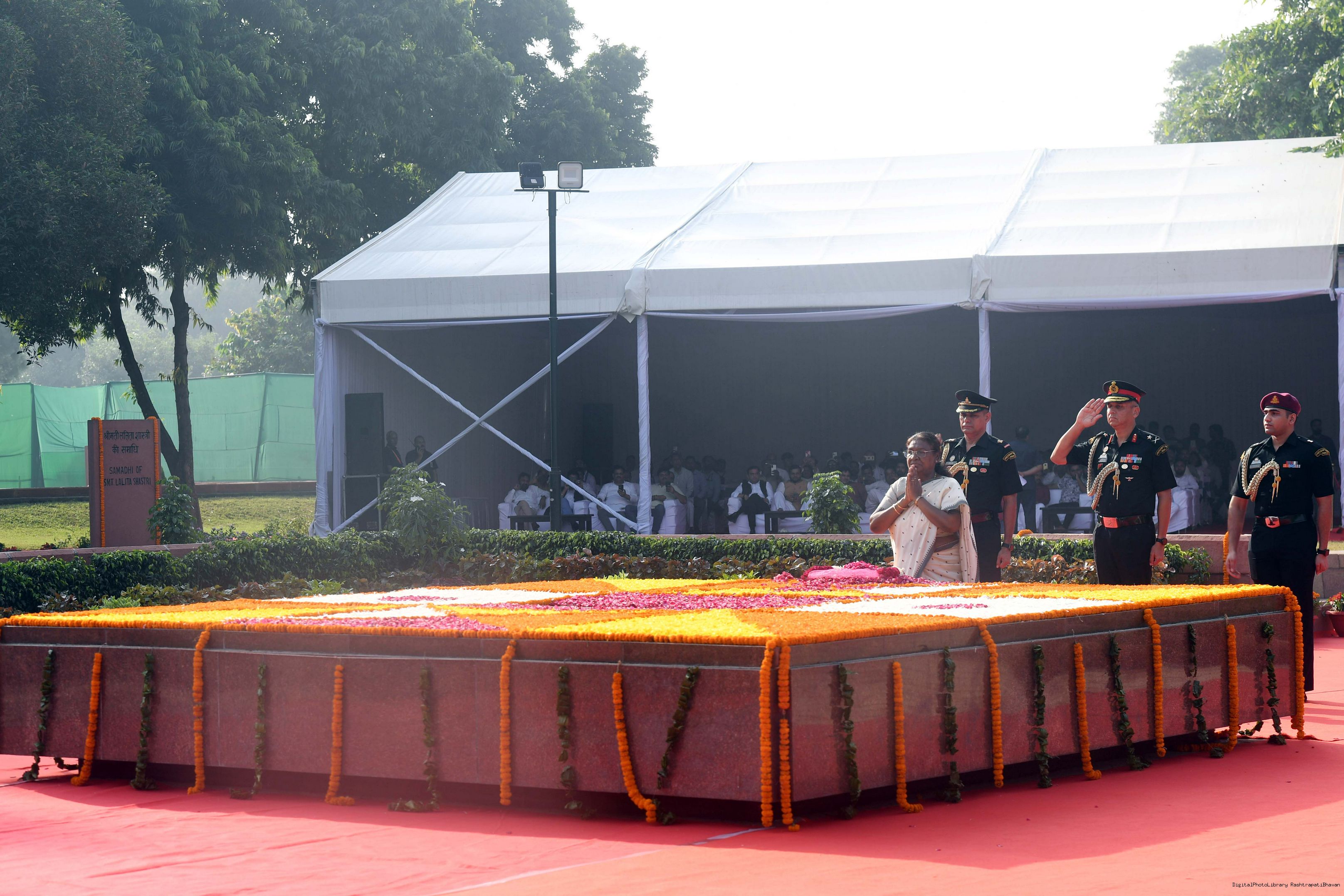 | Caption: | The President of India Smt. Droupadi Murmu paid tributes to Shri Lal Bahadur Shastri, former Prime Minister of India, at Vijay Ghat on his birth anniversary, New Delhi on October 02, 2024. |