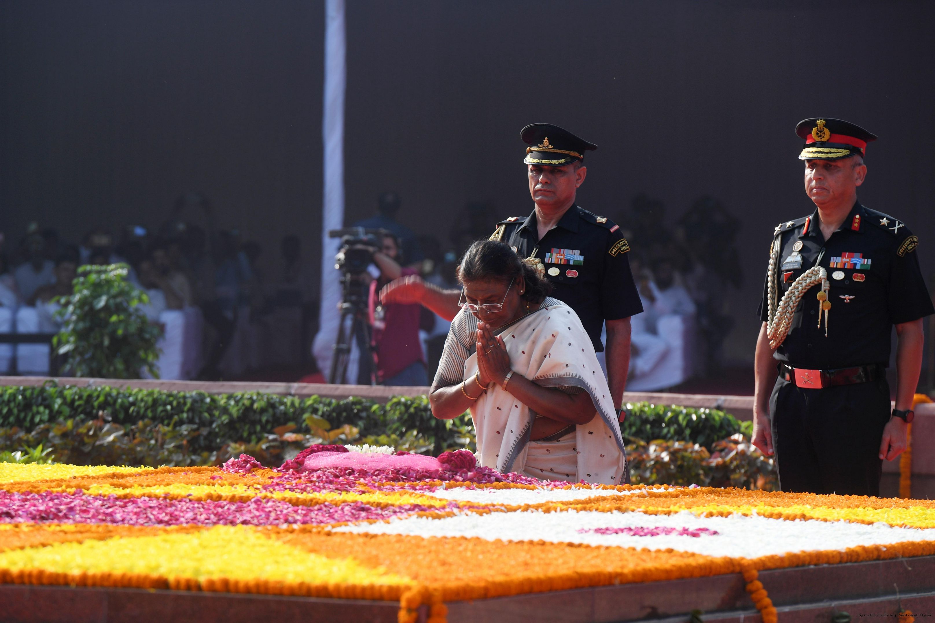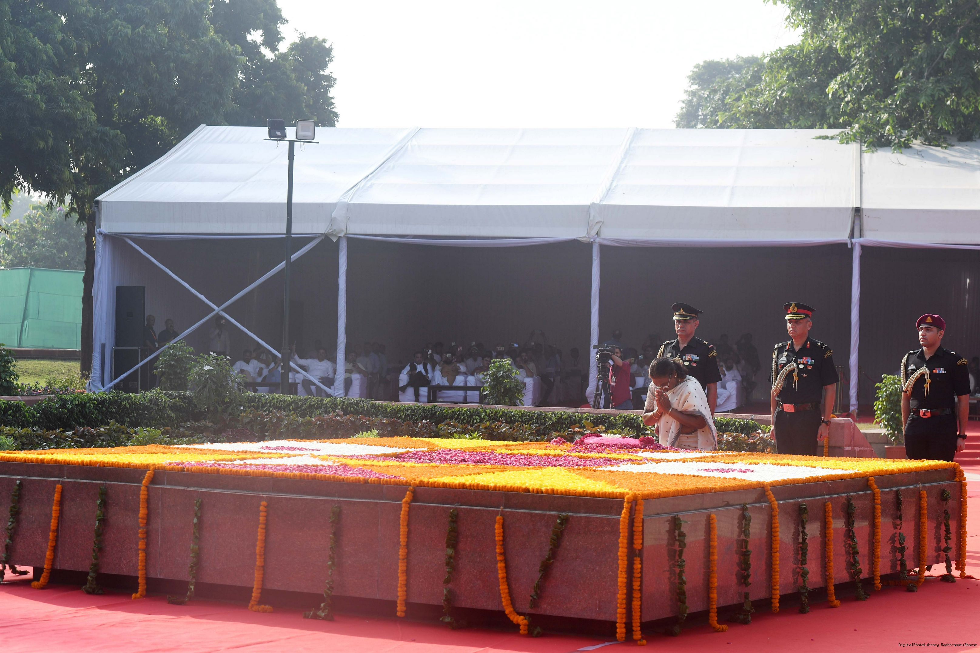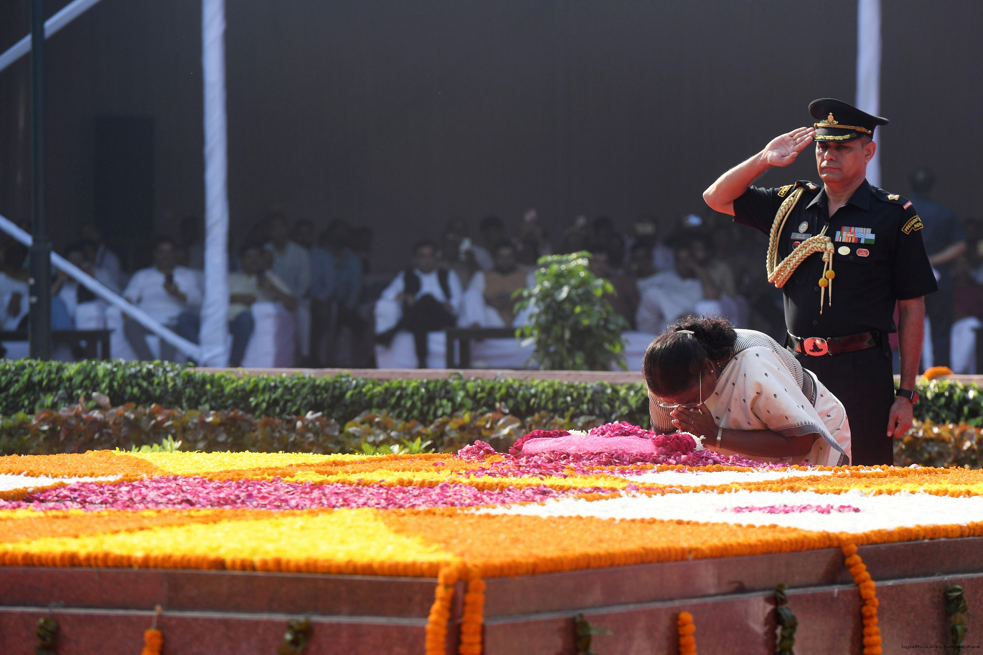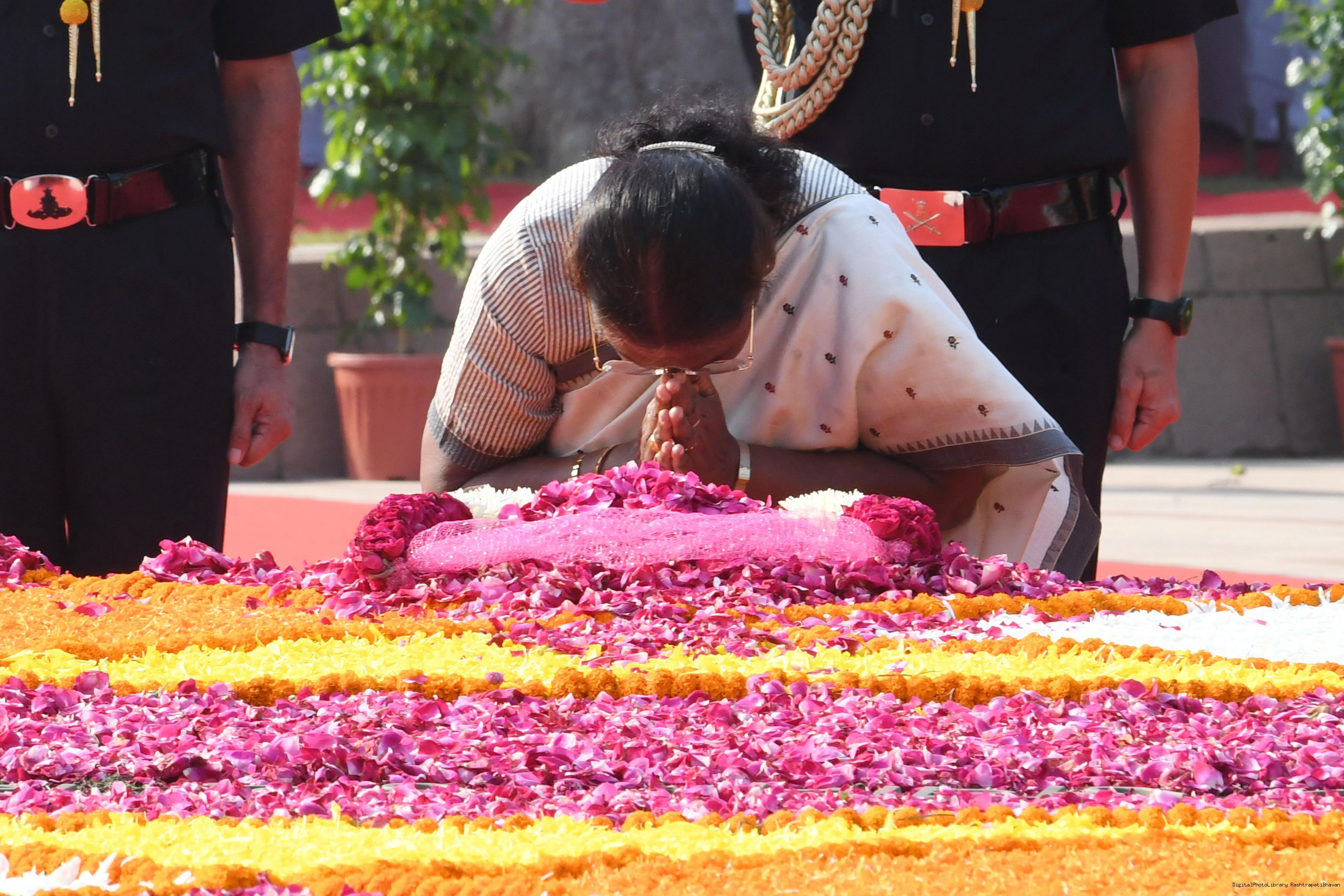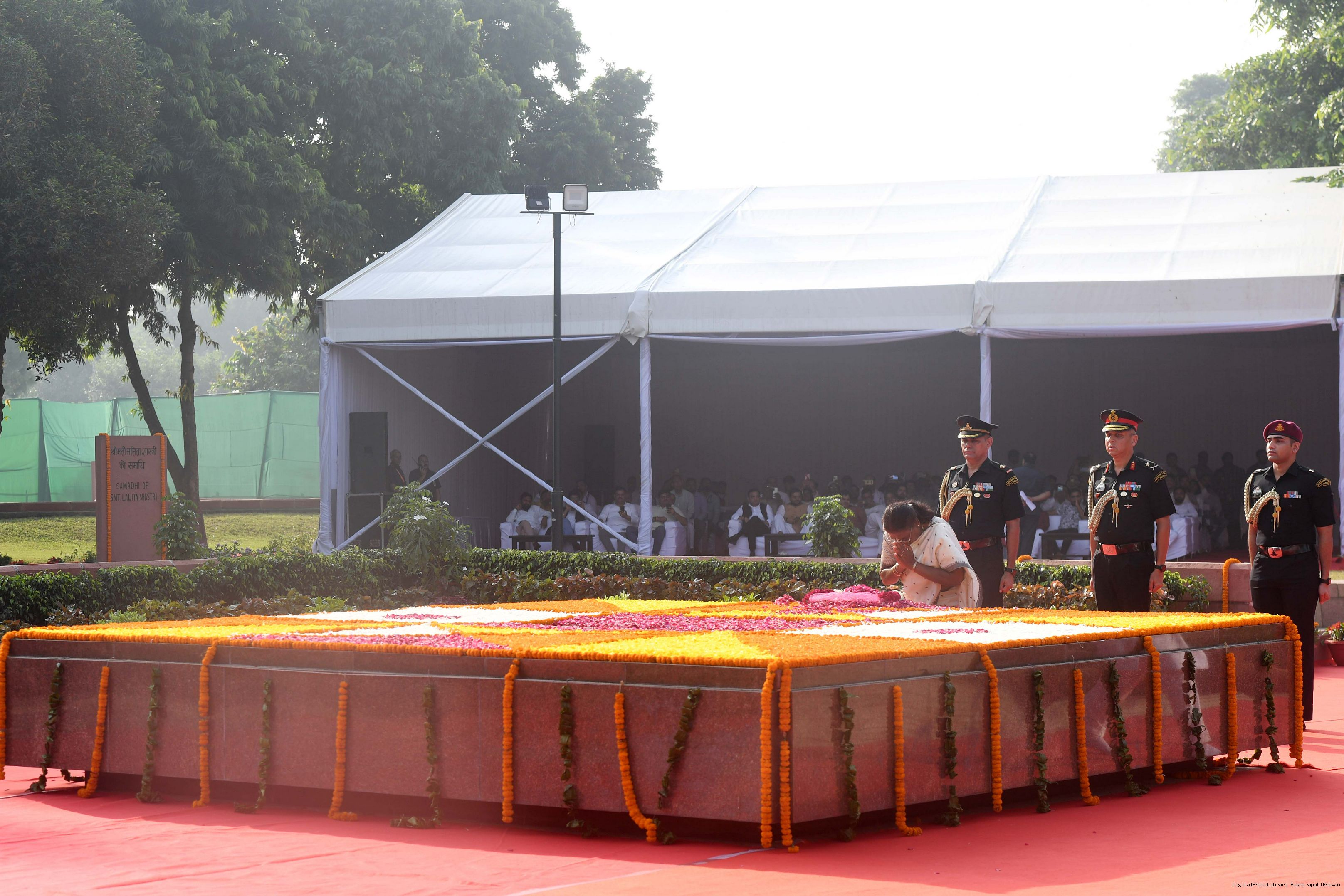| Caption: | The President of India Smt. Droupadi Murmu paid tributes to Shri Lal Bahadur Shastri, former Prime Minister of India, at Vijay Ghat on his birth anniversary, New Delhi on October 02, 2024. |