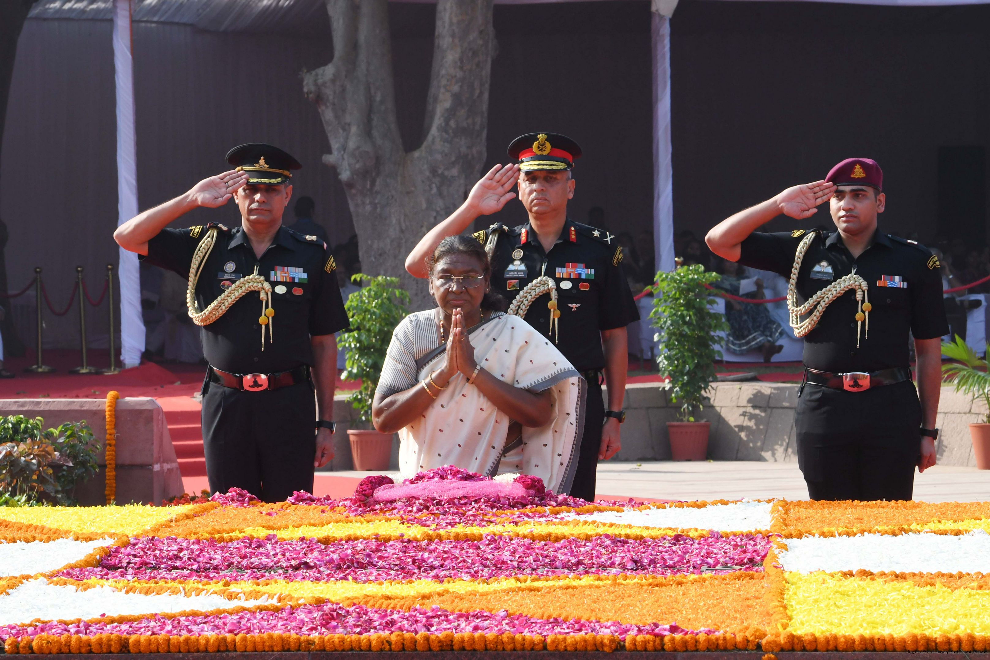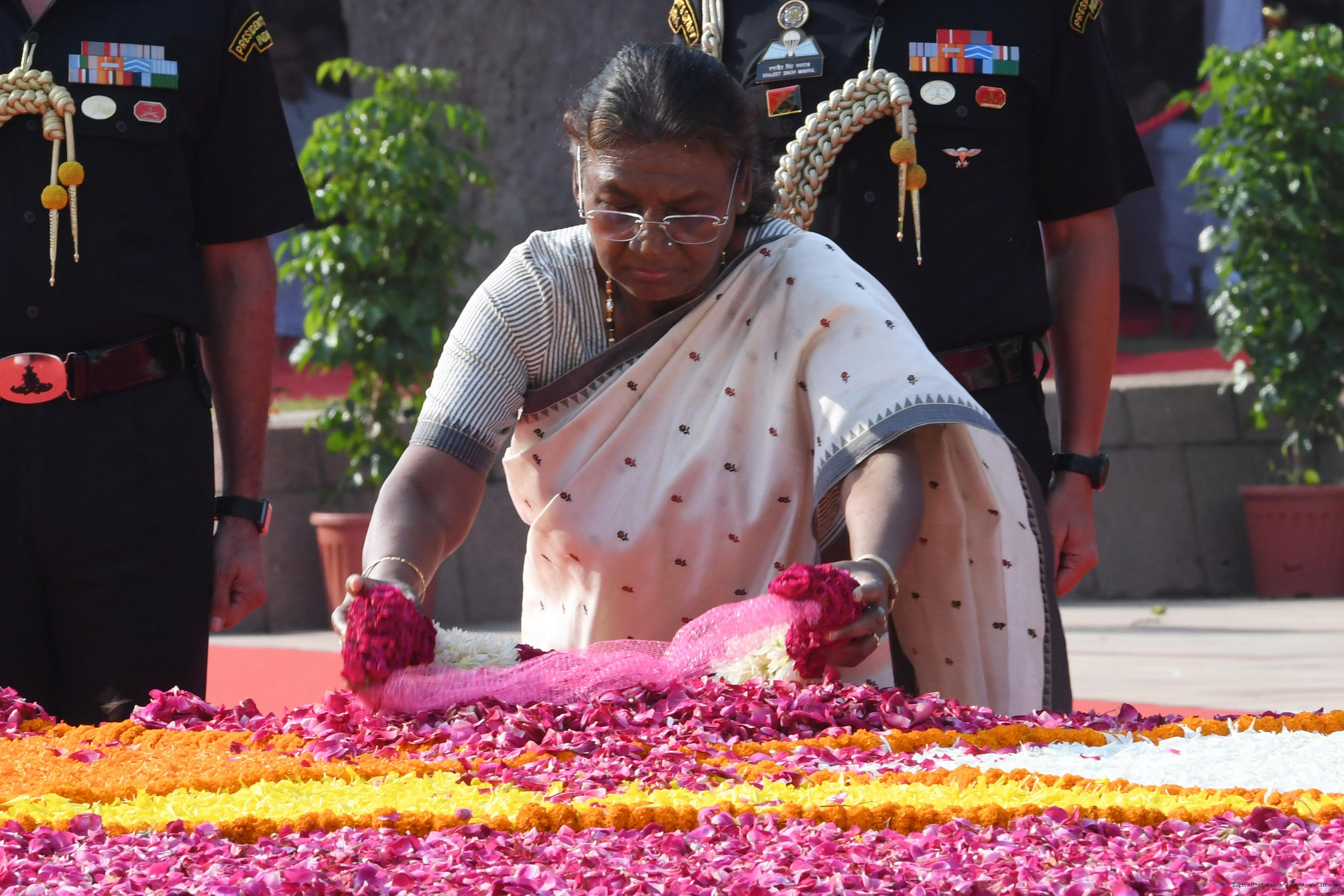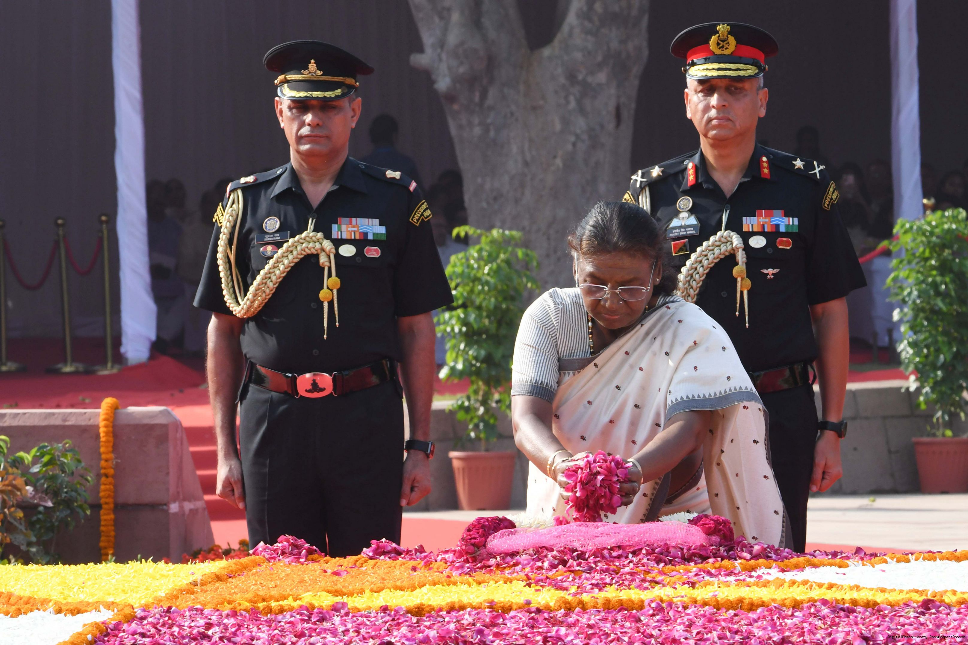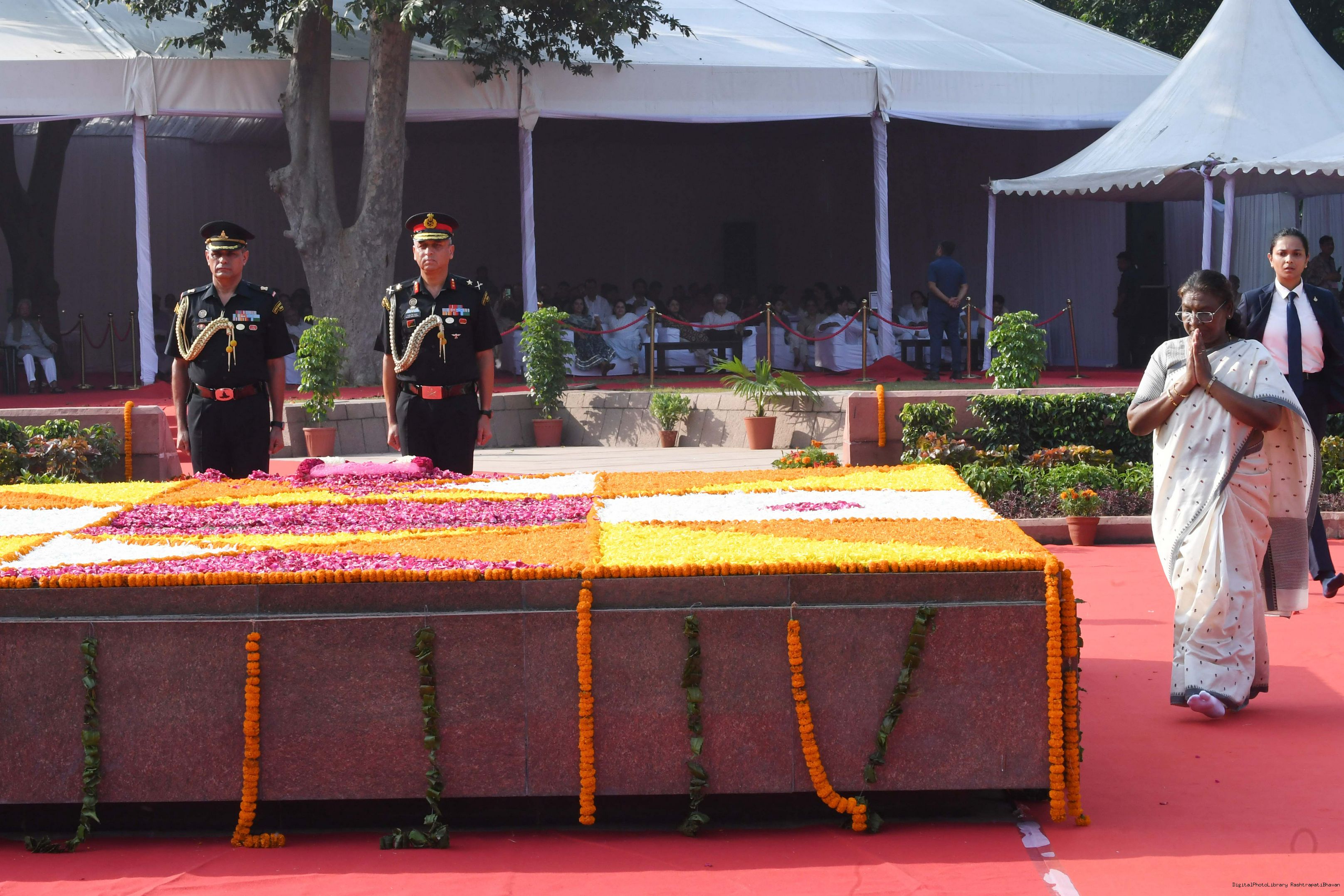 | Caption: | The President of India Smt. Droupadi Murmu paid tributes to Shri Lal Bahadur Shastri, former Prime Minister of India, at Vijay Ghat on his birth anniversary, New Delhi on October 02, 2024. |