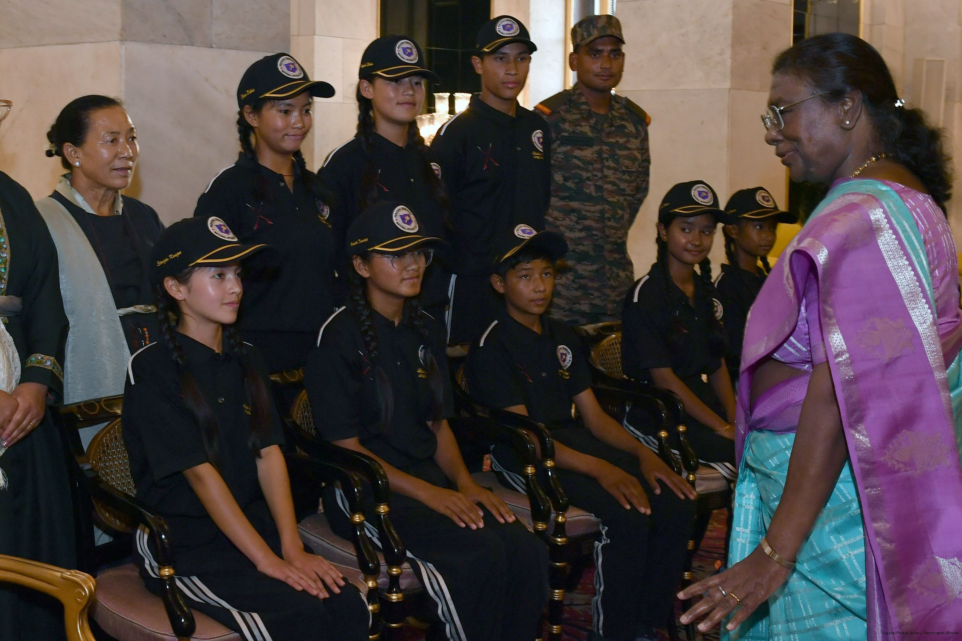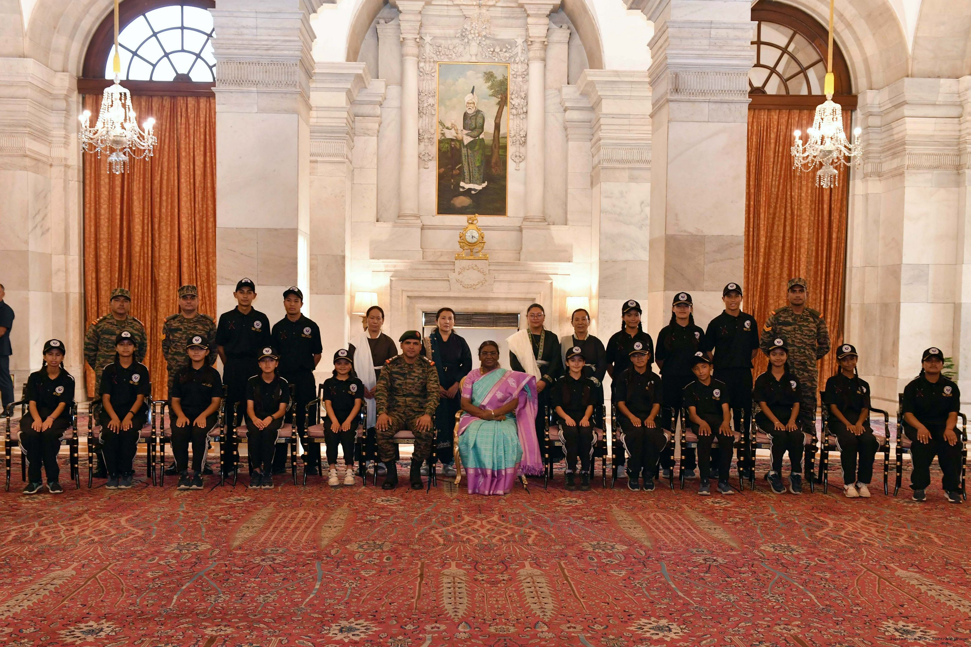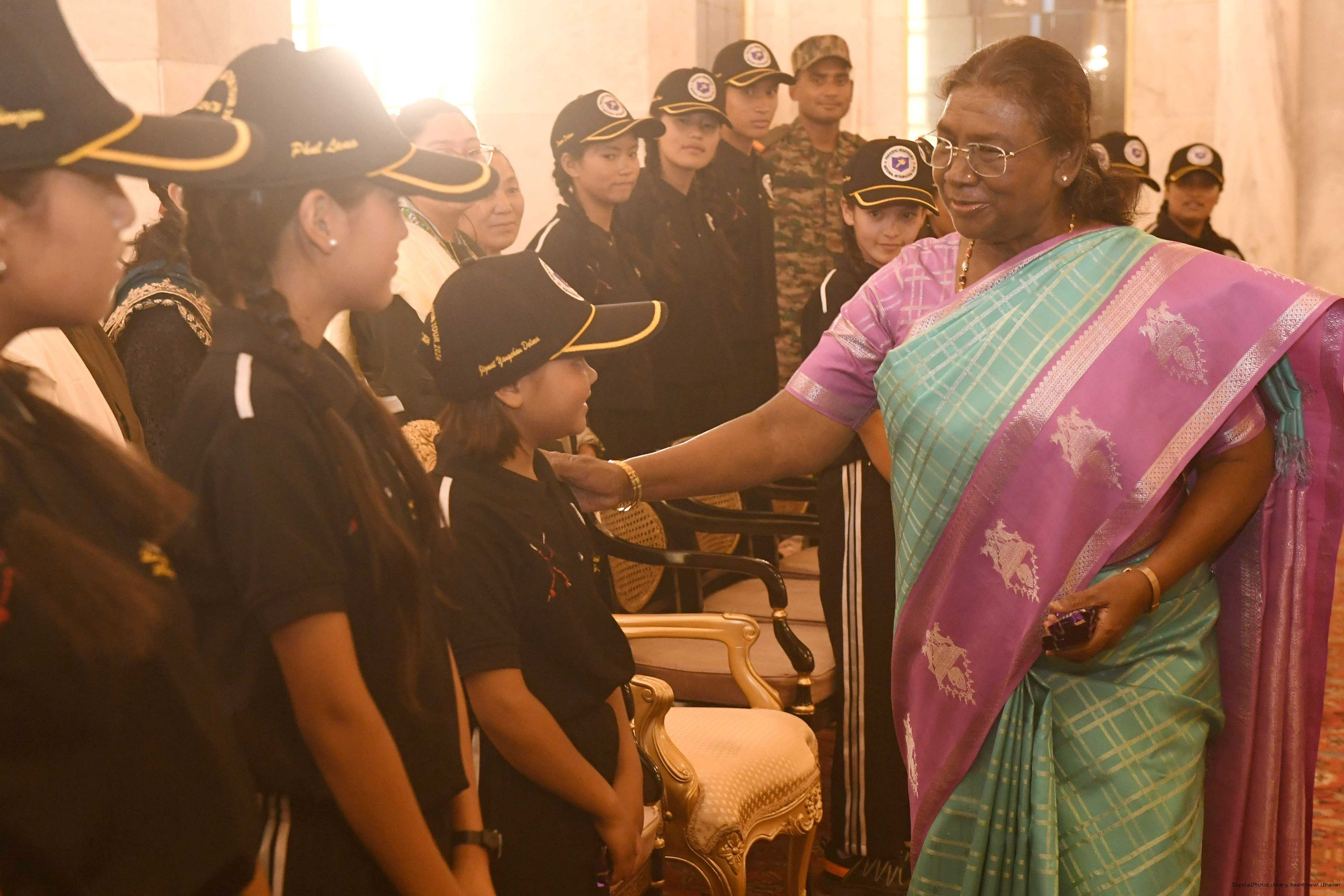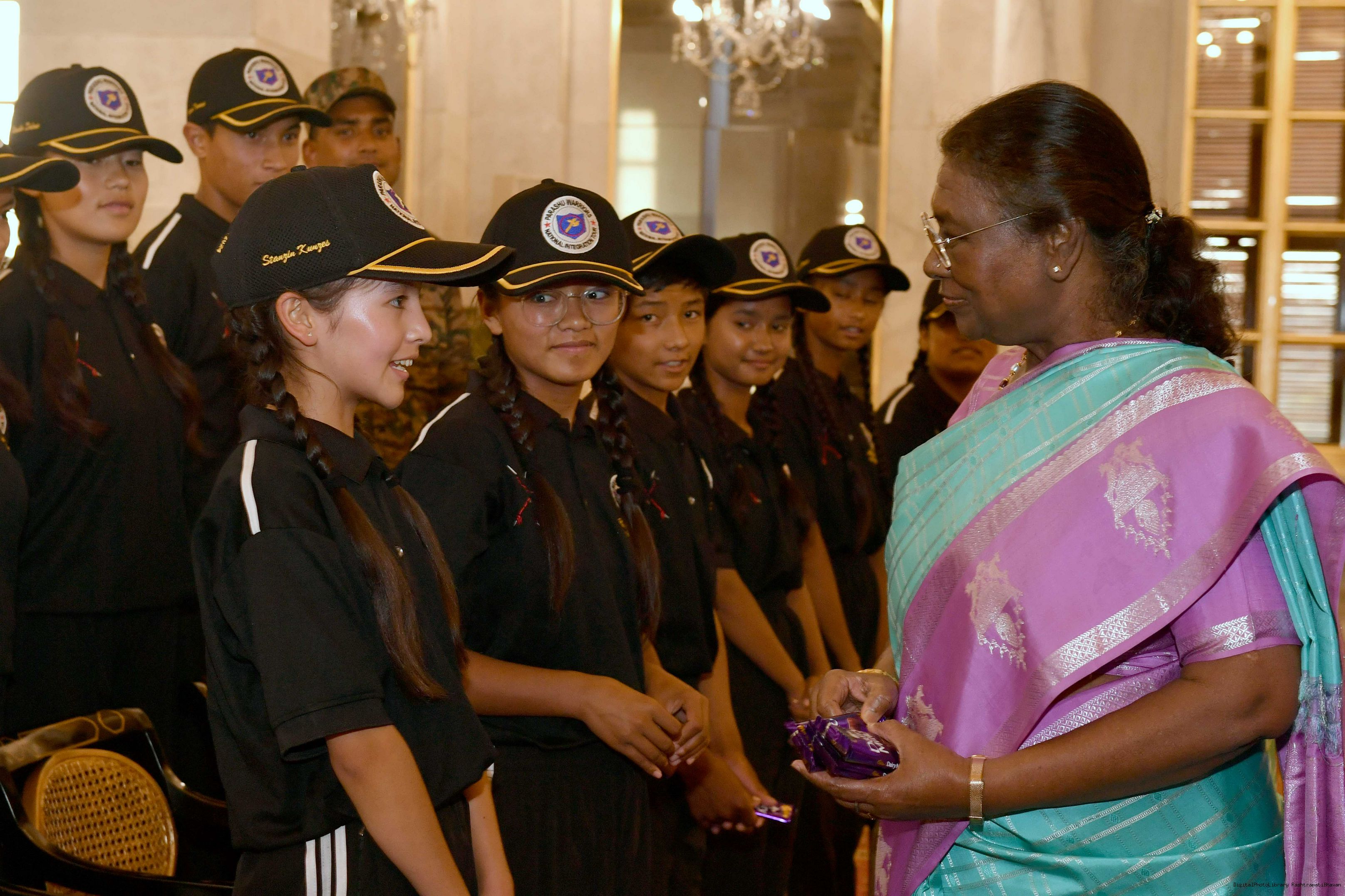 | Caption: | The President of India Smt. Droupadi Murmu interacted with a group of students from Nimu, Ladakh who visited Rashtrapati Bhavan as part of National Integration Tour at Rashtrapati Bhavan on October 02, 2024. |