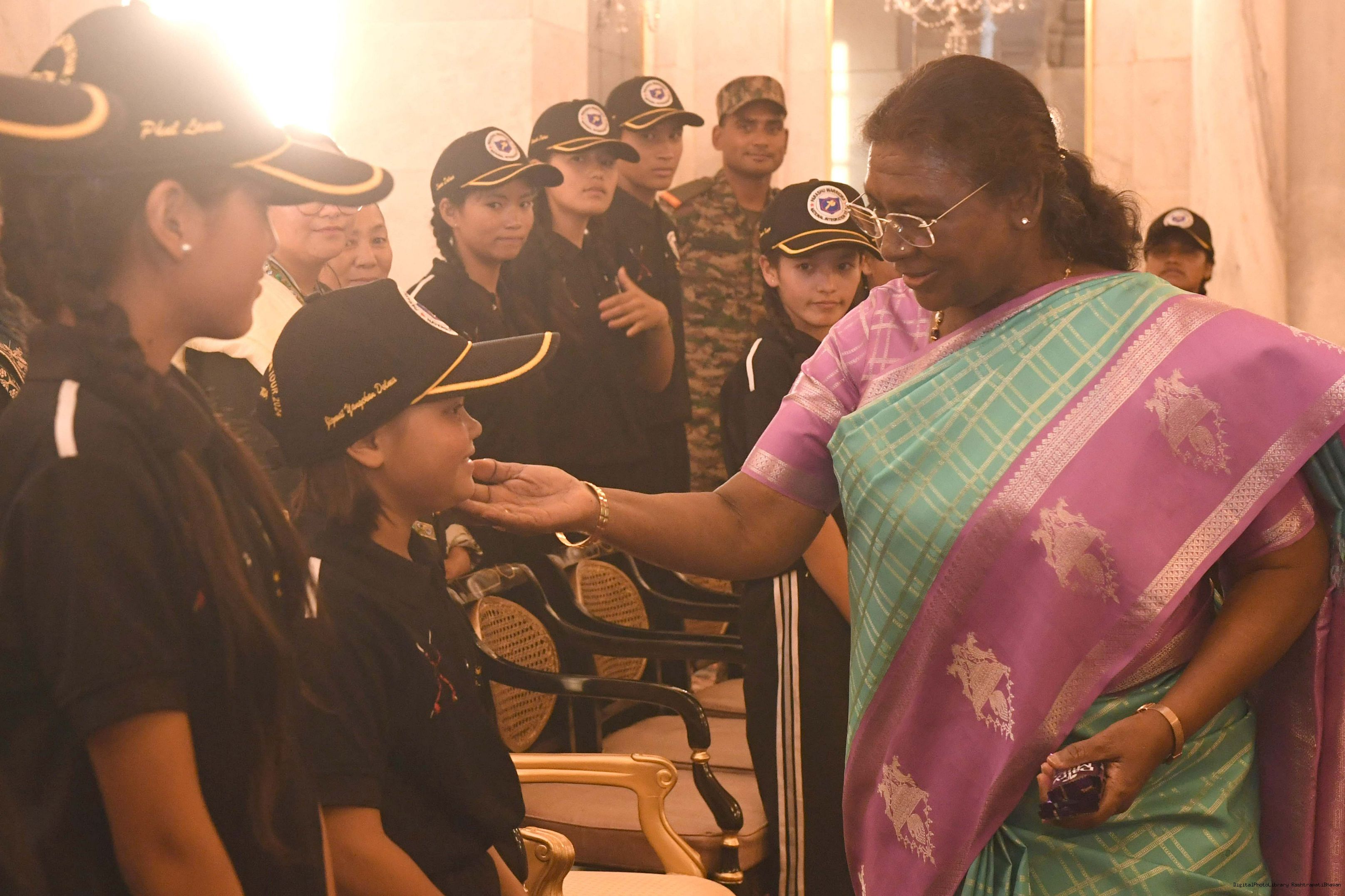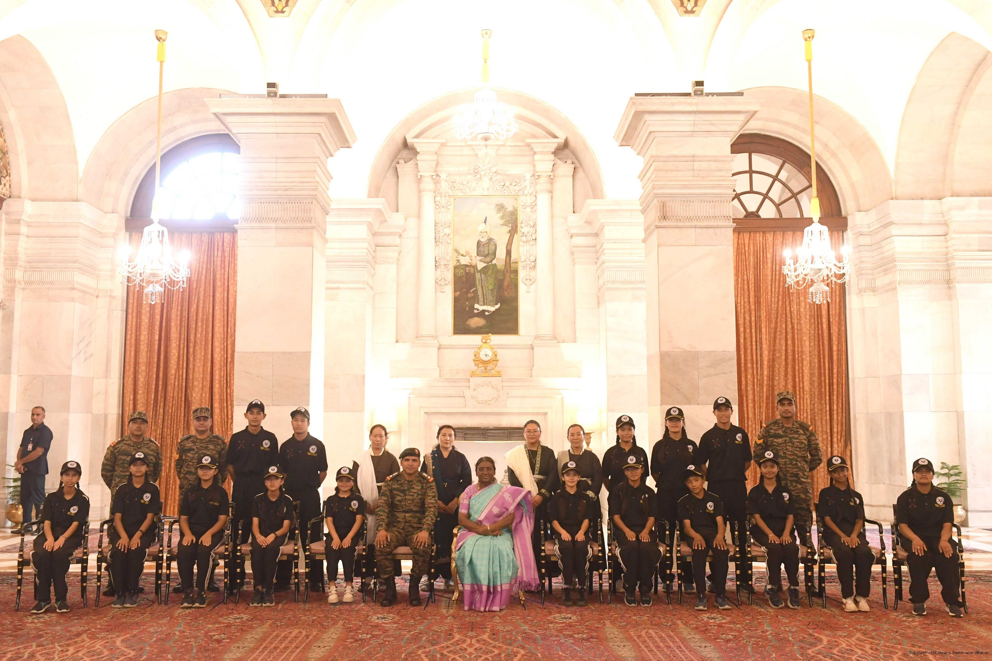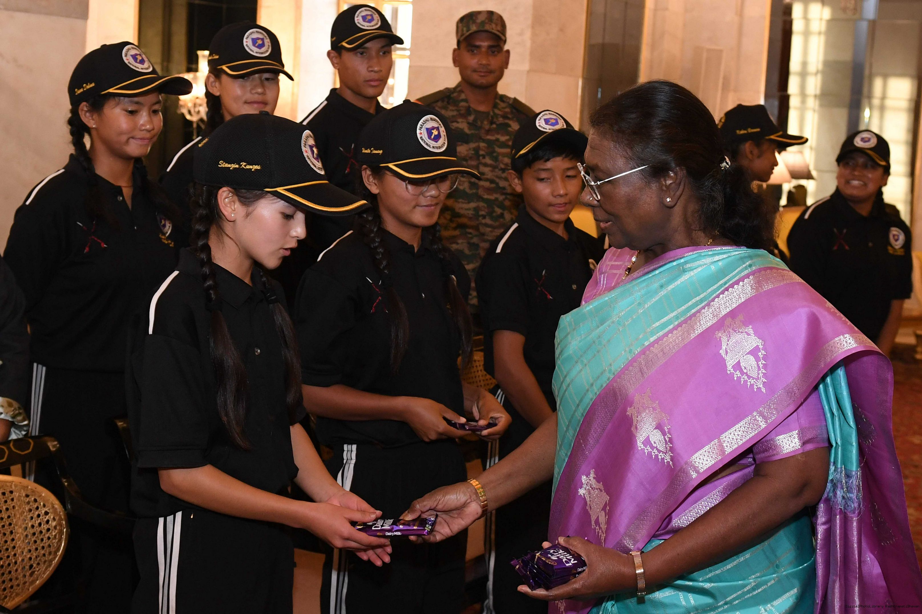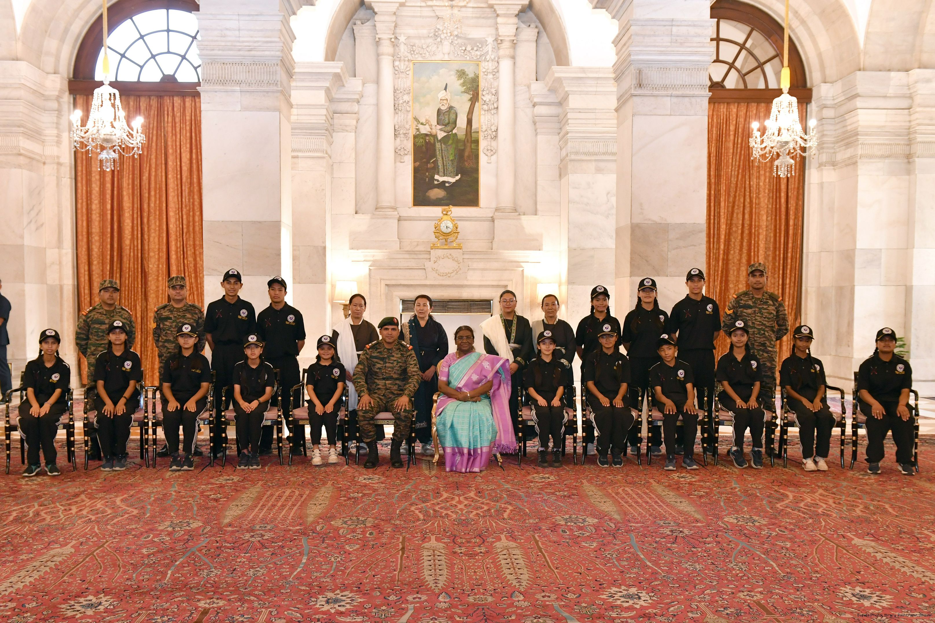 | Caption: | The President of India Smt. Droupadi Murmu interacted with a group of students from Nimu, Ladakh who visited Rashtrapati Bhavan as part of National Integration Tour at Rashtrapati Bhavan on October 02, 2024. |