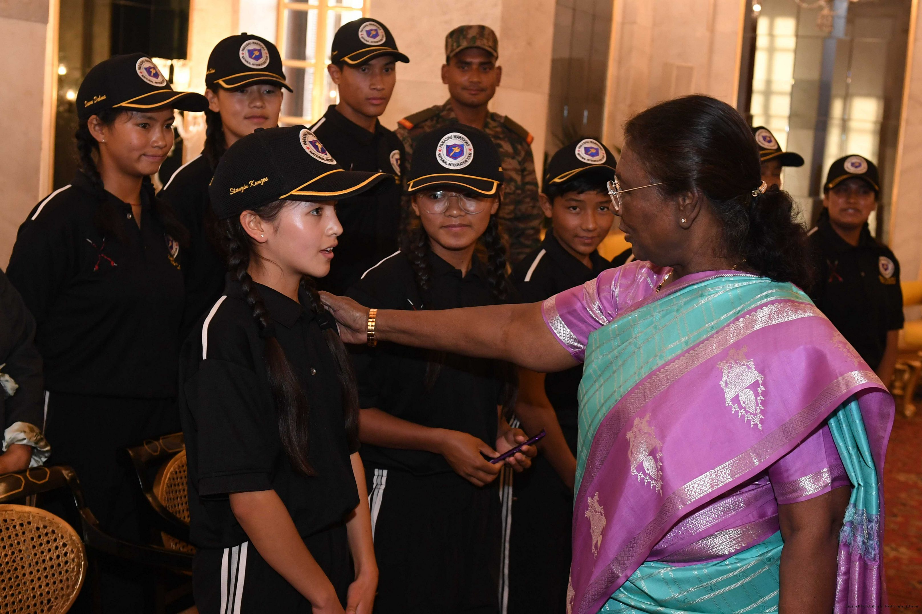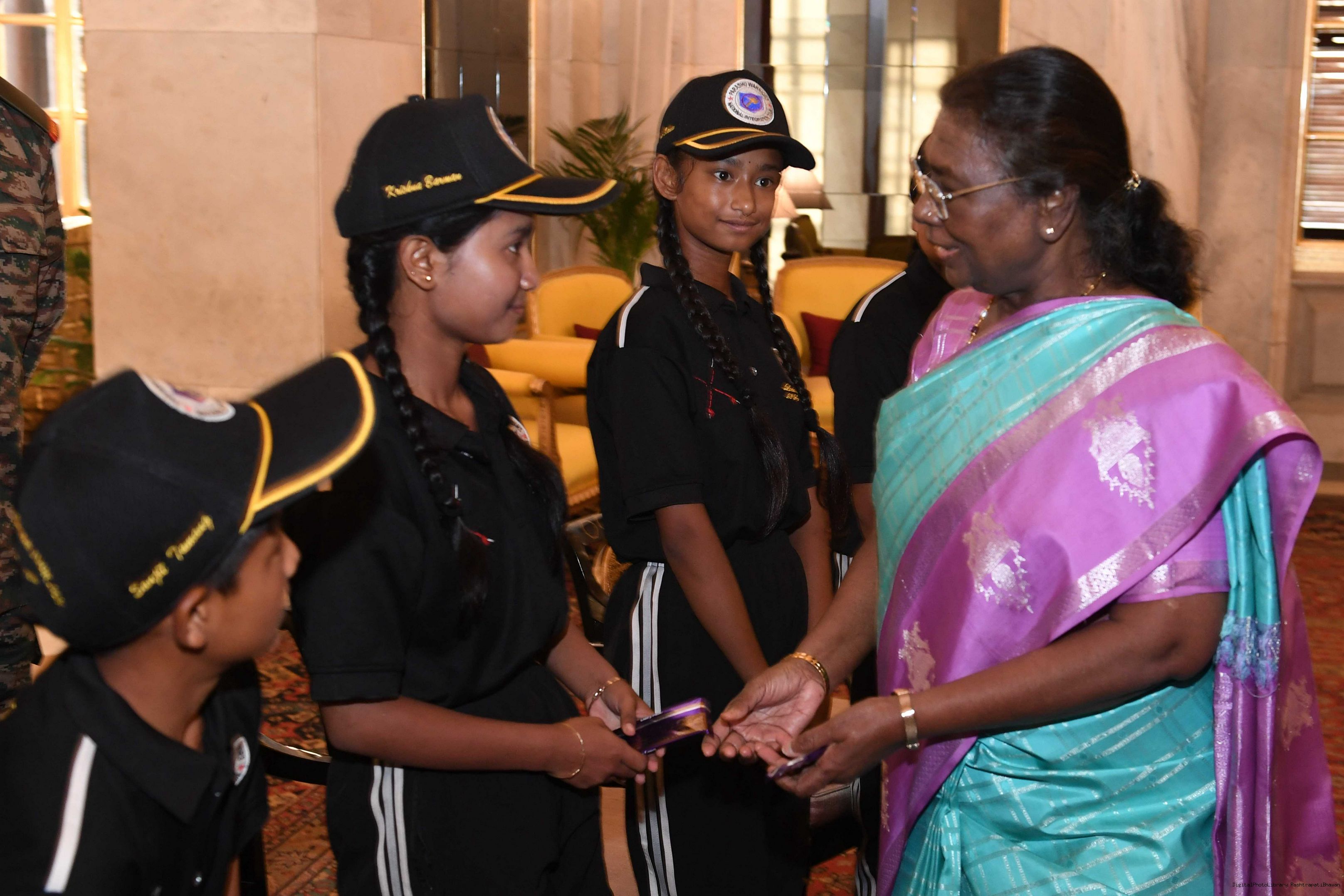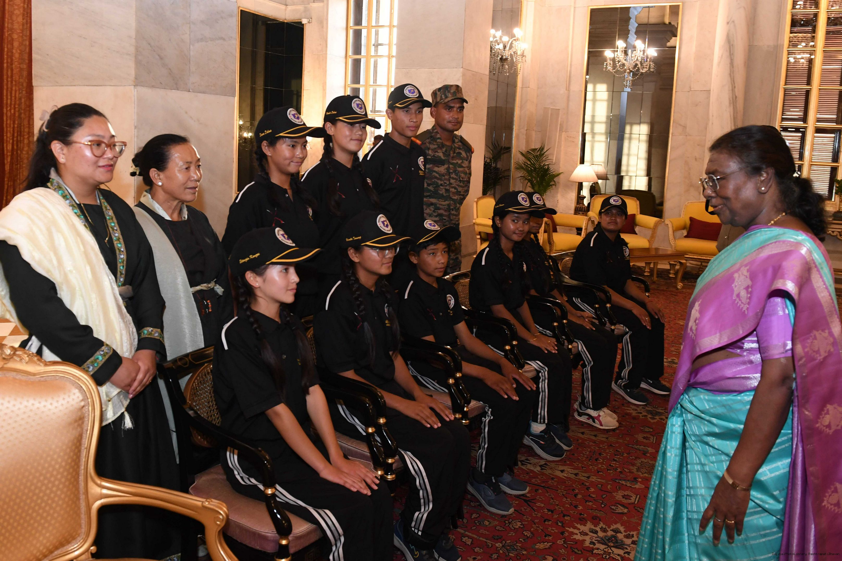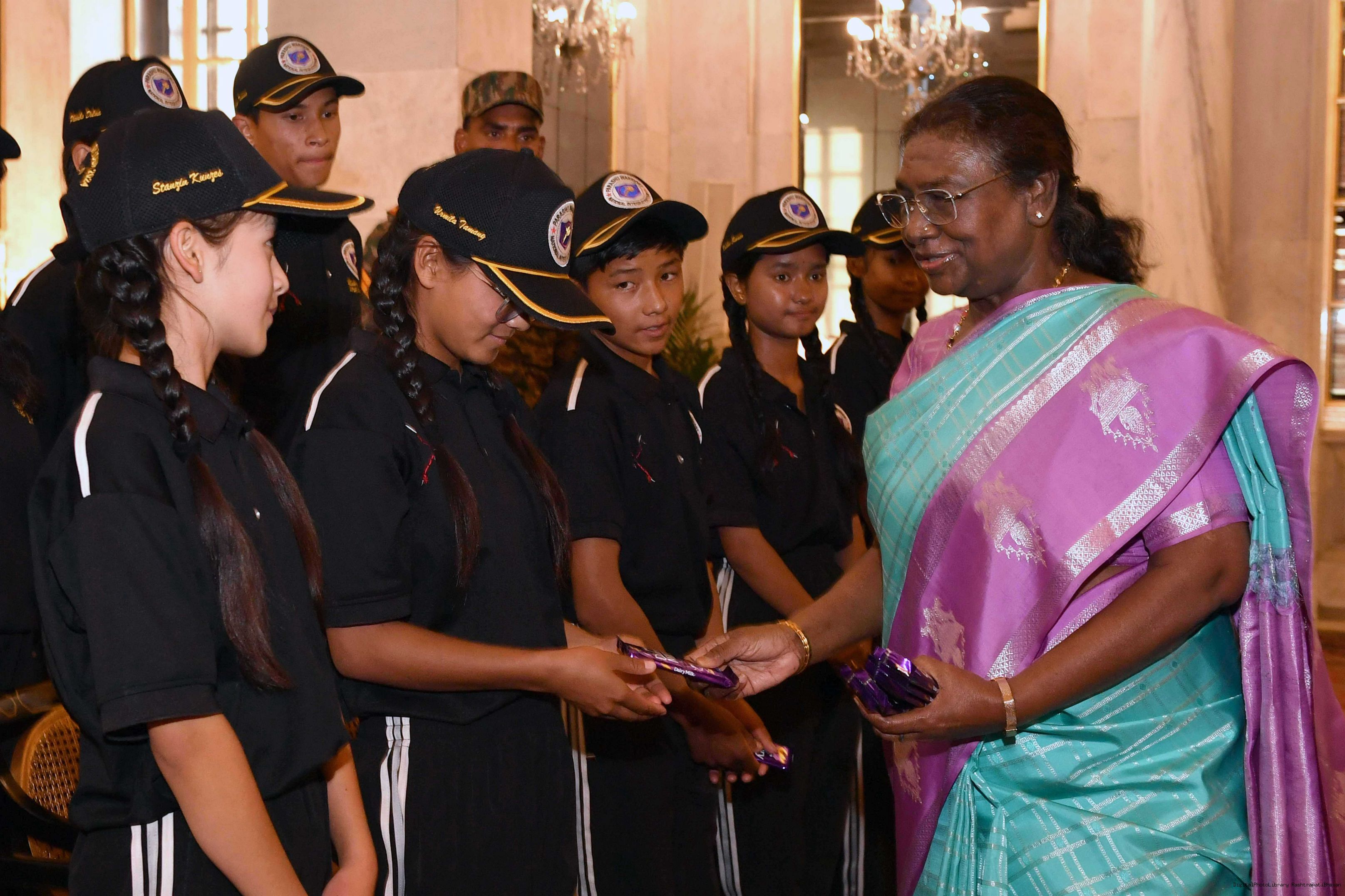 | Caption: | The President of India Smt. Droupadi Murmu interacted with a group of students from Nimu, Ladakh who visited Rashtrapati Bhavan as part of National Integration Tour at Rashtrapati Bhavan on October 02, 2024. |