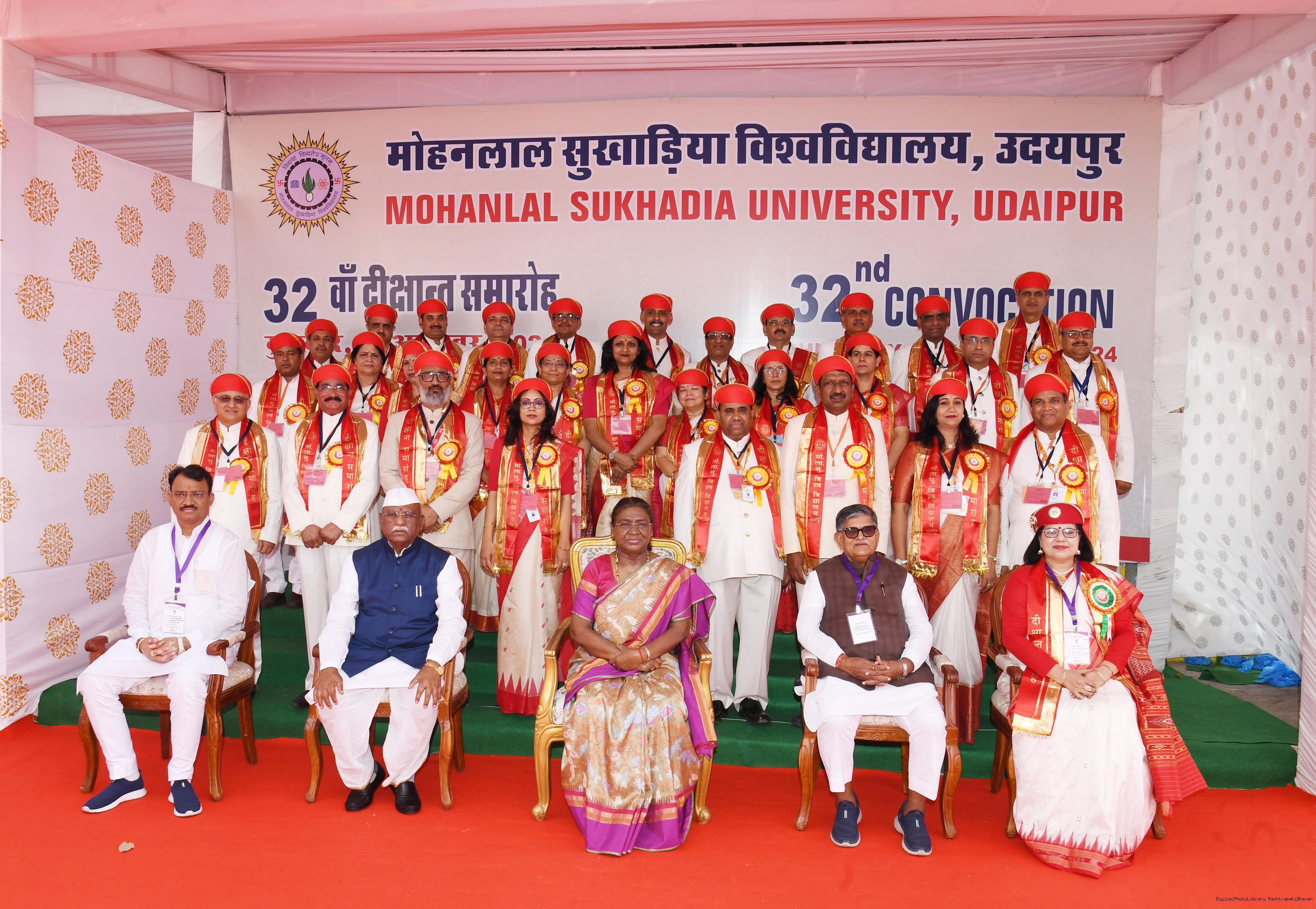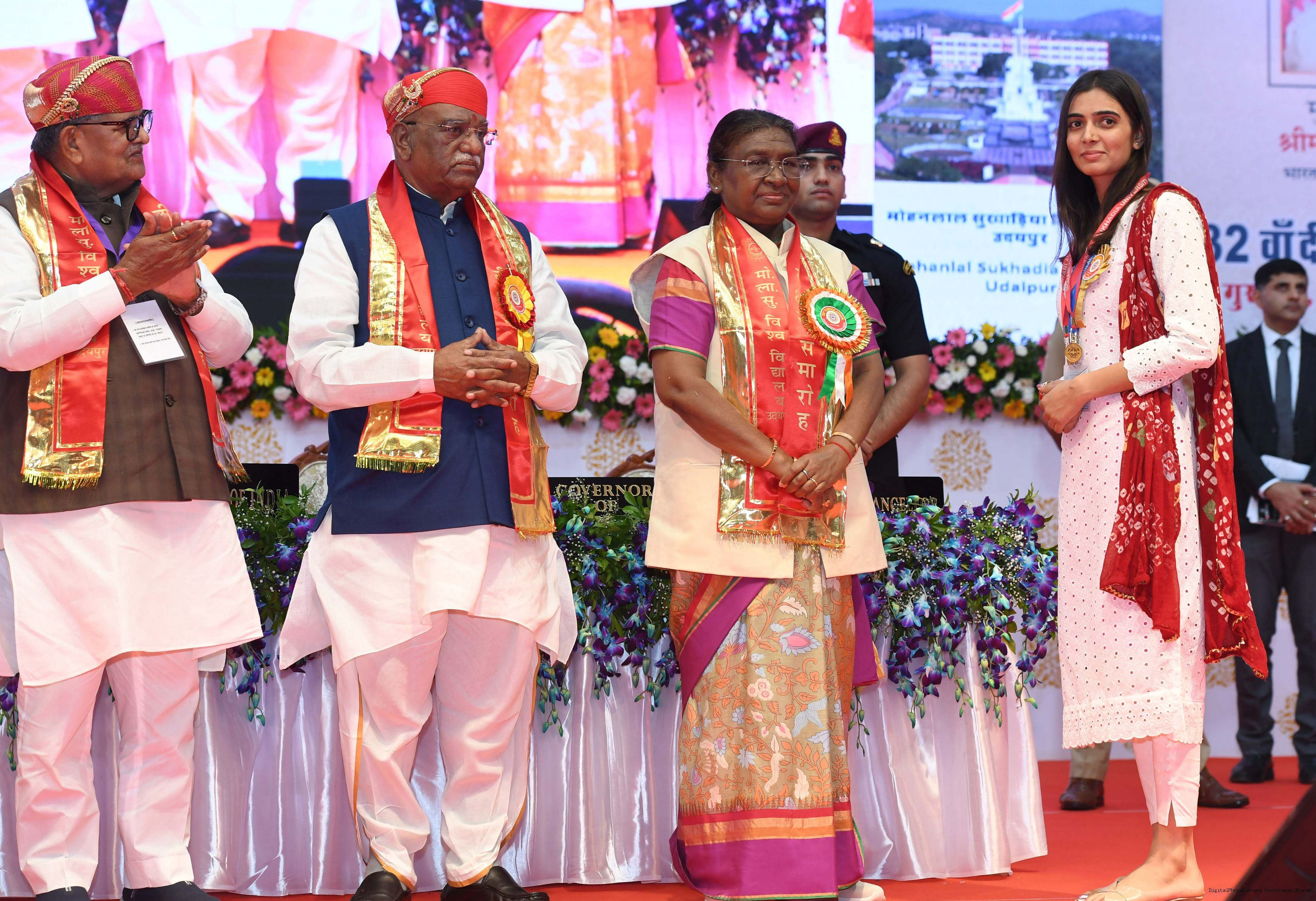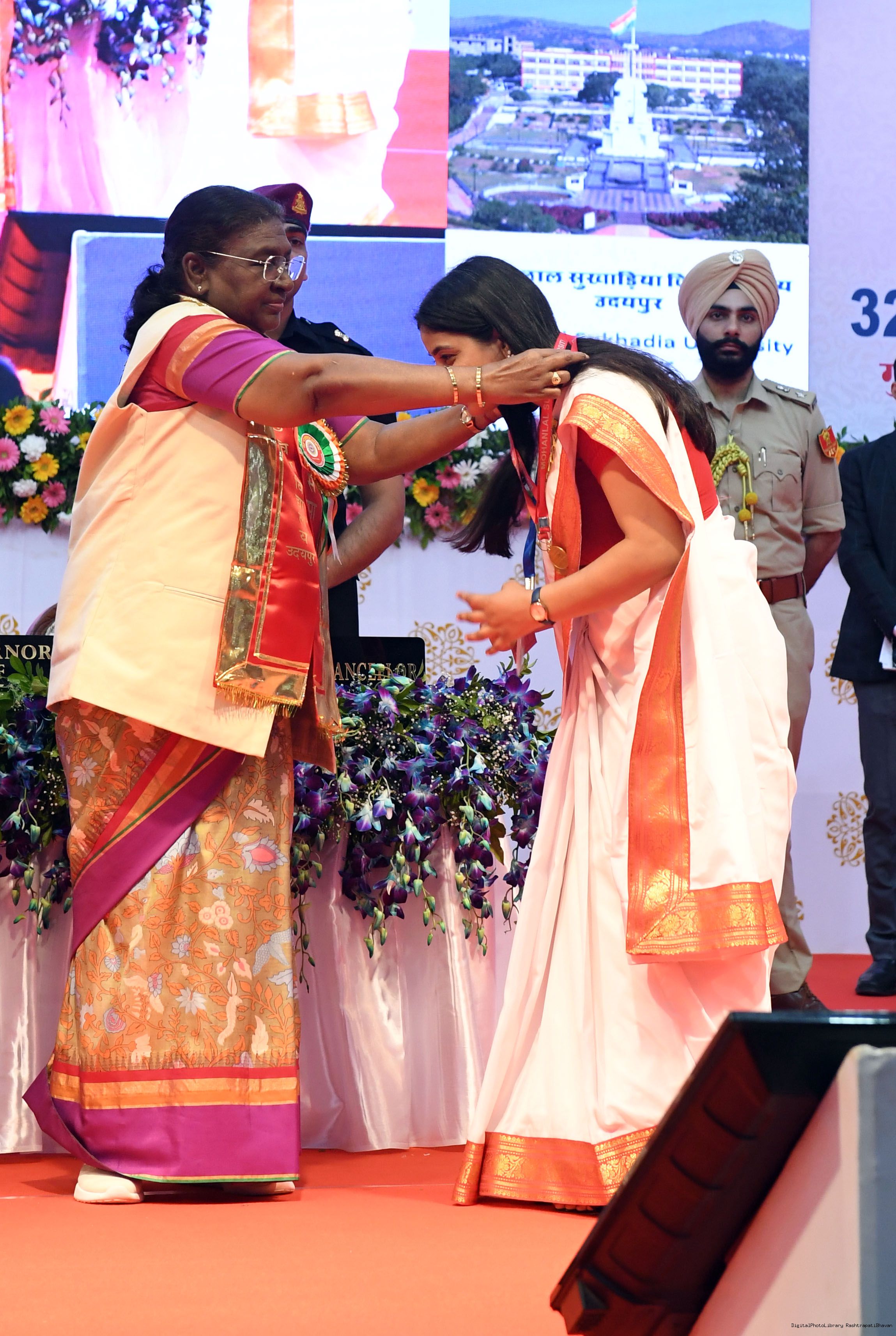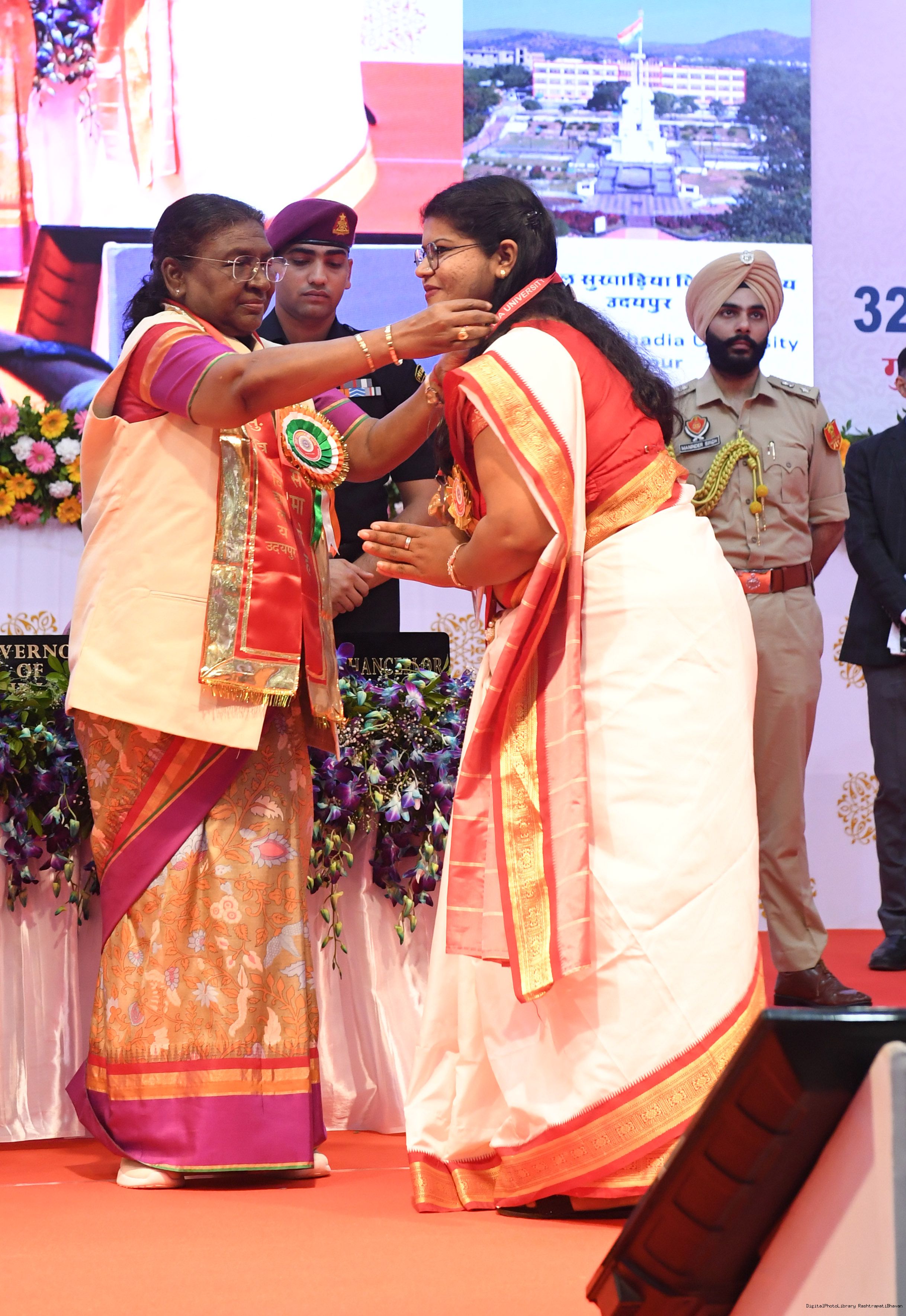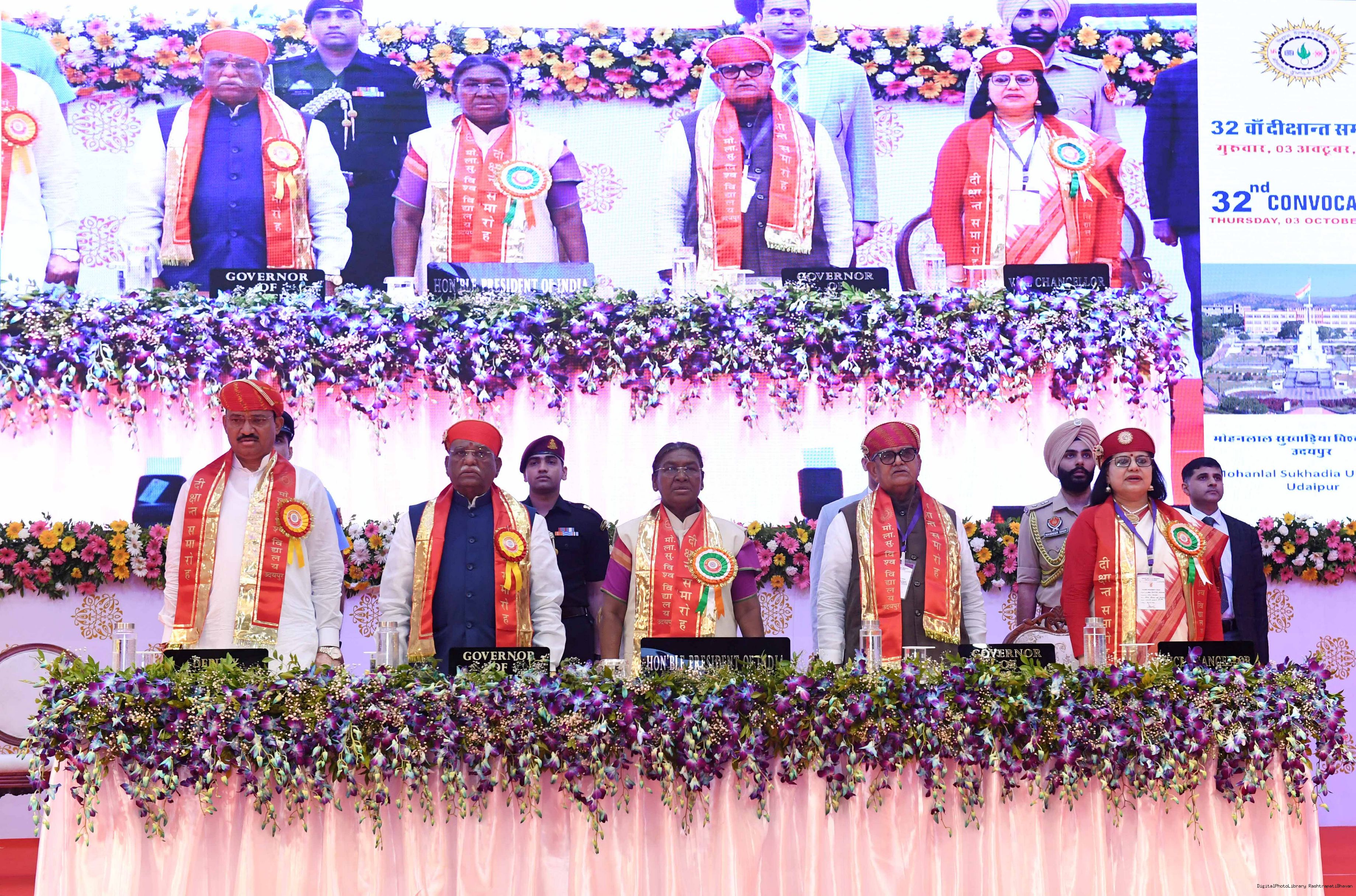 | Caption: | The President of India, Smt. Droupadi Murmu graced the 32nd convocation of Mohanlal Sukhadia University at Udaipur, Rajasthan on October 3, 2024. |