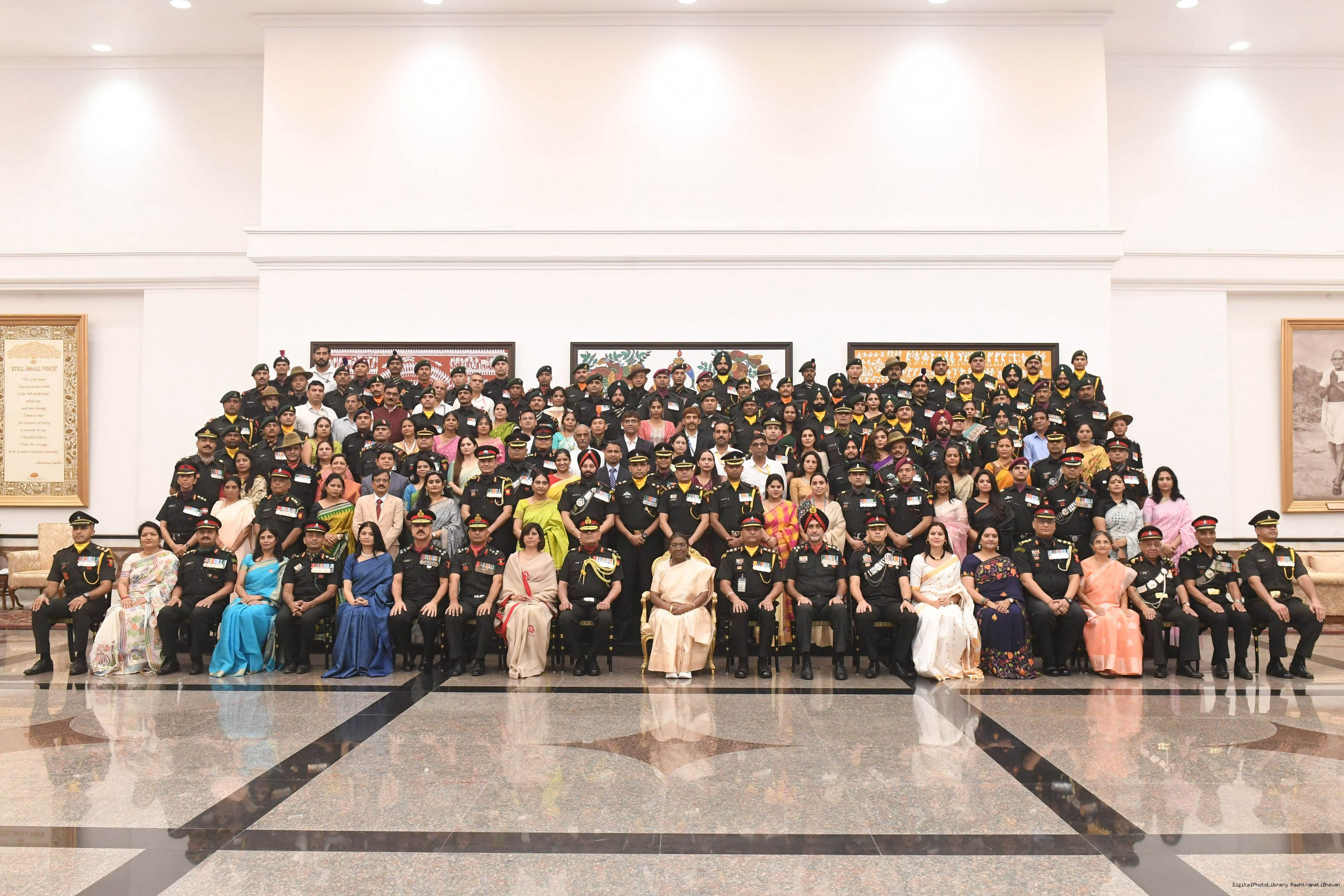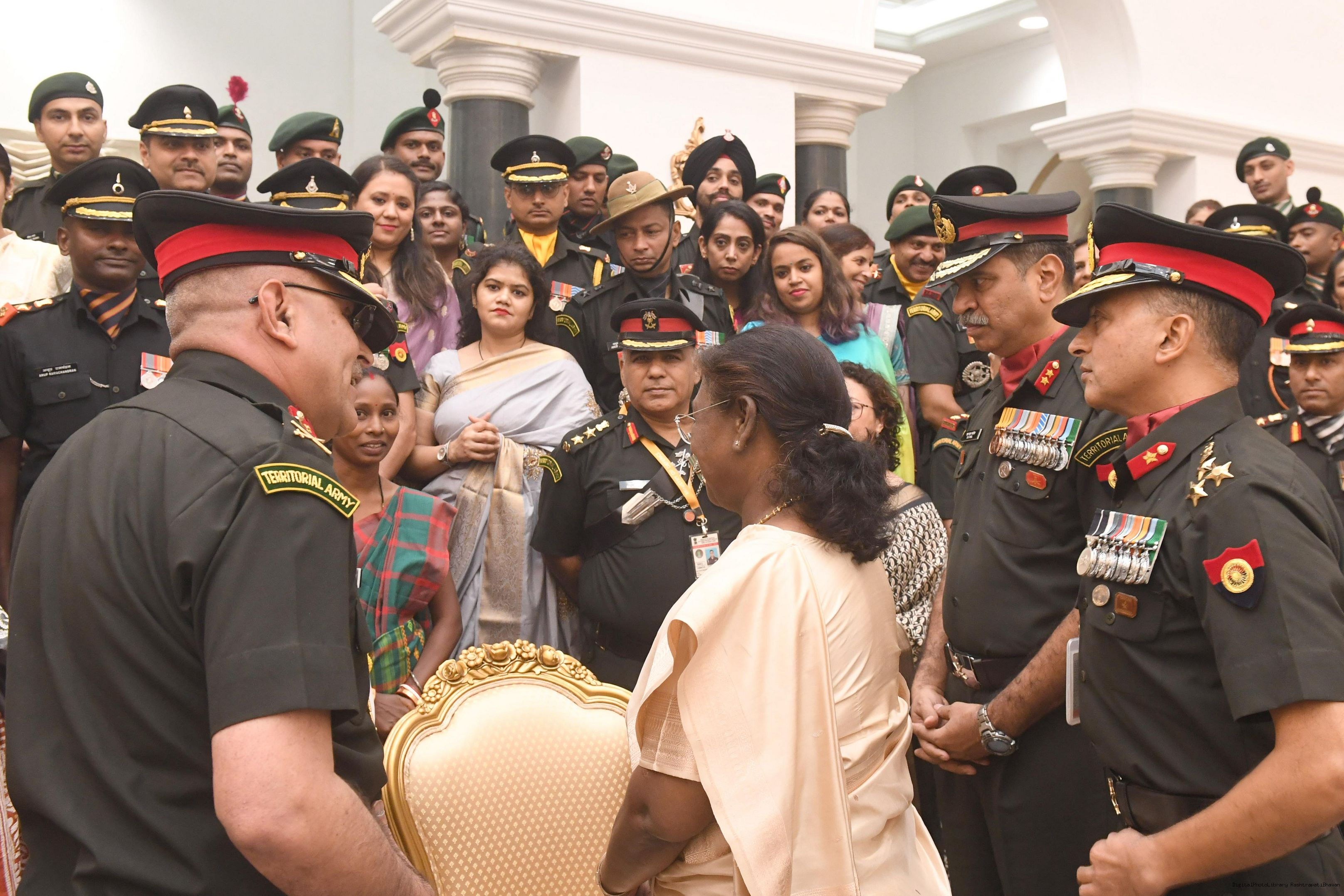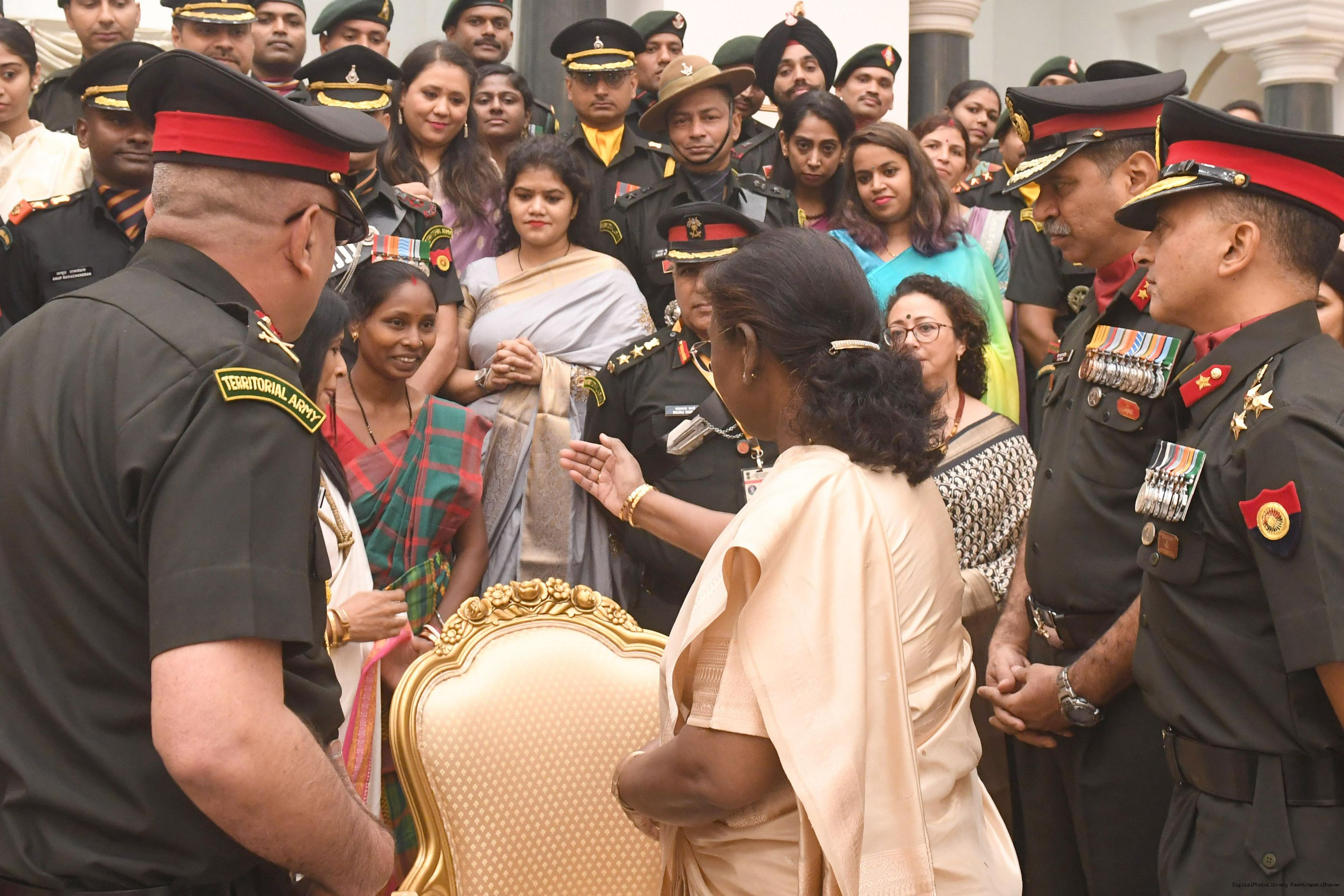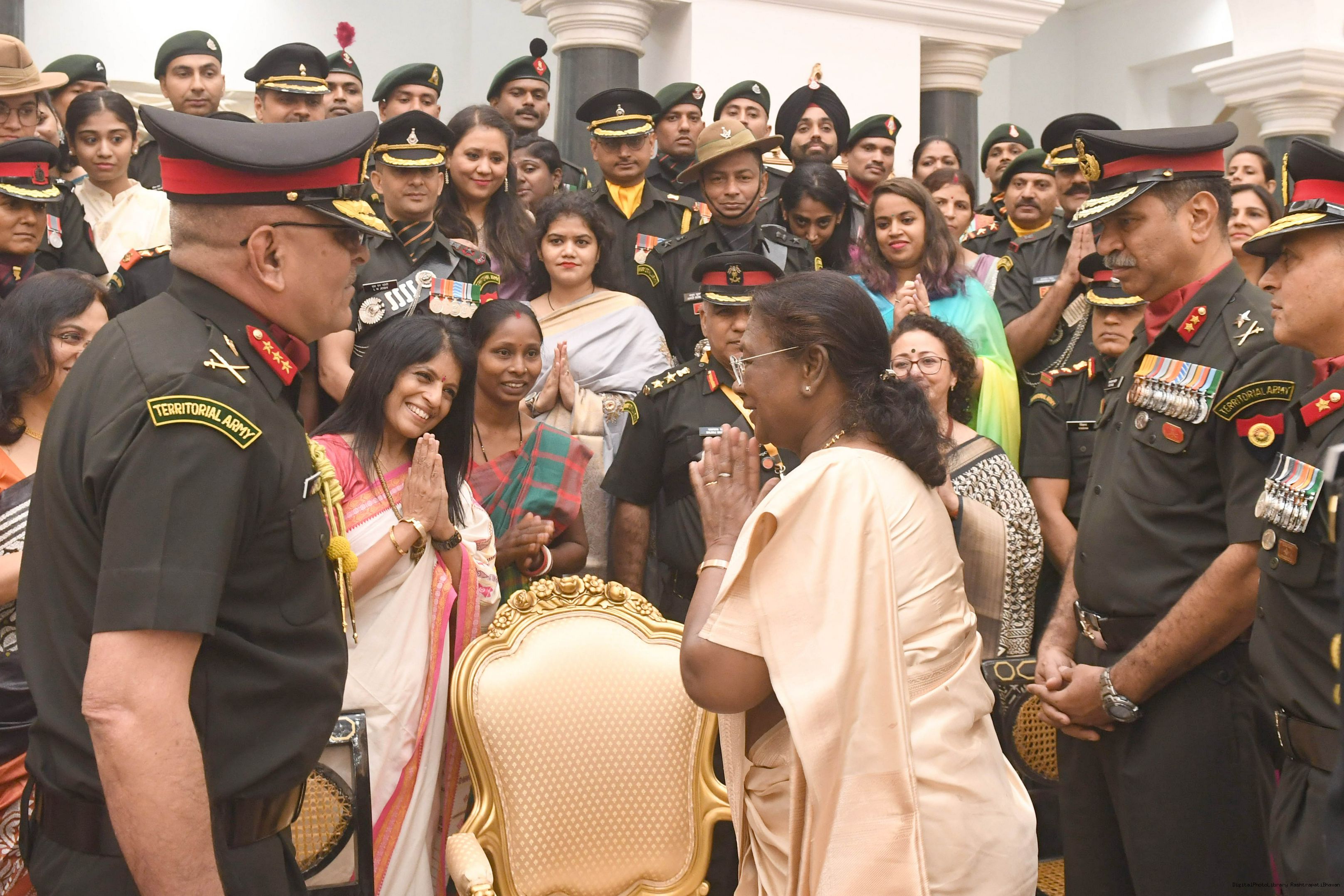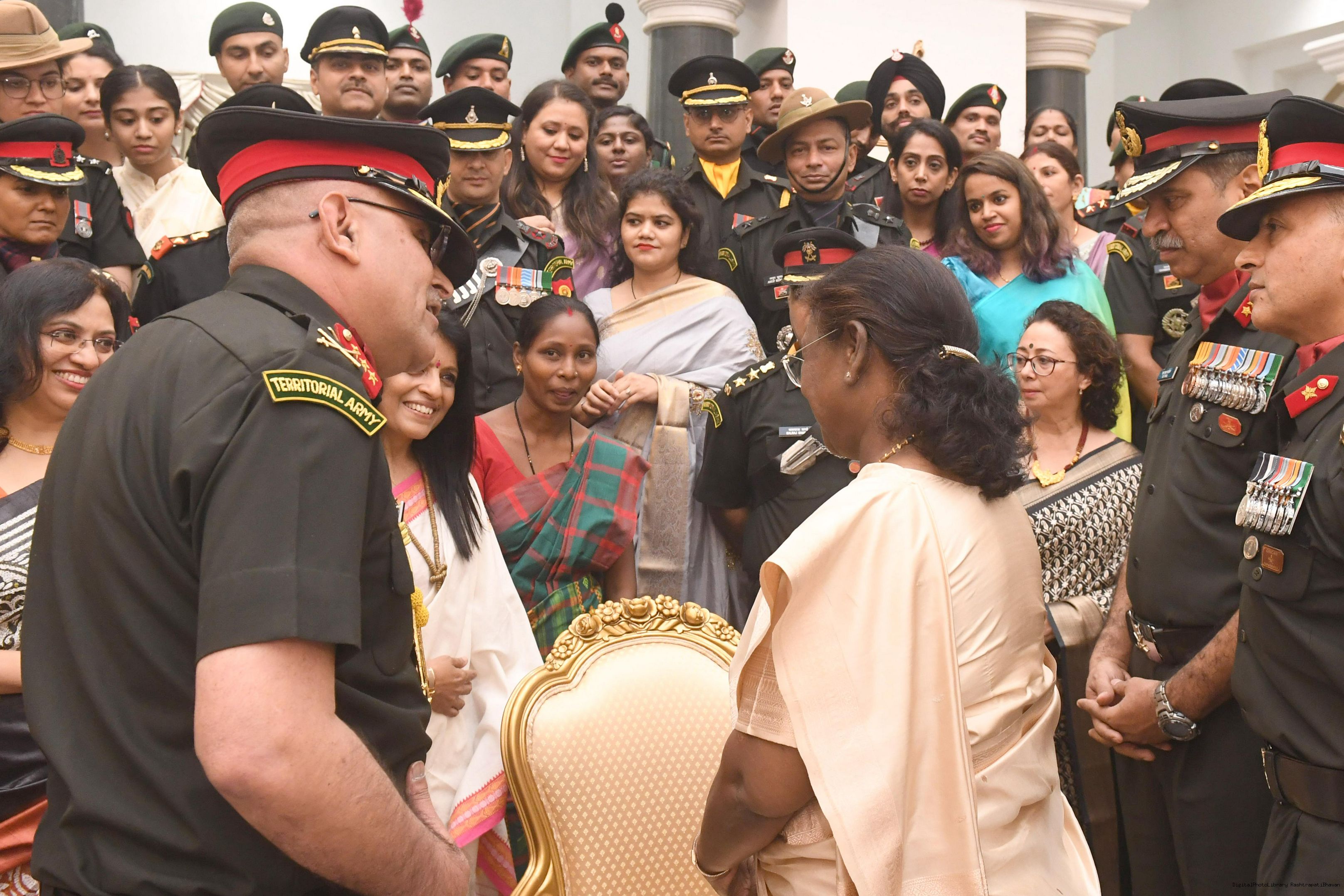 | Caption: | The President of India, Smt Droupadi Murmu met Territotial Army (TA) Officers, JCOs and ORs along with other at Rashtrapati Bhavan on October 7, 2024. |
