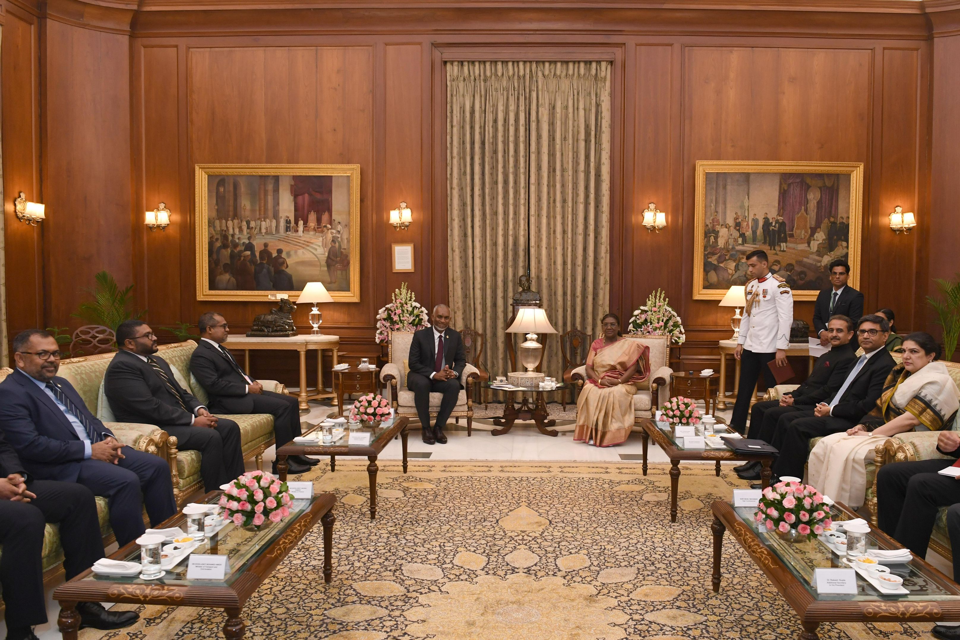 | Caption: | The President of India, Smt Droupadi Murmu received H.E. Dr Mohamed Muizzu, the President of the Republic of Maldives at Rashtrapati Bhavan on October 7, 2024. |
