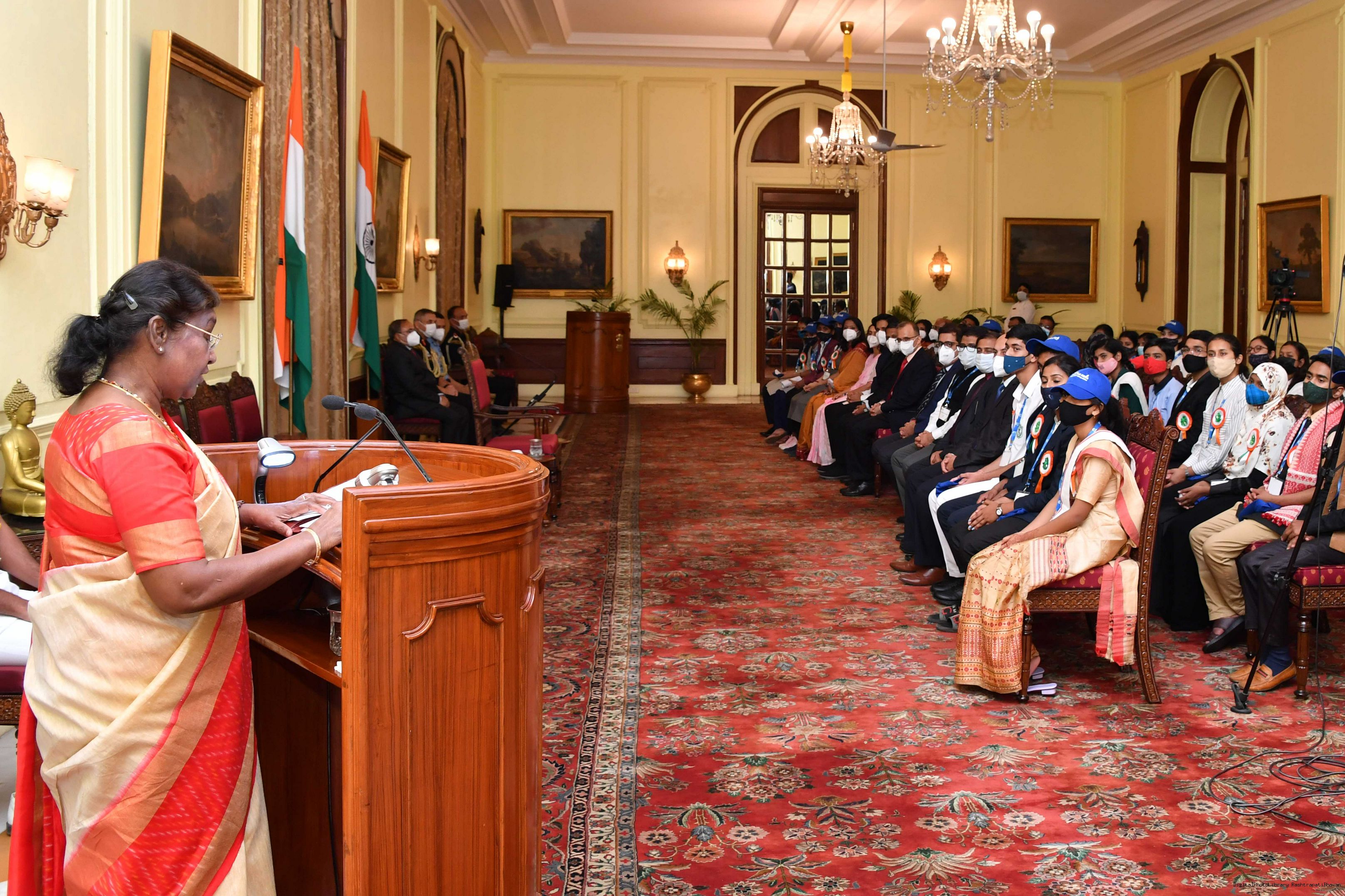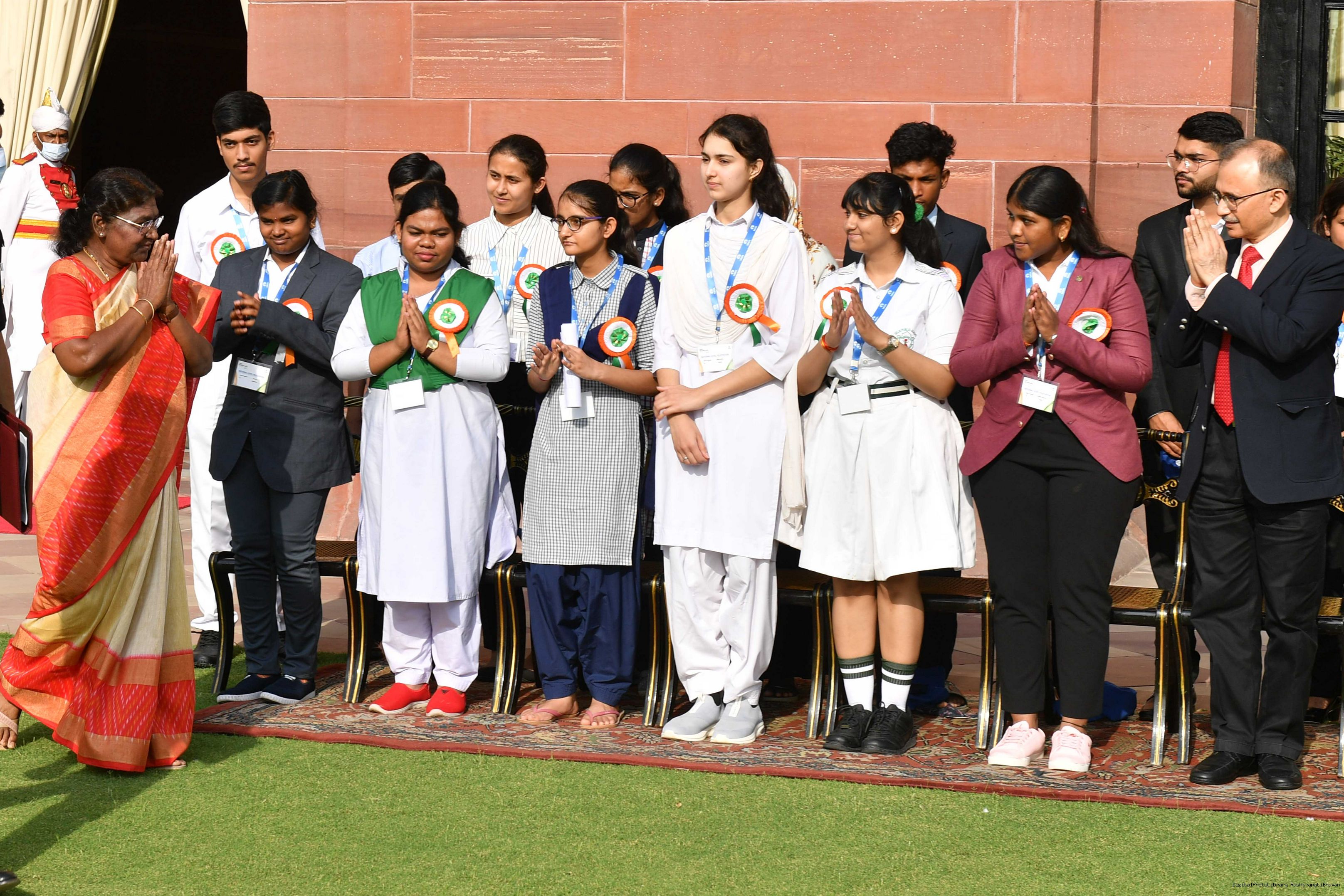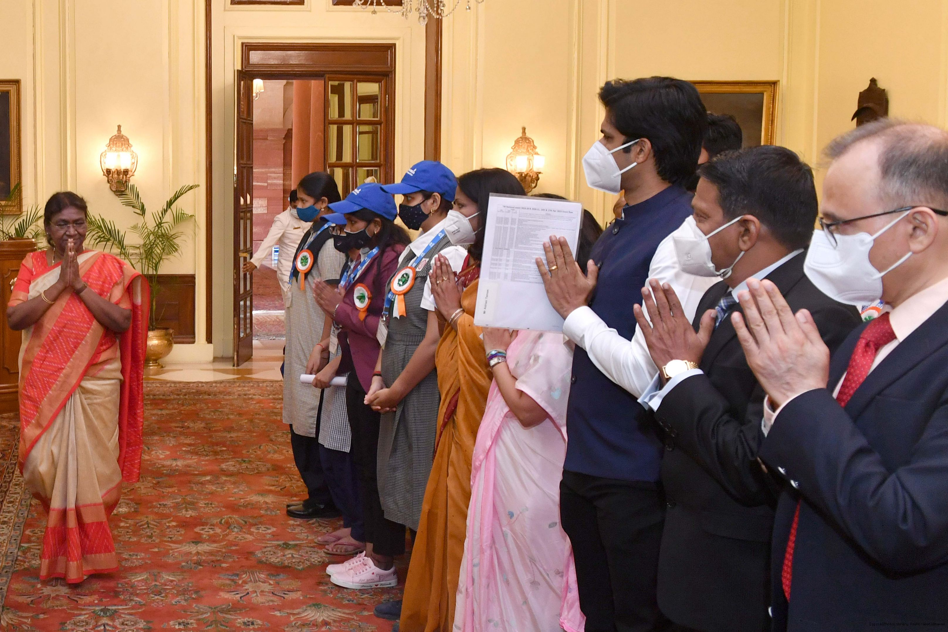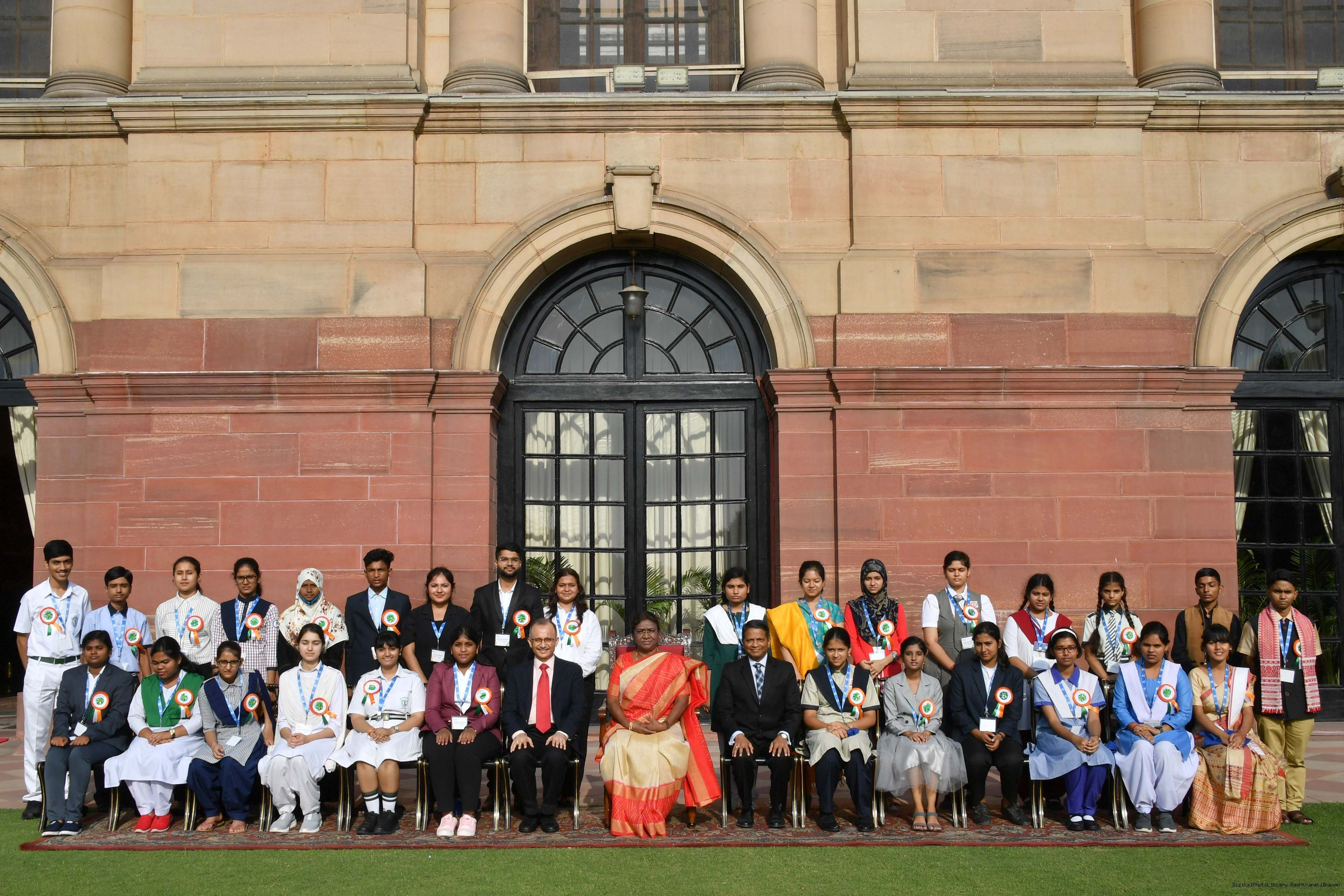 | Caption: | The Winners of the Tata Building India School Essay Competition 2019-20, called on the President of India, Smt Droupadi Murmu at Rashtrapati Bhavan on April 17, 2023. |