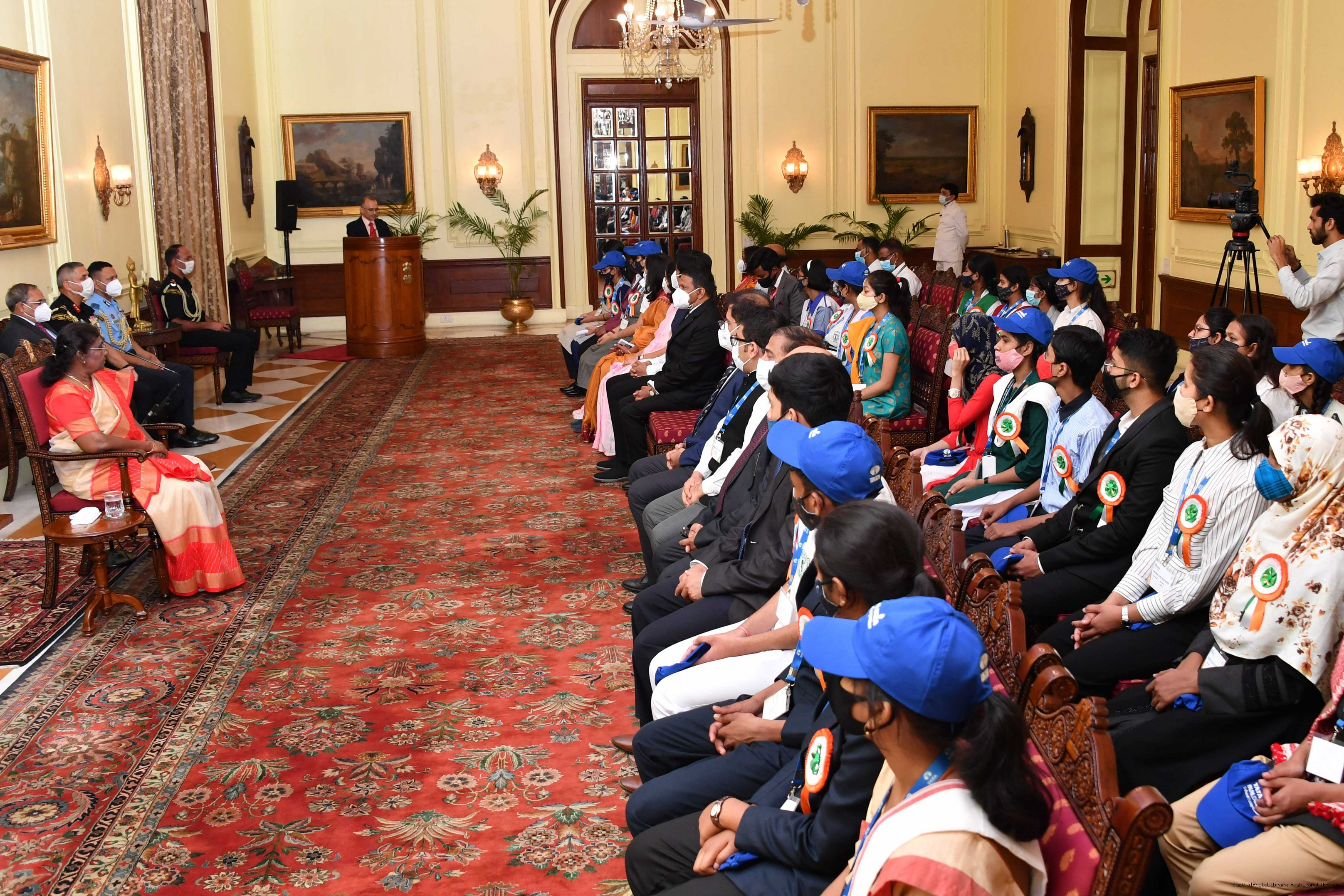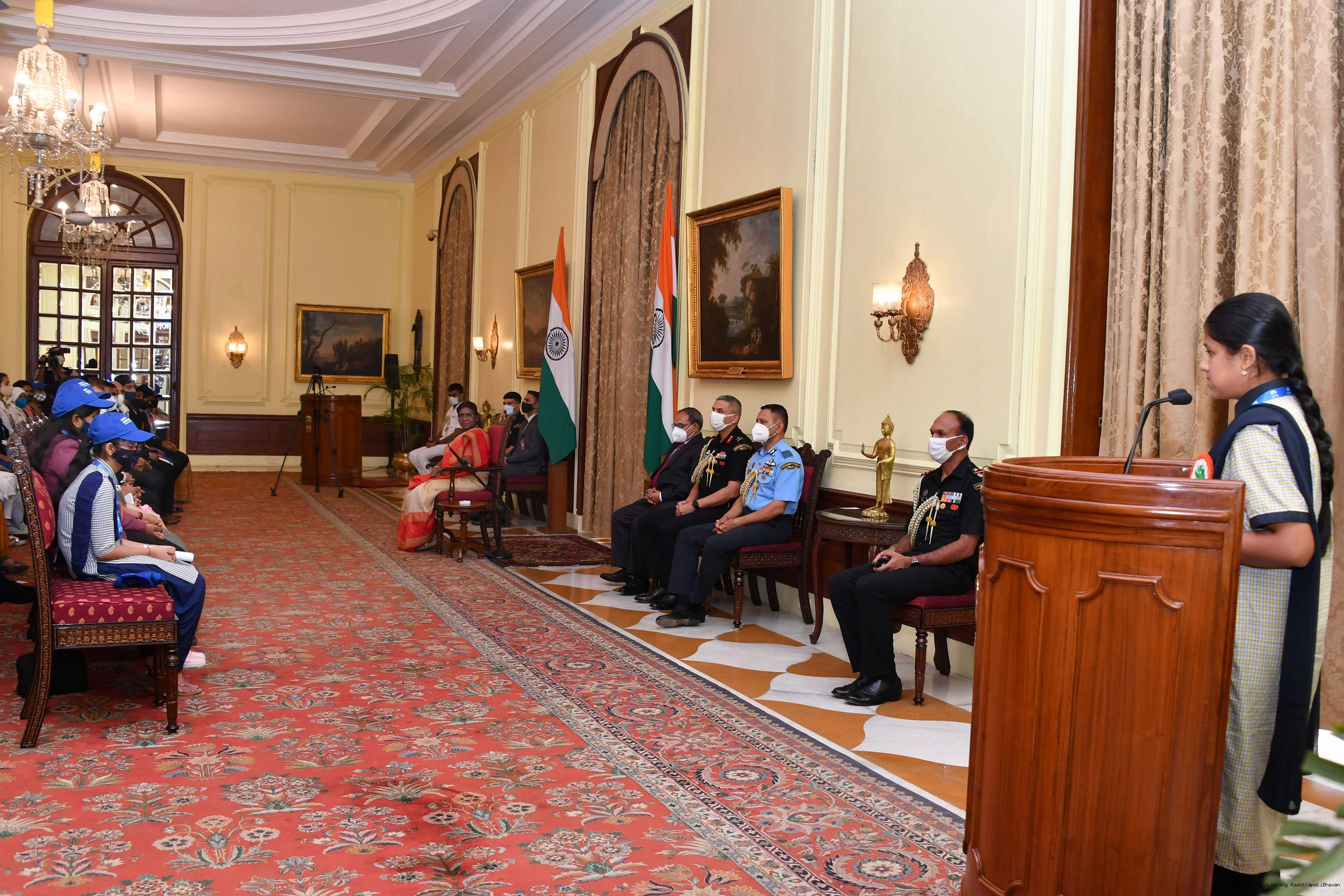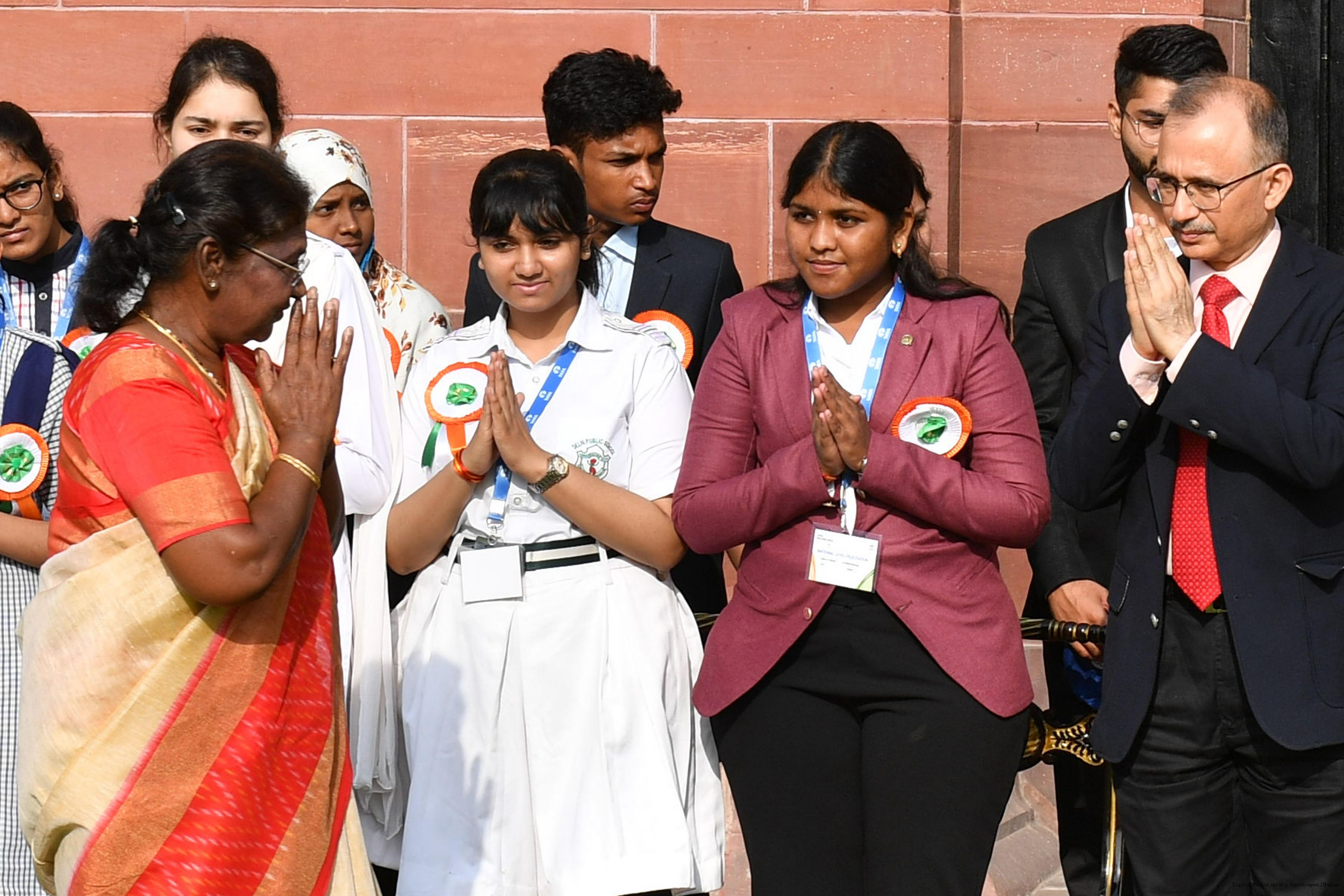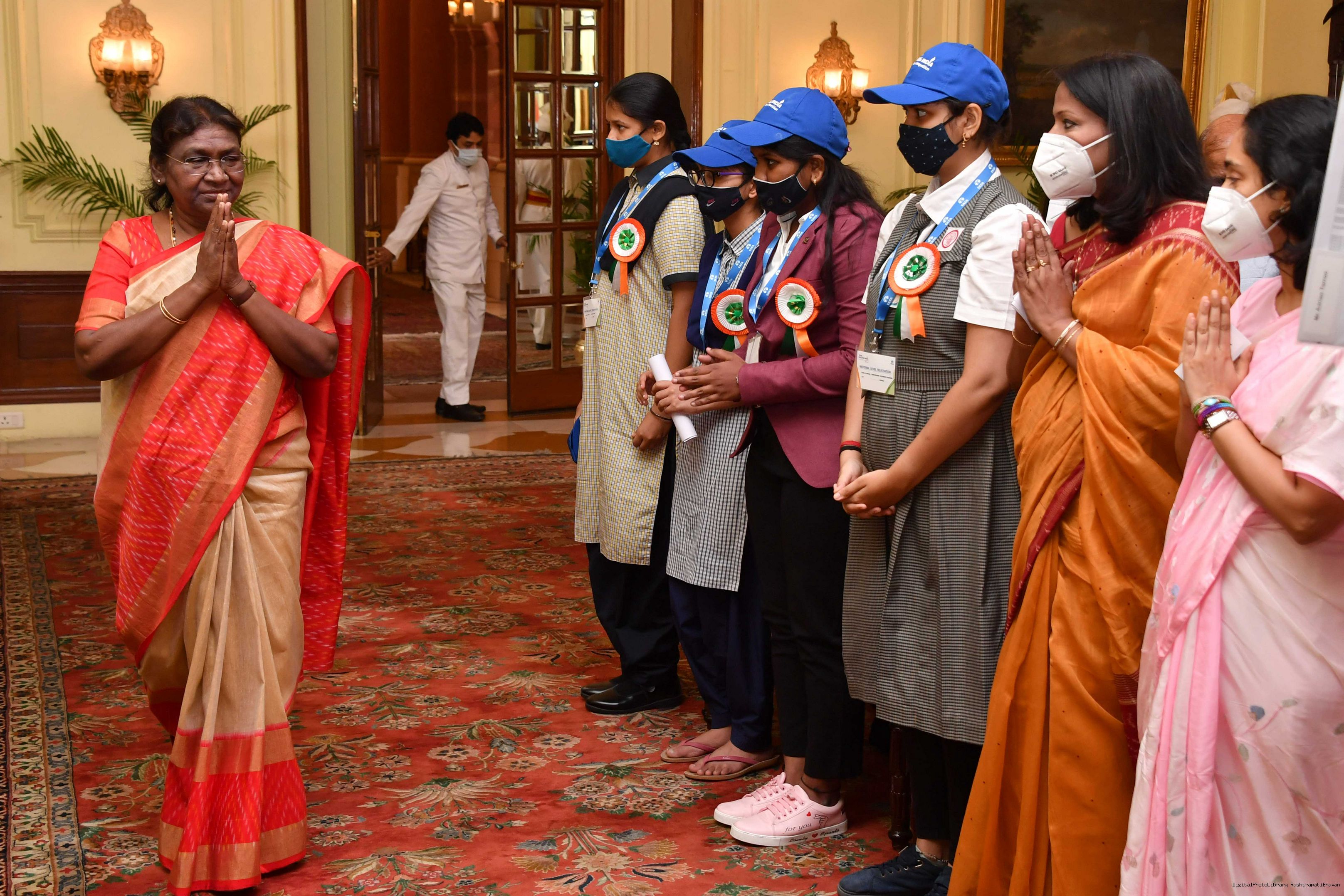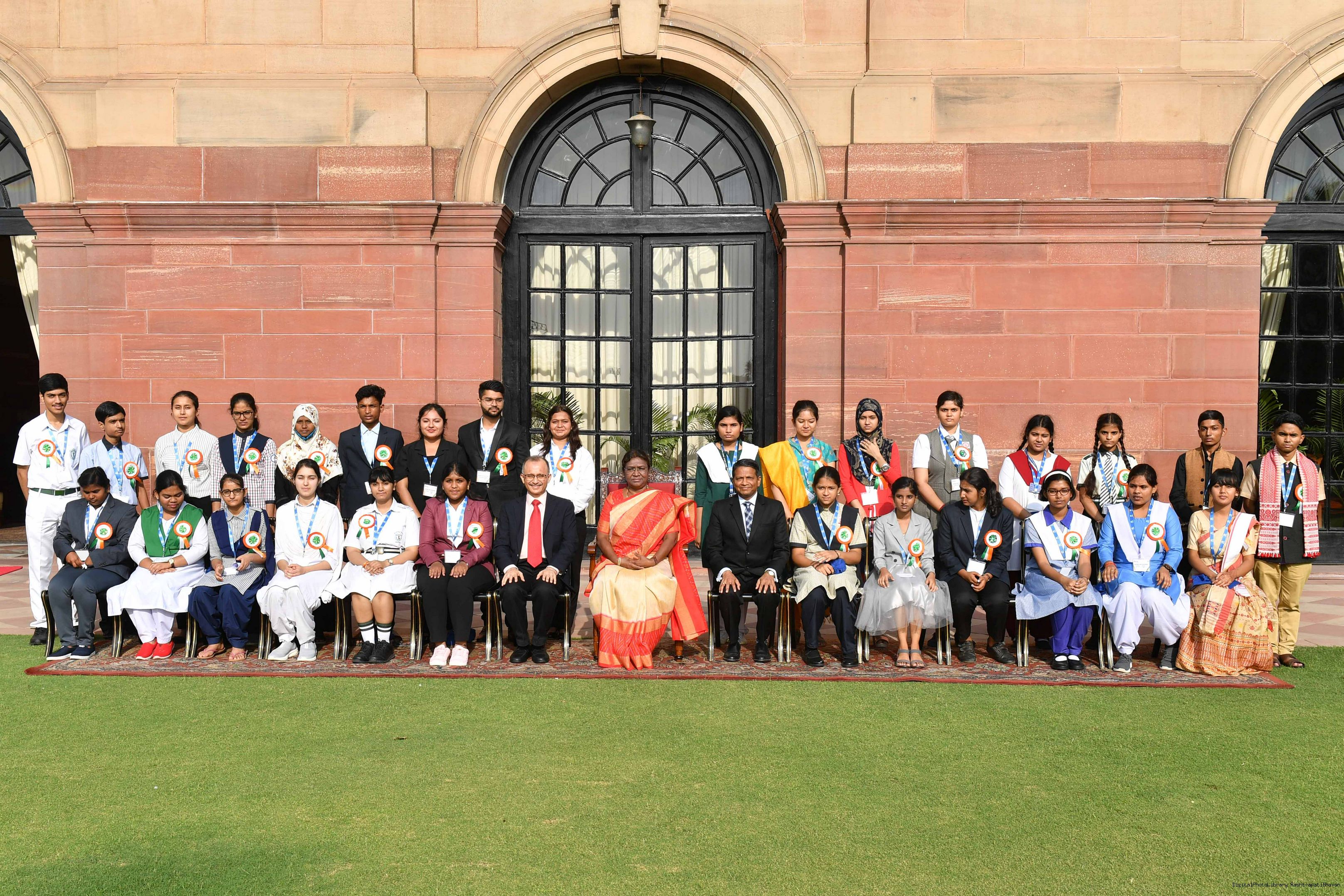 | Caption: | The Winners of the Tata Building India School Essay Competition 2019-20, called on the President of India, Smt Droupadi Murmu at Rashtrapati Bhavan on April 17, 2023. |