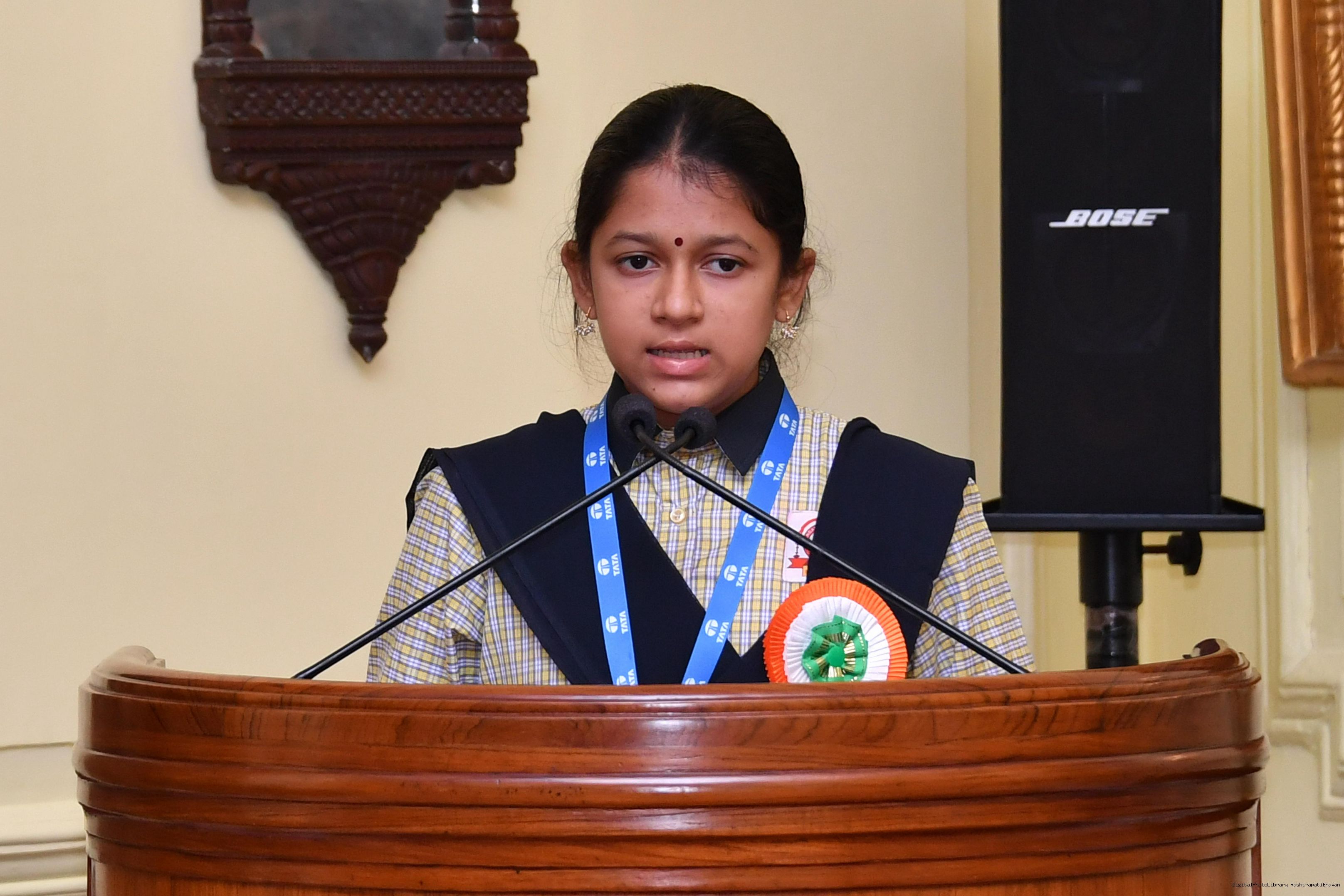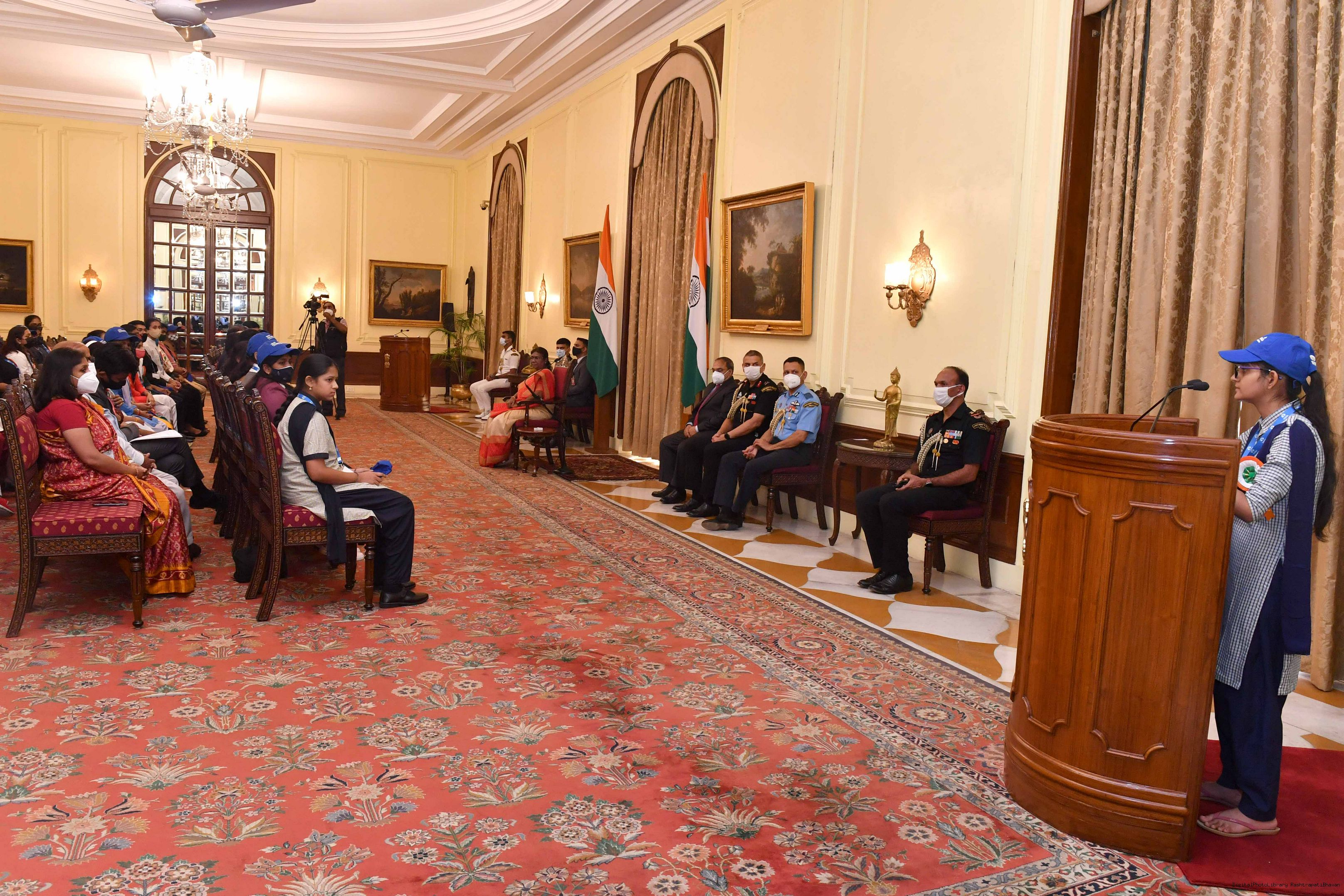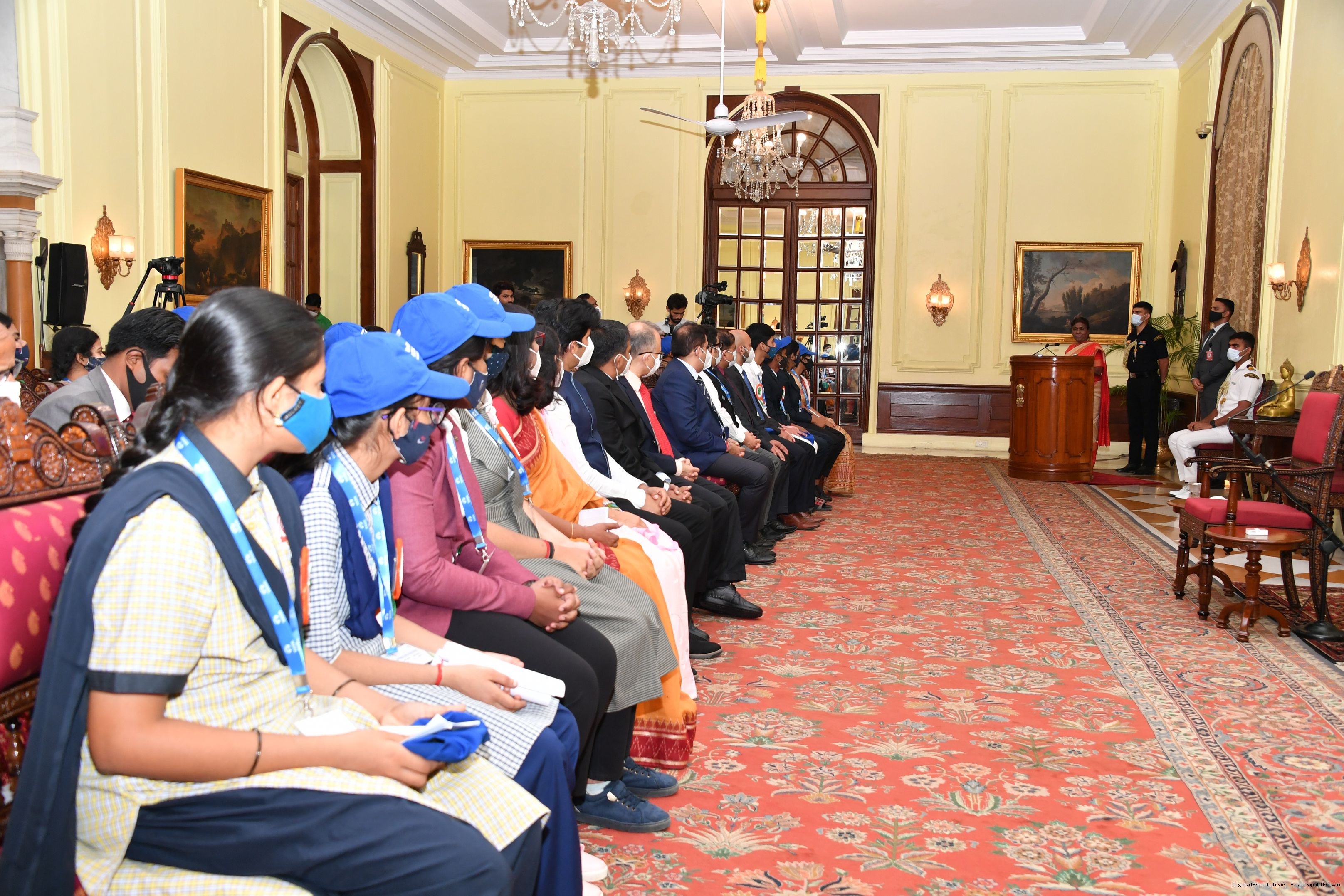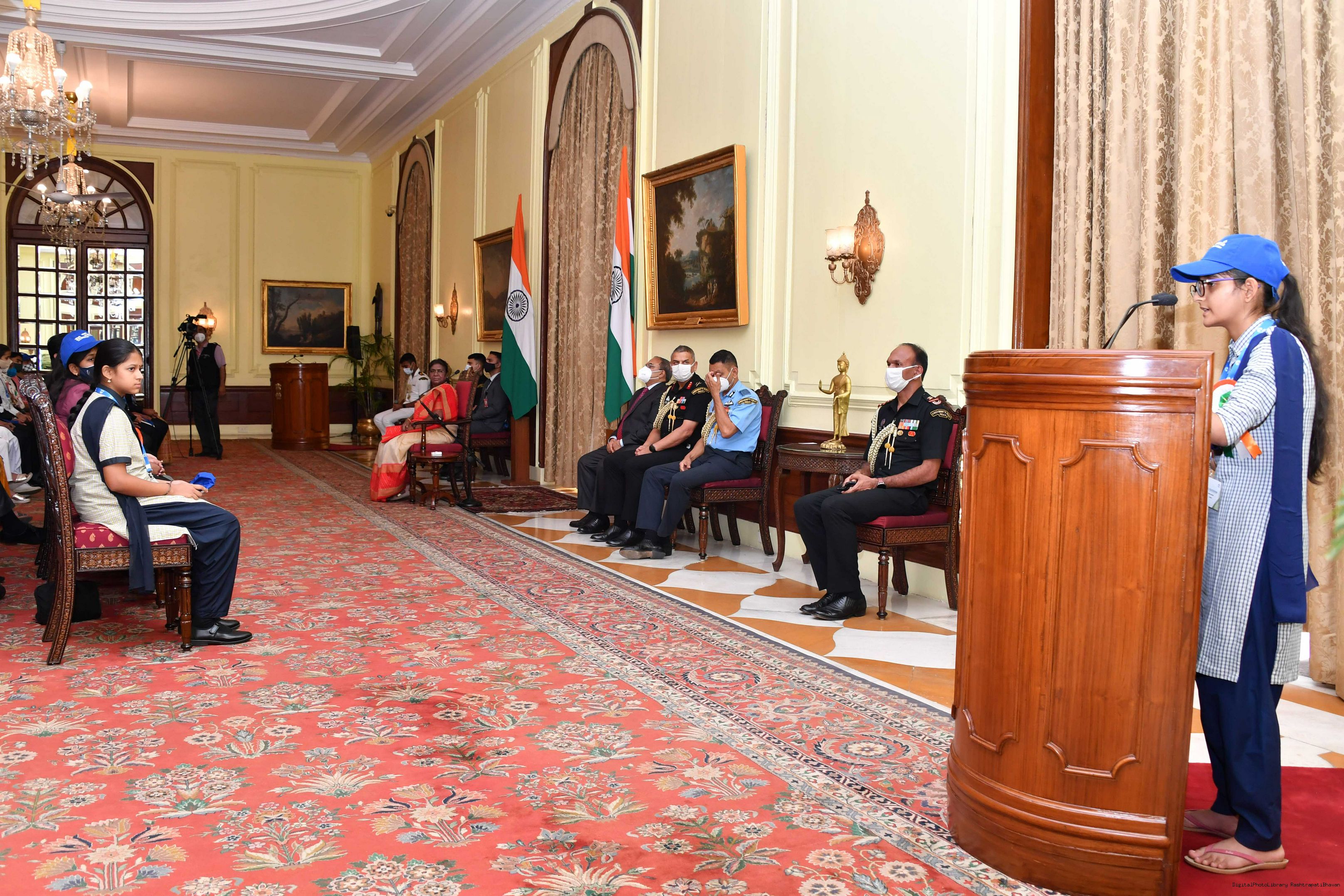 | Caption: | The Winners of the Tata Building India School Essay Competition 2019-20, called on the President of India, Smt Droupadi Murmu at Rashtrapati Bhavan on April 17, 2023. |