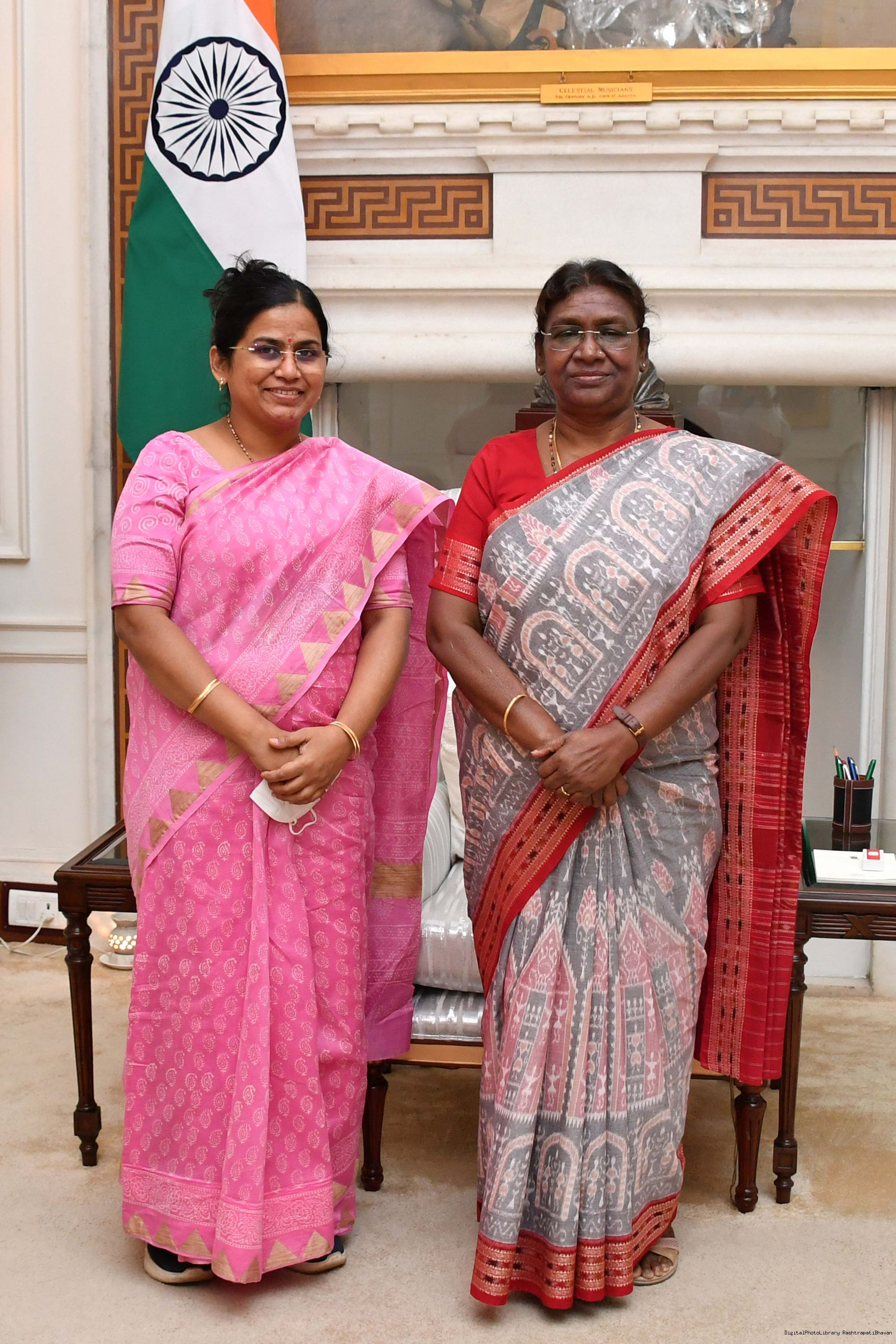| Caption: | Dr. Vijaya Lakshmi Mohanty, Director, Human Resource Development Centre (HRDC), Sri Sri University, Cuttack, Odisha meeting with the President of India Smt. Droupadi Murmu at Rashtrapati Bhavan on April 17, 2023. |