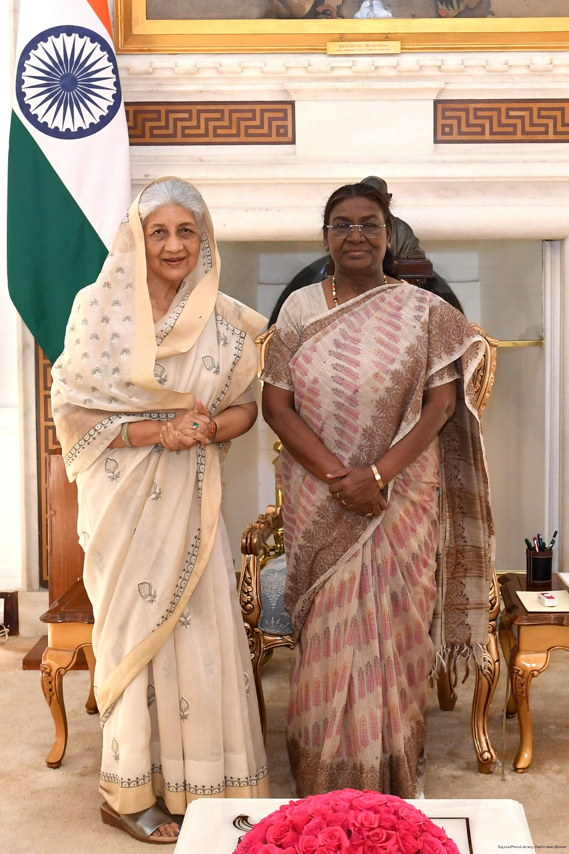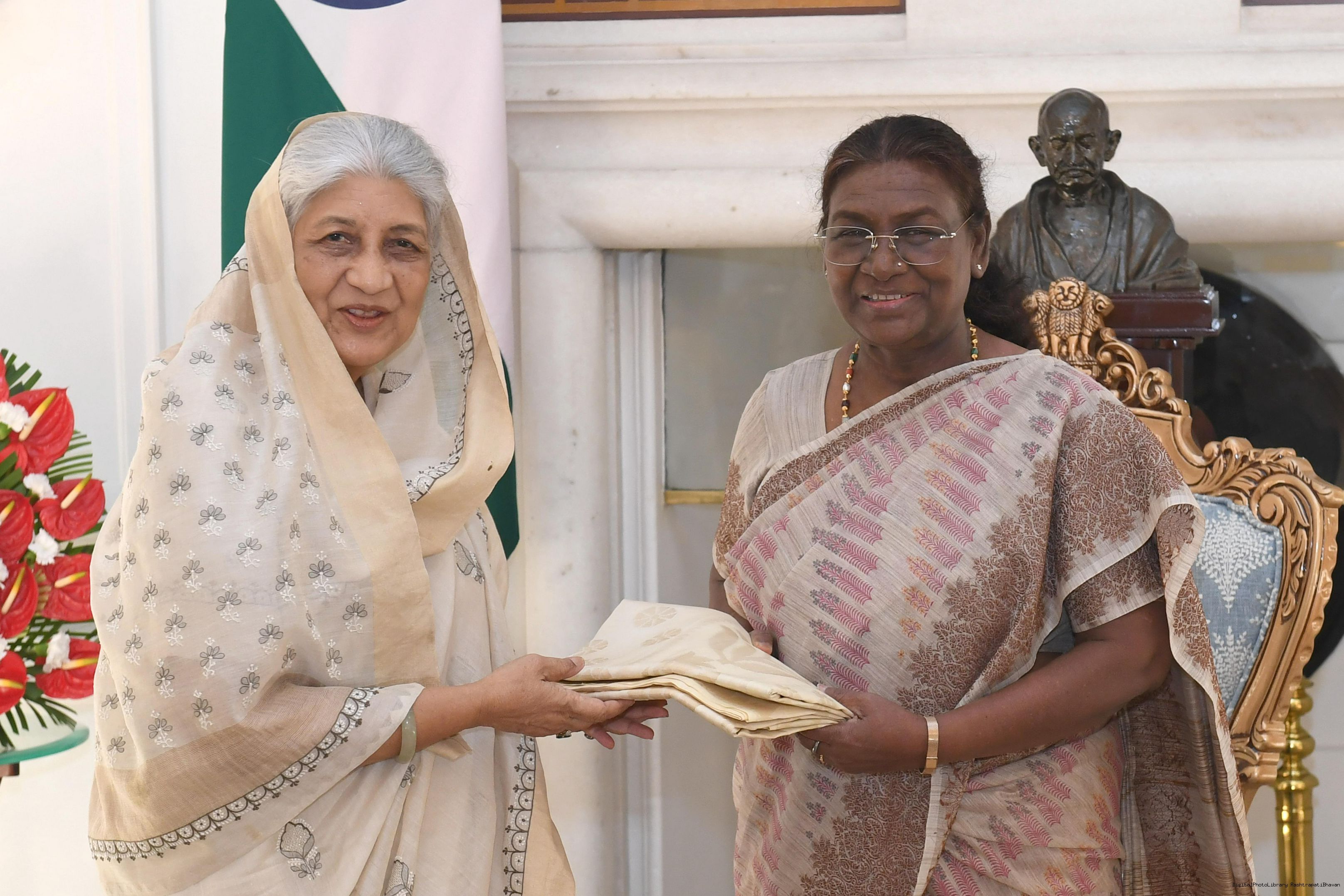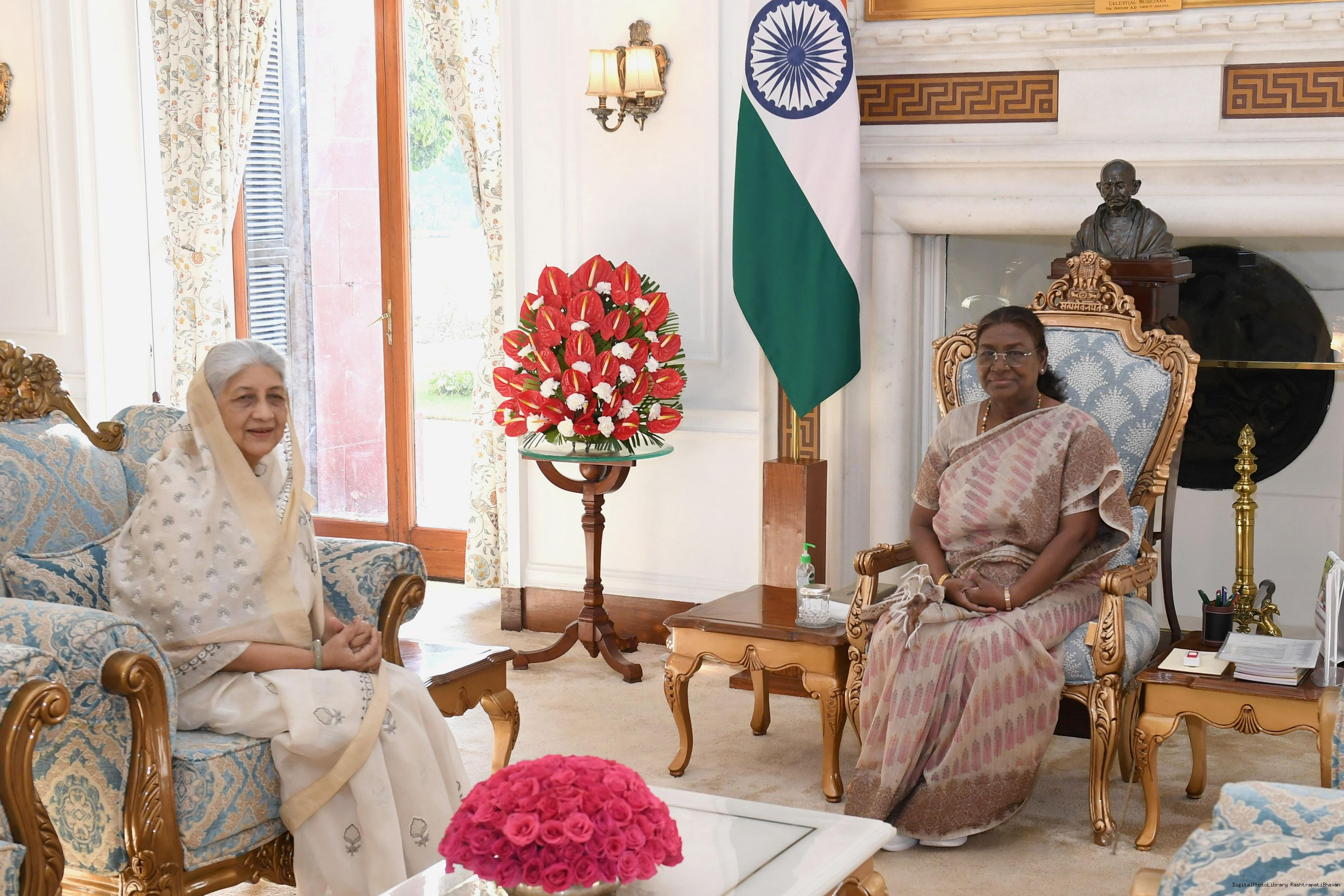 | Caption: | Smt Shubhanginiraje Gaekwad, Chancellor, The Maharaja Sayajirao University of Baroda, Vadodara, Gujarat meeting with the President of India Smt. Droupadi Murmu at Rashtrapati Bhavan on October 10, 2024. |