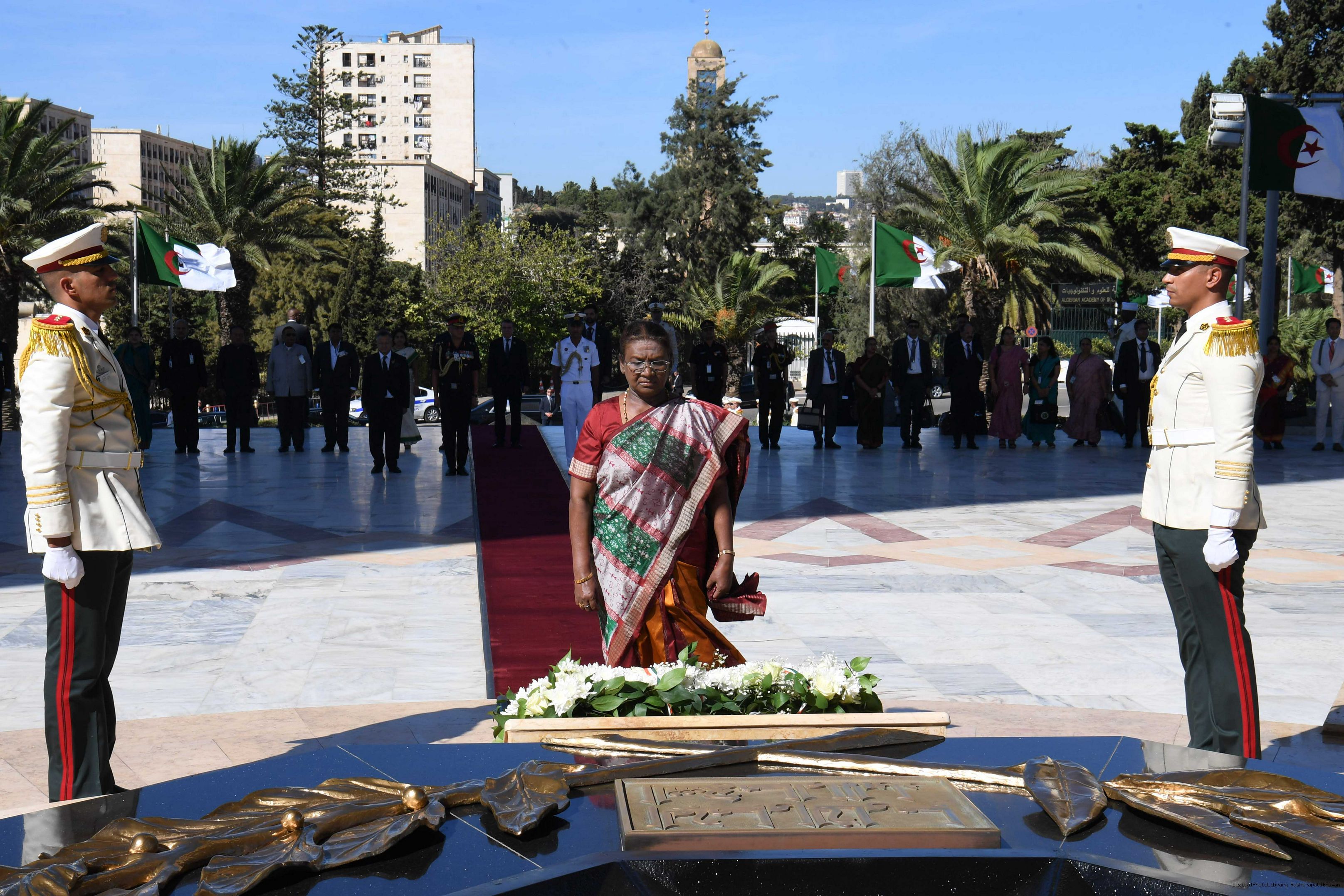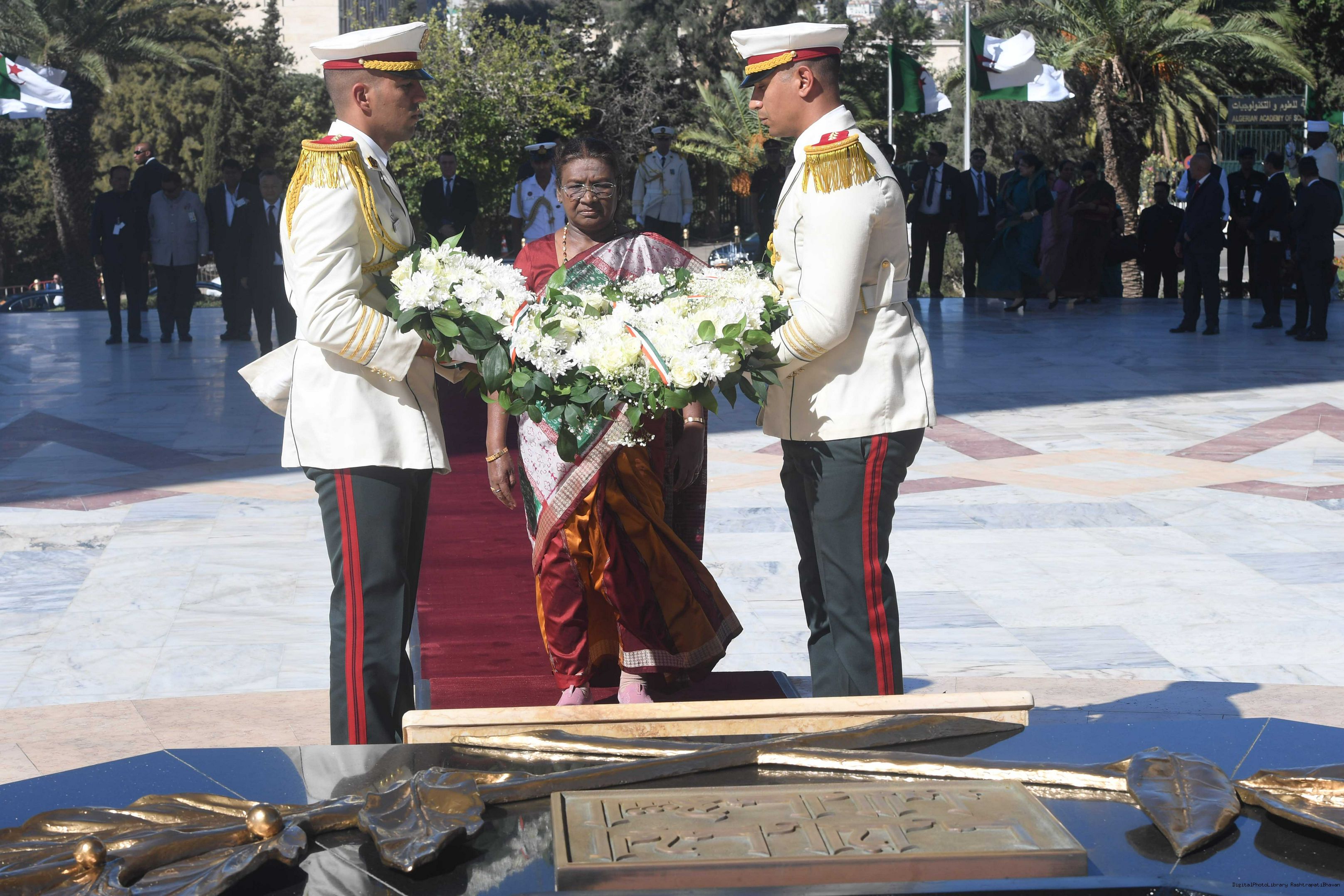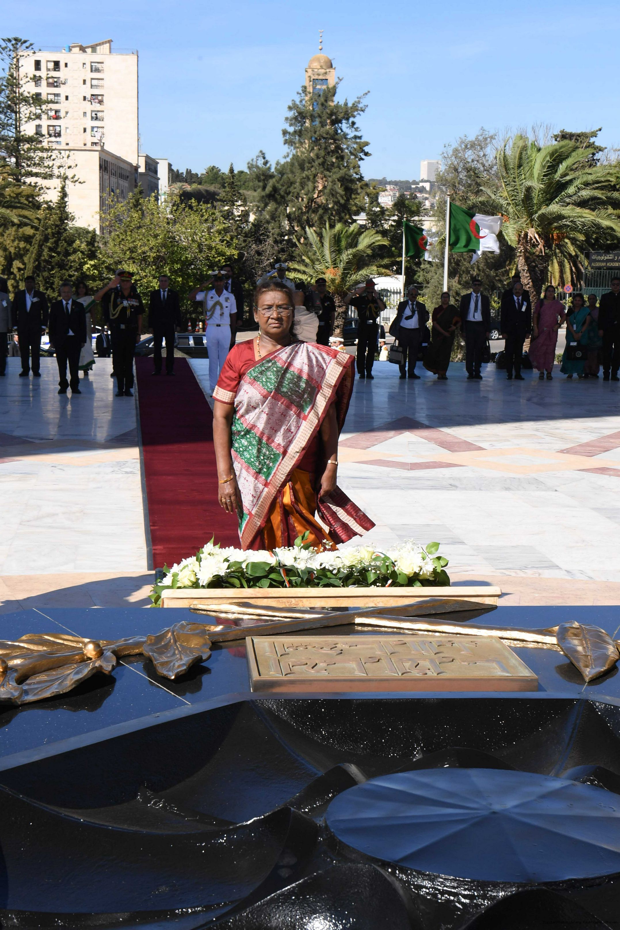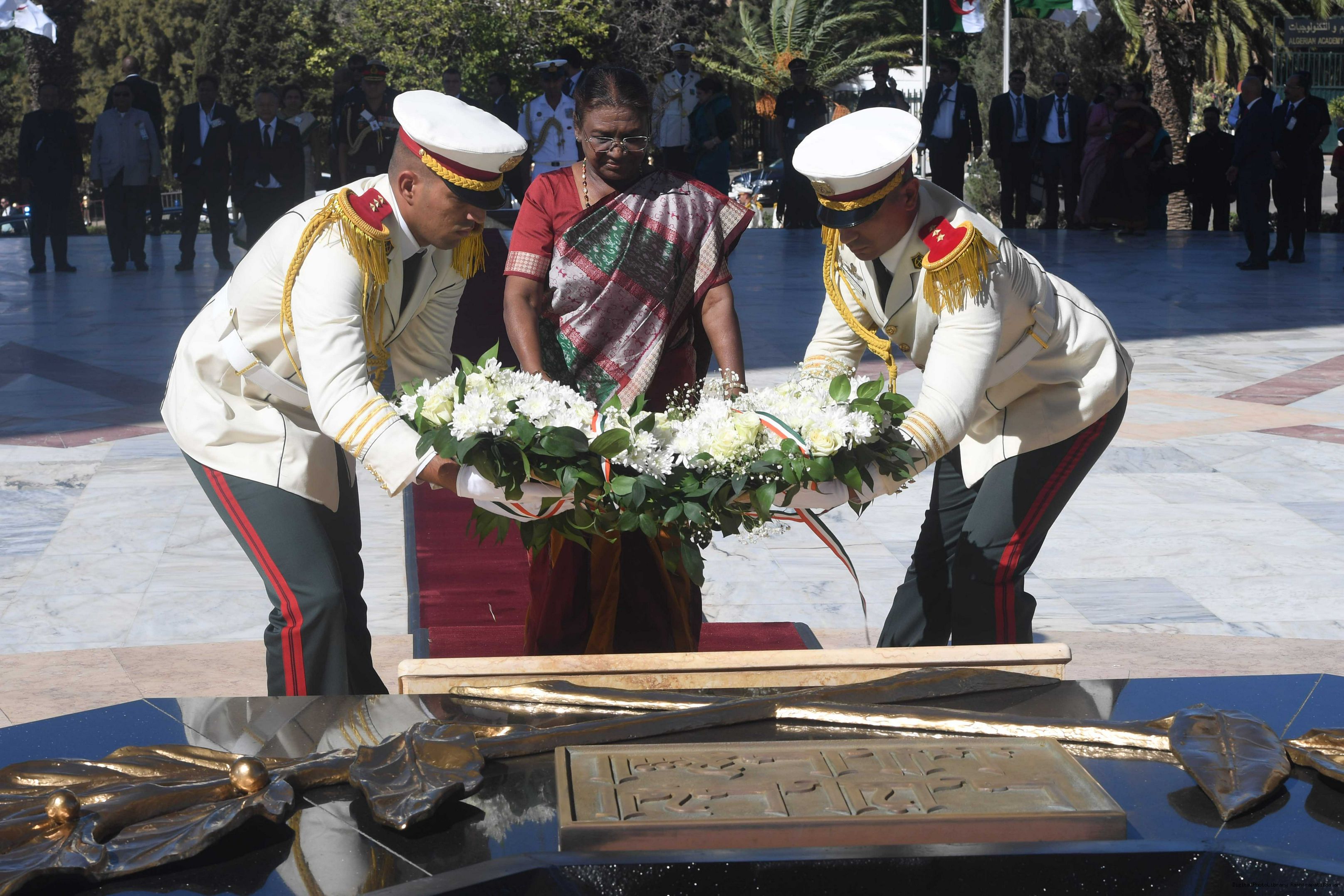 | Caption: | The President of India Smt. Droupadi Murmu laid a wreath at the Maqam Echahid Memorial in Algiers and paid tribute to the soldiers on October 14, 2024. |