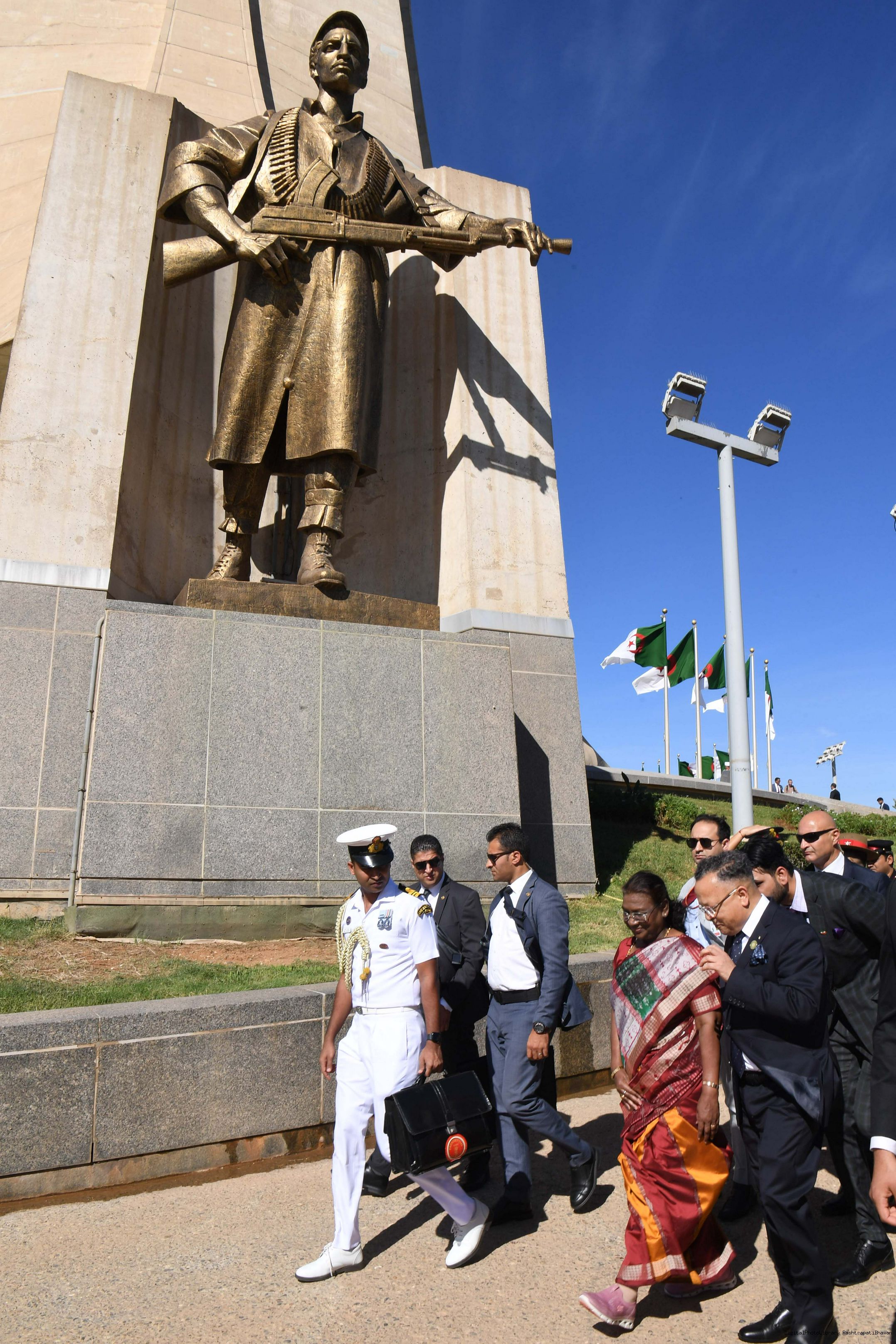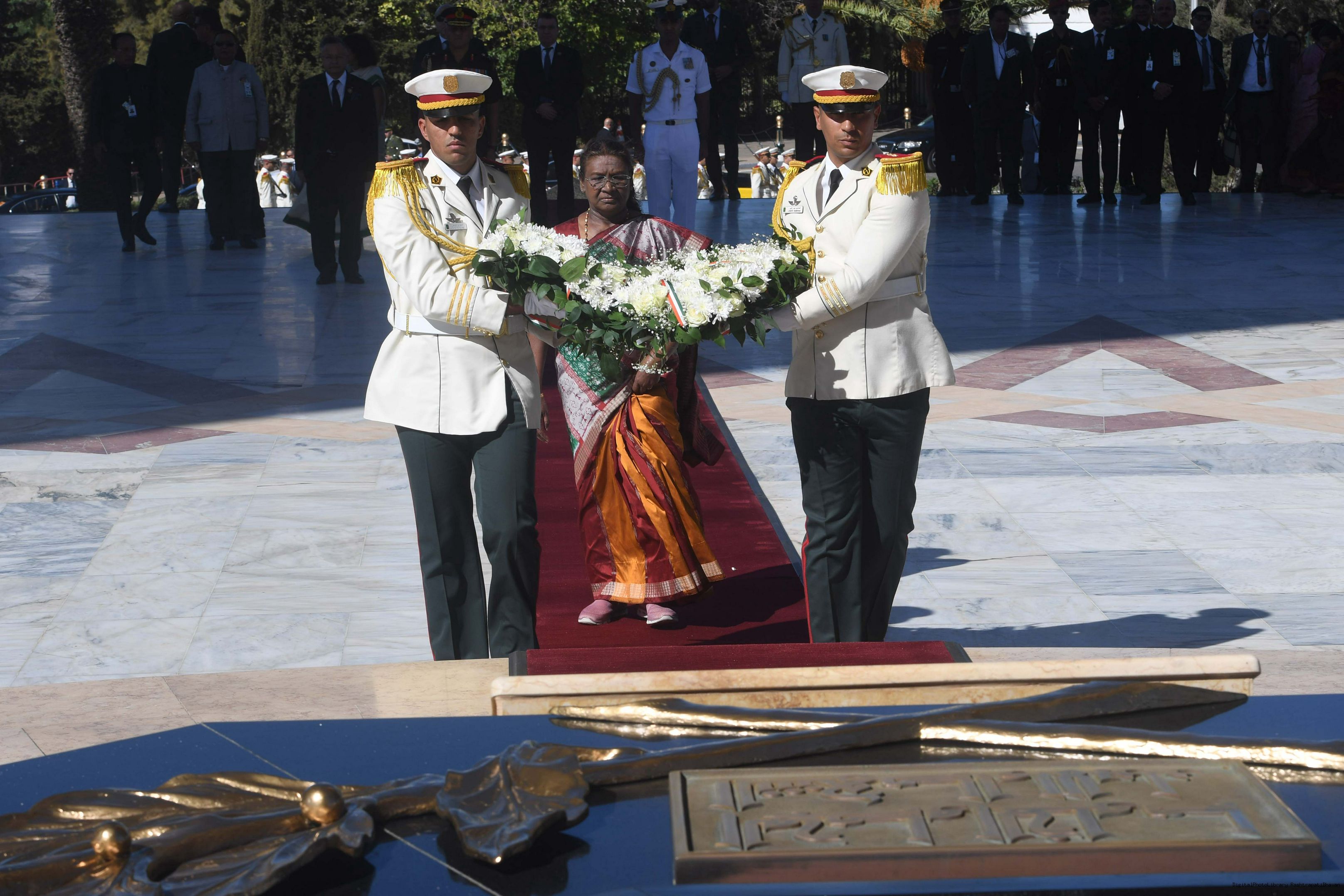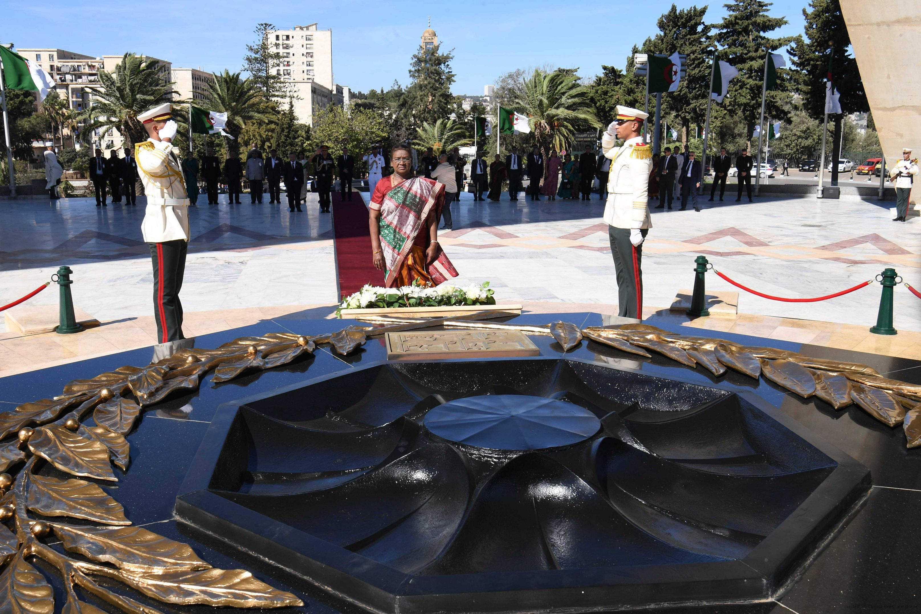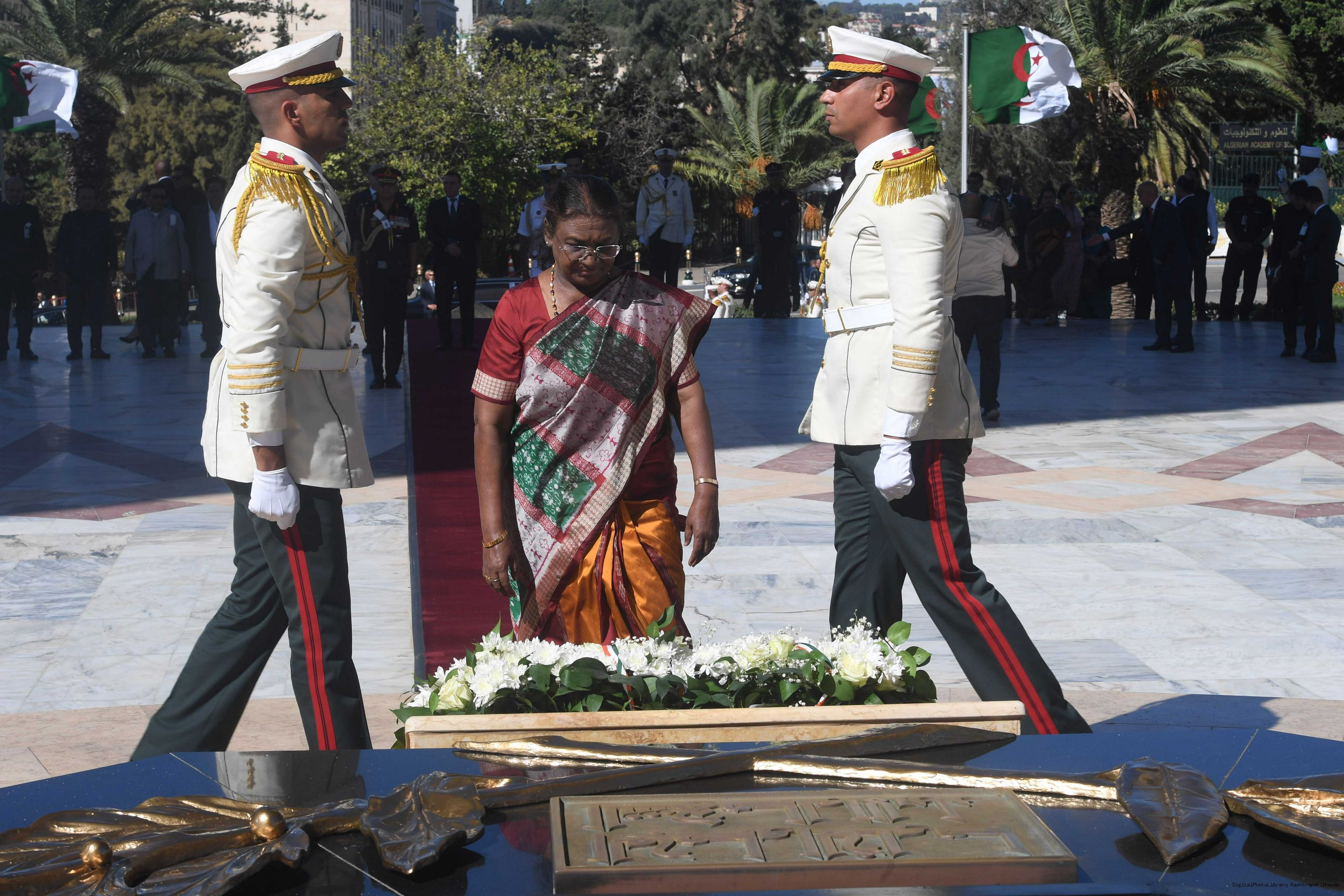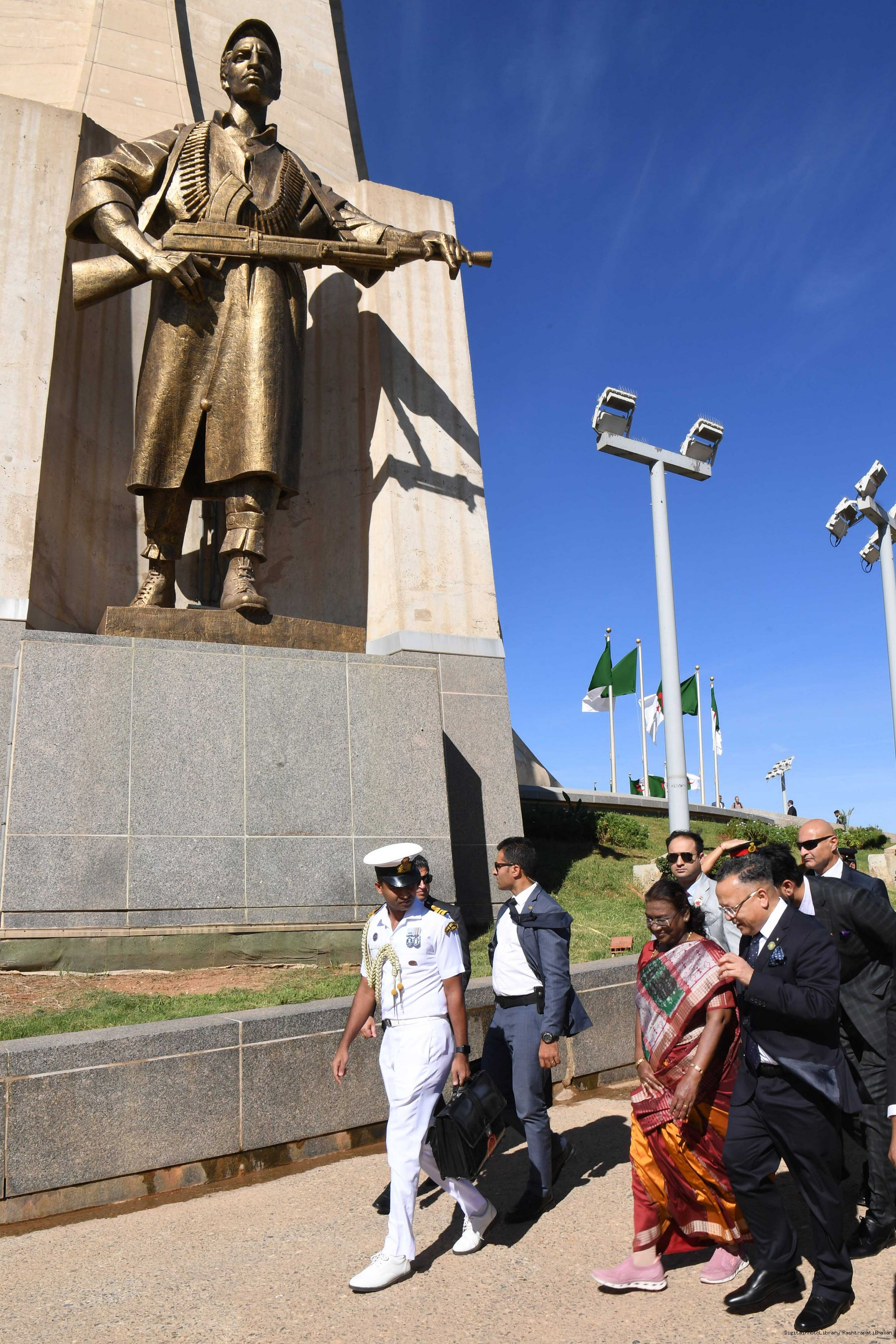 | Caption: | The President of India Smt. Droupadi Murmu laid a wreath at the Maqam Echahid Memorial in Algiers and paid tribute to the soldiers on October 14, 2024. |
