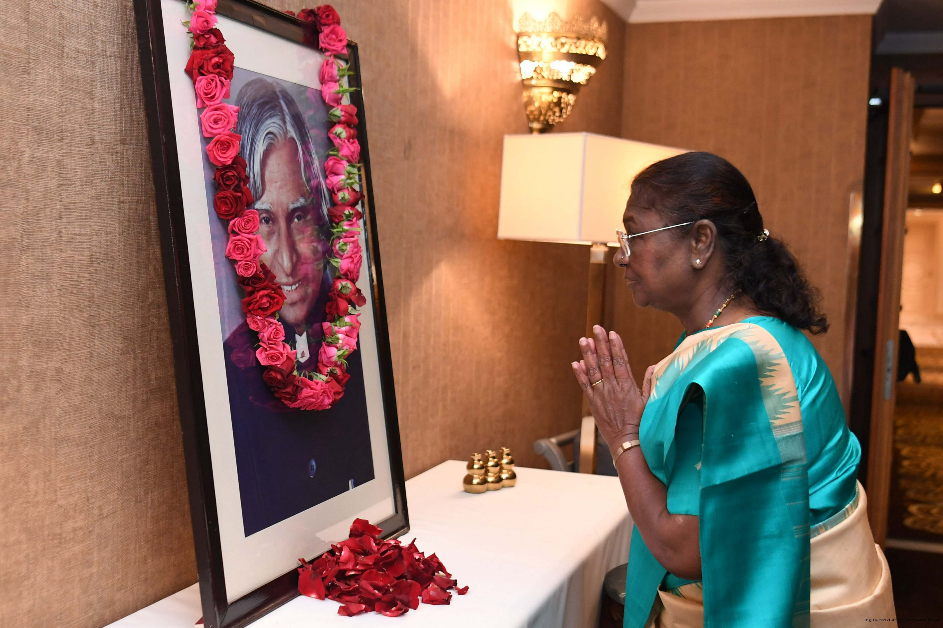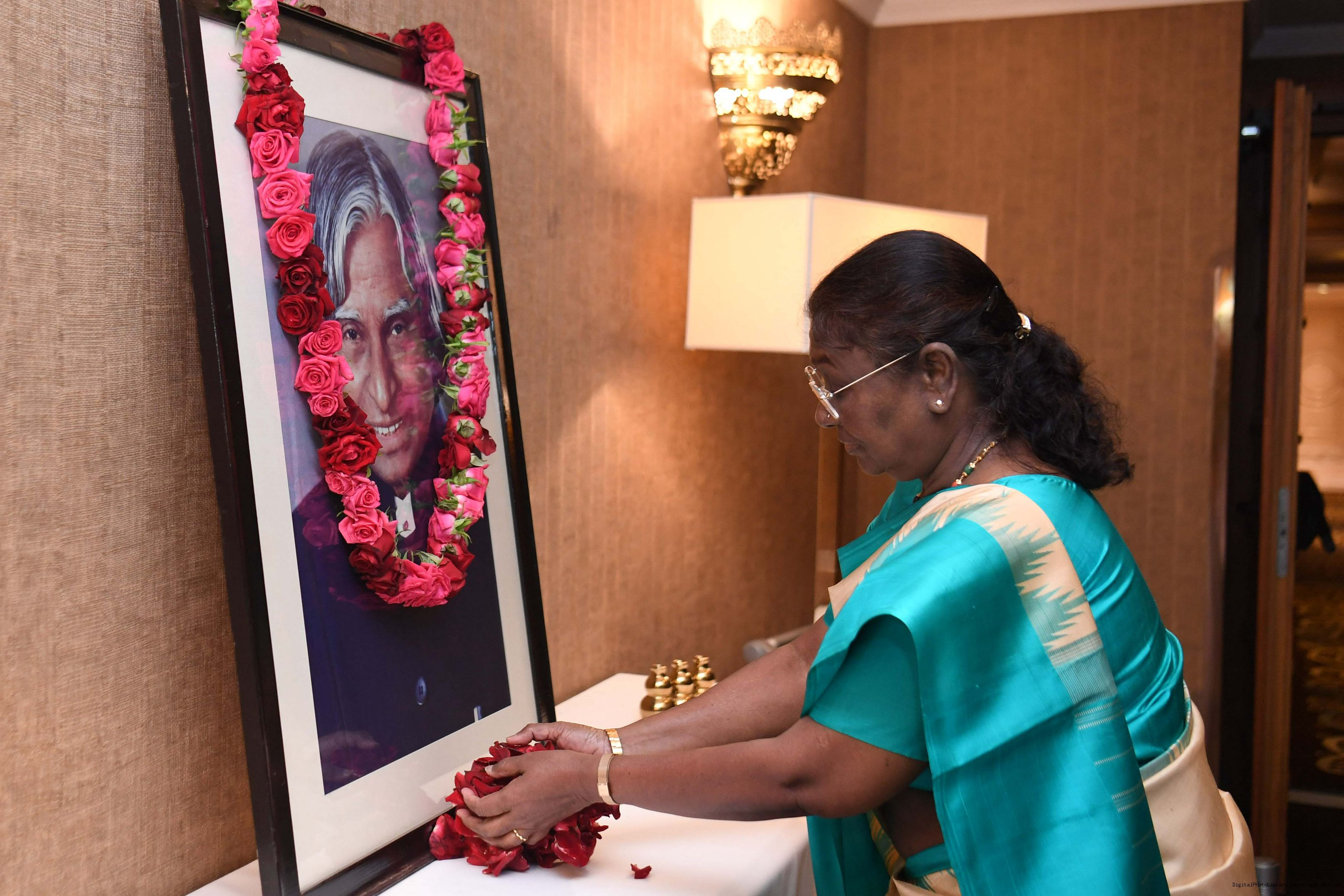 | Caption: | The President of India, Smt Droupadi Murmu paid floral tributes to Dr APJ Abdul Kalam, former President of India on his birth anniversary at Algiers, Algeria on October 15, 2024. |