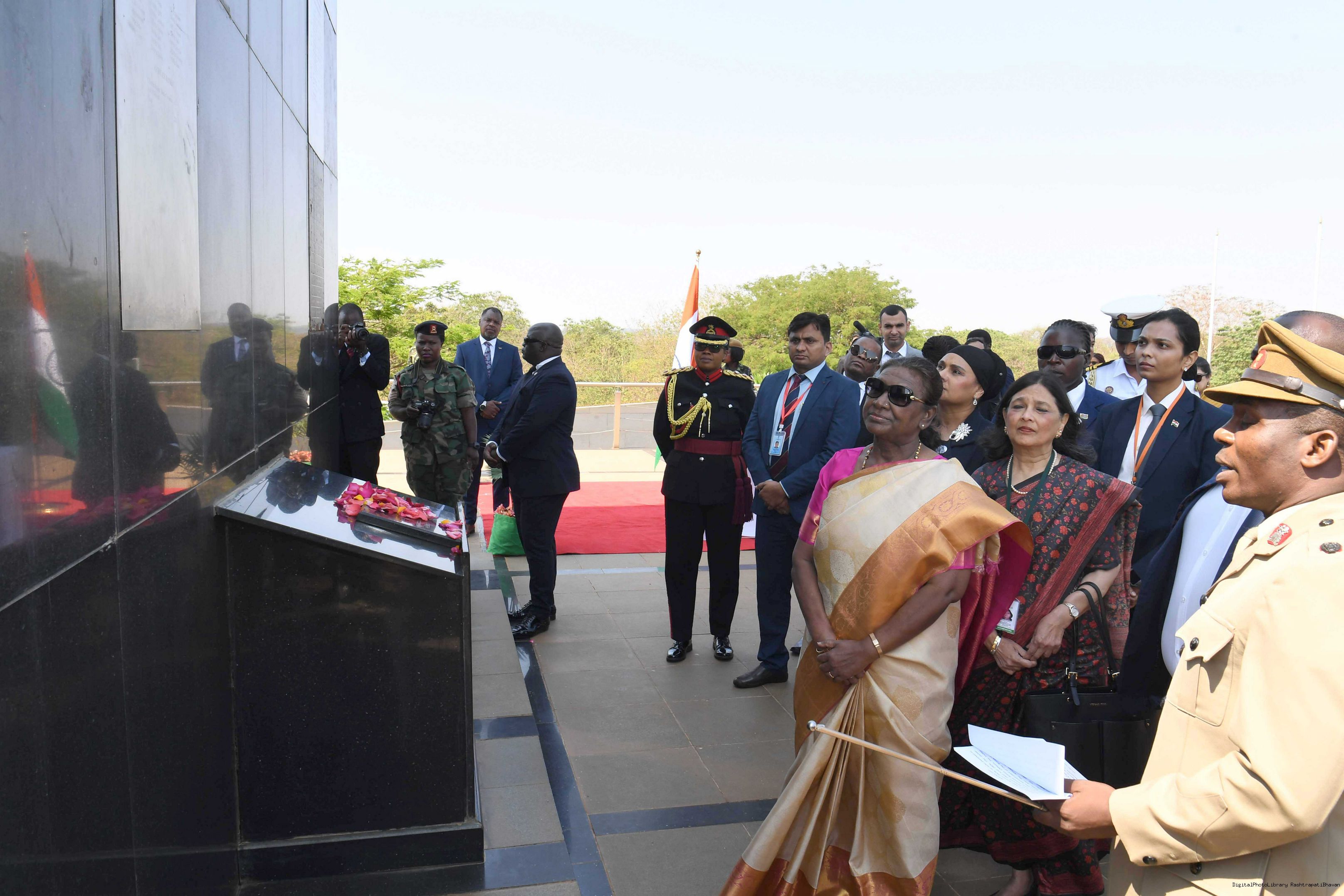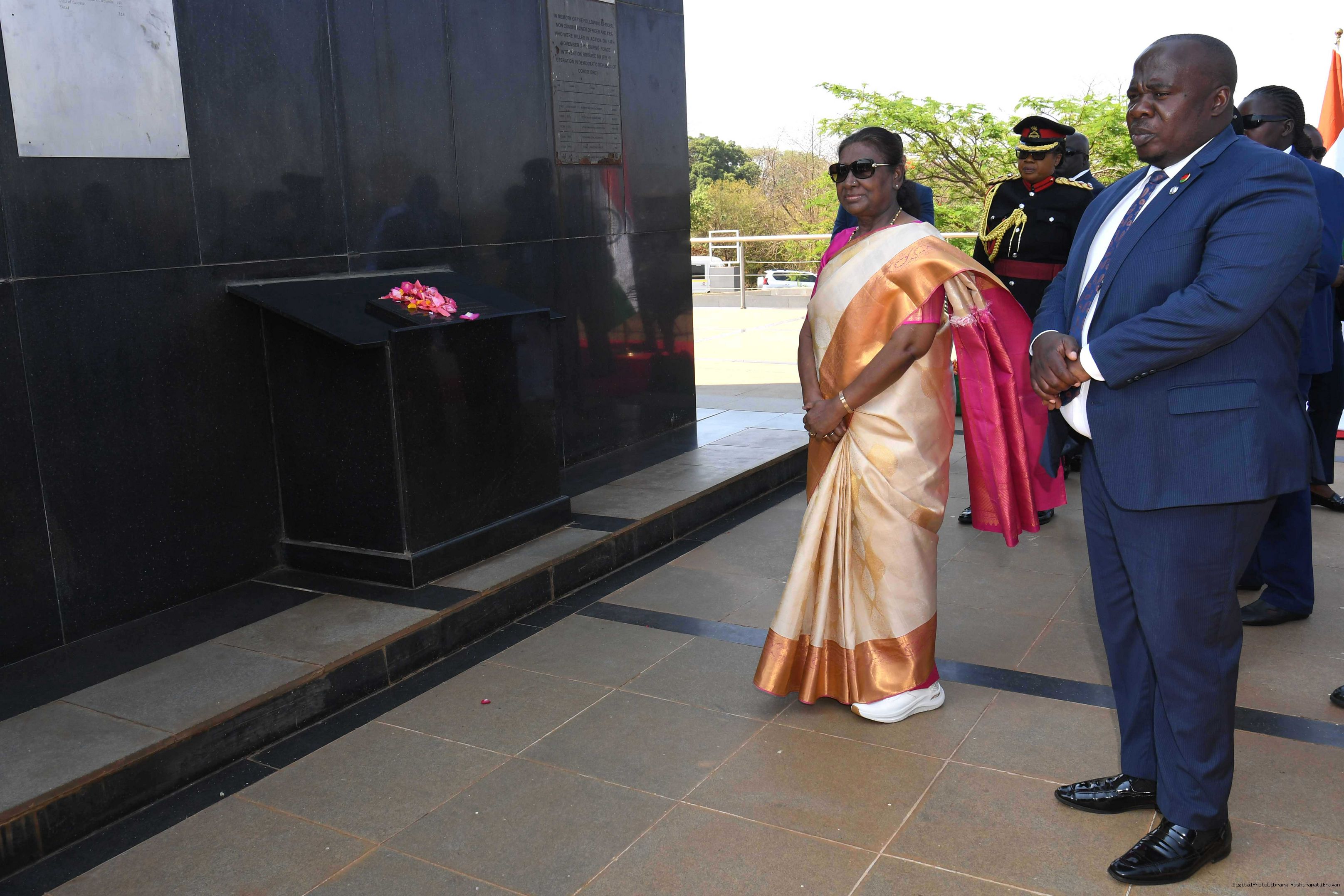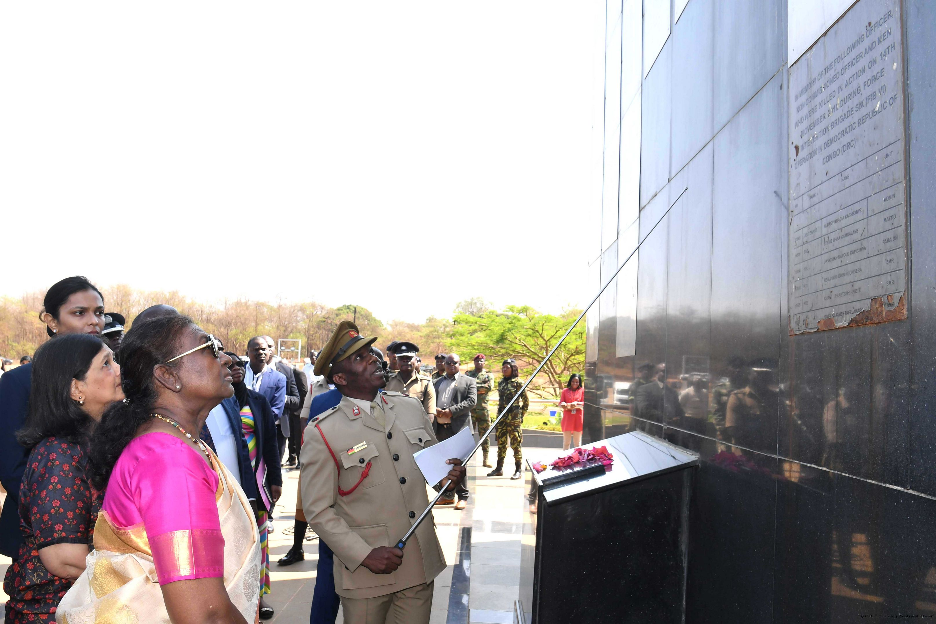 | Caption: | The President of India Smt. Droupadi Murmu Wreath Laying Followed by Signing of Visitor's Book at National War Memorial Malawi on October 18, 2024. |