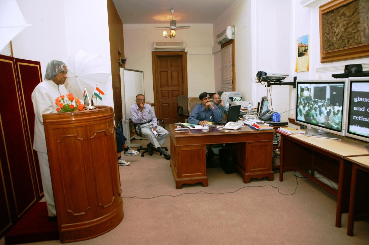 | Caption: | The President of India, Dr A P J Abdul Kalam addressing at the 52nd Tamilnadu State Ophthalmic Conference organized by the Arvind Eye Hospital at Tirunelveli (Through Video Conferencing) at the TI Room at Rashtrapati Bhavan in New Delhi on Aug 14, 2004 |