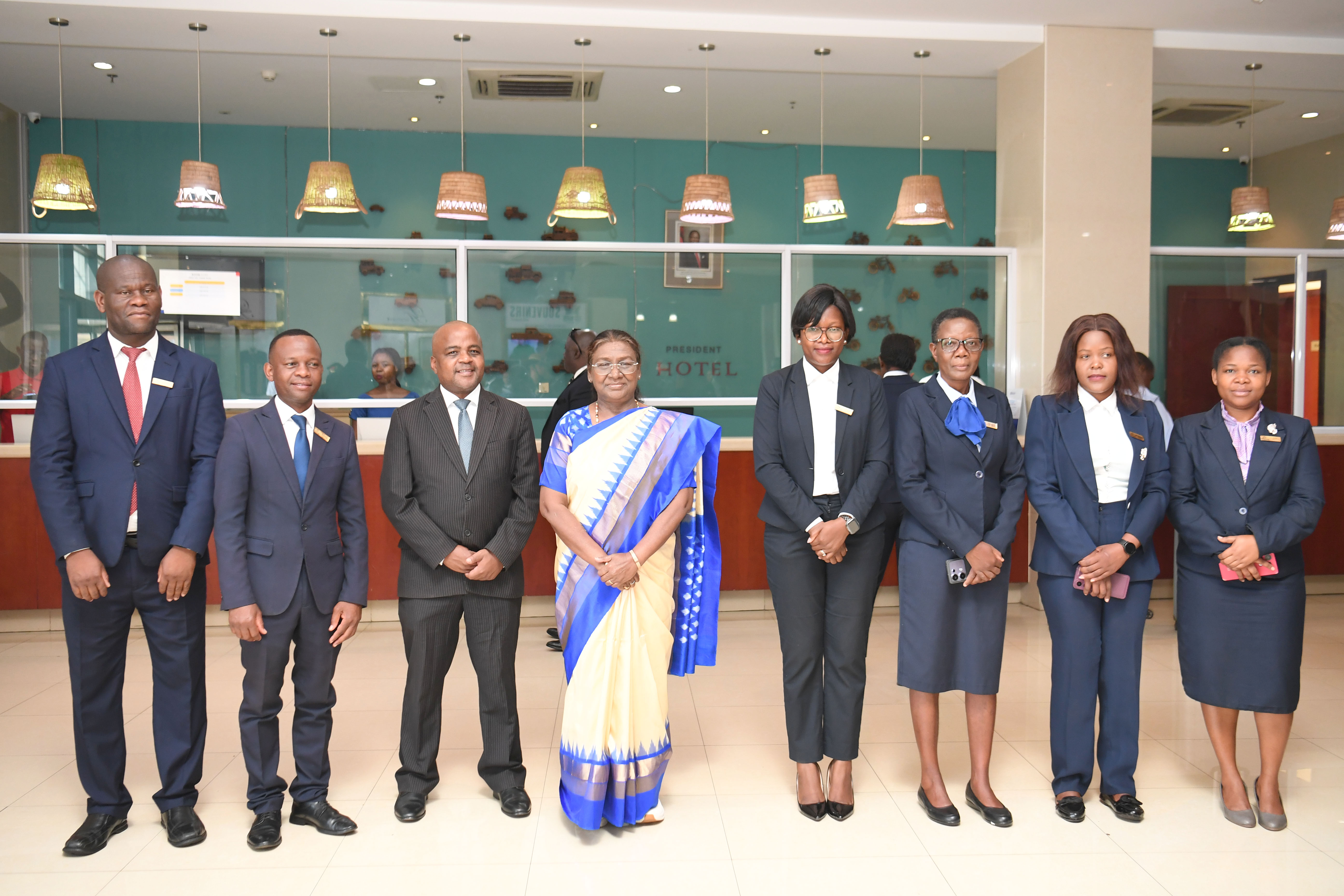 | Caption: | The President of India Smt. Droupadi Murmu posing a group photographs with MEA and Hotel Staffs at Hotel President, Malawi on October 19, 2024. |