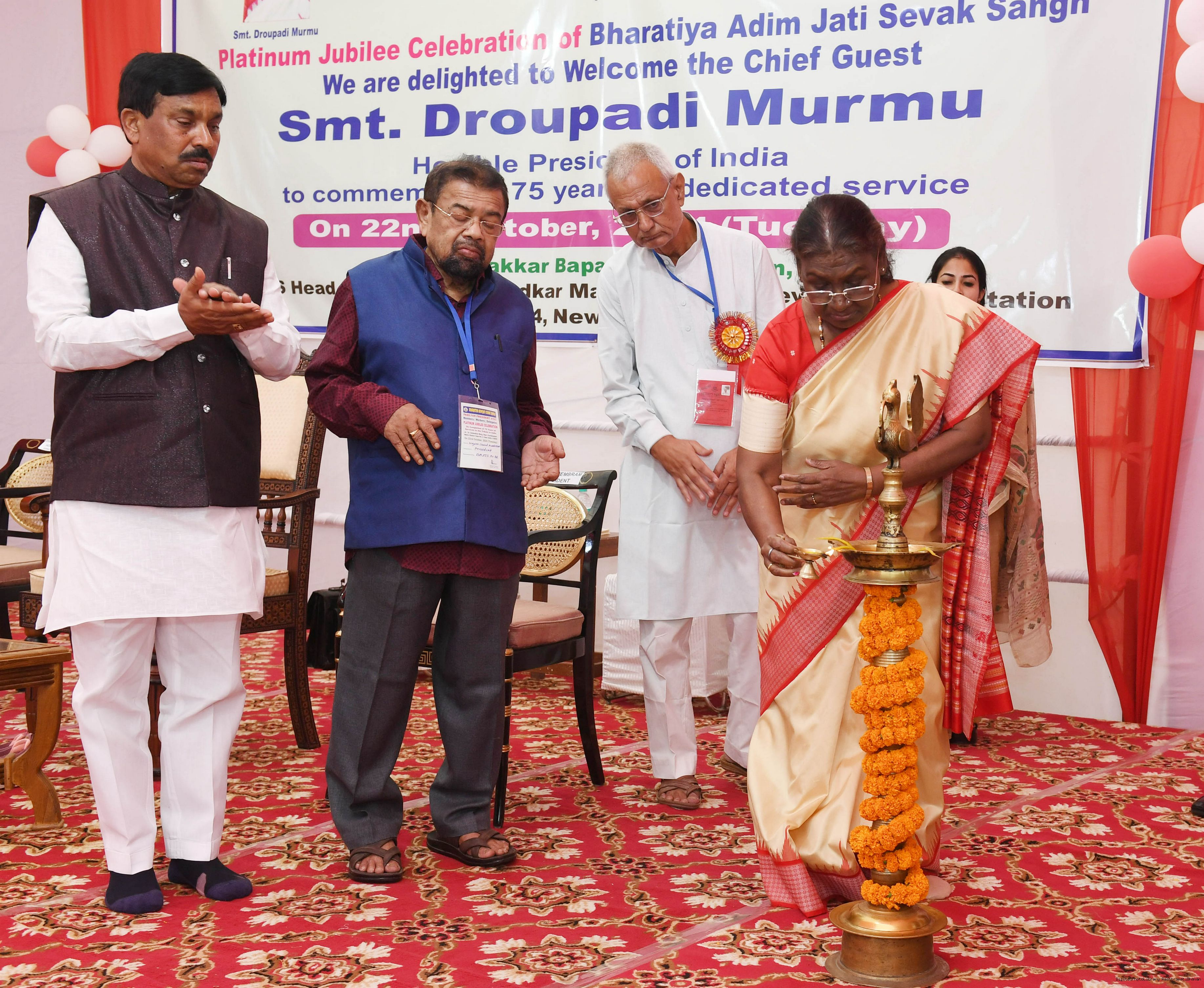 | Caption: | The President of India, Smt. Droupadi Murmu graced an event on the completion of 75 years of Bharatiya Adim Jati Sevak Sangh in New Delhi on October 22, 2024. |